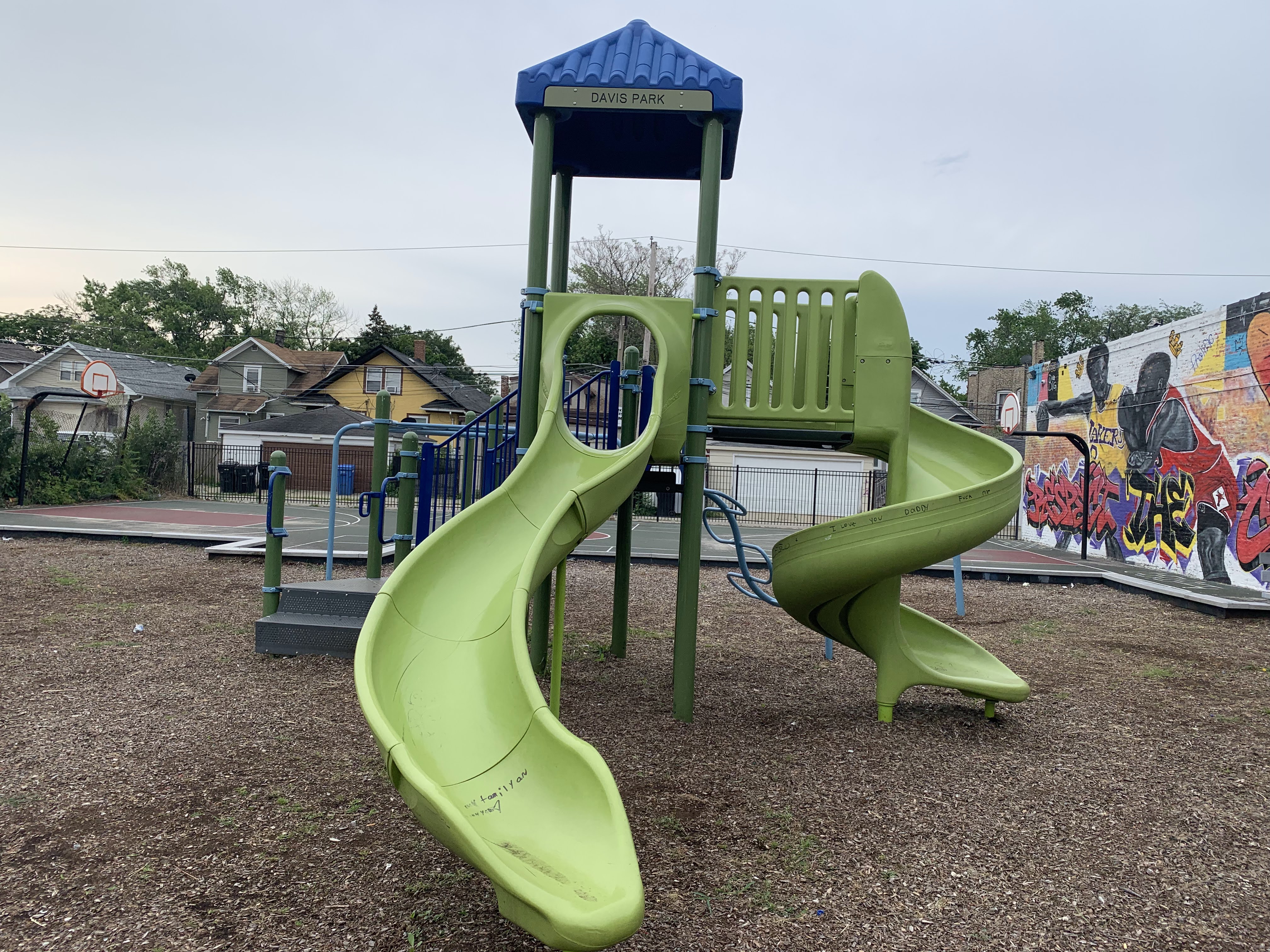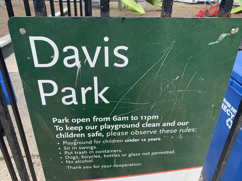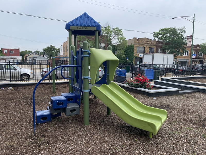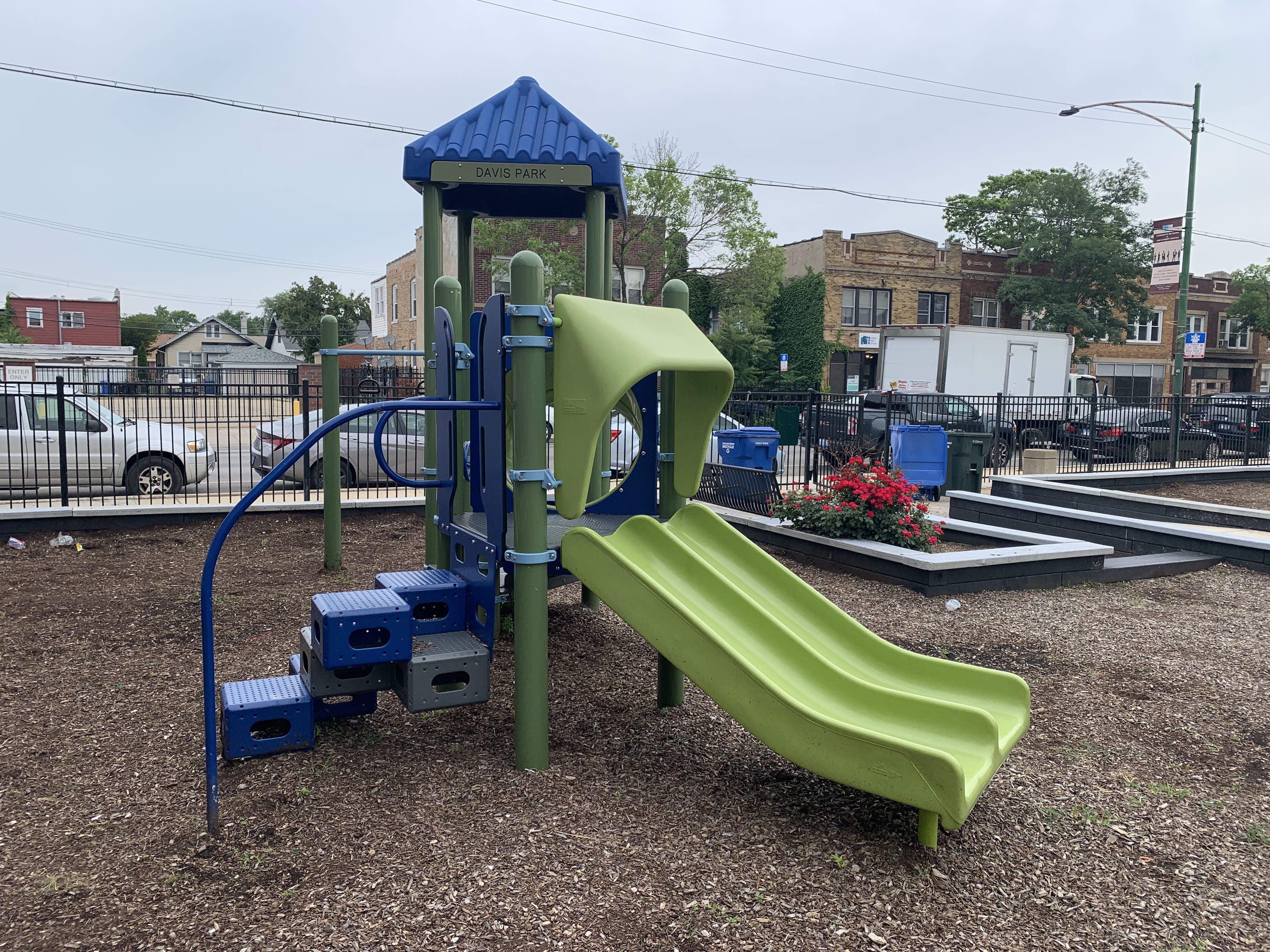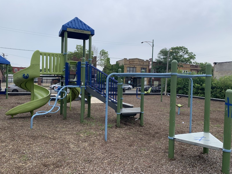 This playground at Davis Park (not to be confused with Davis Square Park in the Back of the Yards community area) is a standard Chicago playground with equipment for many children. There are the standard set of swings - toddler, adaptive, and belt seat - with an extra hammock style saucer swing as a bonus. There are two play structures - one for older kids and one for younger - and a few standalone features.