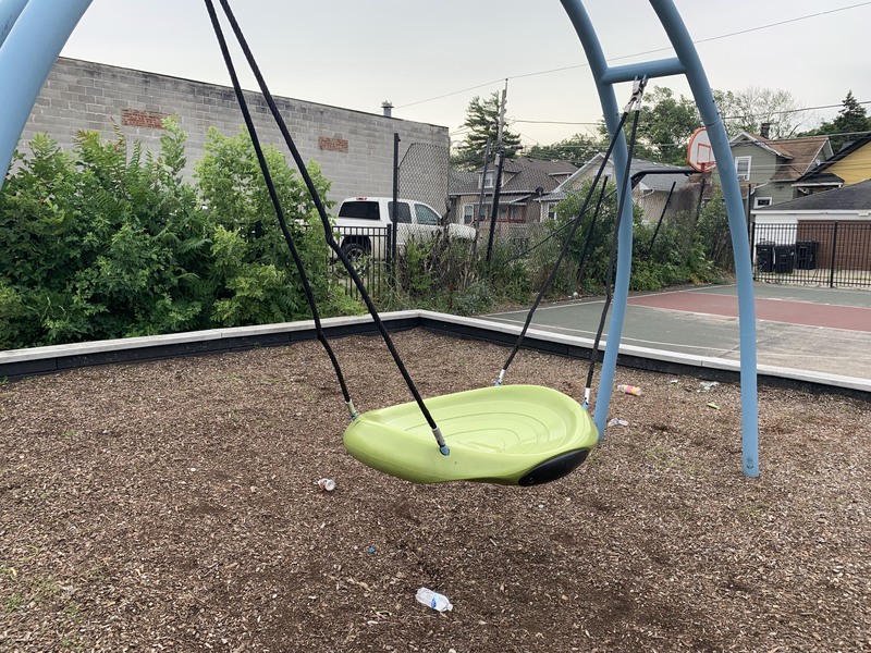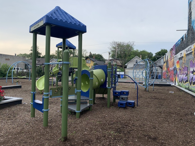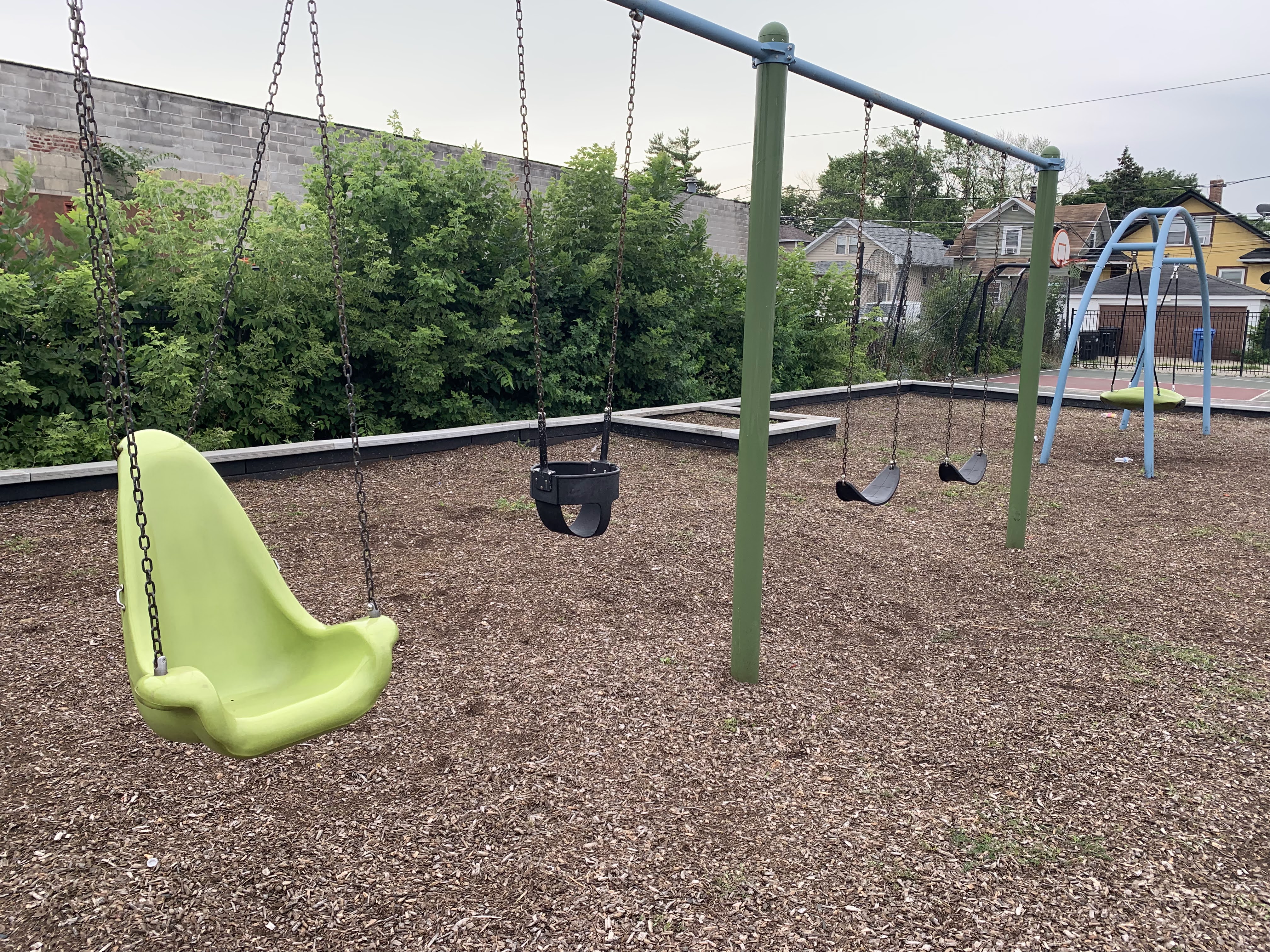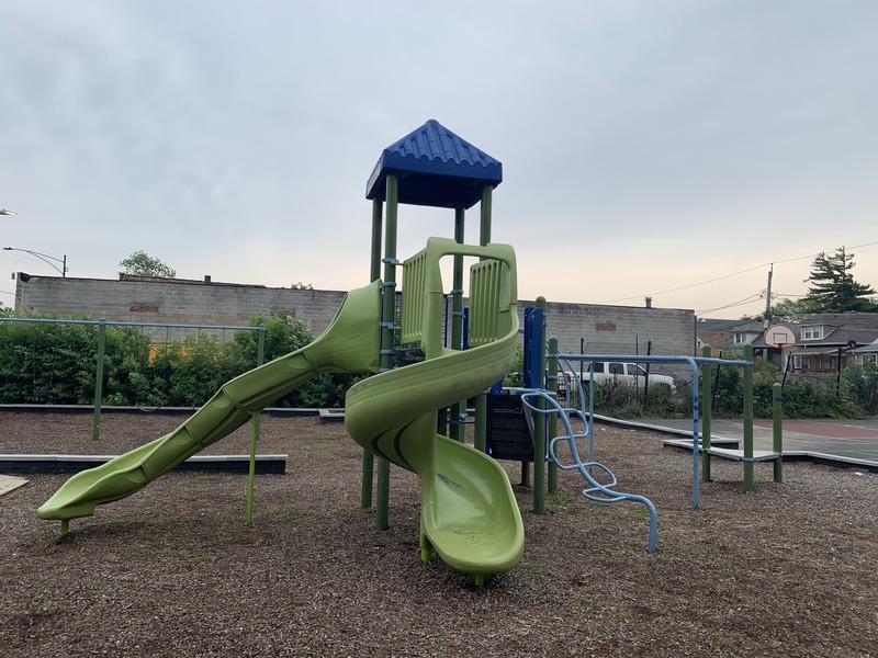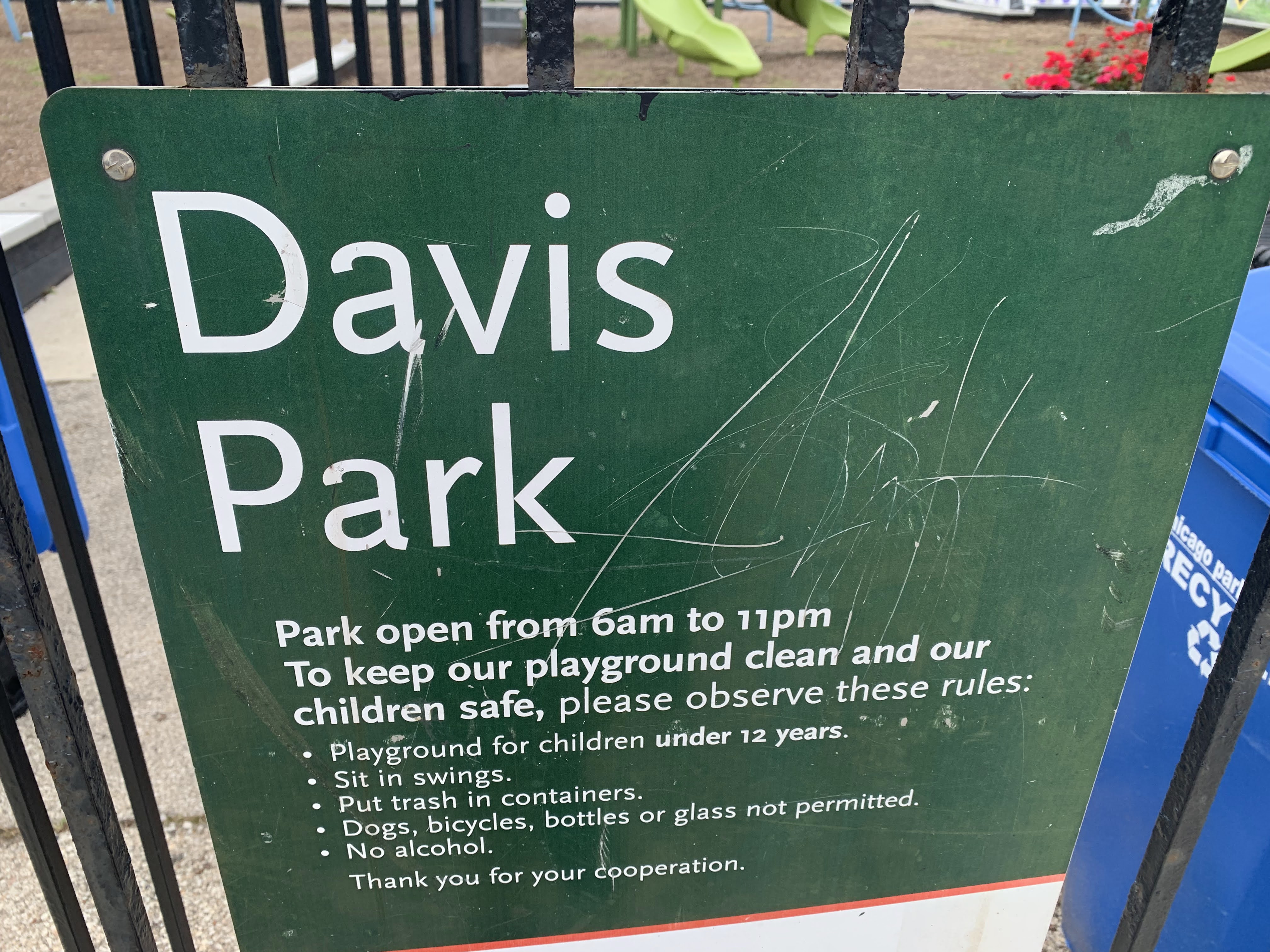 This playground at Davis Park (not to be confused with Davis Square Park in the Back of the Yards community area) is a standard Chicago playground with equipment for many children. There are the standard set of swings - toddler, adaptive, and belt seat - with an extra hammock style saucer swing as a bonus. There are two play structures - one for older kids and one for younger - and a few standalone features.