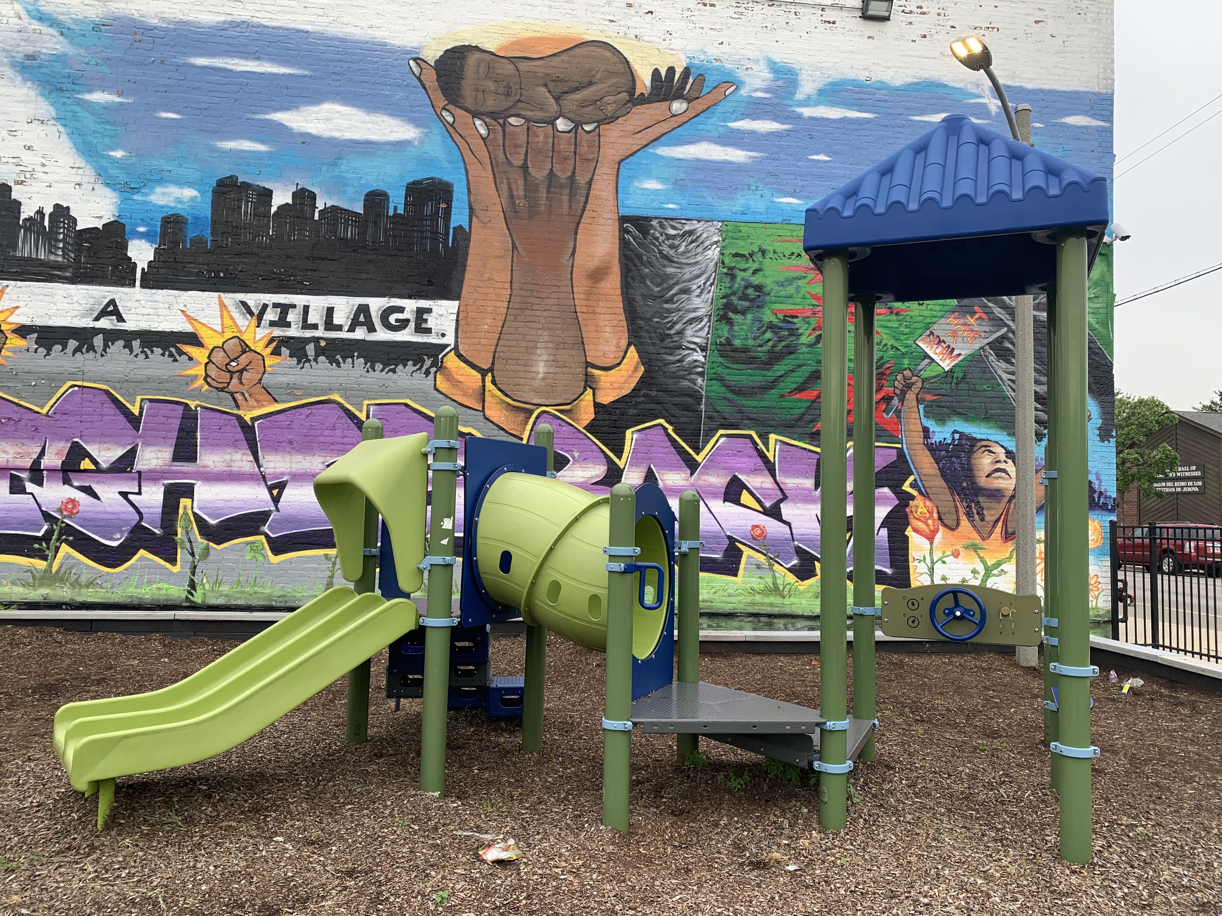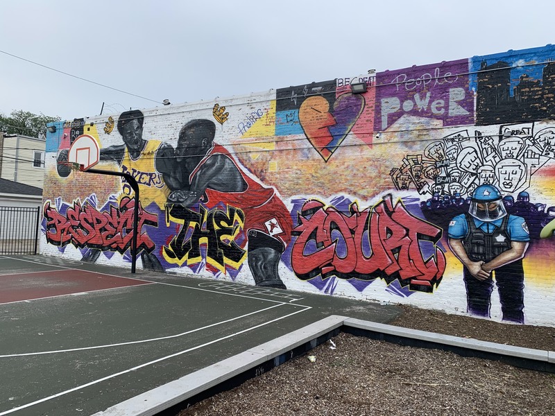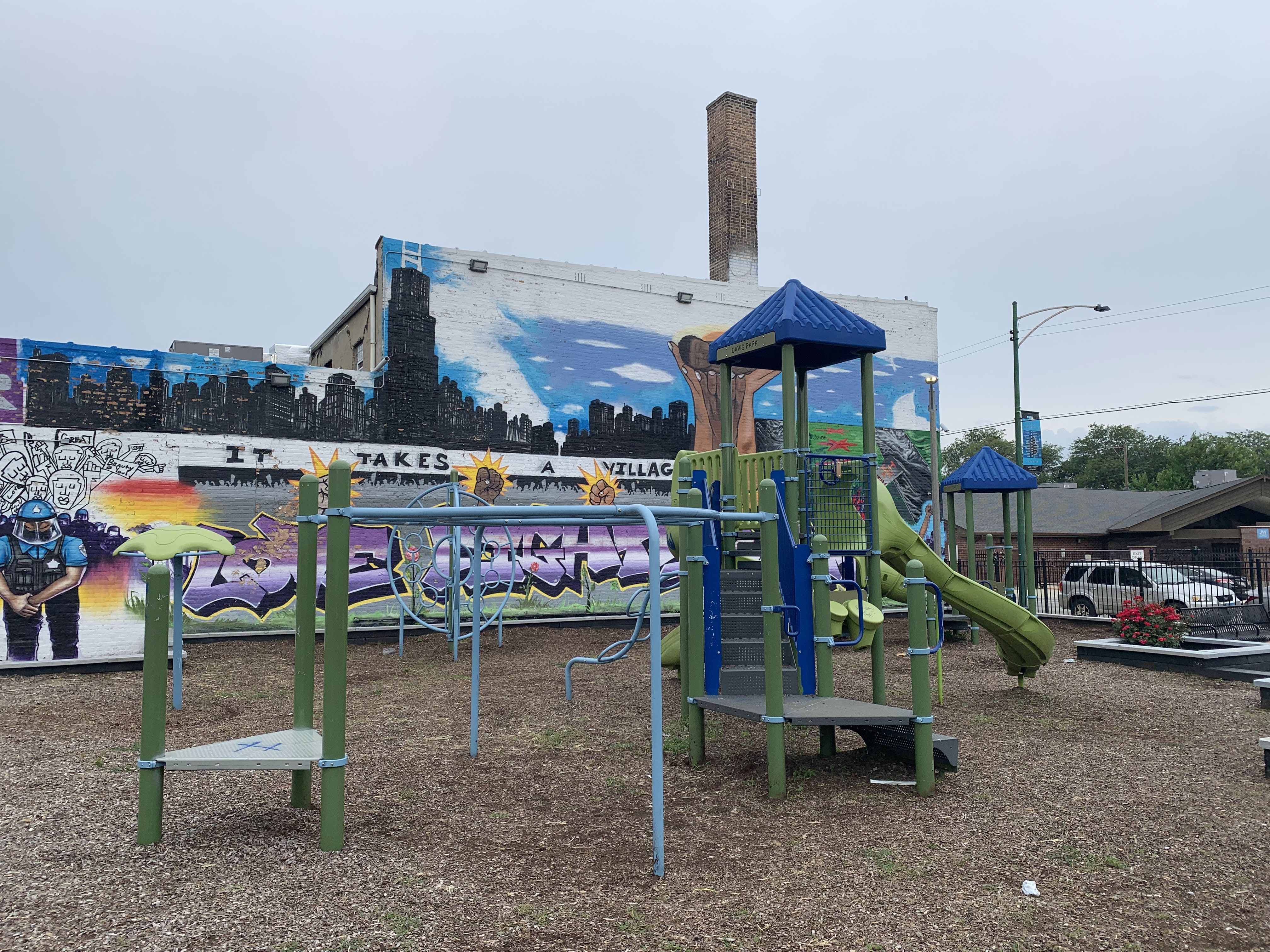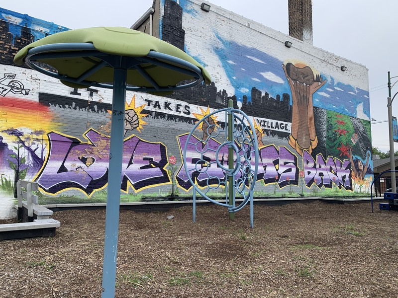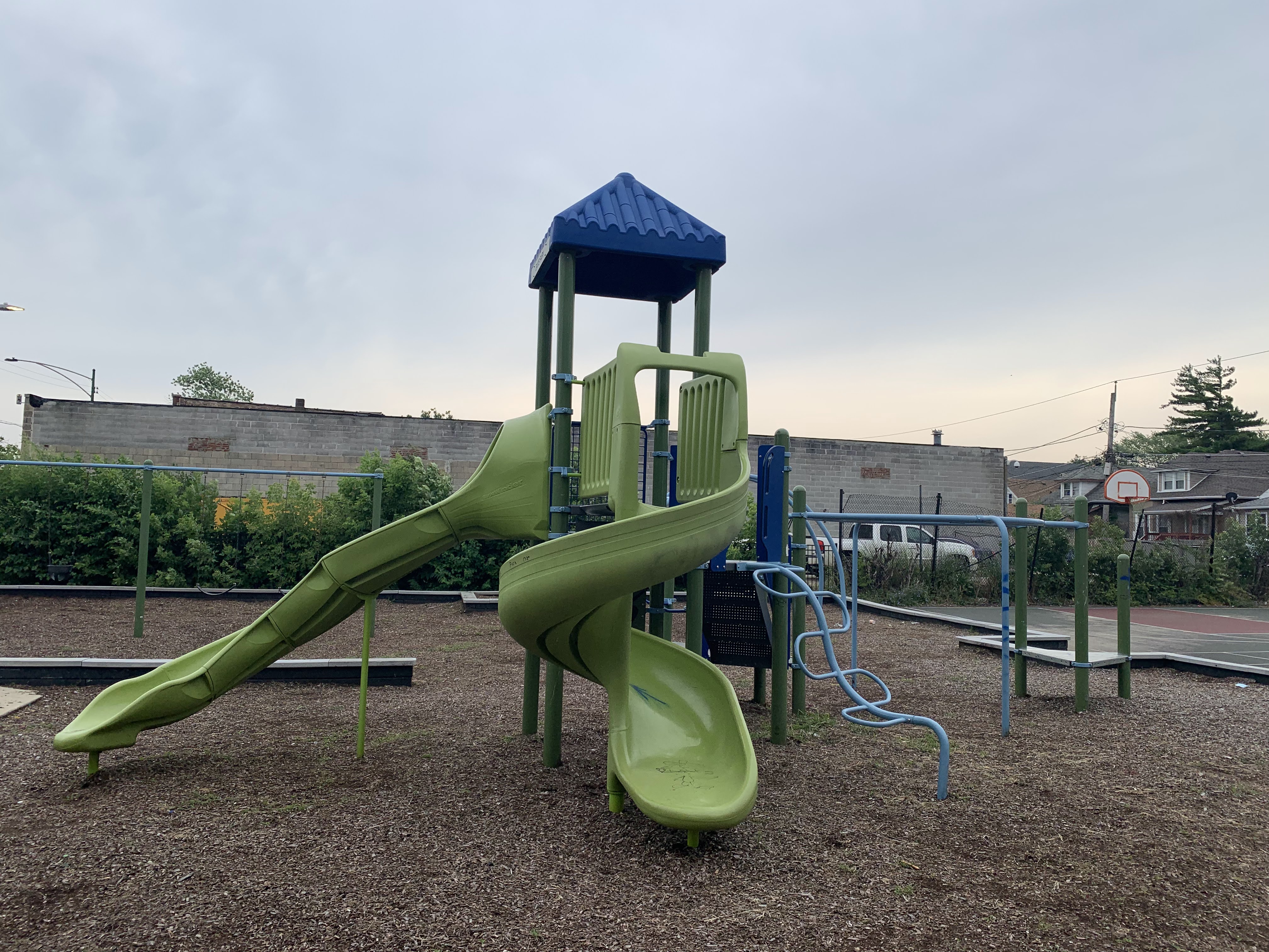 The play surface is wood chips and the play area is fully enclosed from the street and opens into a basketball court at the rear of the site. There are a few benches and a drinking fountain but there are no trees or shade structures making the playground bright and sunny. The wall on the west side of the park has some great murals, though - Playground Features