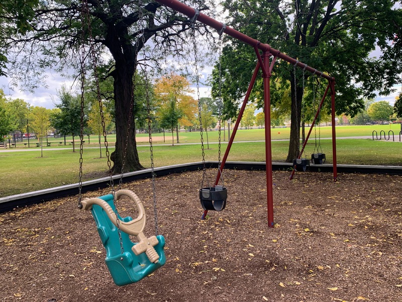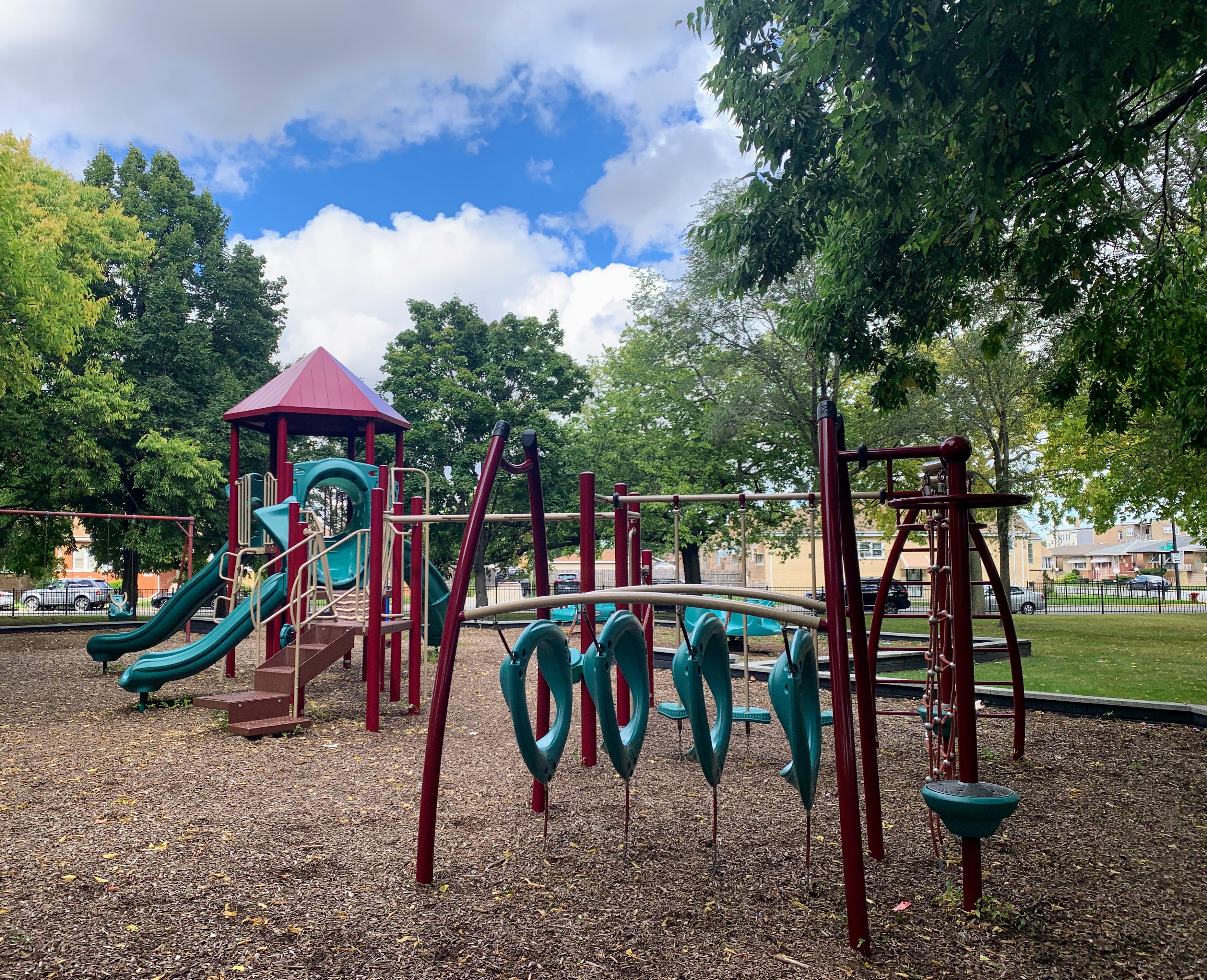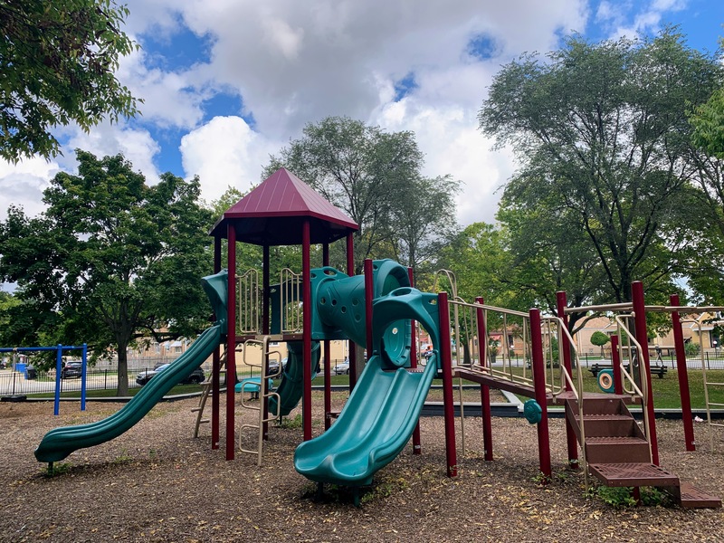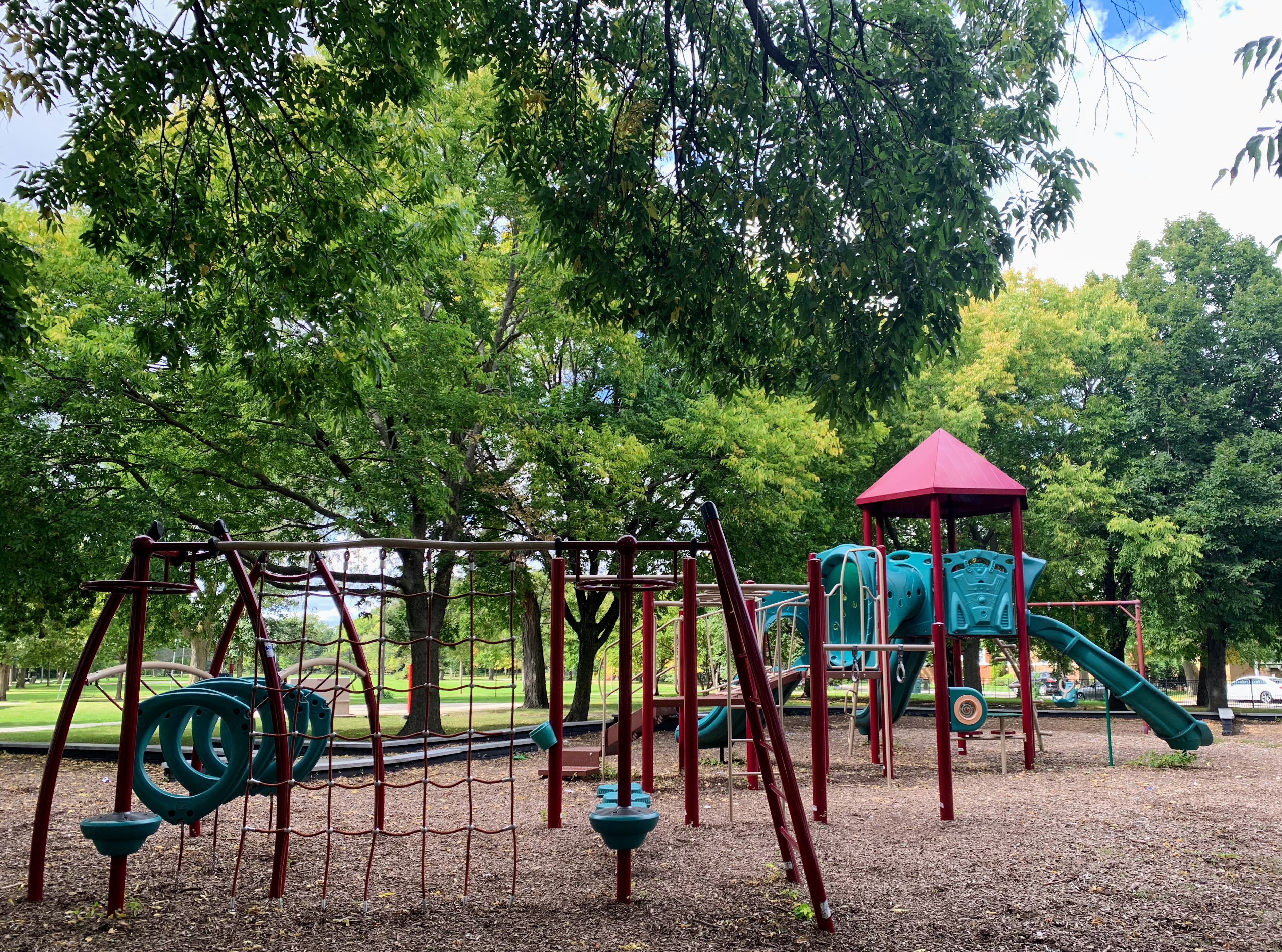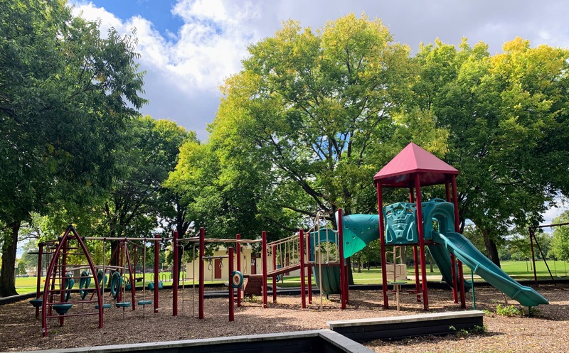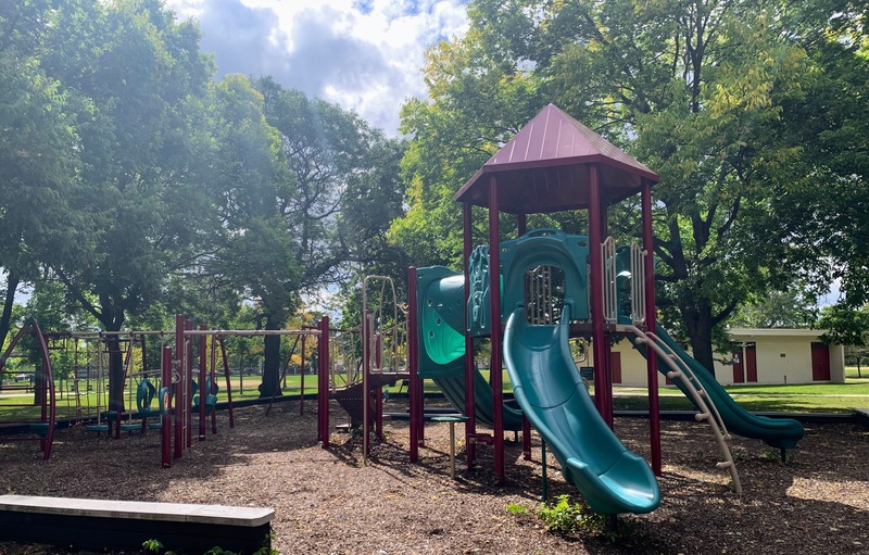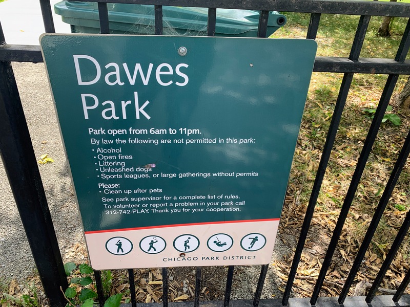 - Dawes Park features a great playground and small water spray feature. The playground includes a variety of swings and a moderate sized play structure with a number of climbing and overhead elements sprawling from the main structure. I am strongly biased in favor of shady playgrounds and this playground has great shade. The play surface is wood chips and is fenced from the street. A small comfort station provides access to bathroom and a drinking fountain (when open) and a single pole water spray feature is great in the summer months. Great playground; highly recommend.