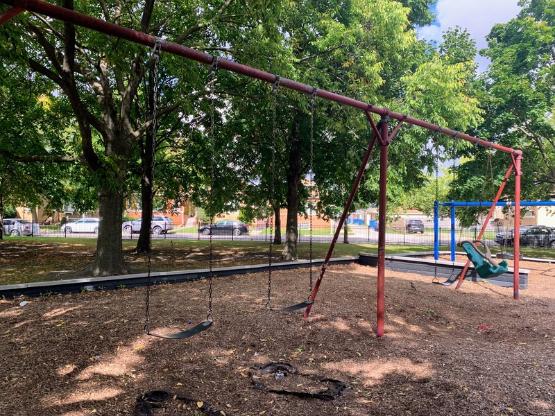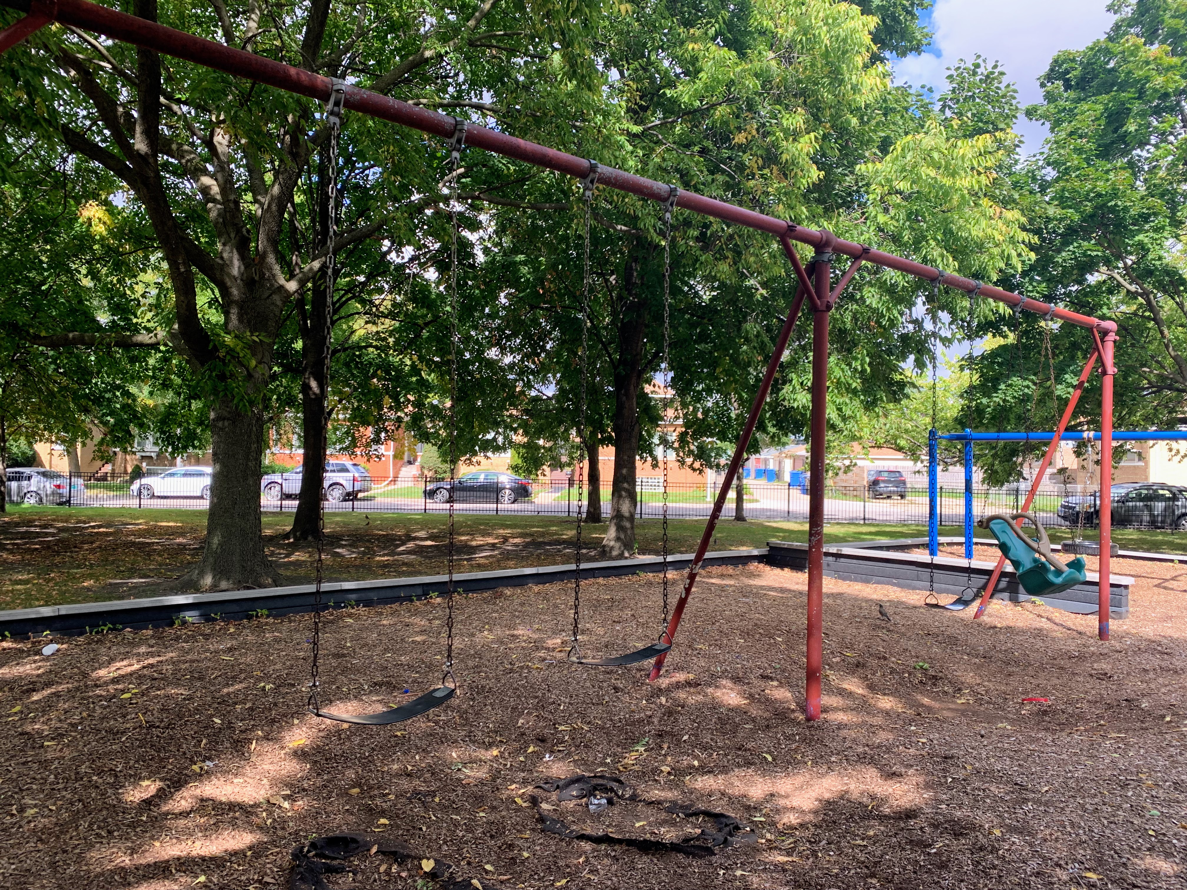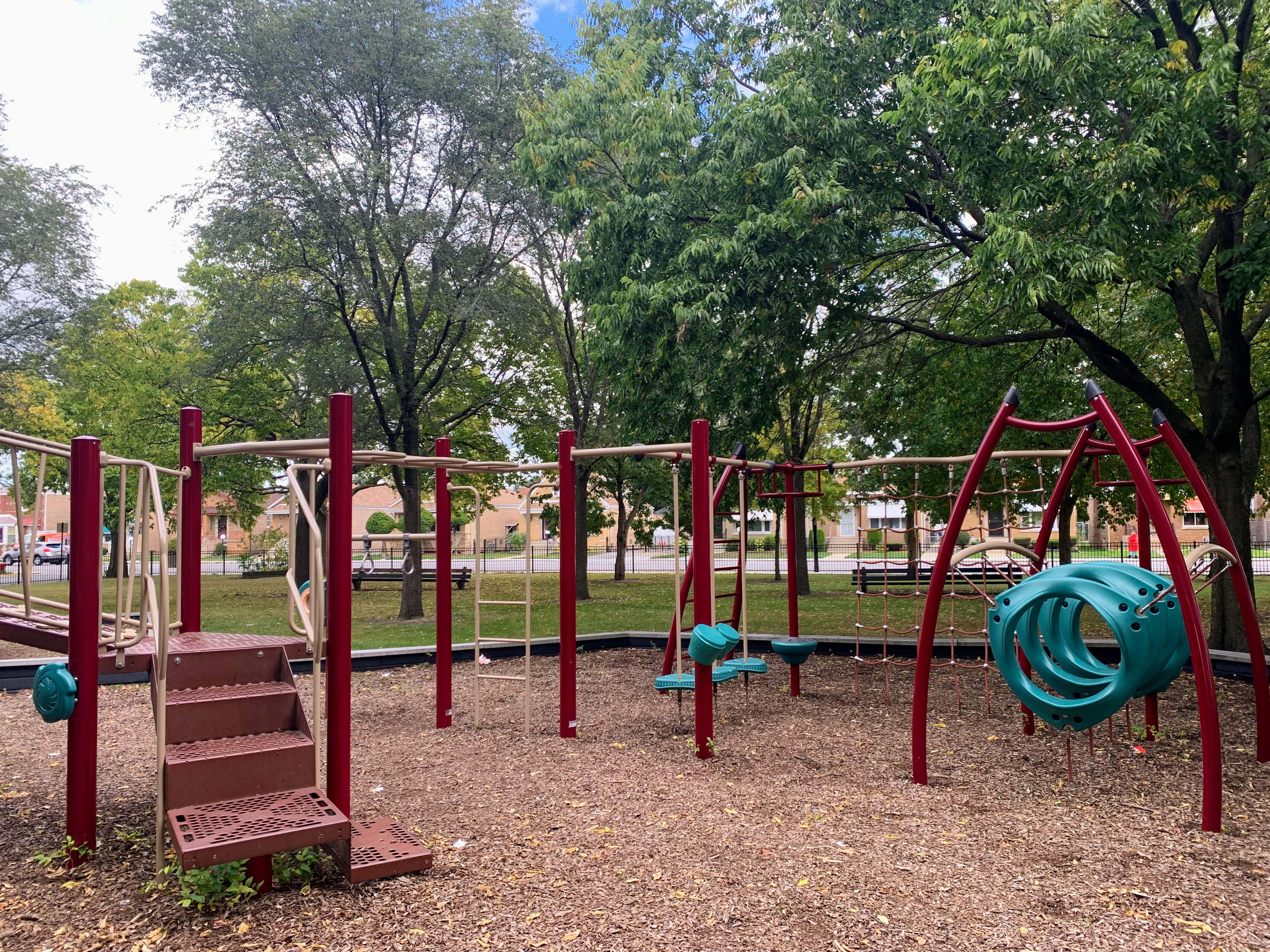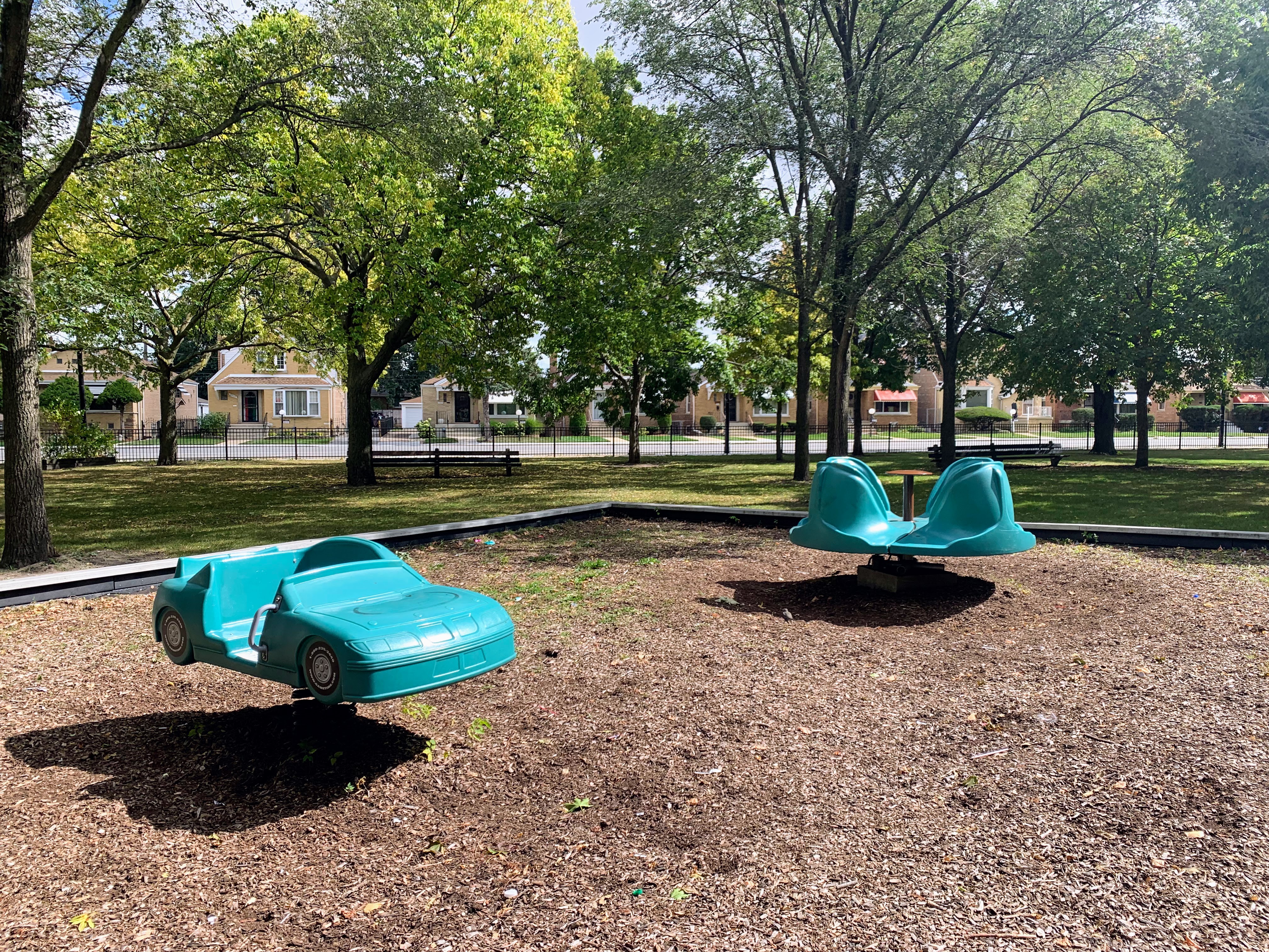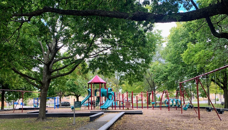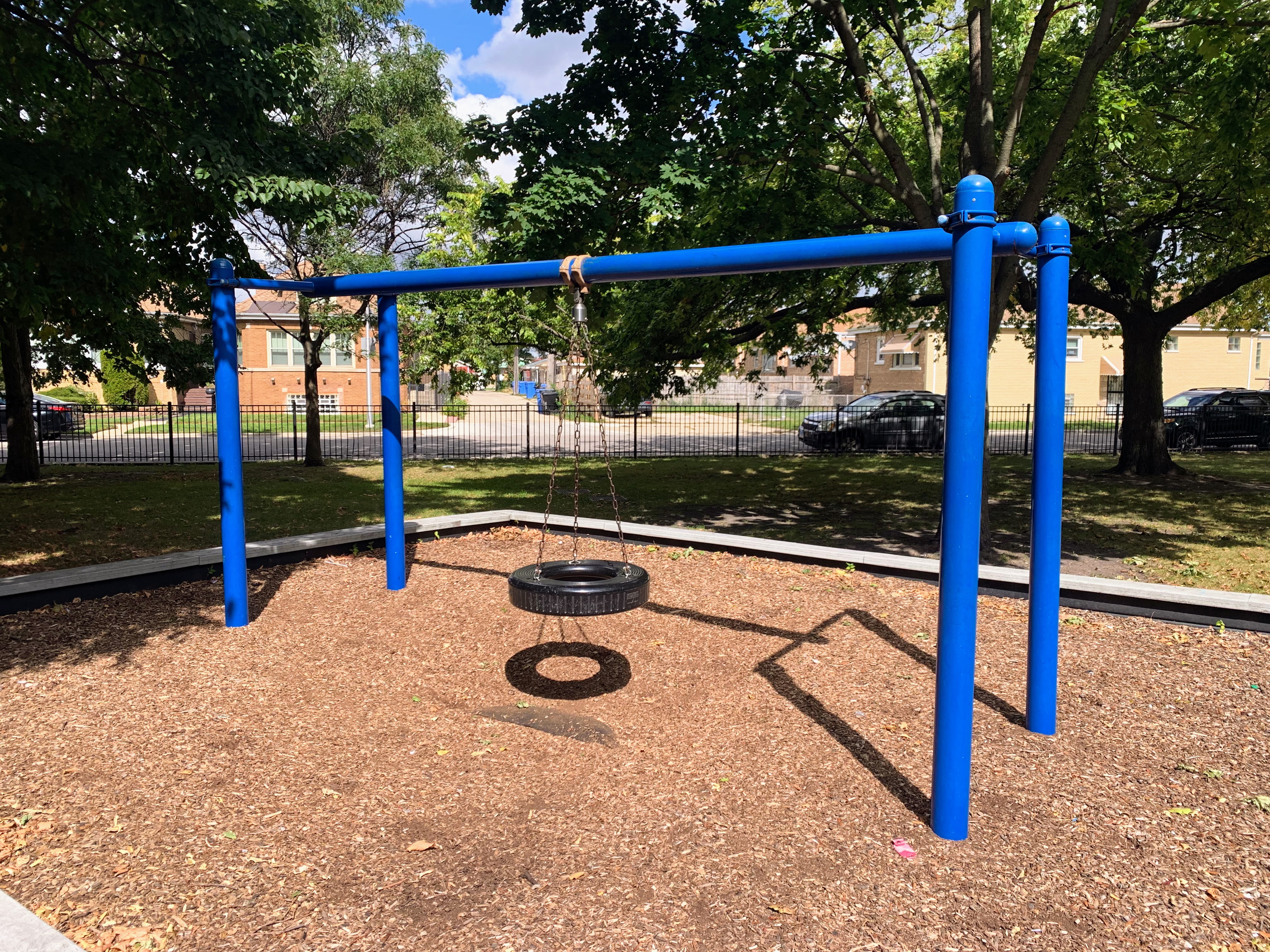 - Dawes Park features a great playground and small water spray feature. The playground includes a variety of swings and a moderate sized play structure with a number of climbing and overhead elements sprawling from the main structure. I am strongly biased in favor of shady playgrounds and this playground has great shade. The play surface is wood chips and is fenced from the street. A small comfort station provides access to bathroom and a drinking fountain (when open) and a single pole water spray feature is great in the summer months. Great playground; highly recommend.