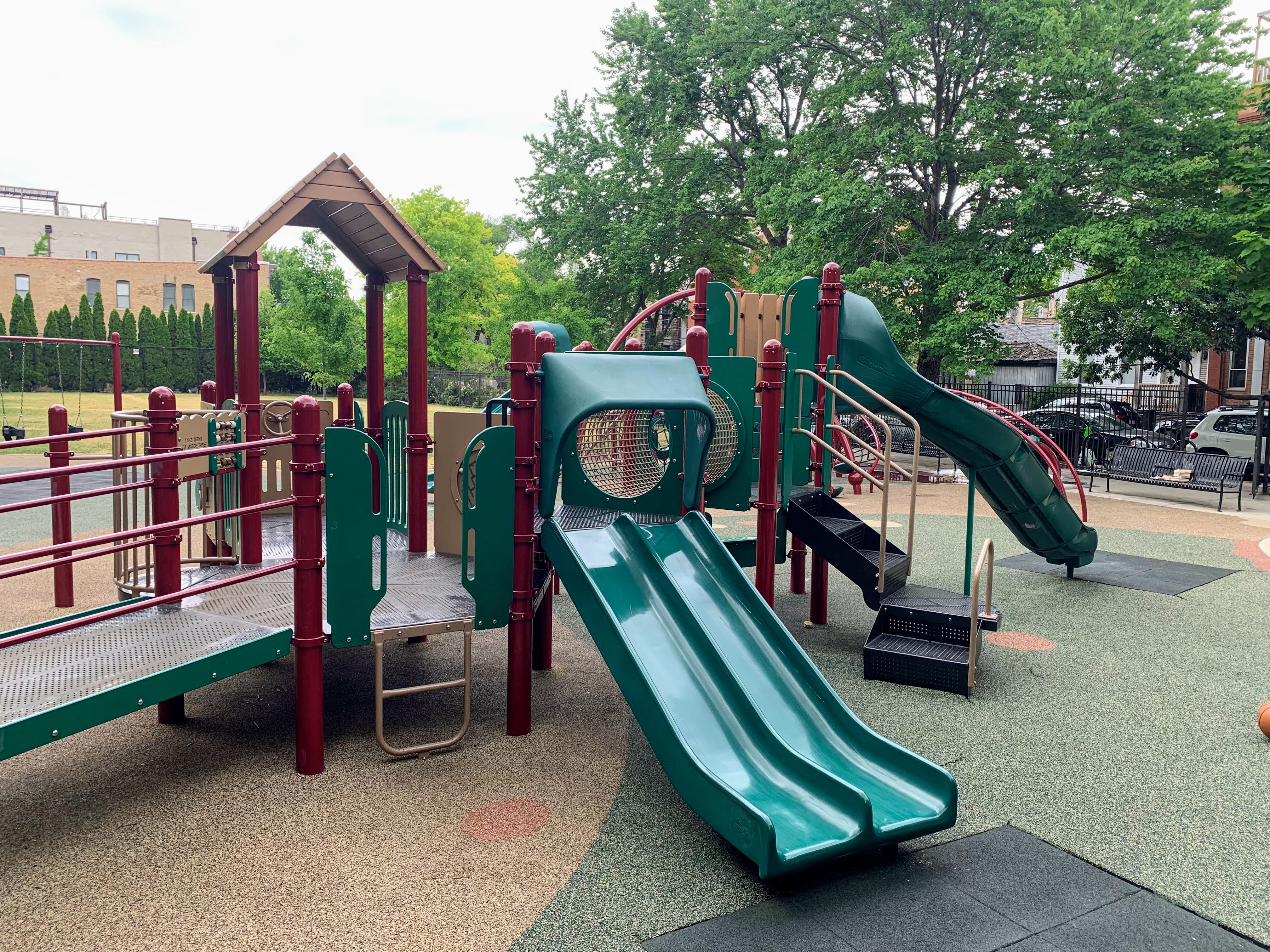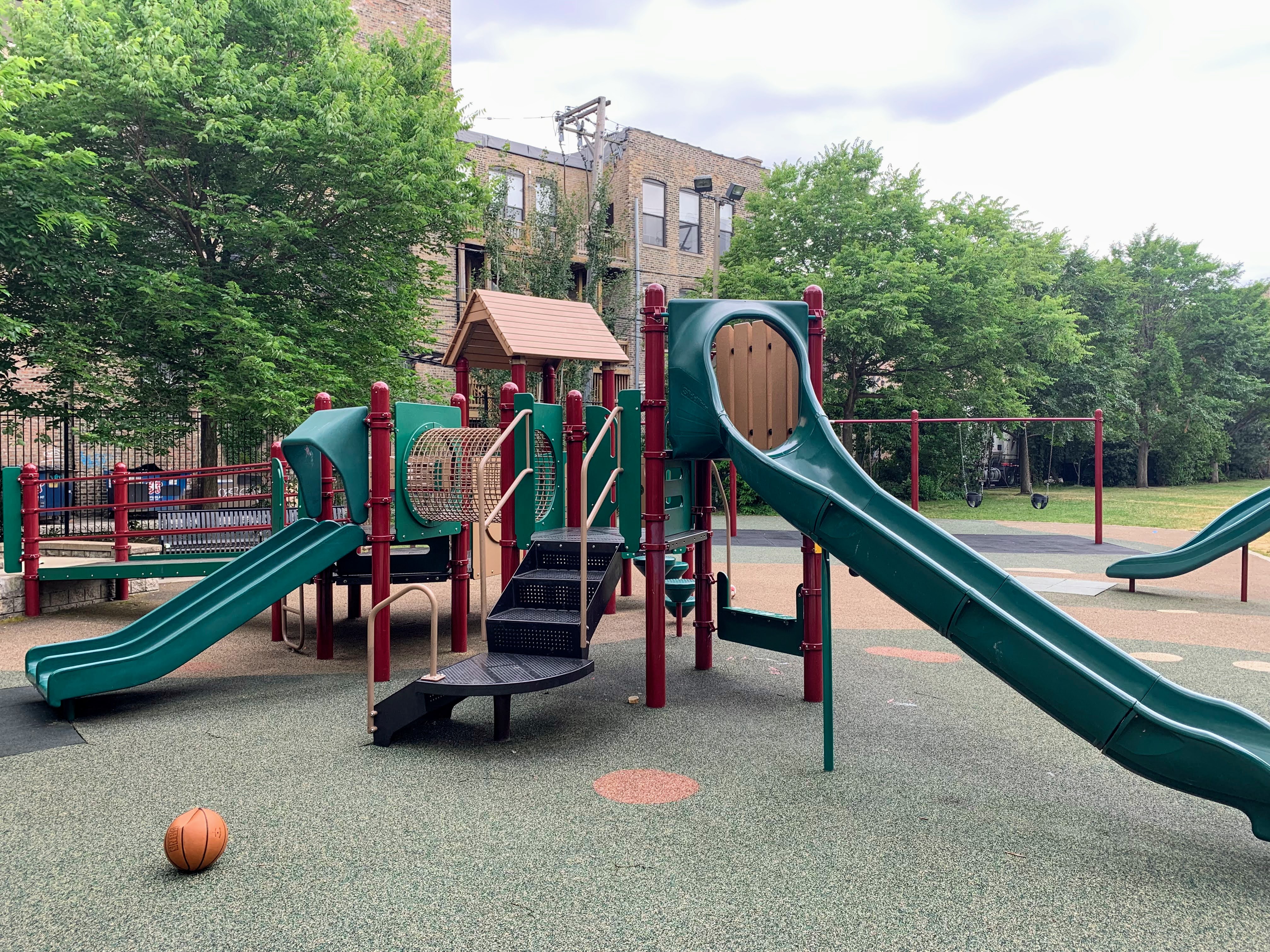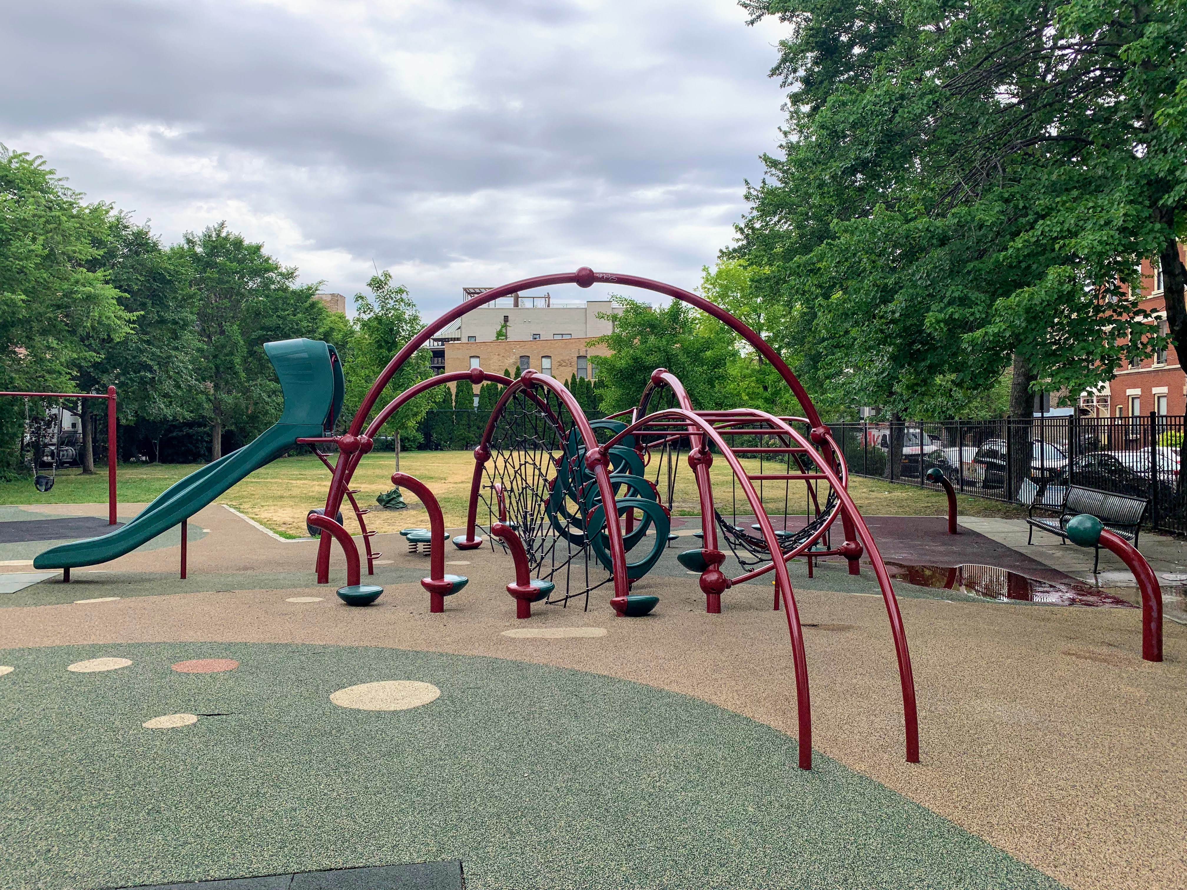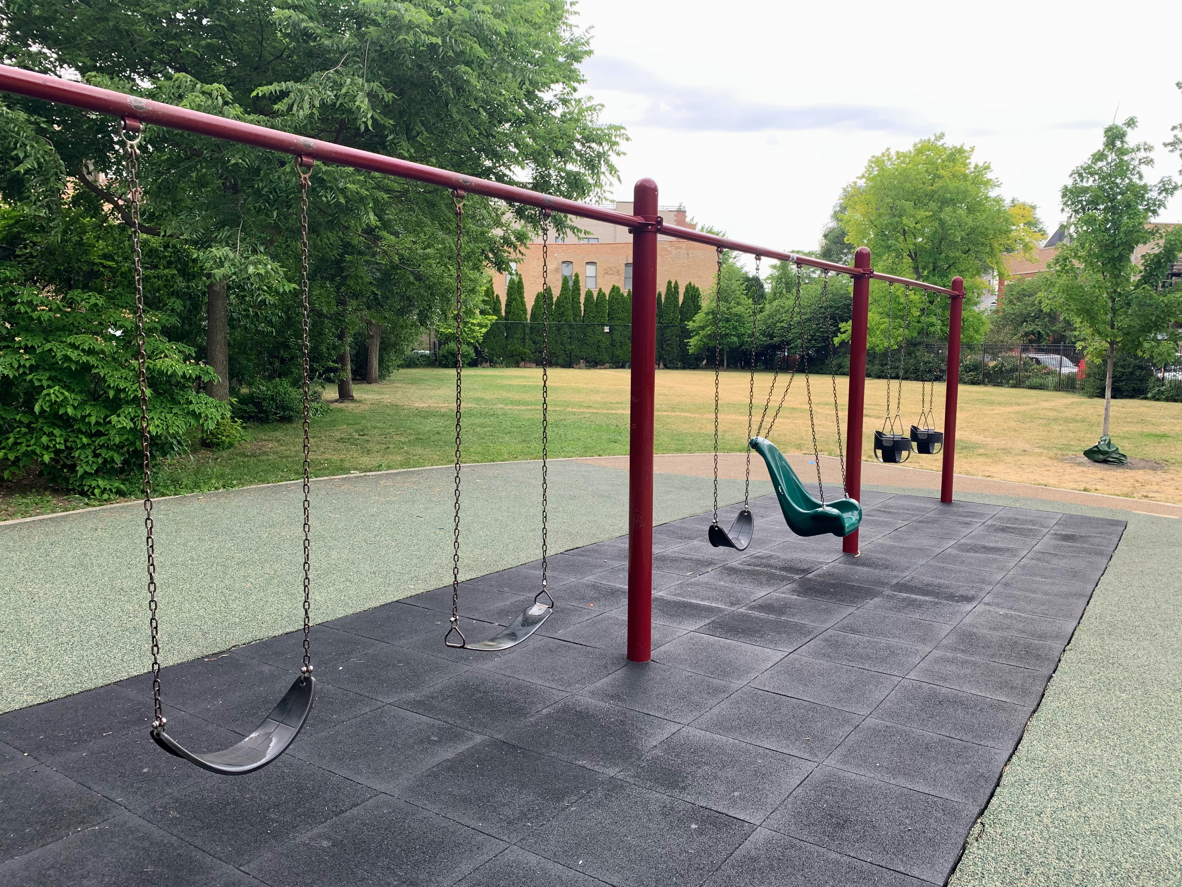- Dean Park is tucked away on a quiet stretch of Dean Street and features a nice and quiet playground and a water spray feature. The playground includes a standard play structure, the normal set of swings (toddler, adaptive, and belt seat), and a collection of climbing and traversing elements. The water spray feature is a small single pole water sprayer. The playground itself opens to a small grassy area and the entire park is enclosed and fenced from the street. The play surface is soft rubber and there area a few benches for seating as well a drinking fountain and some shady spots (especially in the morning). All in all, this is a standard Chicago playground in the best sense of the term.