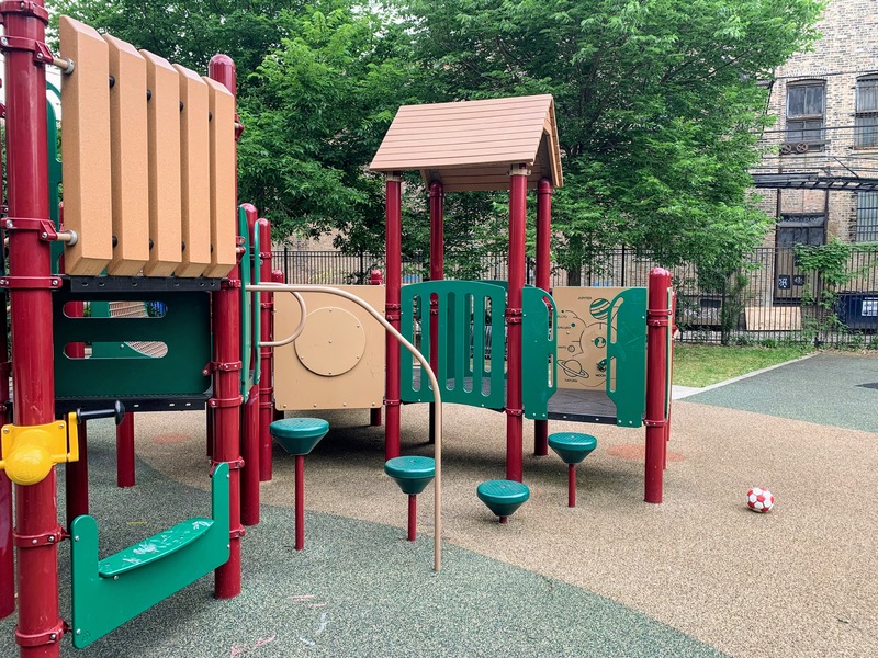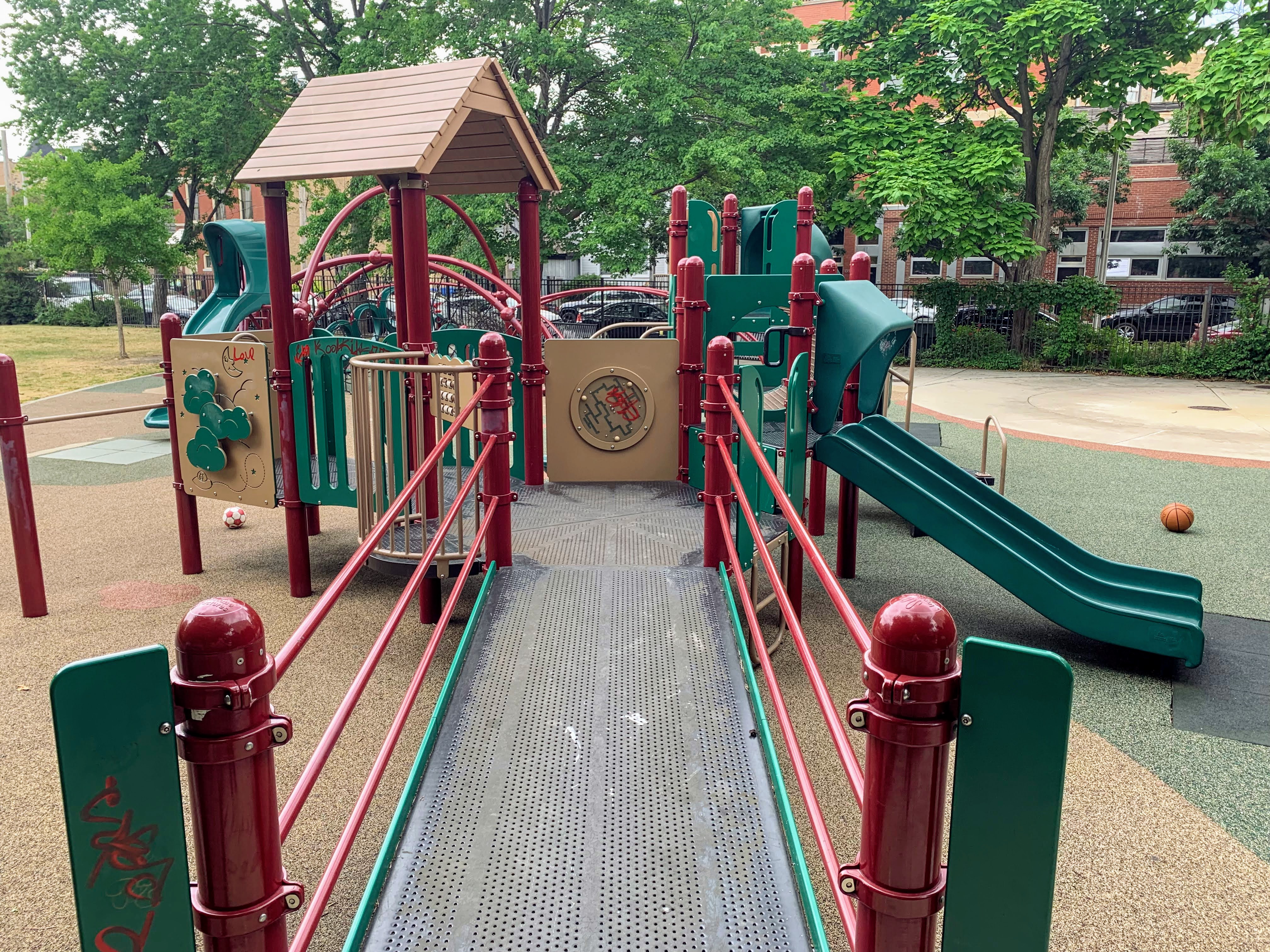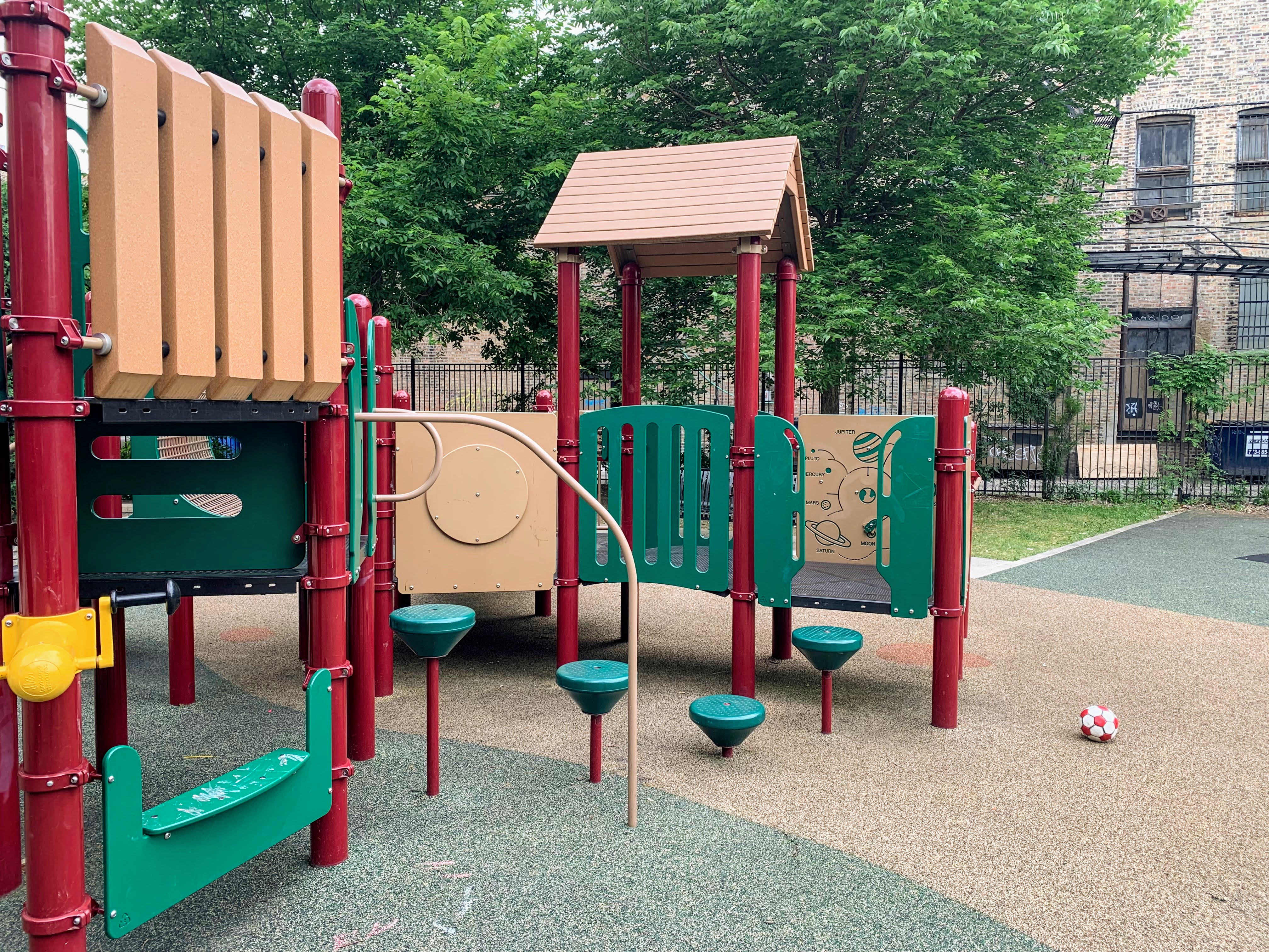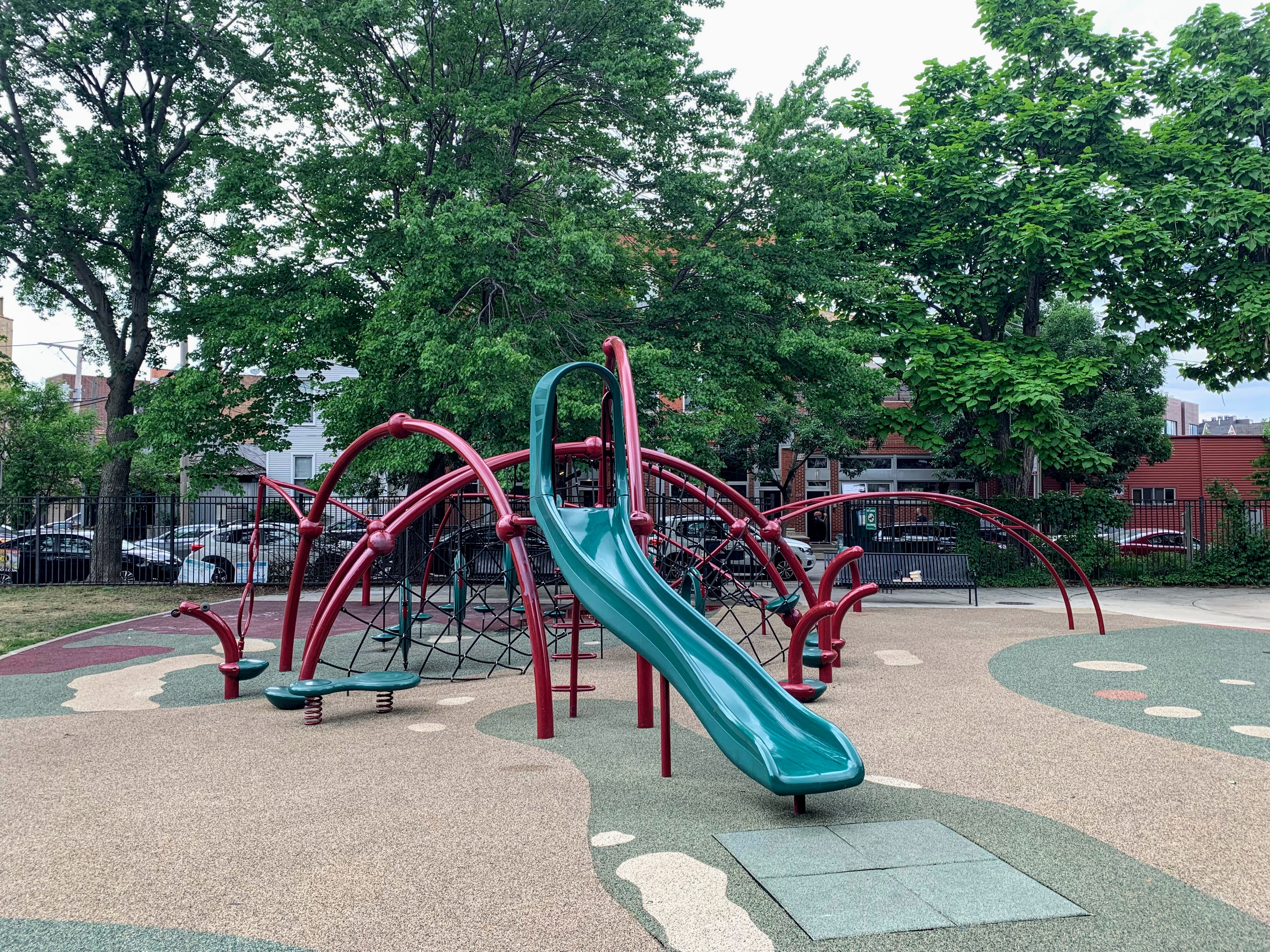 - Dean Park is tucked away on a quiet stretch of Dean Street and features a nice and quiet playground and a water spray feature. The playground includes a standard play structure, the normal set of swings (toddler, adaptive, and belt seat), and a collection of climbing and traversing elements. The water spray feature is a small single pole water sprayer. The playground itself opens to a small grassy area and the entire park is enclosed and fenced from the street. The play surface is soft rubber and there area a few benches for seating as well a drinking fountain and some shady spots (especially in the morning). All in all, this is a standard Chicago playground in the best sense of the term.