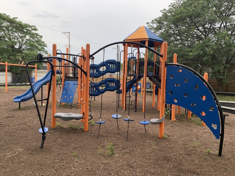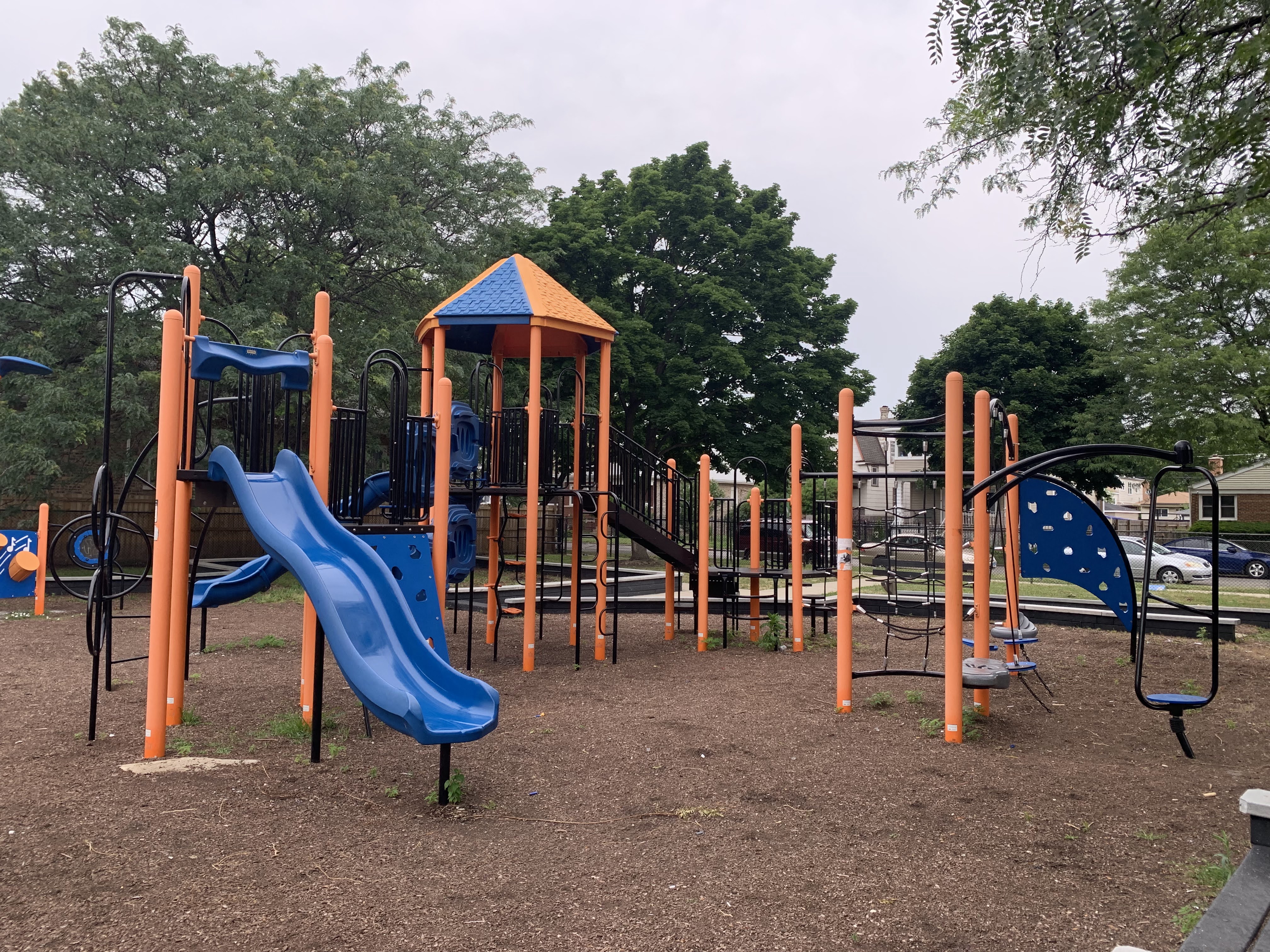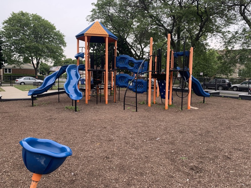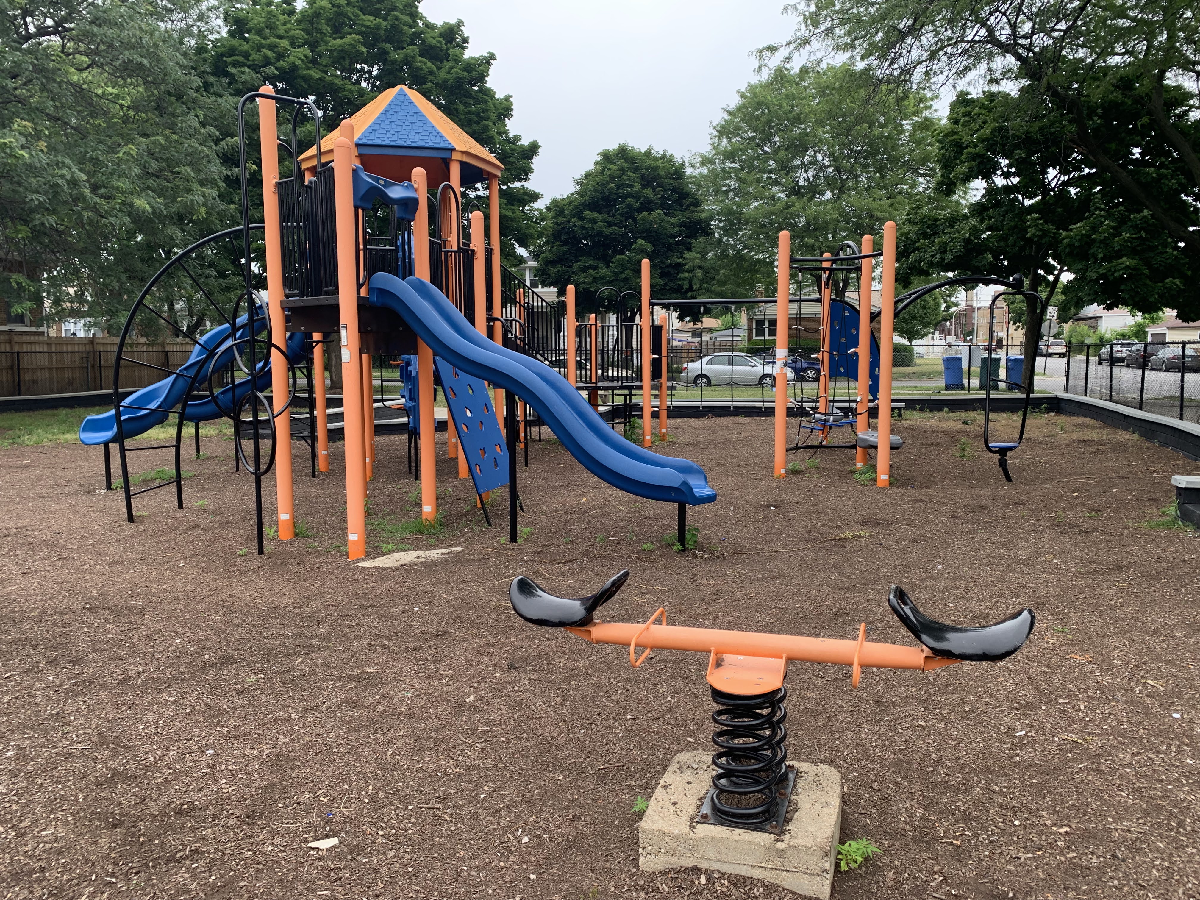 - The playground at DeGeorge Park features a large play structure with many unique climbing elements, swings (toddler, belt seat, and a tire swing), and a few other standalone elements. The play area is fully enclosed and the play surface is wood chips. There are a few benches in the area as well as a few trees but the playground itself is bright and sunny.