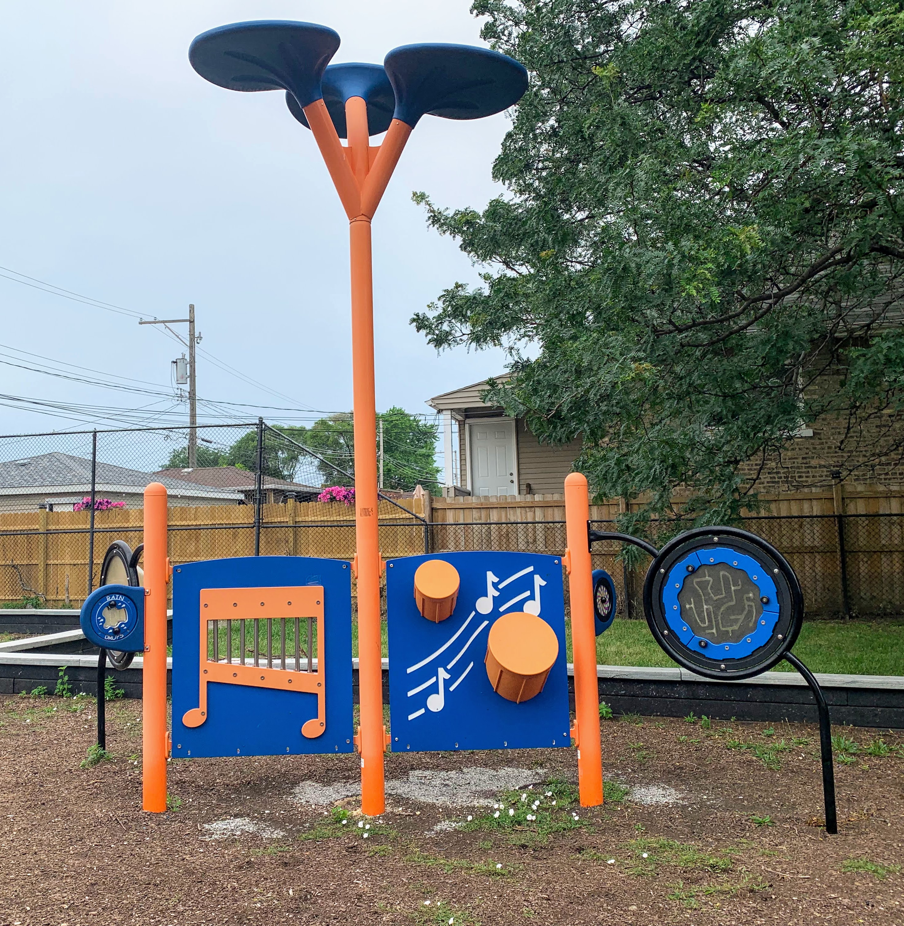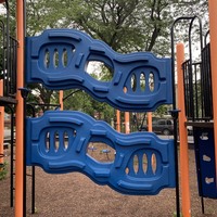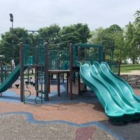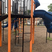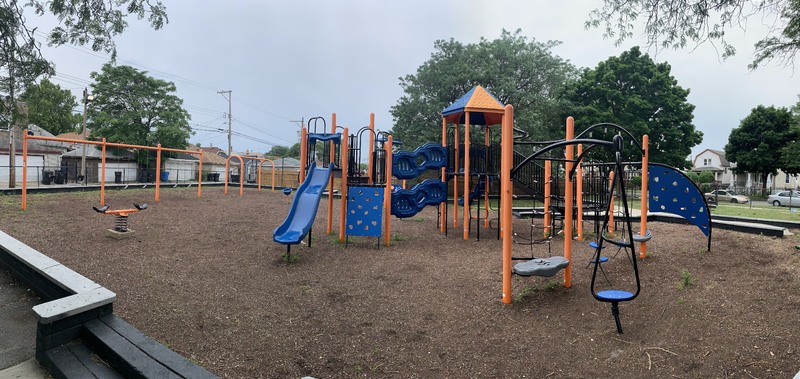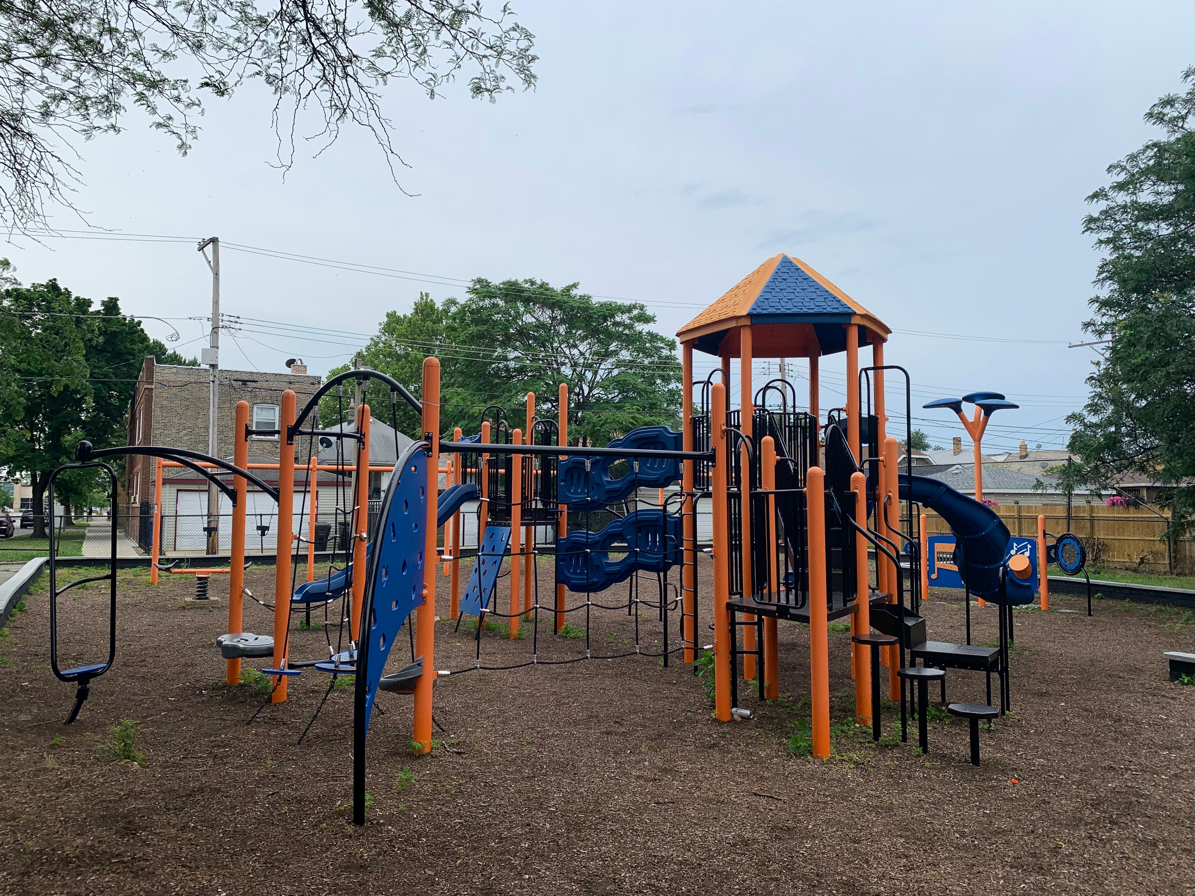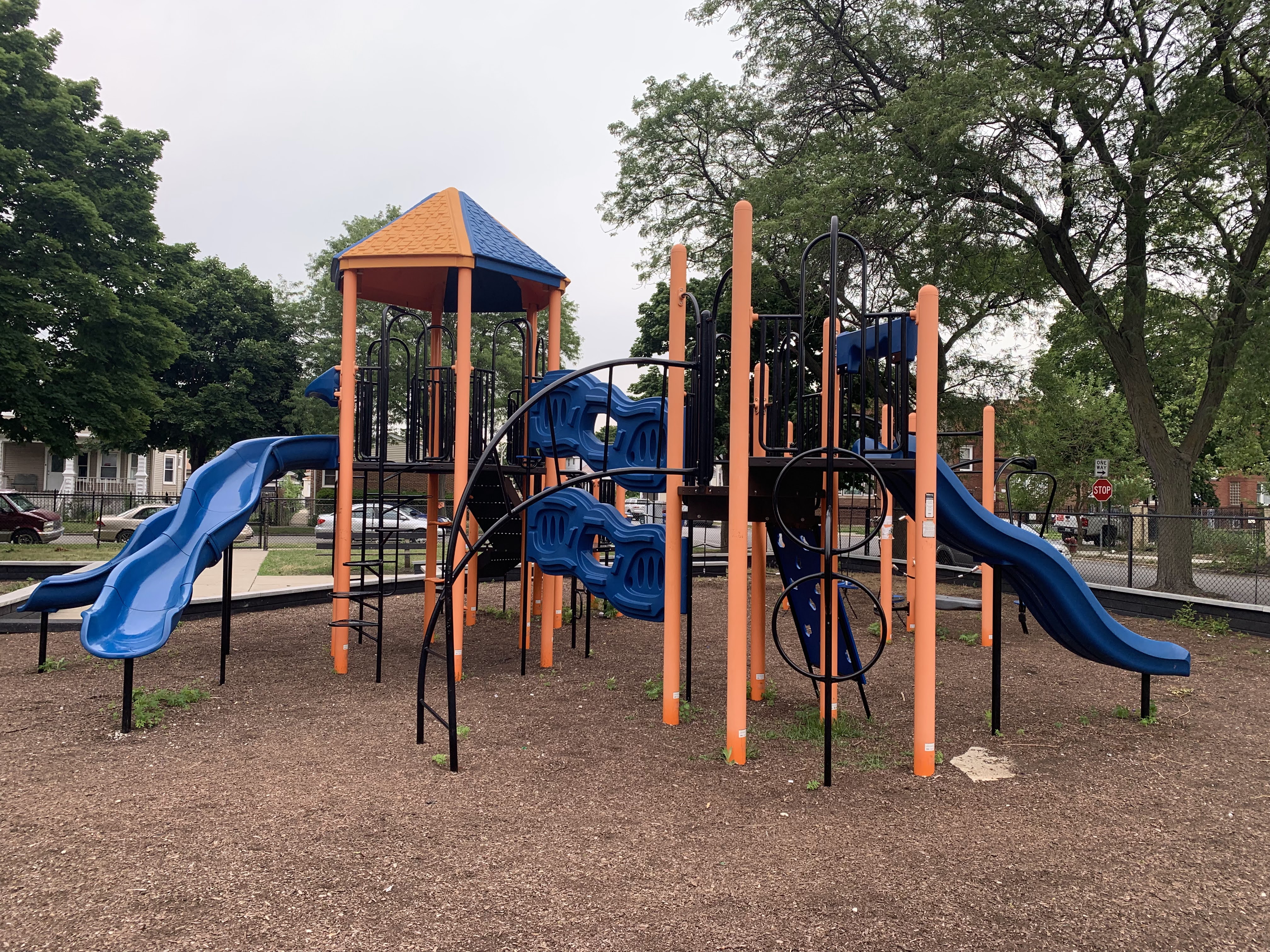 - The playground at DeGeorge Park features a large play structure with many unique climbing elements, swings (toddler, belt seat, and a tire swing), and a few other standalone elements. The play area is fully enclosed and the play surface is wood chips. There are a few benches in the area as well as a few trees but the playground itself is bright and sunny.