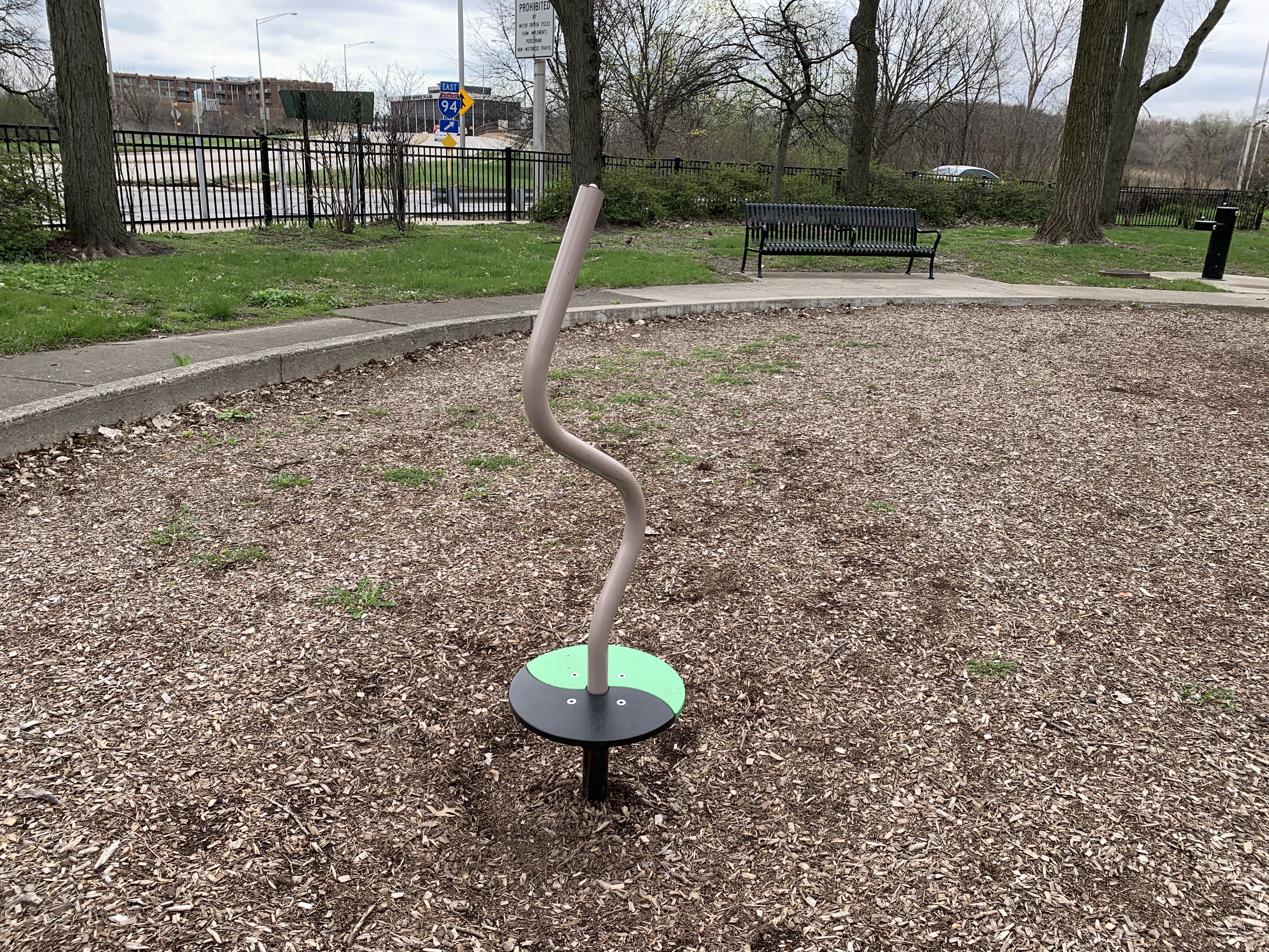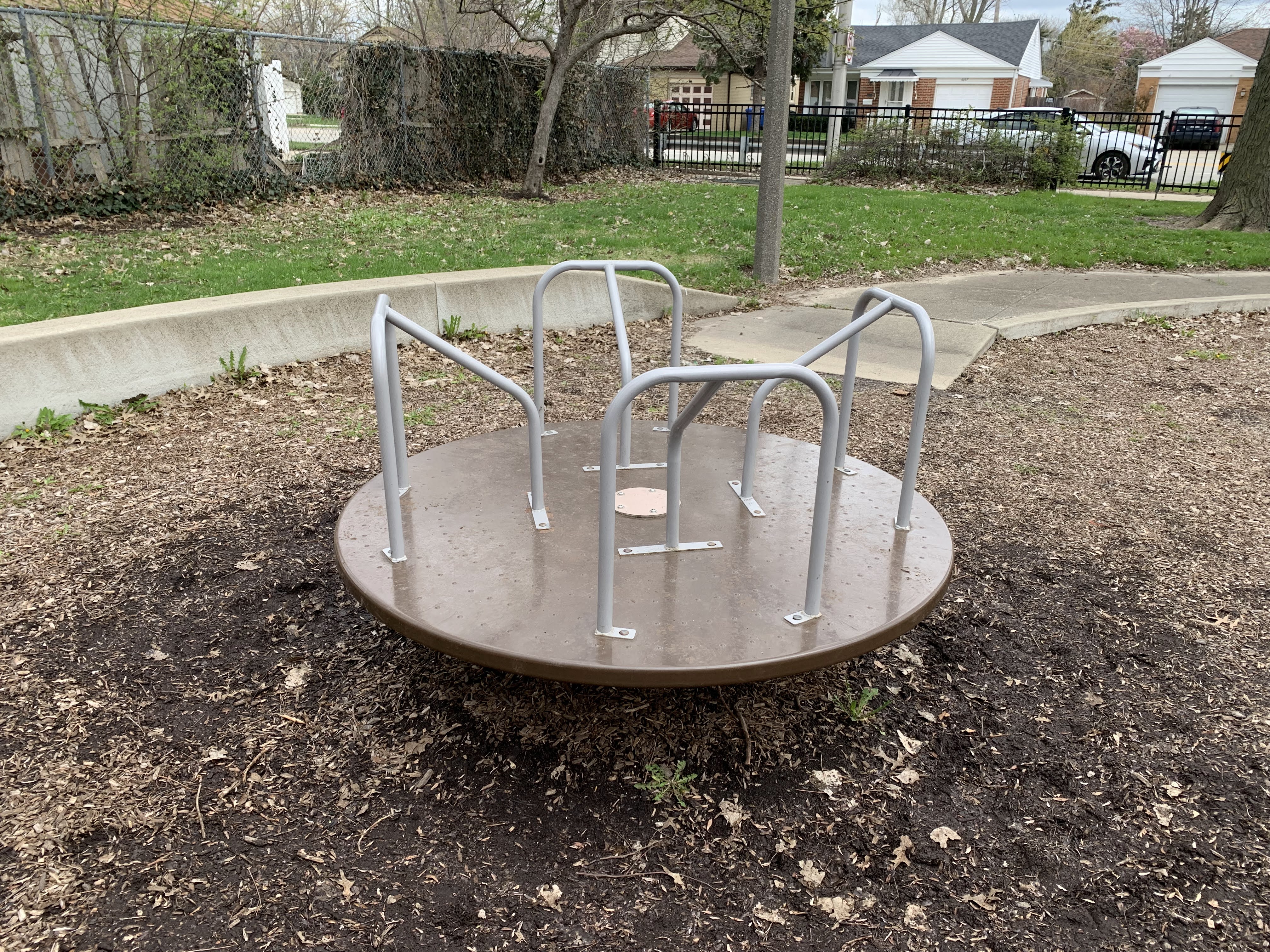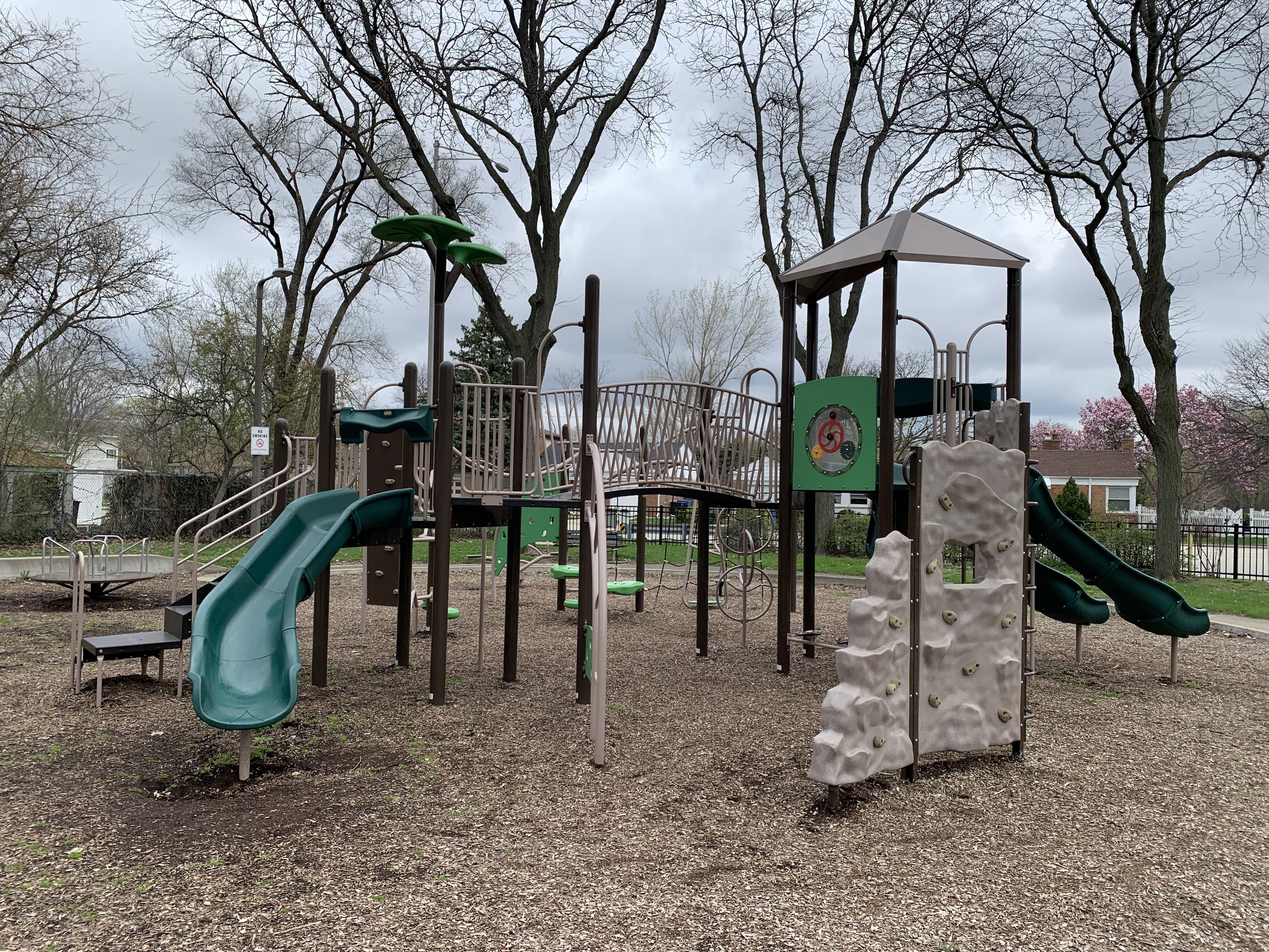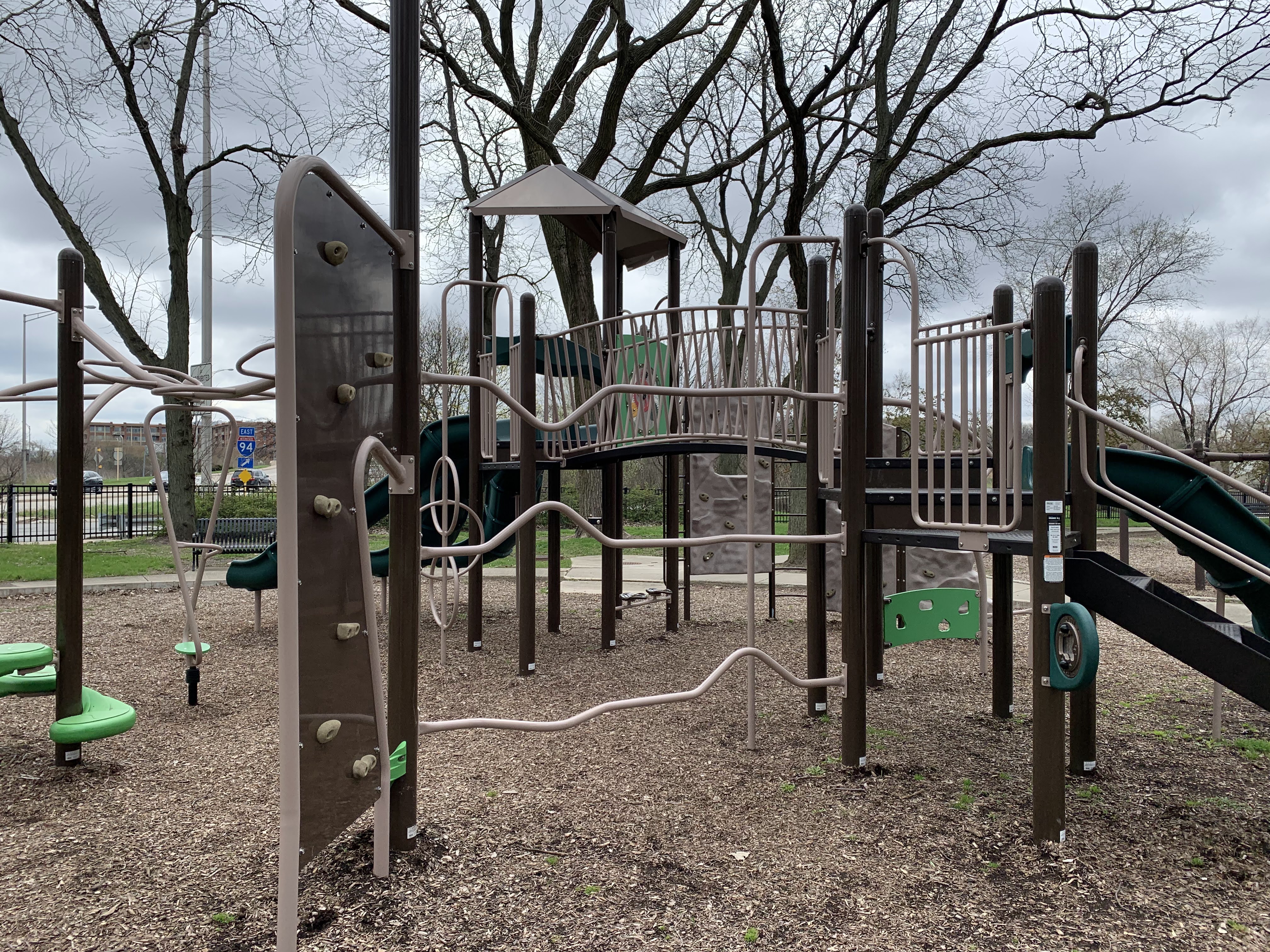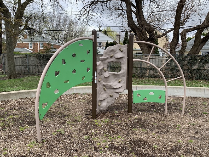 - The small De Julio Park features a playground most recently renovated in 2014 with a large play structure for older children, a swing set, and a few standalone elements. The large structure features a few slides as well as a variety of climbing walls and nets. The playground itself is well shaded by mature trees with a few benches doting the play area. The main play surface is wood chips though there is also a grassy area around the perimeter of the playground.