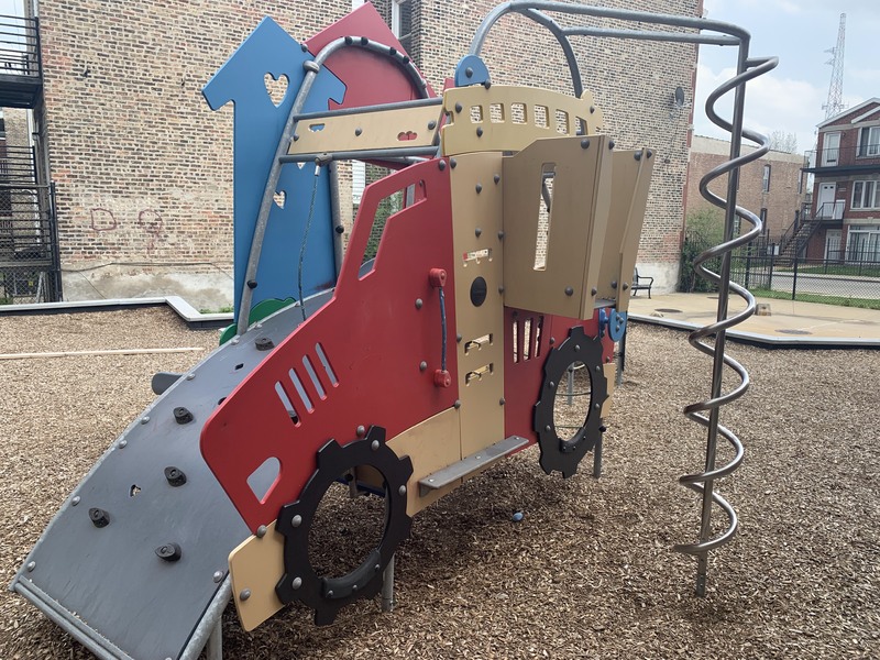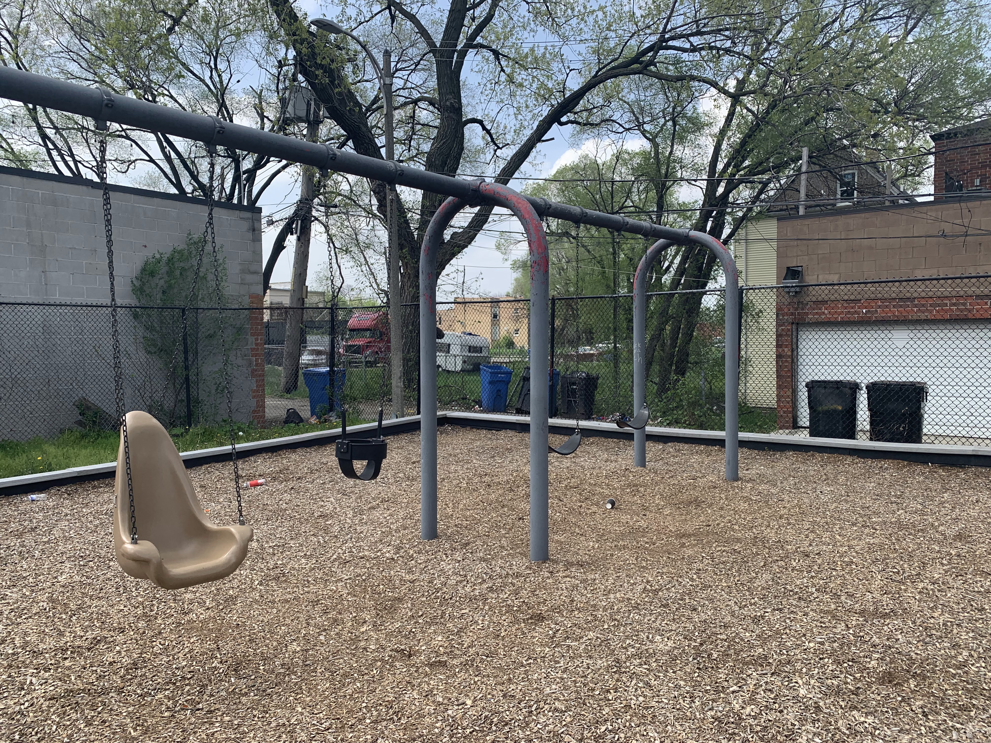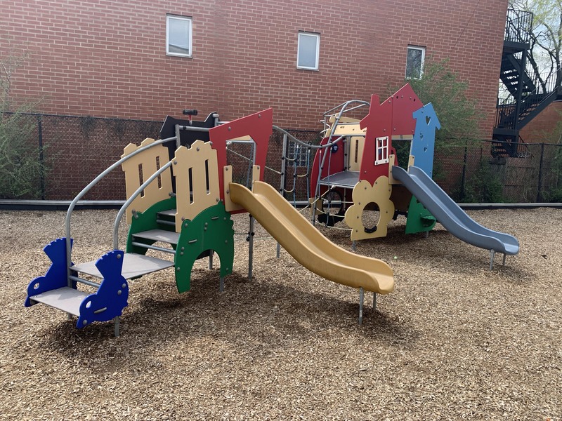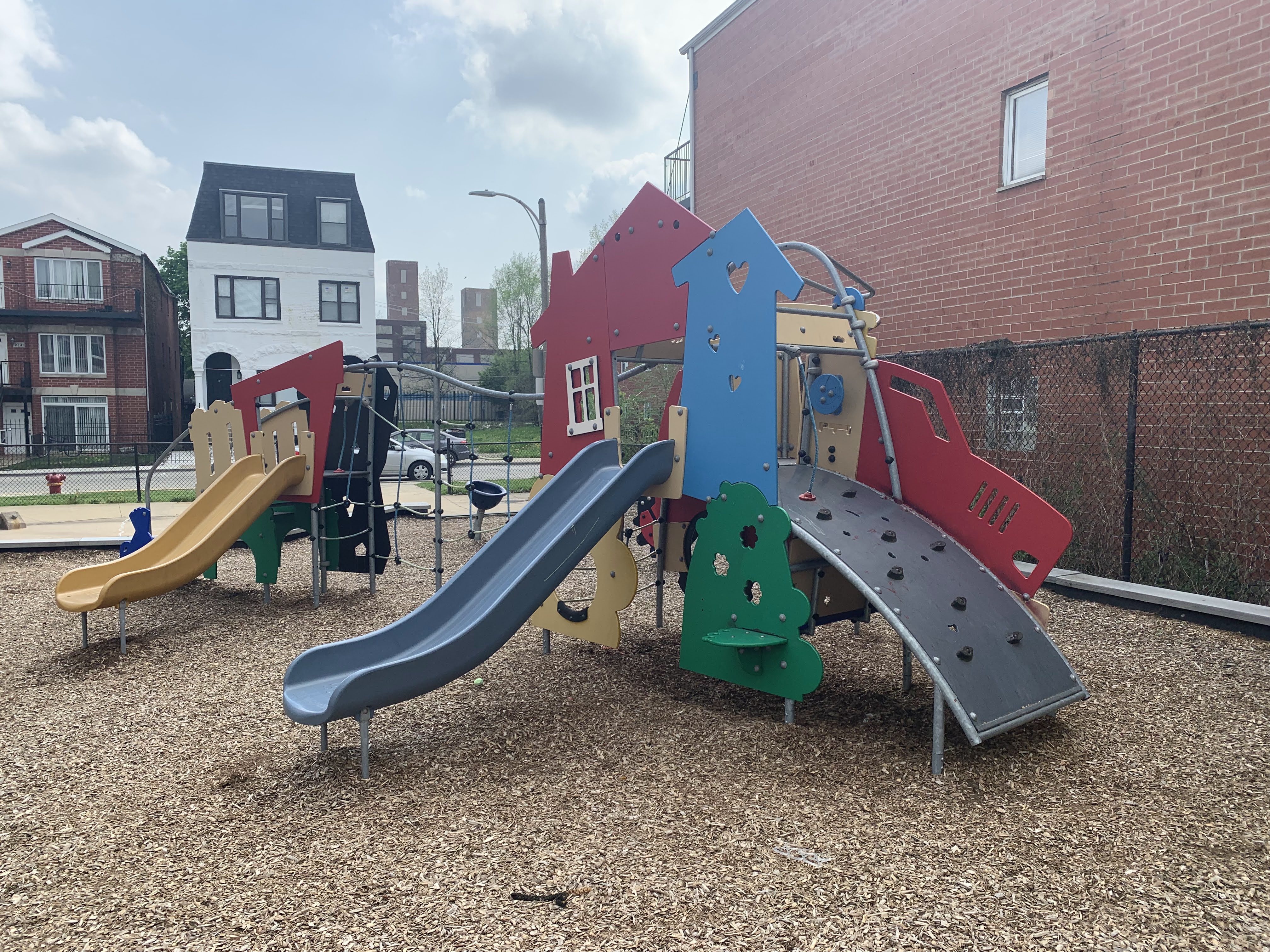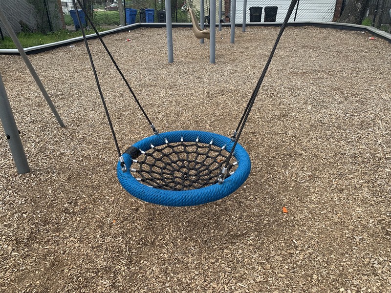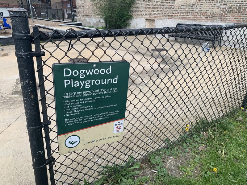 - Dogwood Park is in the middle of a residential block and features some unique playground equipment designed by Kompan. These striking structures are designed with bright colors and bold geometric shapes and both seem designed for younger children. An addition to these structures there are a few swings (toddler, molded plastic, belt, and a saucer swing with spider web seat) and a few other standalone elements. There is also a simple four sprayer water feature near this playground. The surface is wood chips and the play area is fenced but not fully enclosed. There is a single bench for seating near the entrance to this playground.
