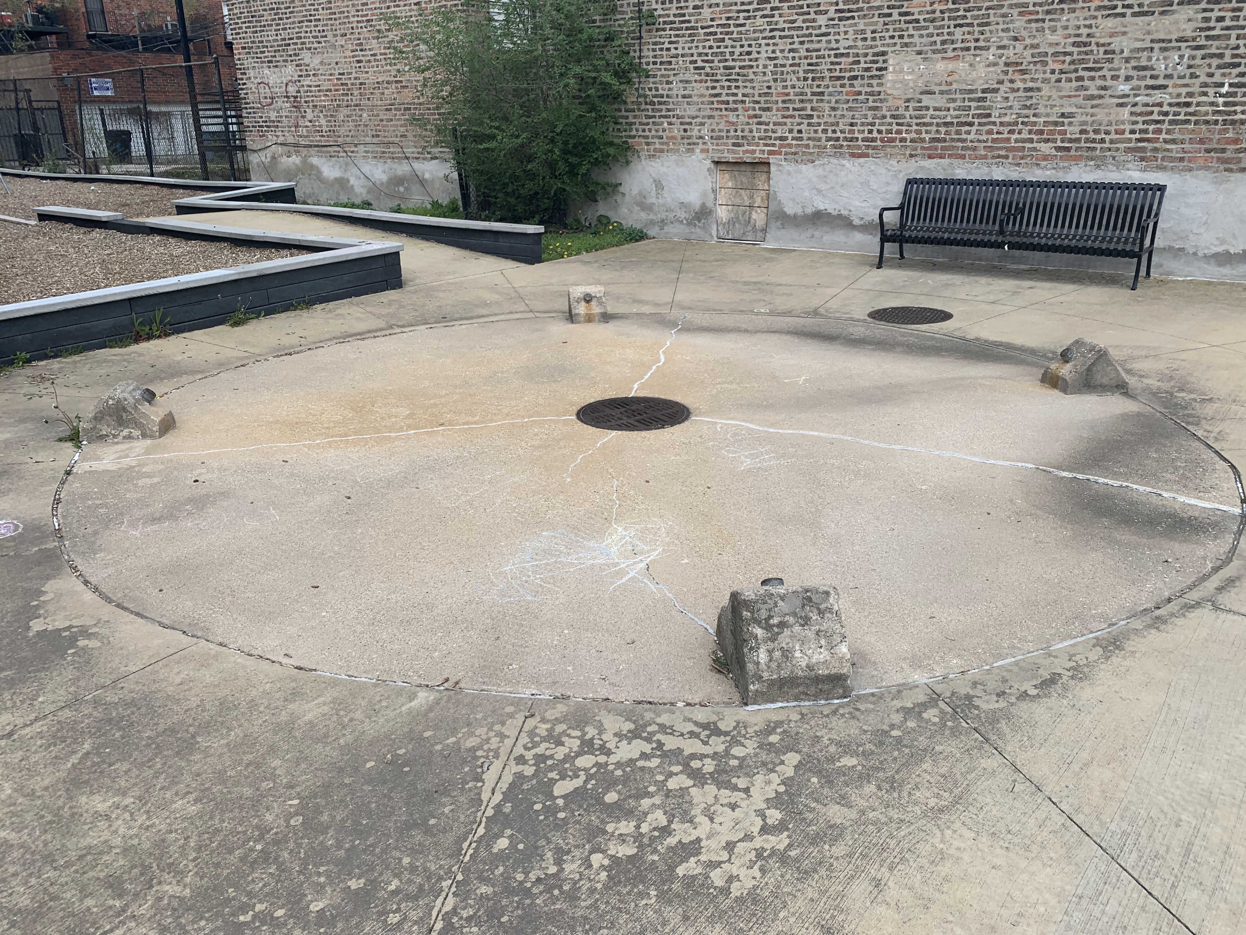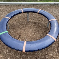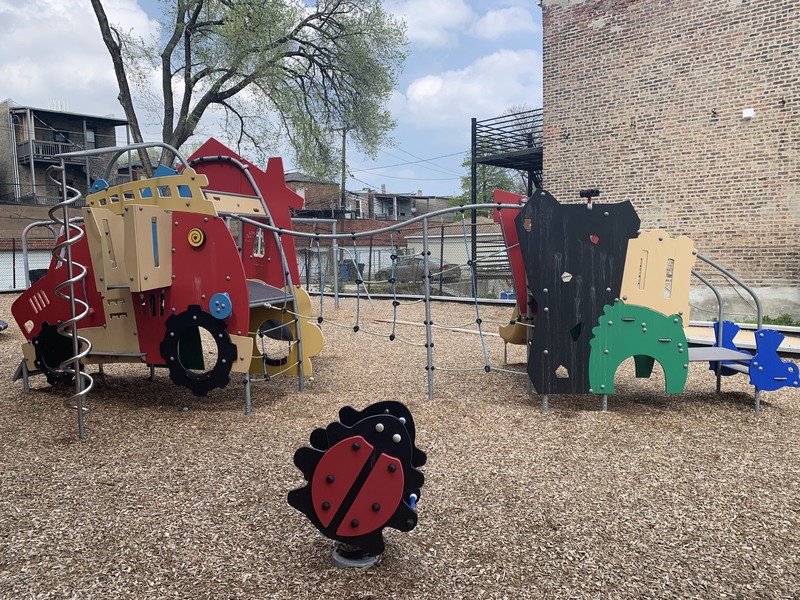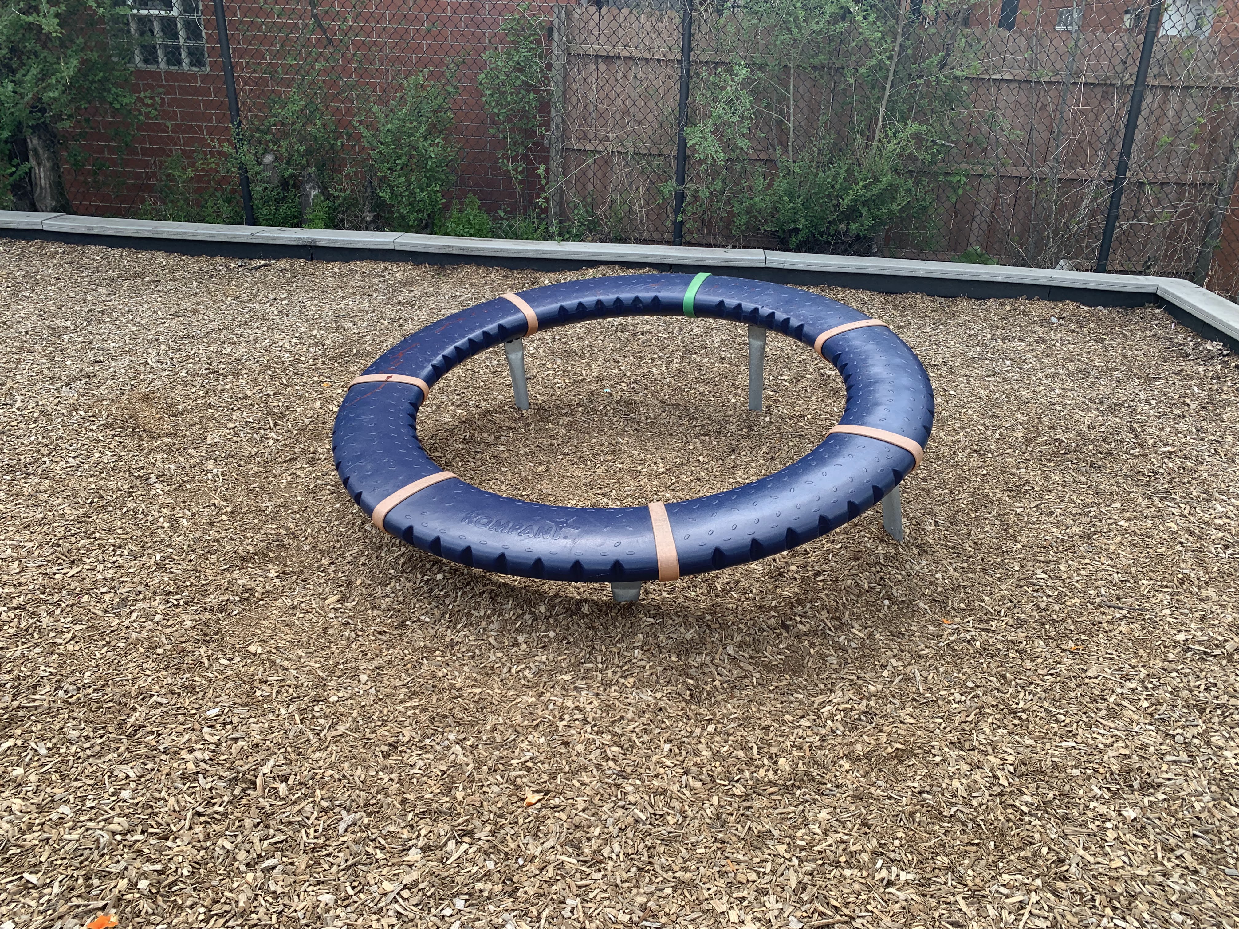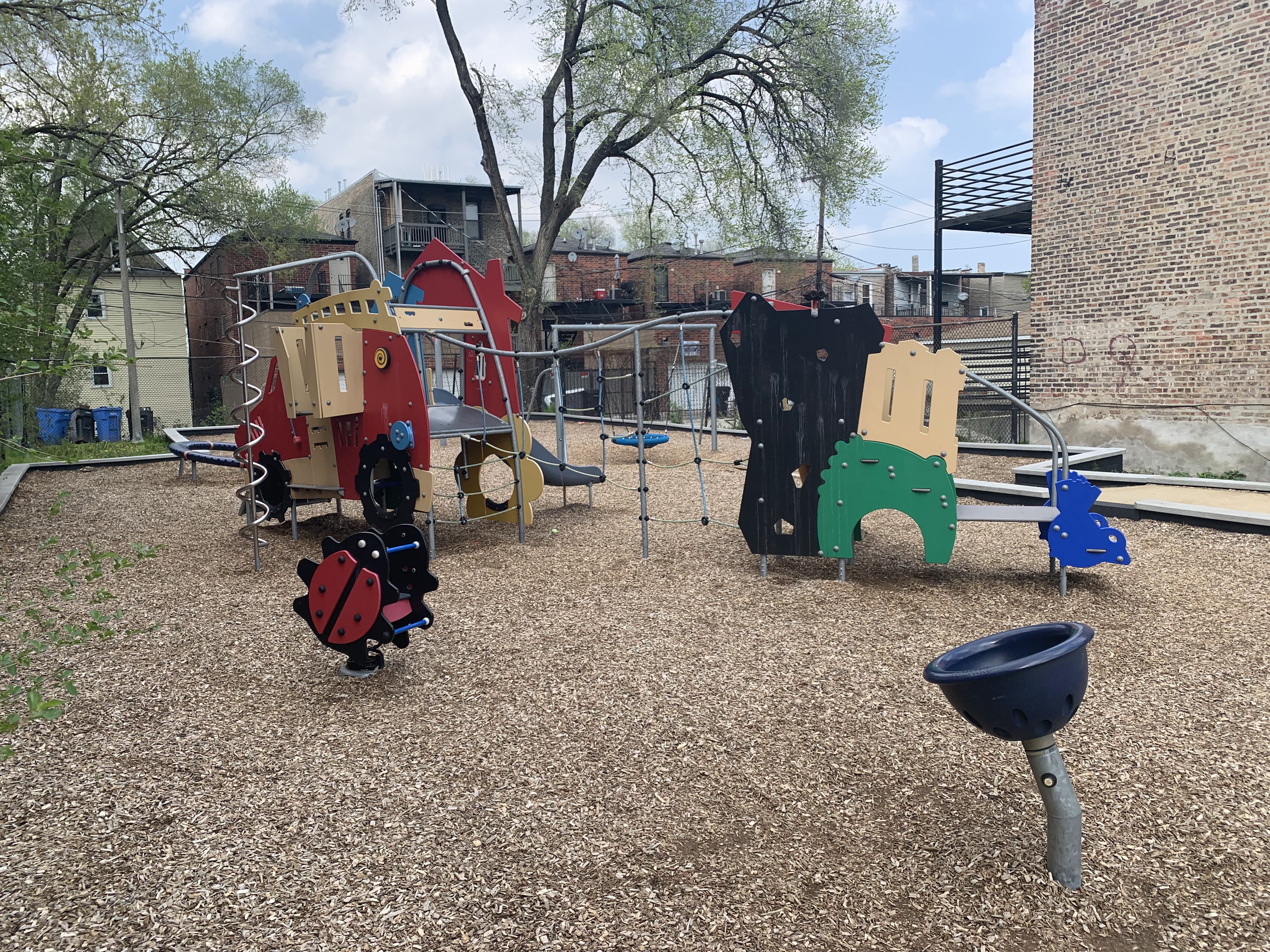 - Dogwood Park is in the middle of a residential block and features some unique playground equipment designed by Kompan. These striking structures are designed with bright colors and bold geometric shapes and both seem designed for younger children. An addition to these structures there are a few swings (toddler, molded plastic, belt, and a saucer swing with spider web seat) and a few other standalone elements. There is also a simple four sprayer water feature near this playground. The surface is wood chips and the play area is fenced but not fully enclosed. There is a single bench for seating near the entrance to this playground.