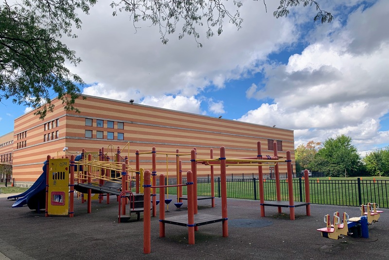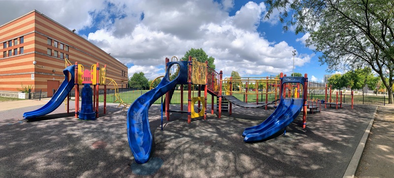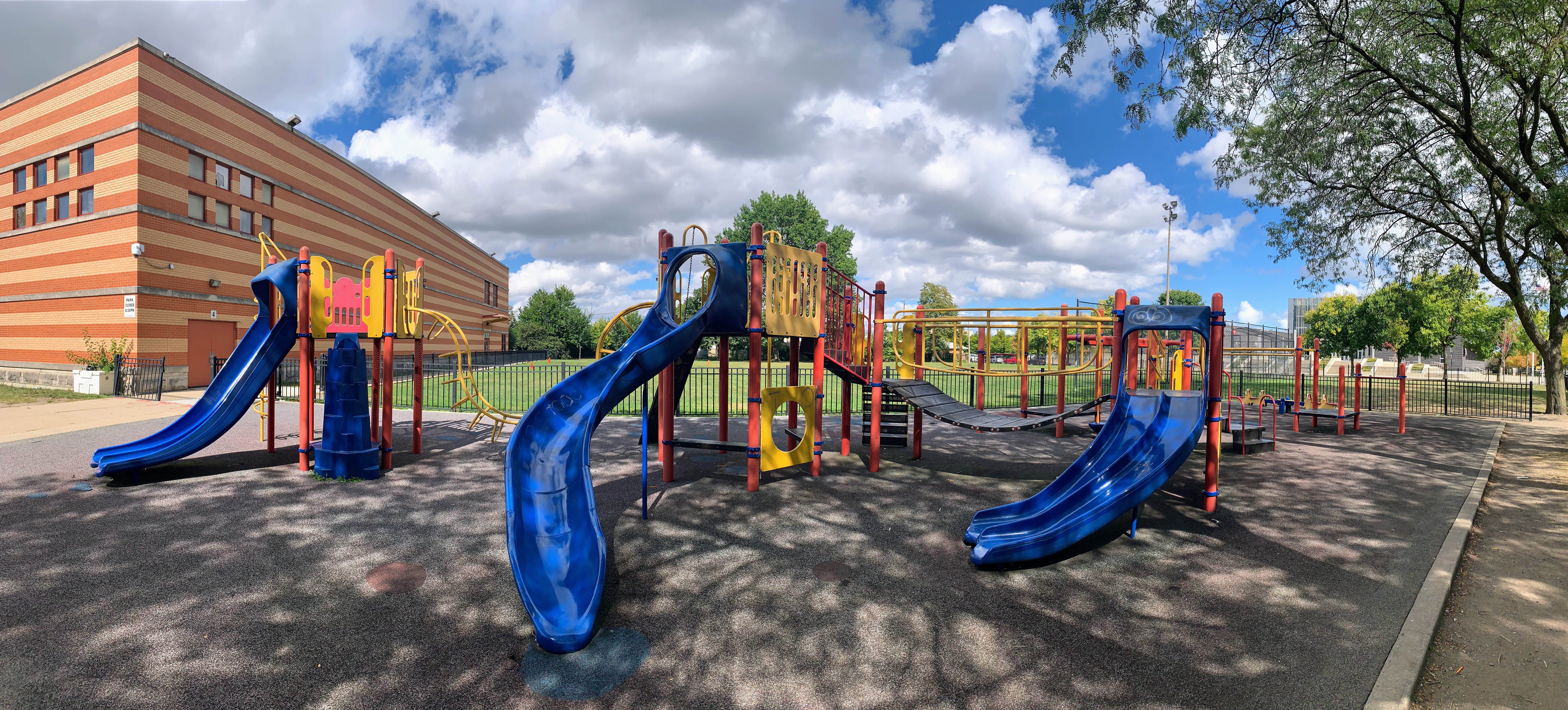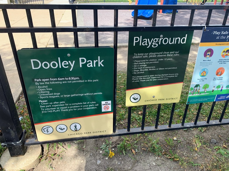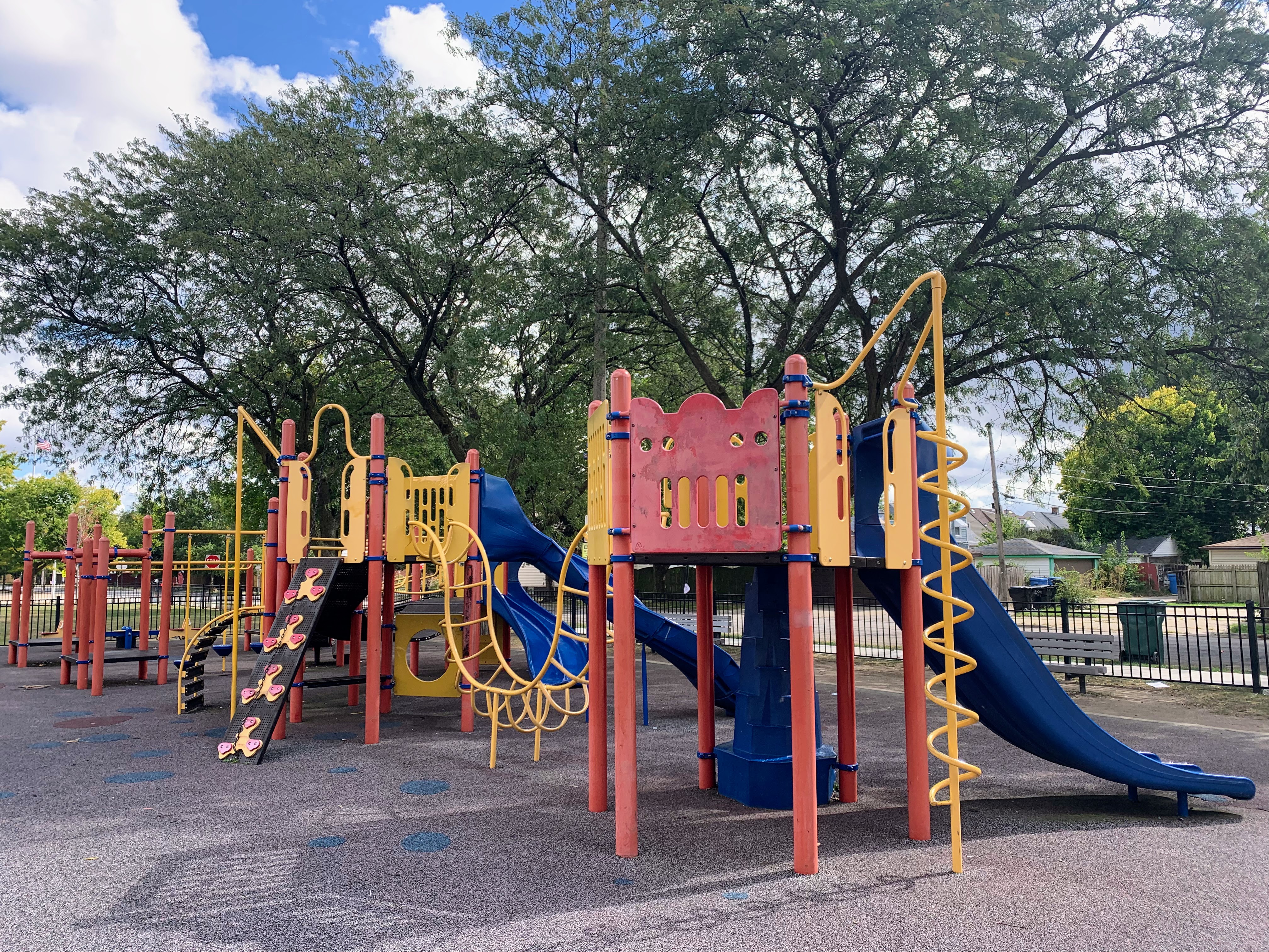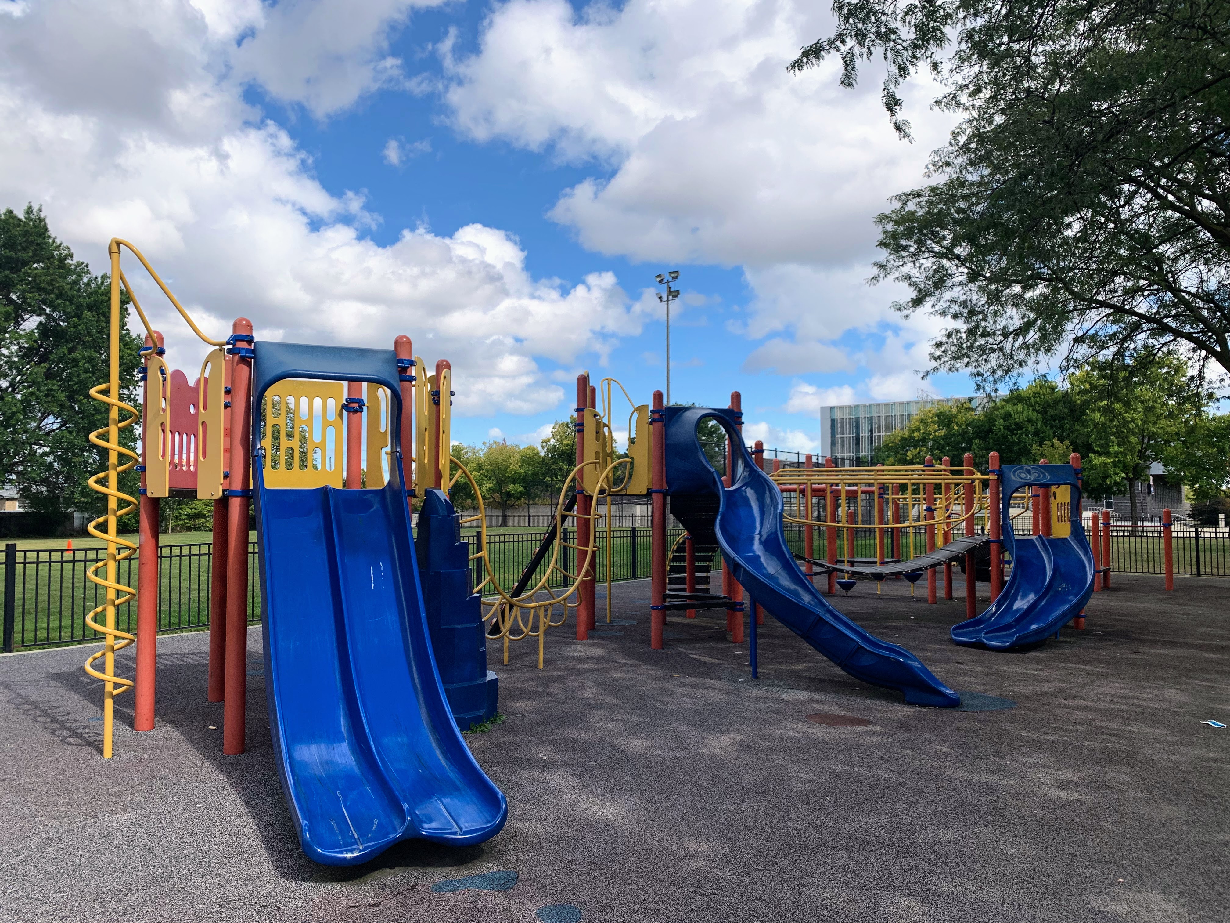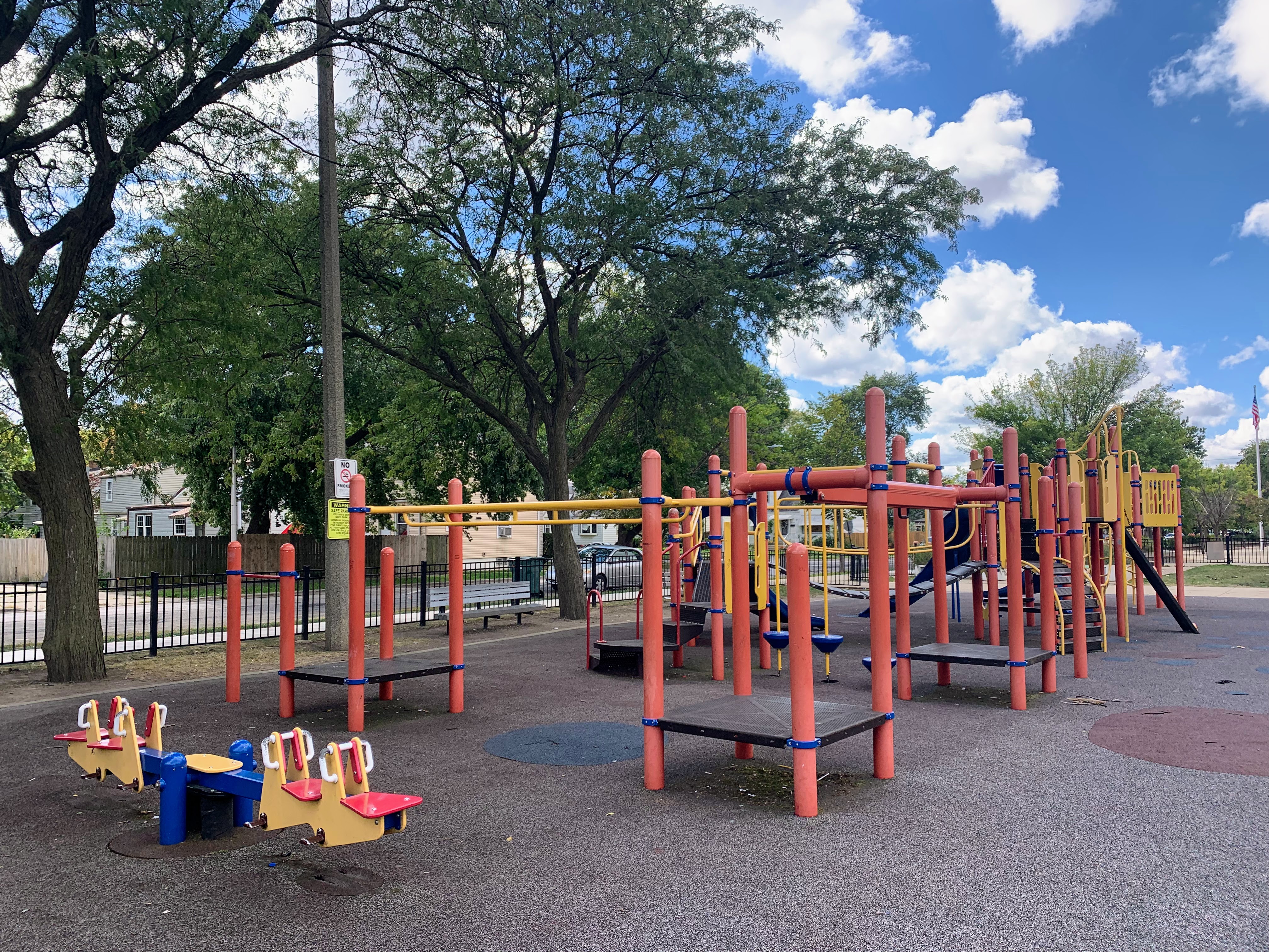 The playground at Dooley Park is a small site with well-loved but well-maintained equipment. The Chicago Park website doesn't provide information about the last renovation of this playground, but Google Streetview shows this same equipment in place since at least 2007. However, the main play structure is still quite functional with a variety of slides and climbing elements.