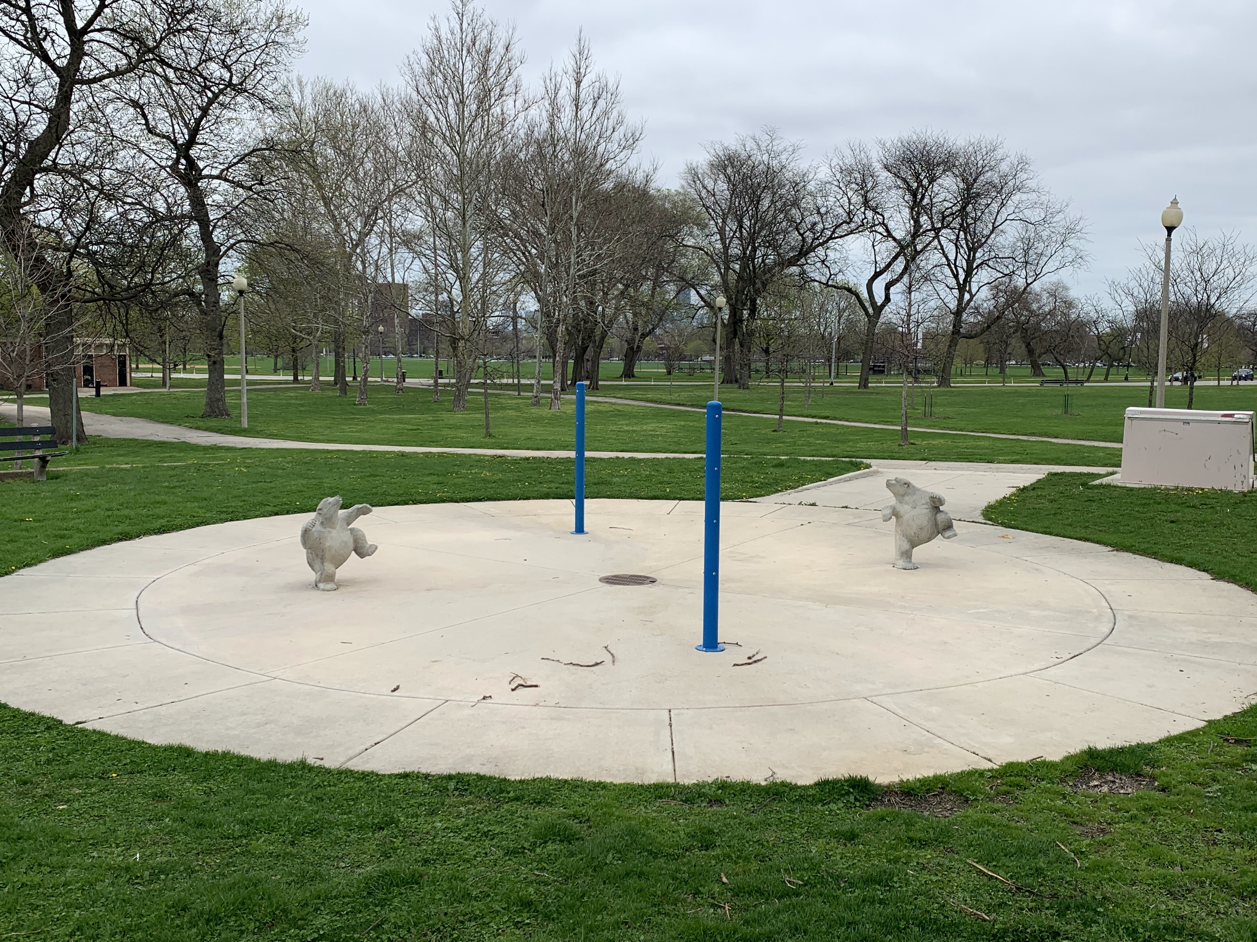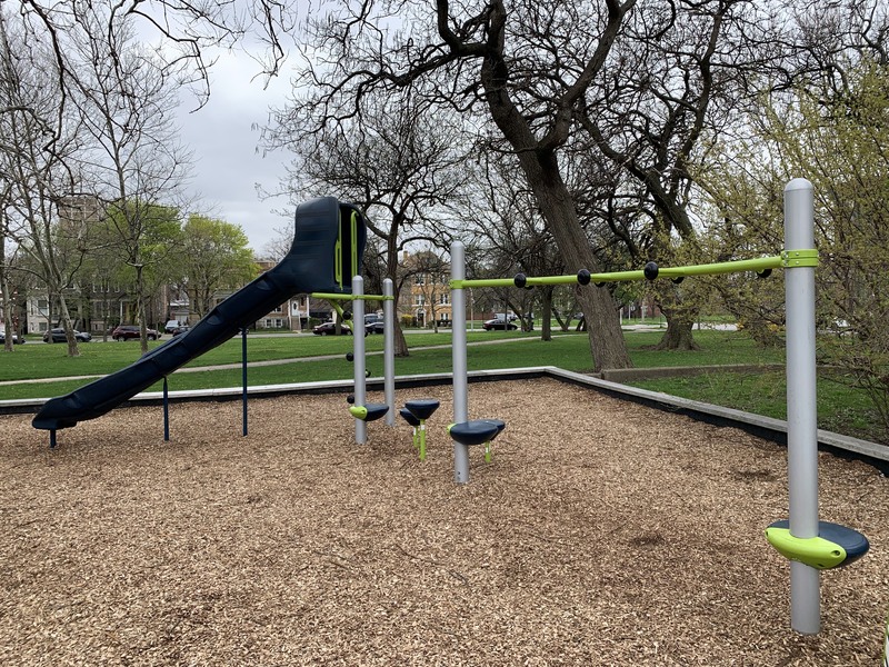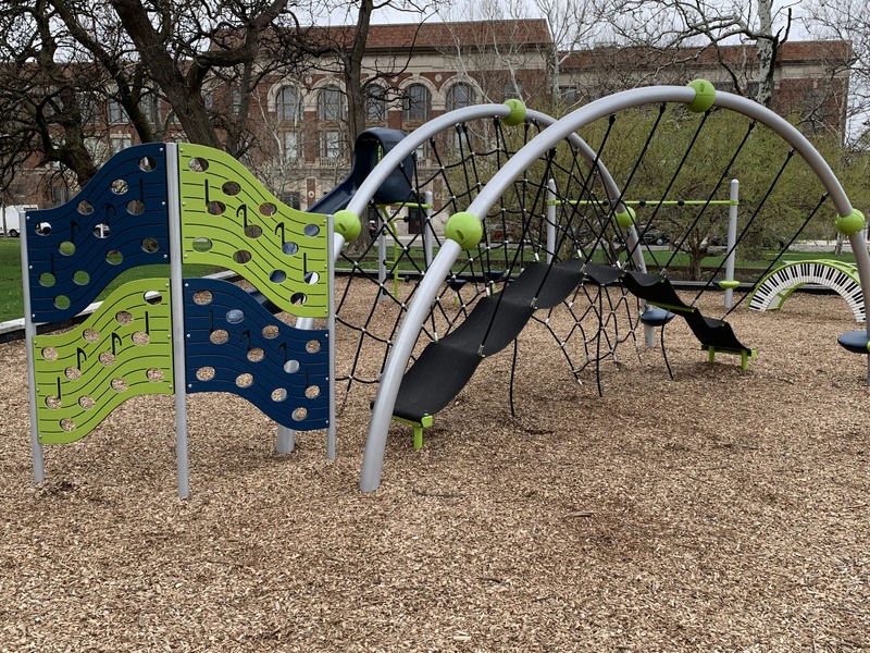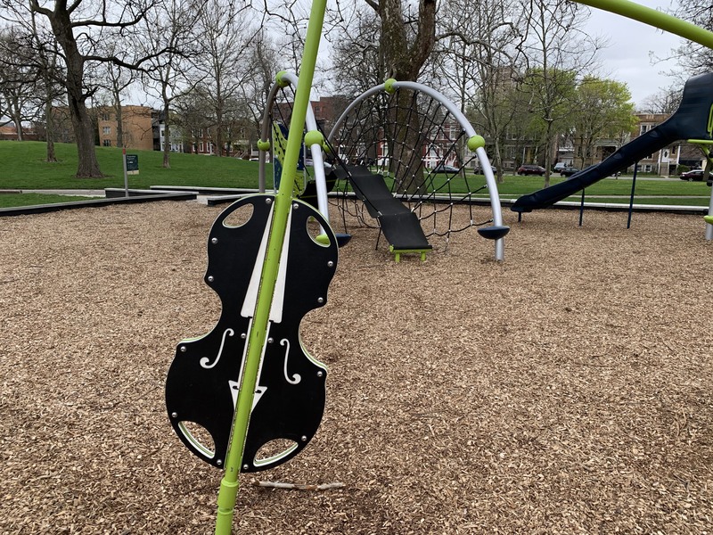 - This playground - one of five in Douglass Park - is in the southwest corner of the park near 19th and Albany. According to the Park District website, this playground is named " Sunshine Daydream Playground, in honor of a Grateful Dead song." Fittingly, this playground features a musical theme with a "music station" comprised of several panels with interactive musical instruments, a spinning cello, a piano climbing arch, and a climbing wall with musical notes. There are also modern climbing elements and the standard set of swings. Next to these elements, there is a small, modern water spray feature with two "misting poles" and two cement play animals. The play surface is wood chips and there are a few benches and large grassy areas and matures trees surrounding this playground.