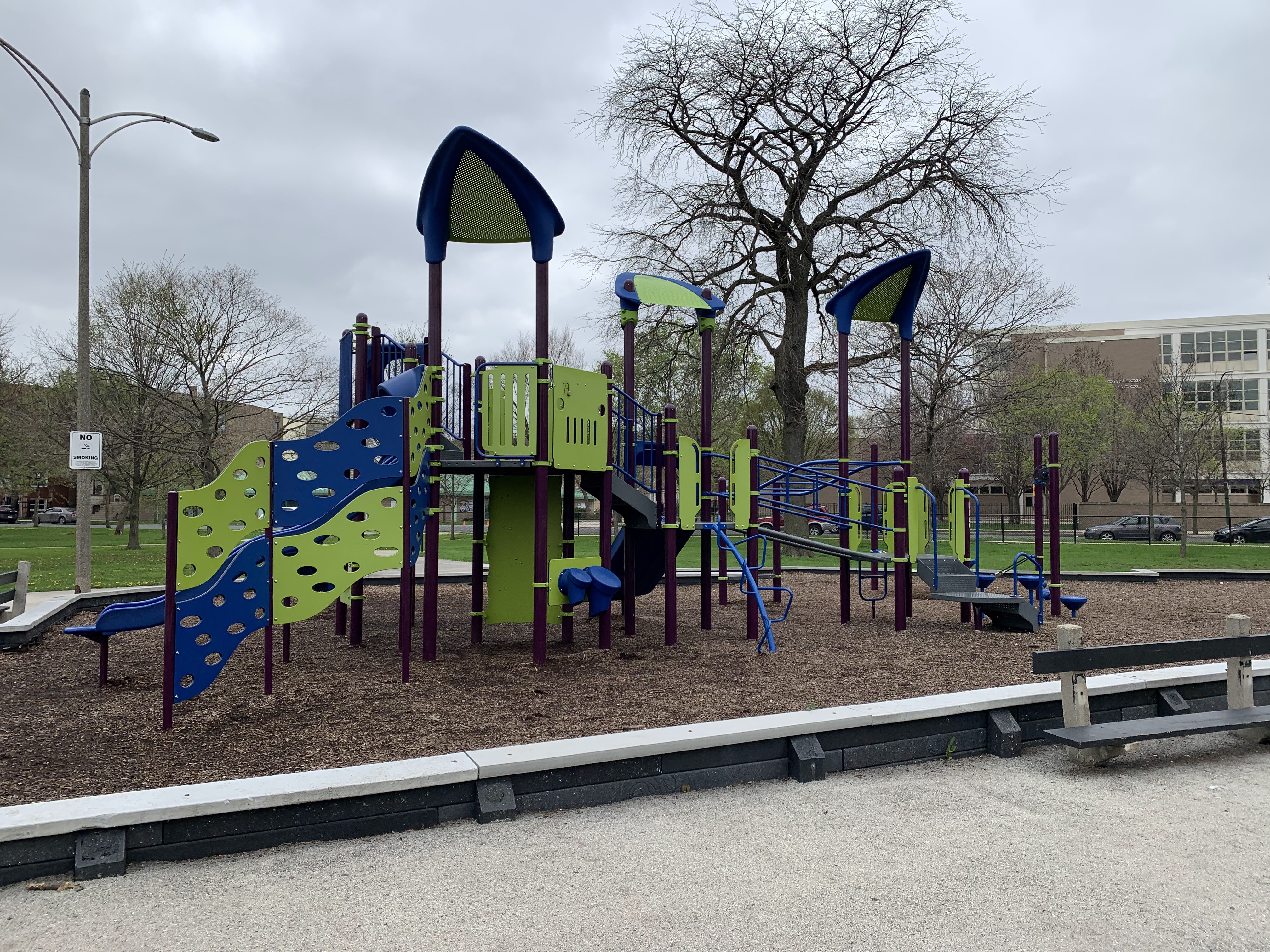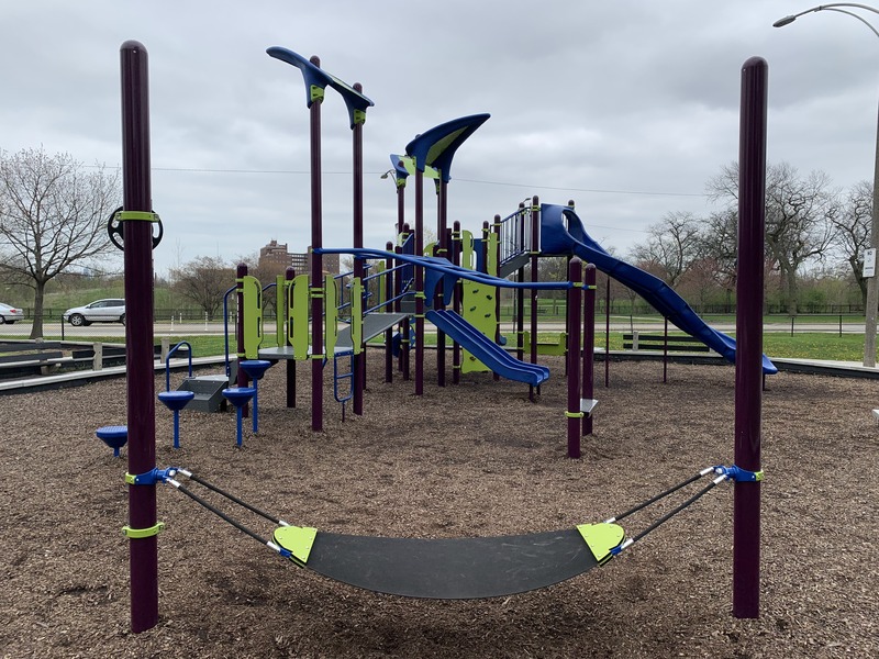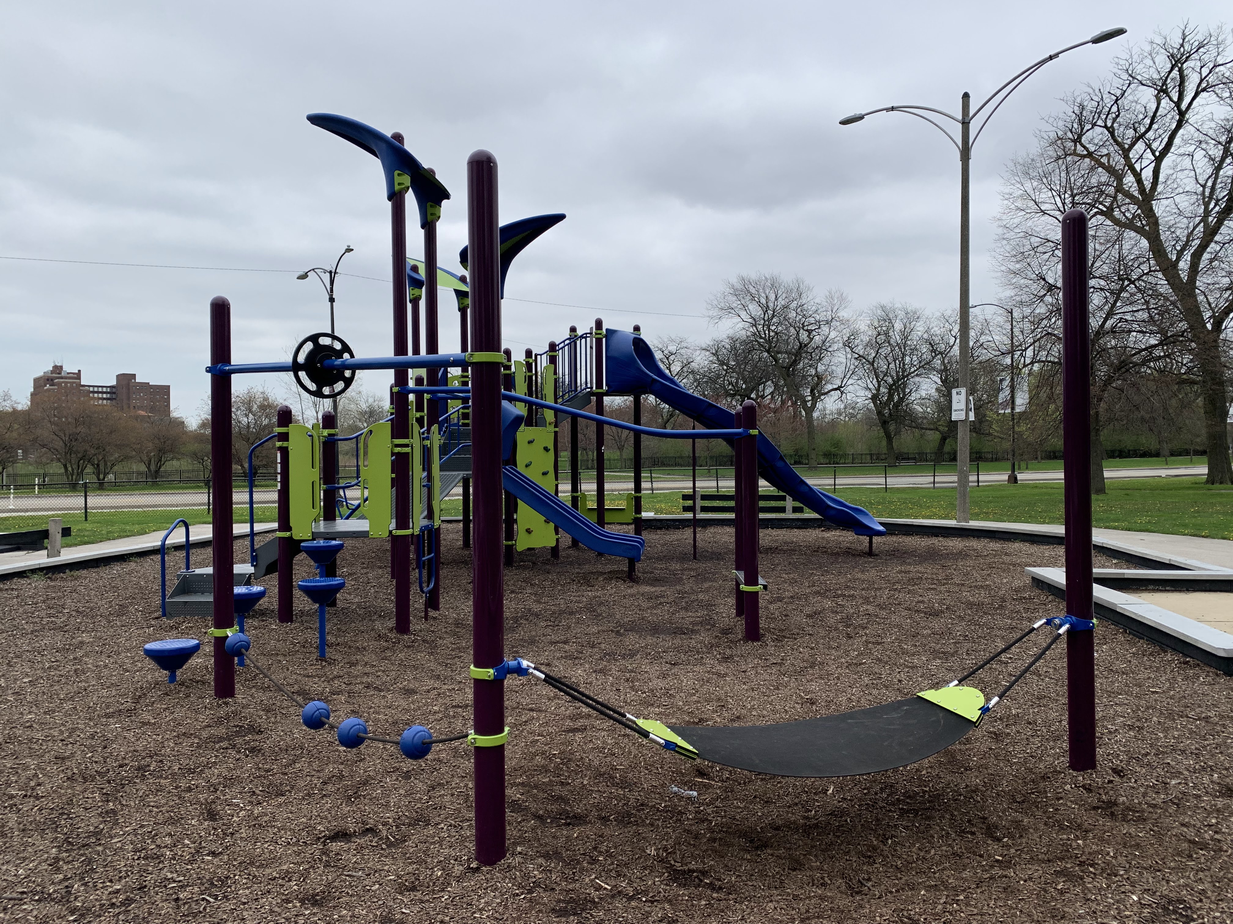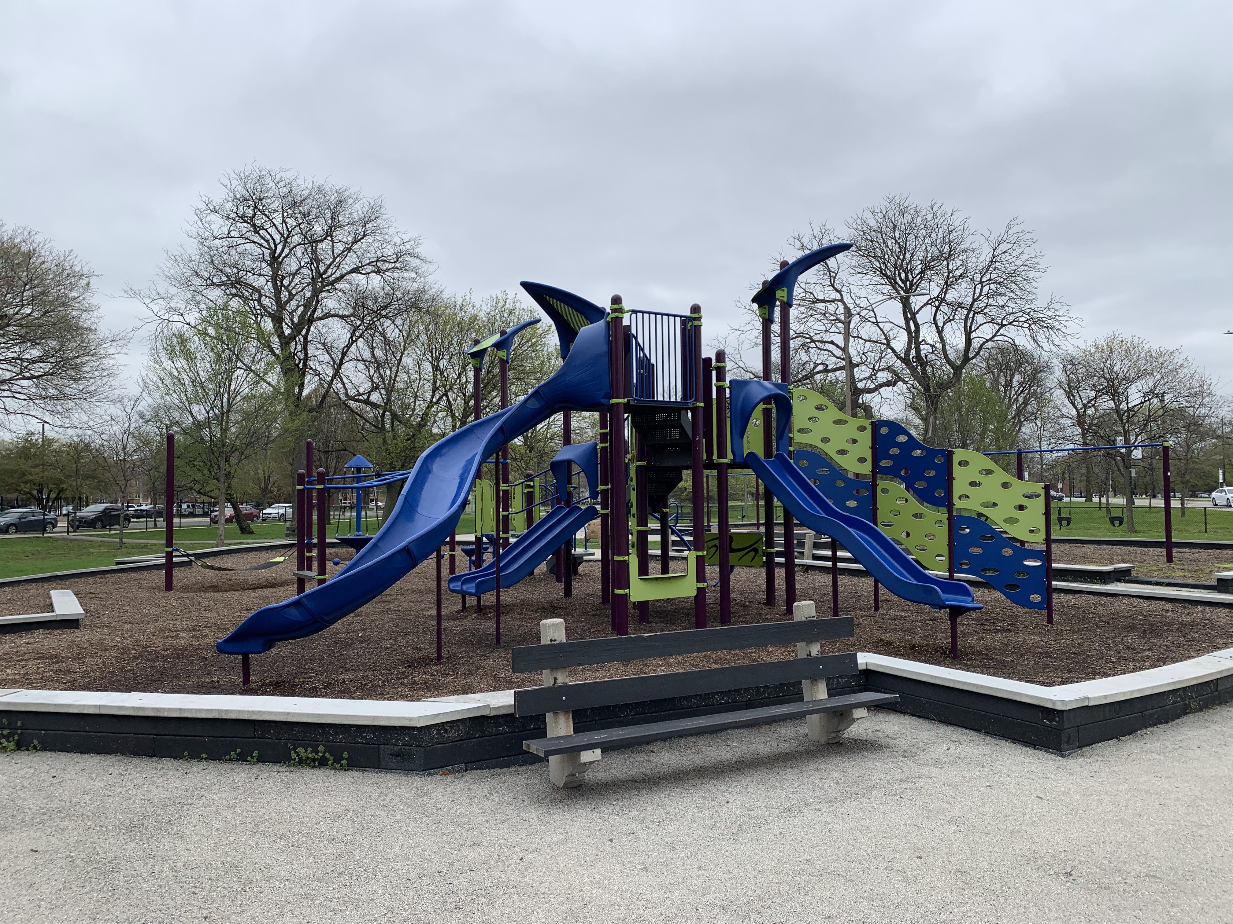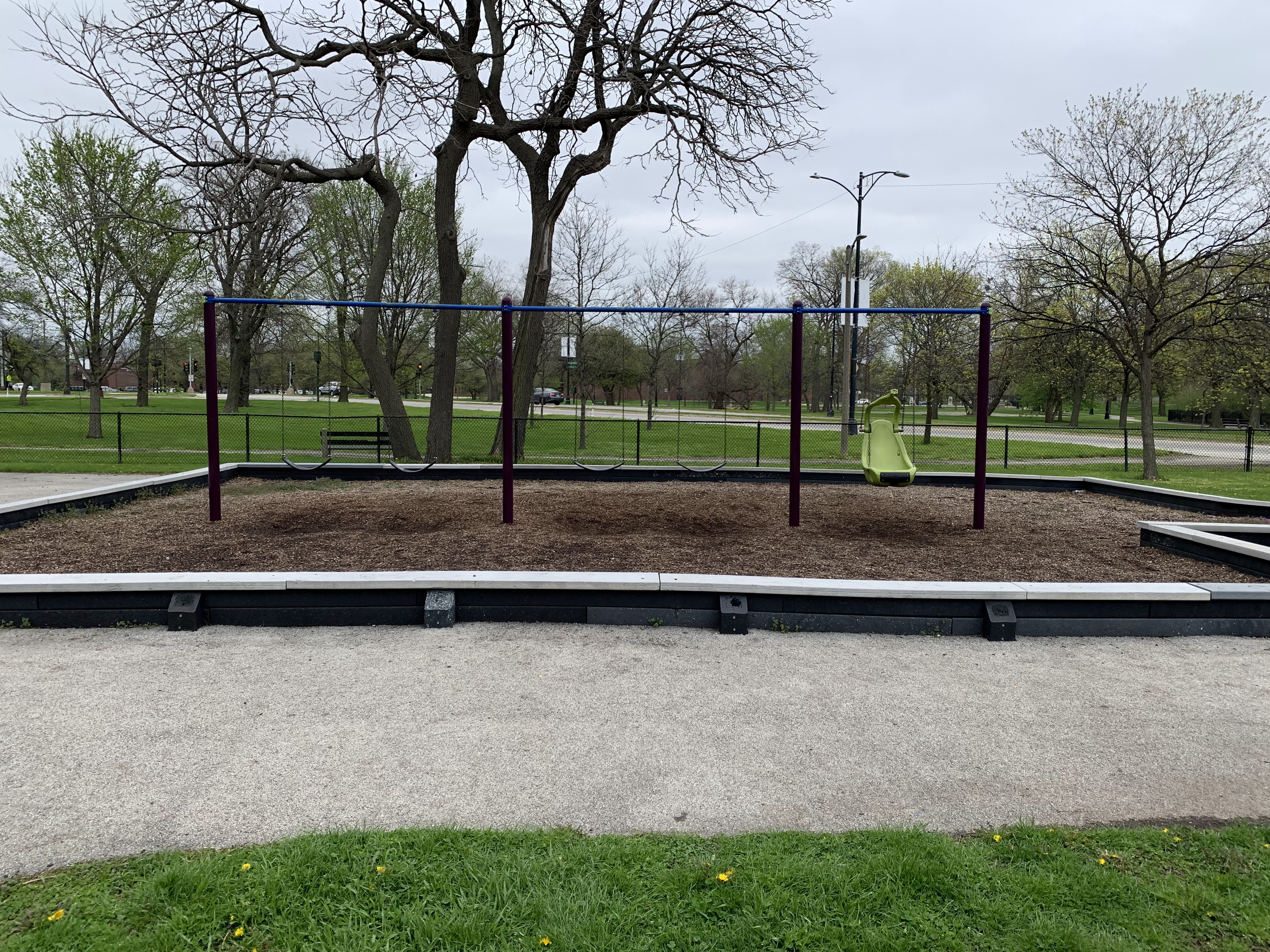 - This playground - one of five in Douglass Park - is in the west side of near 15th and Albany and features a large, modern play structure designed for older children. This structure features a few slides, climbing elements, and a large set of monkey bars in addition to the standard set of swings. The play surface is wood chips and there are a few benches scattered around the perimeter.