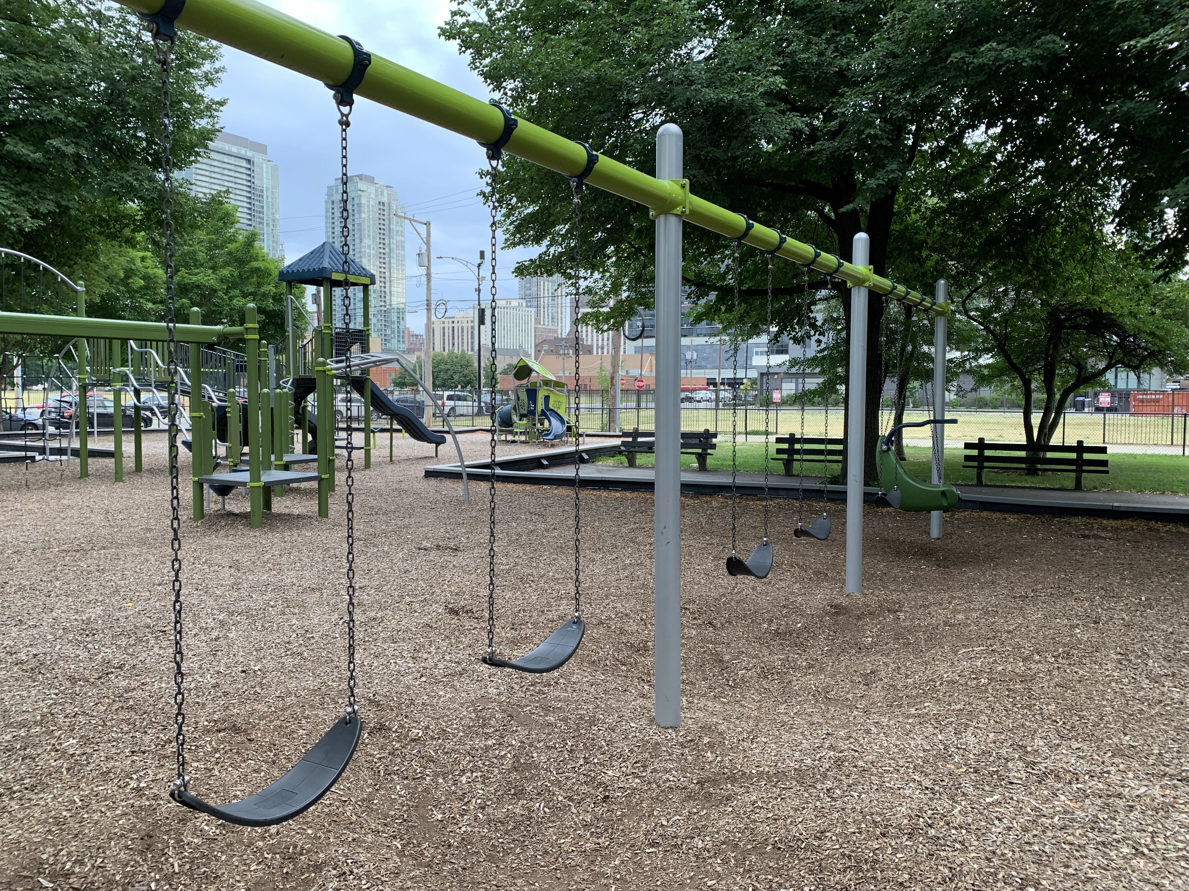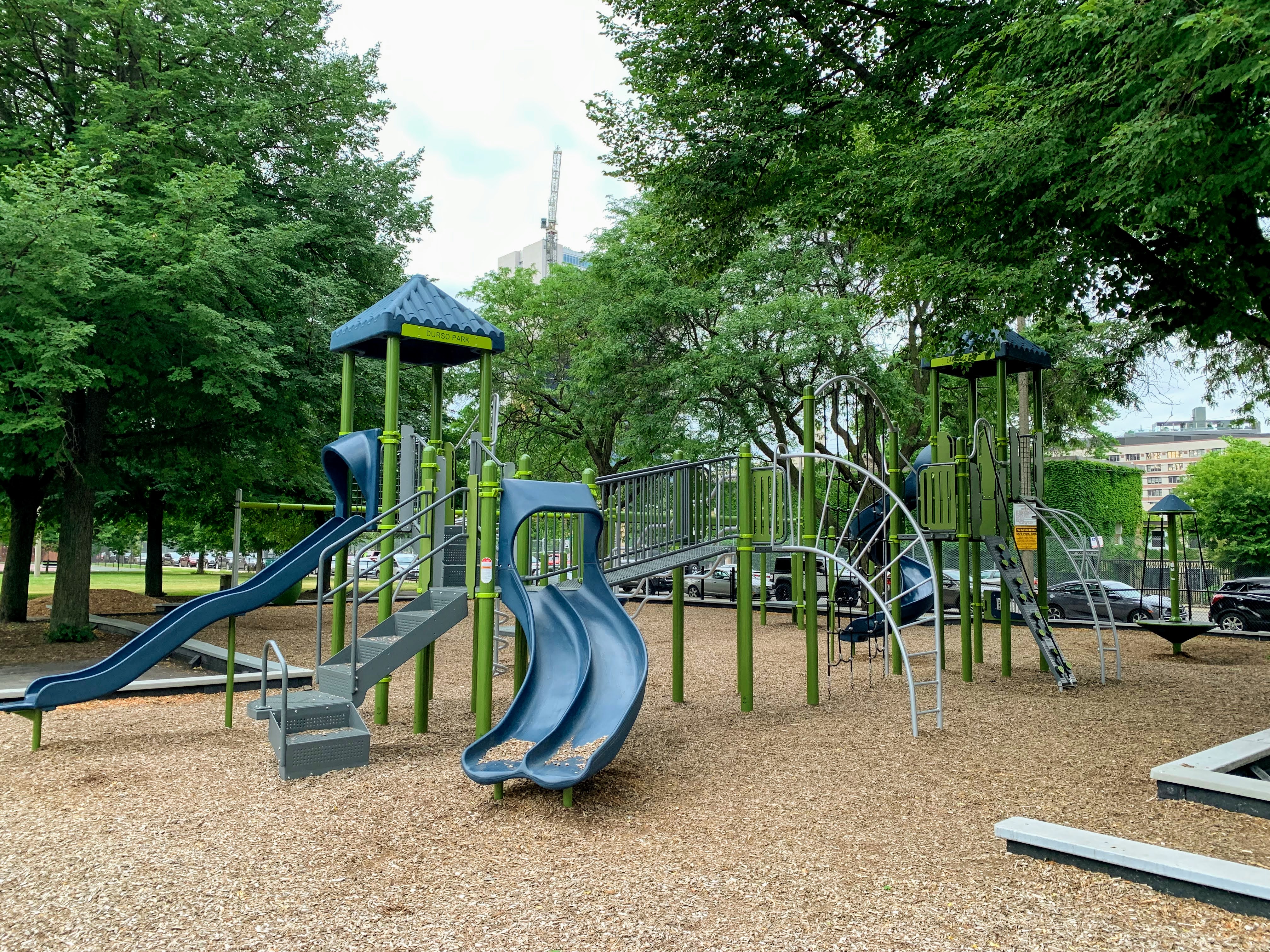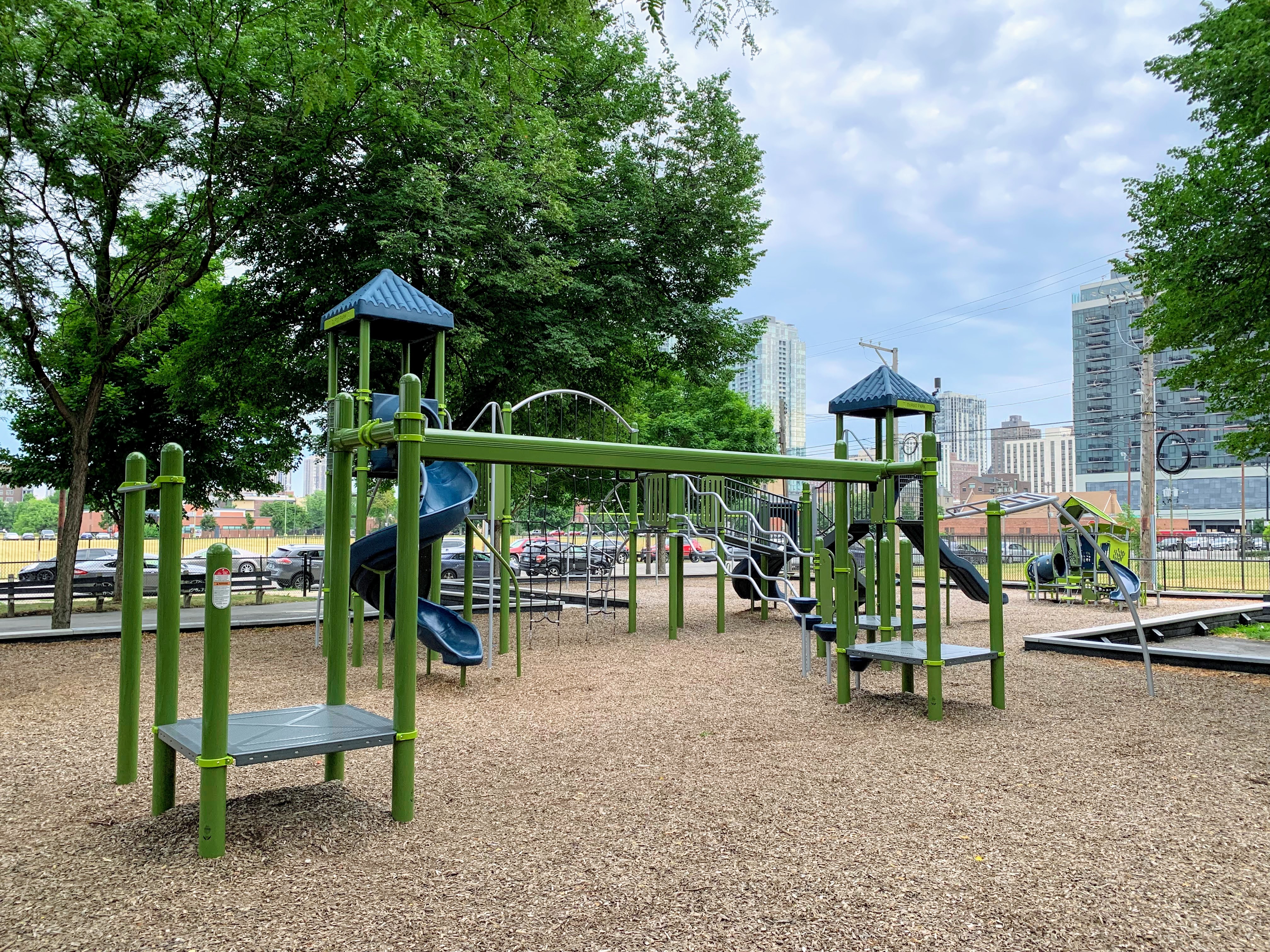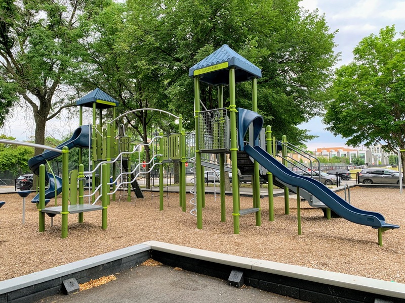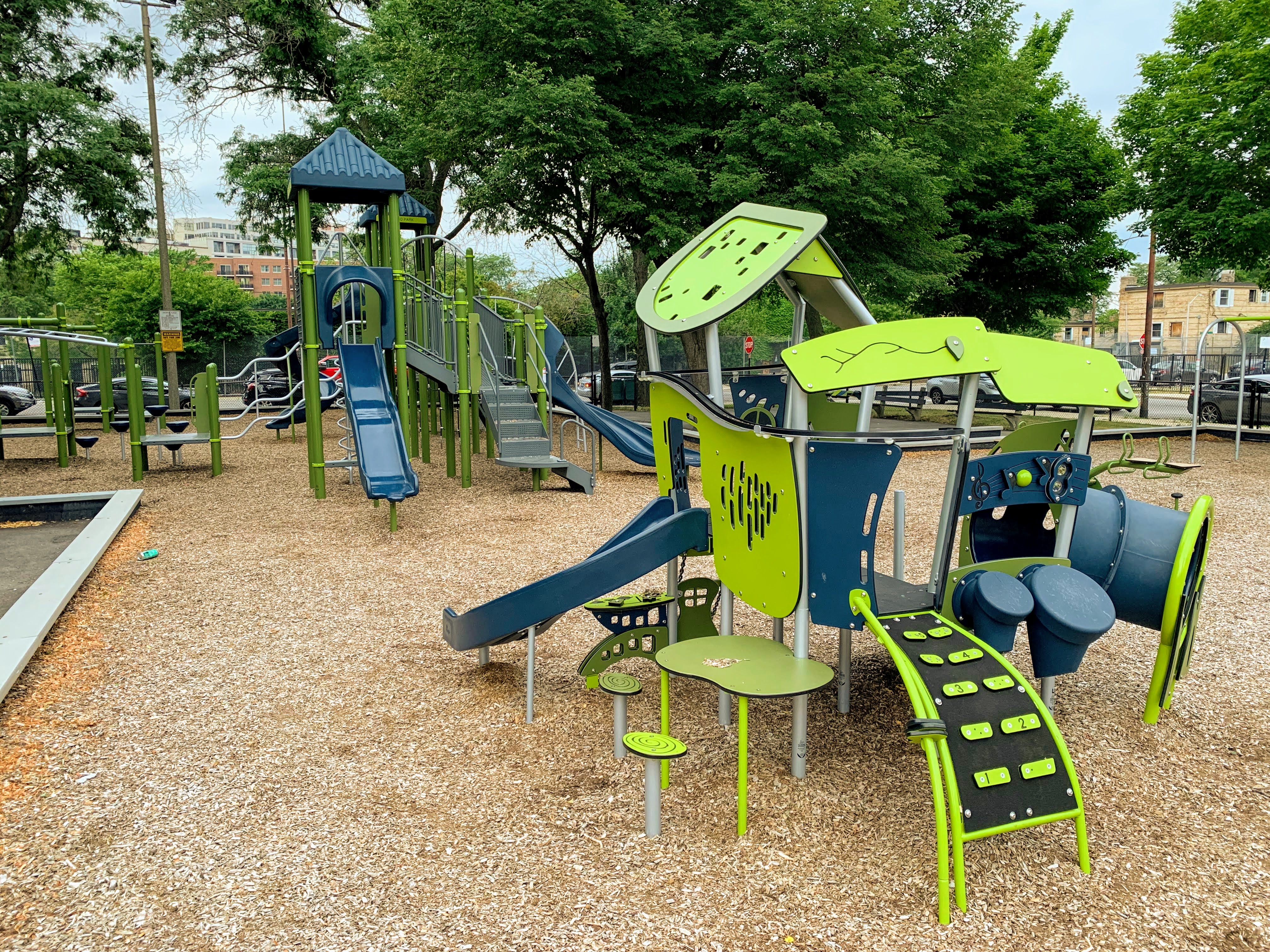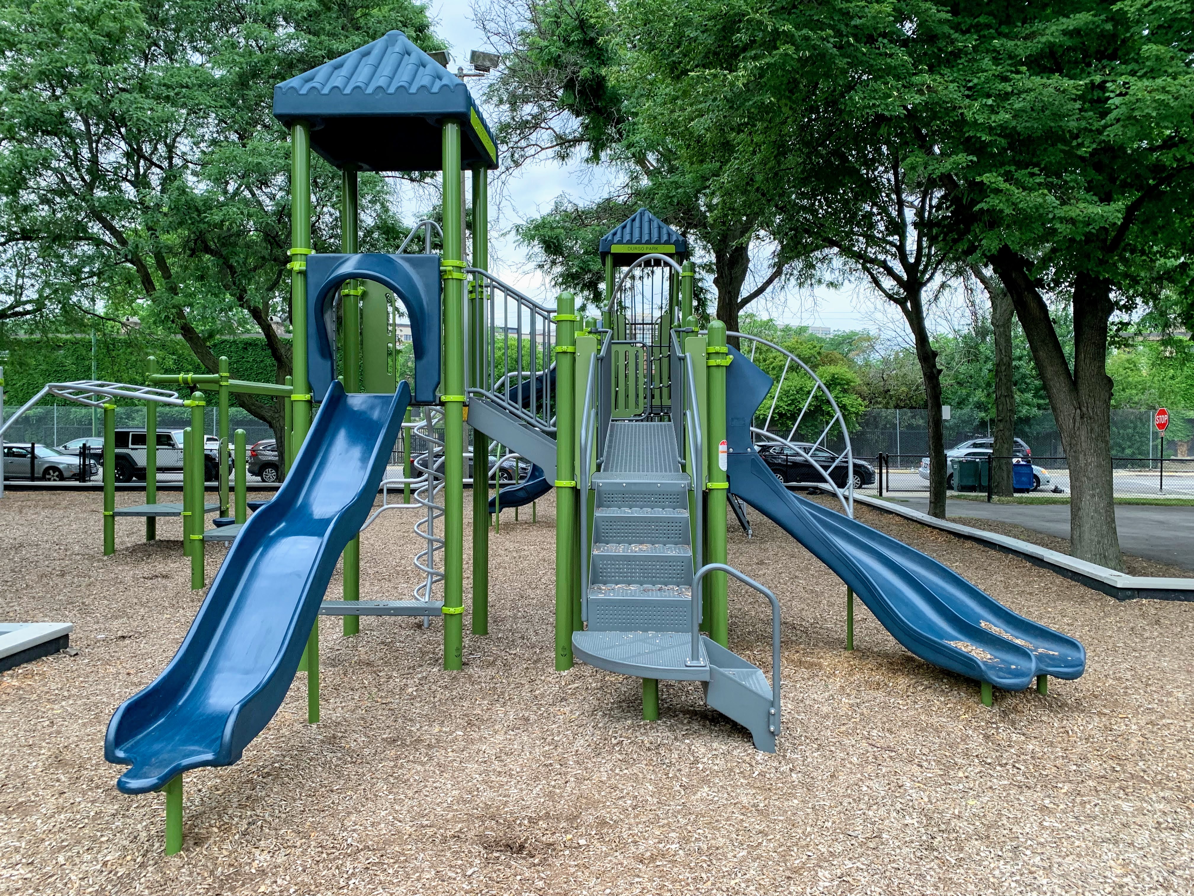 - The playground in Durso Park was renovated in the last few years and features new equipment with elements suitable for a wide range of children. There is a large play structure for older children featuring a few slides and climbing elements as well as interesting overhead elements like a curving set of monkey bars and an overhead slider. The play structure for younger children is considerably smaller but very clean and modern. There are a few additional standalone elements as well as the standard set of Park District swings. The playground is fenced from the street but is not fully enclosed and the play surface is wood chips. There are a few benches and a few large trees providing some shade.