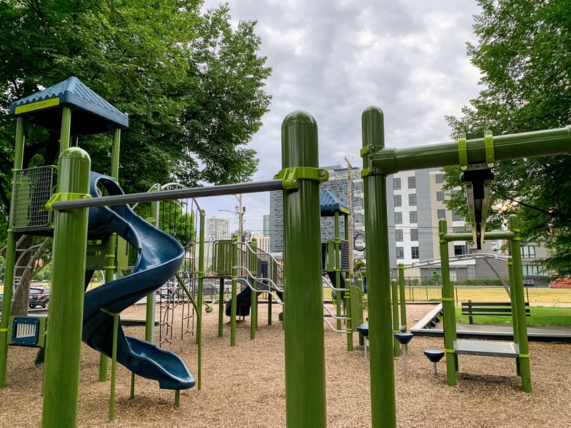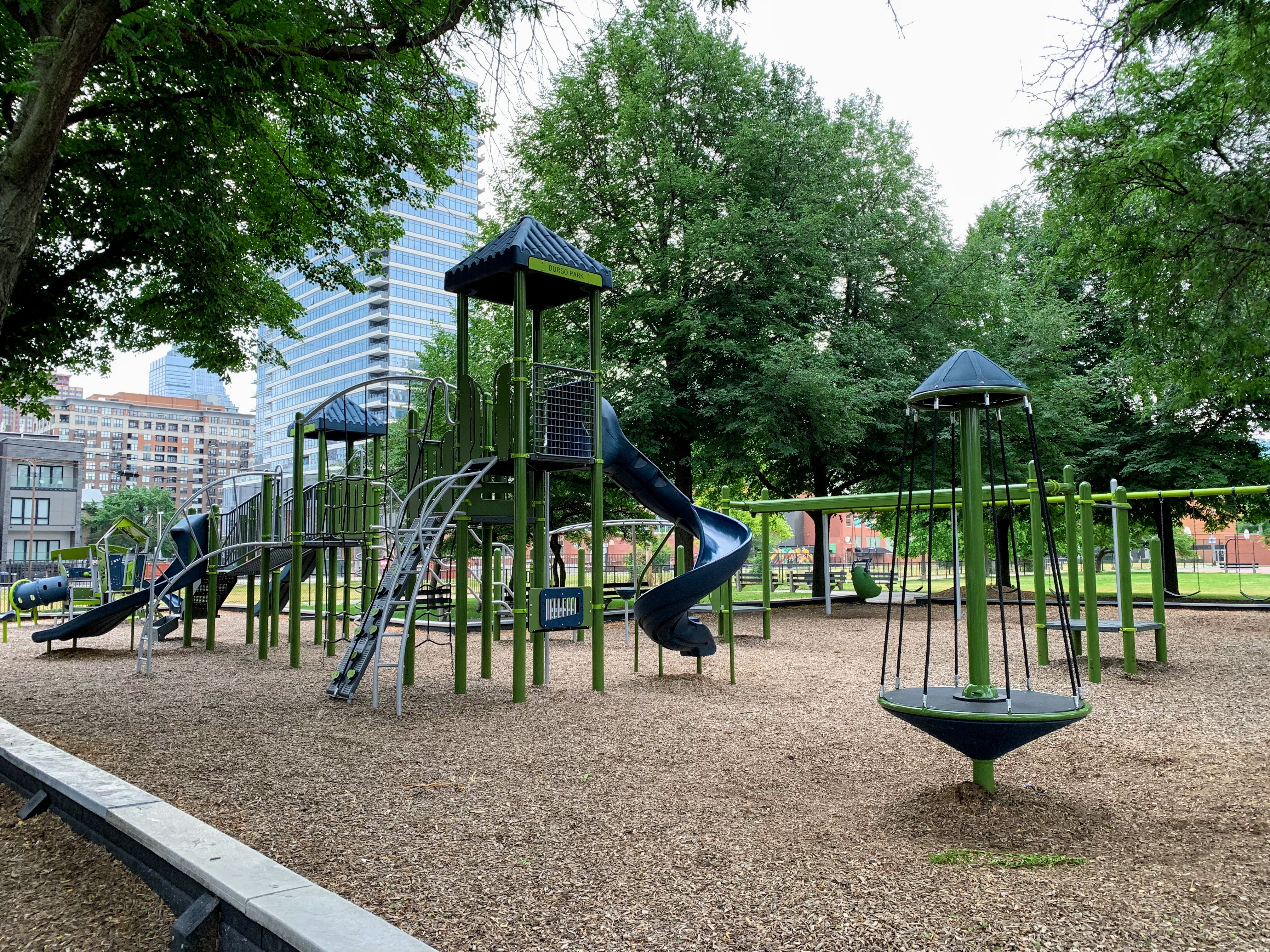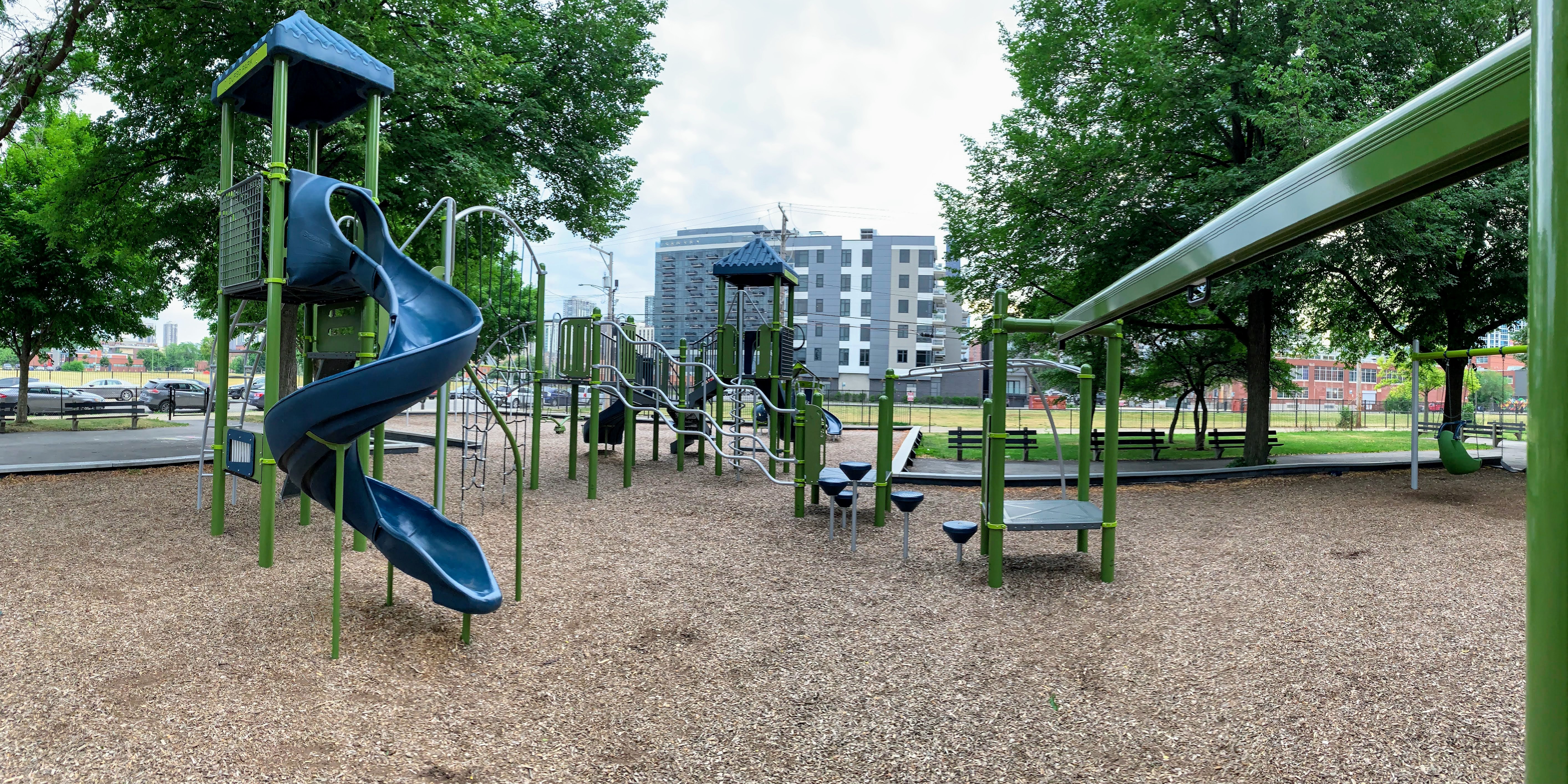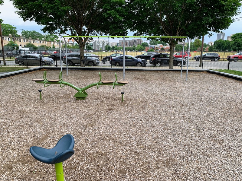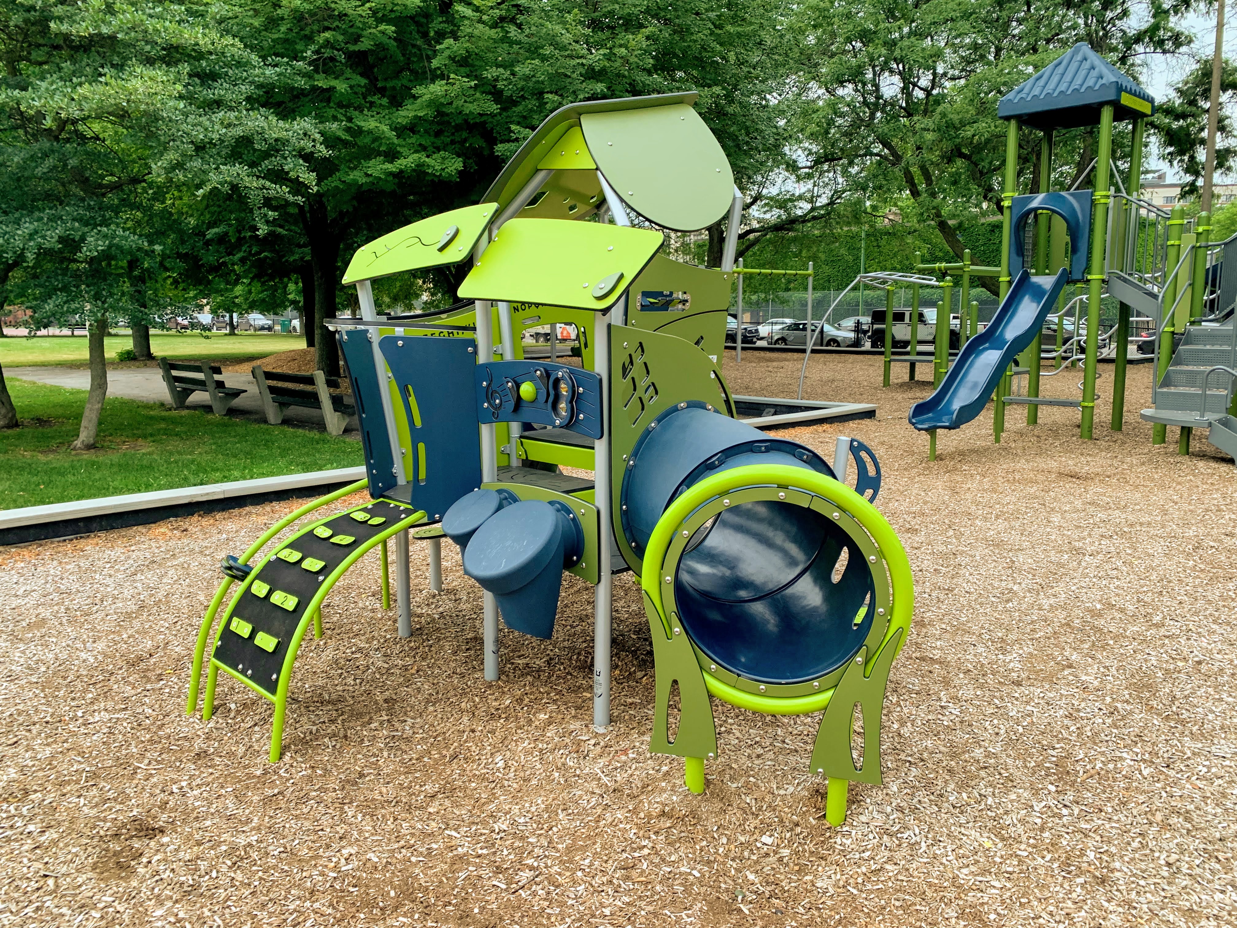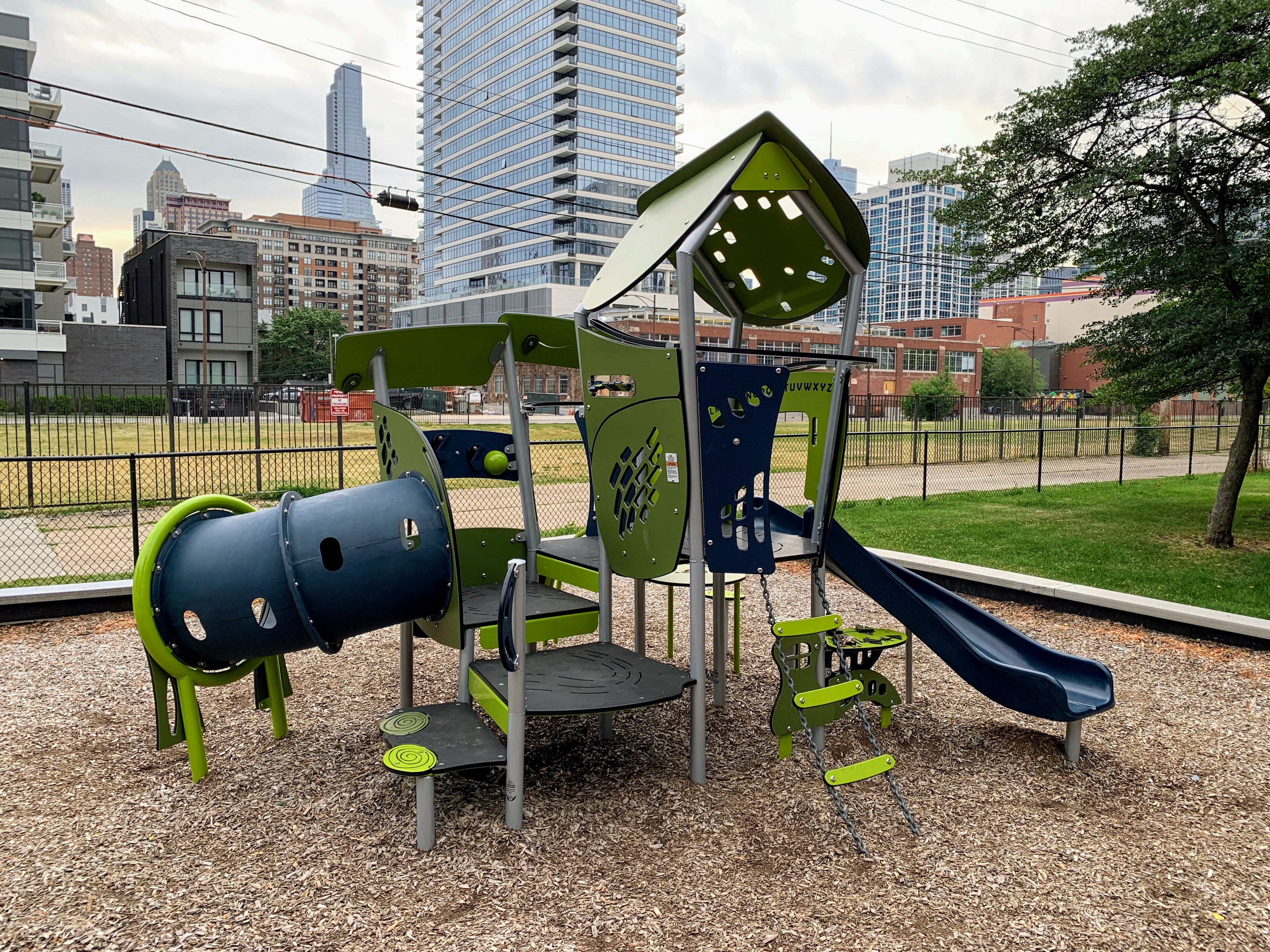 - The playground in Durso Park was renovated in the last few years and features new equipment with elements suitable for a wide range of children. There is a large play structure for older children featuring a few slides and climbing elements as well as interesting overhead elements like a curving set of monkey bars and an overhead slider. The play structure for younger children is considerably smaller but very clean and modern. There are a few additional standalone elements as well as the standard set of Park District swings. The playground is fenced from the street but is not fully enclosed and the play surface is wood chips. There are a few benches and a few large trees providing some shade.