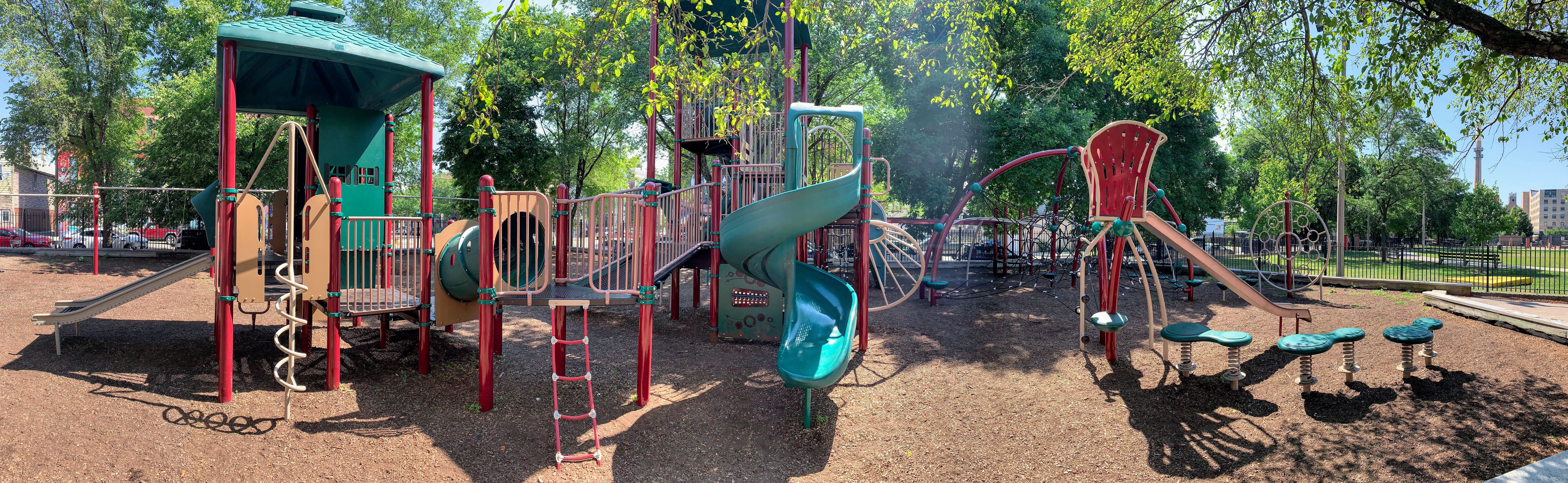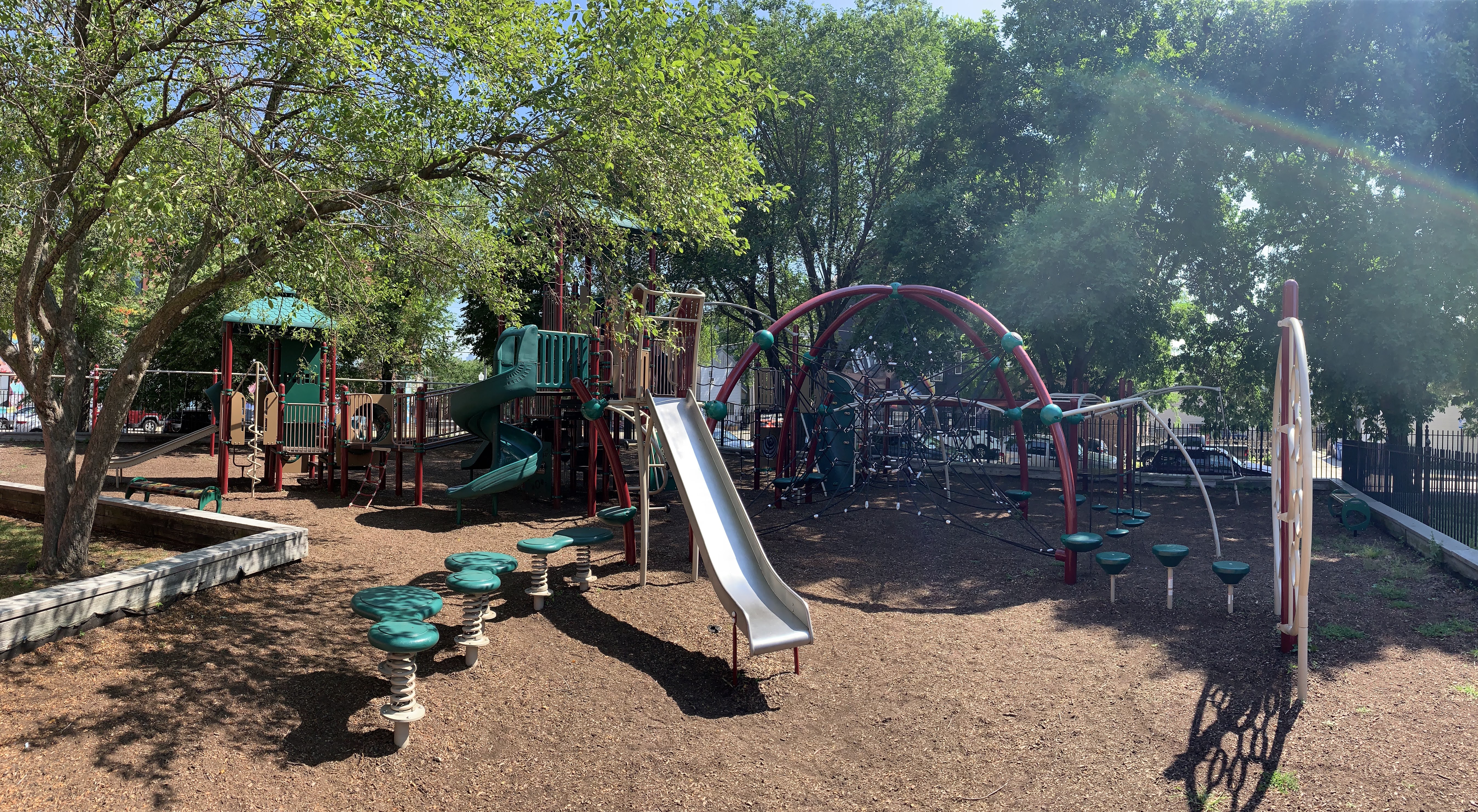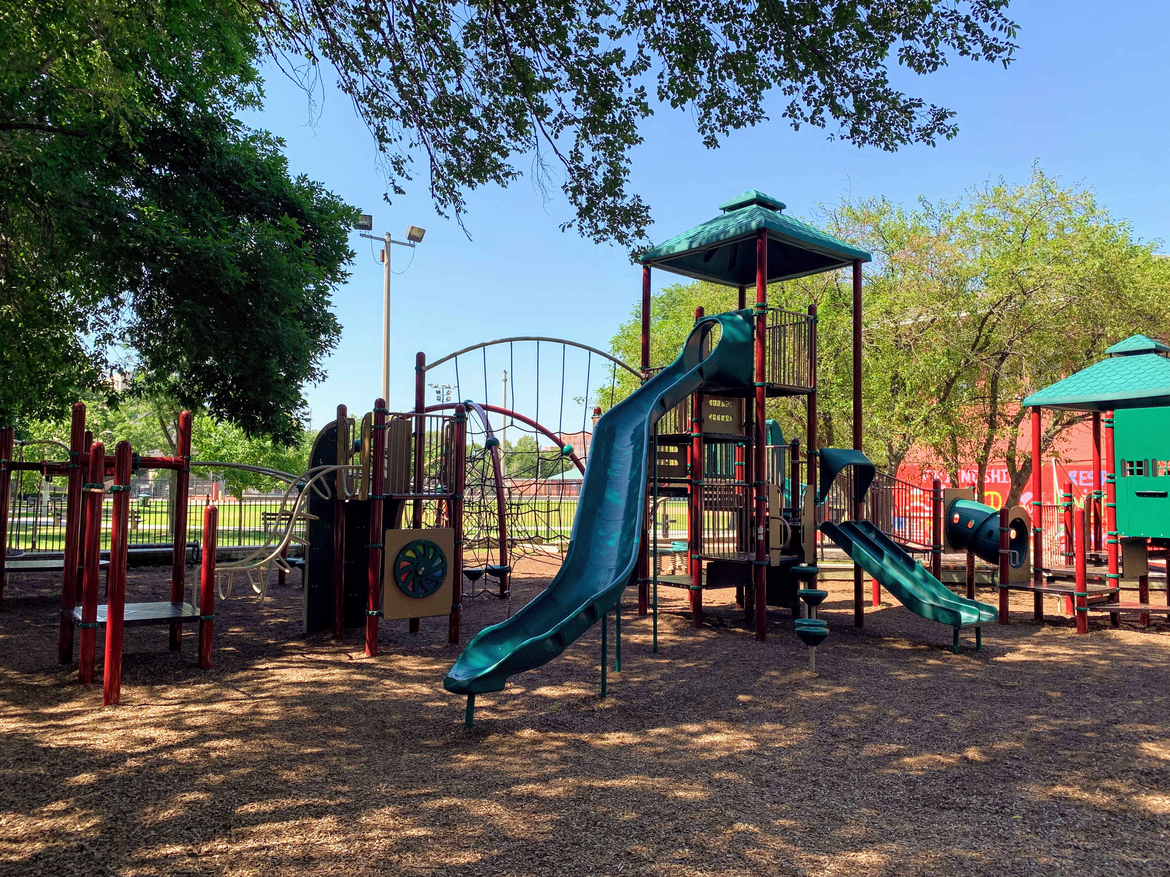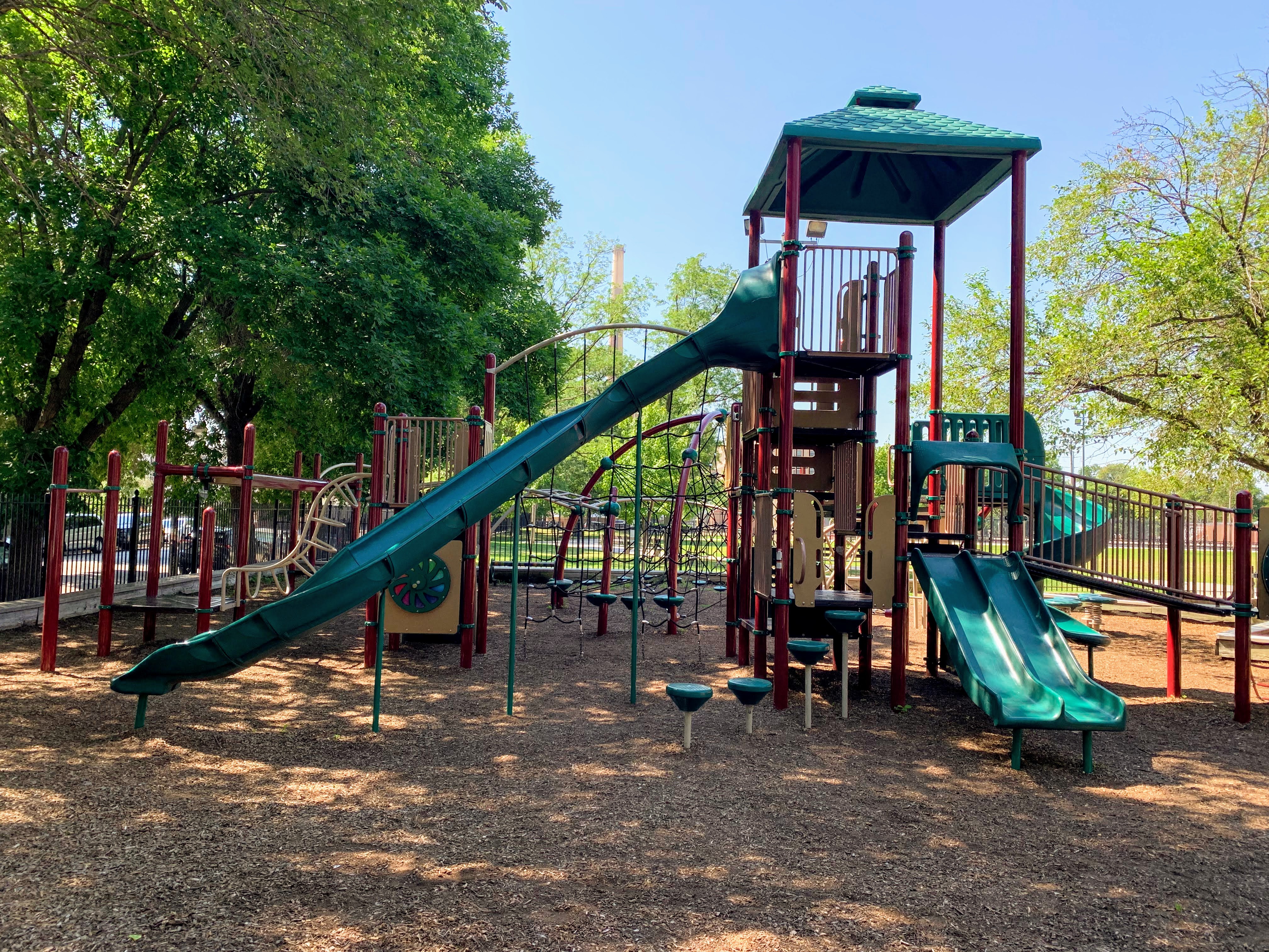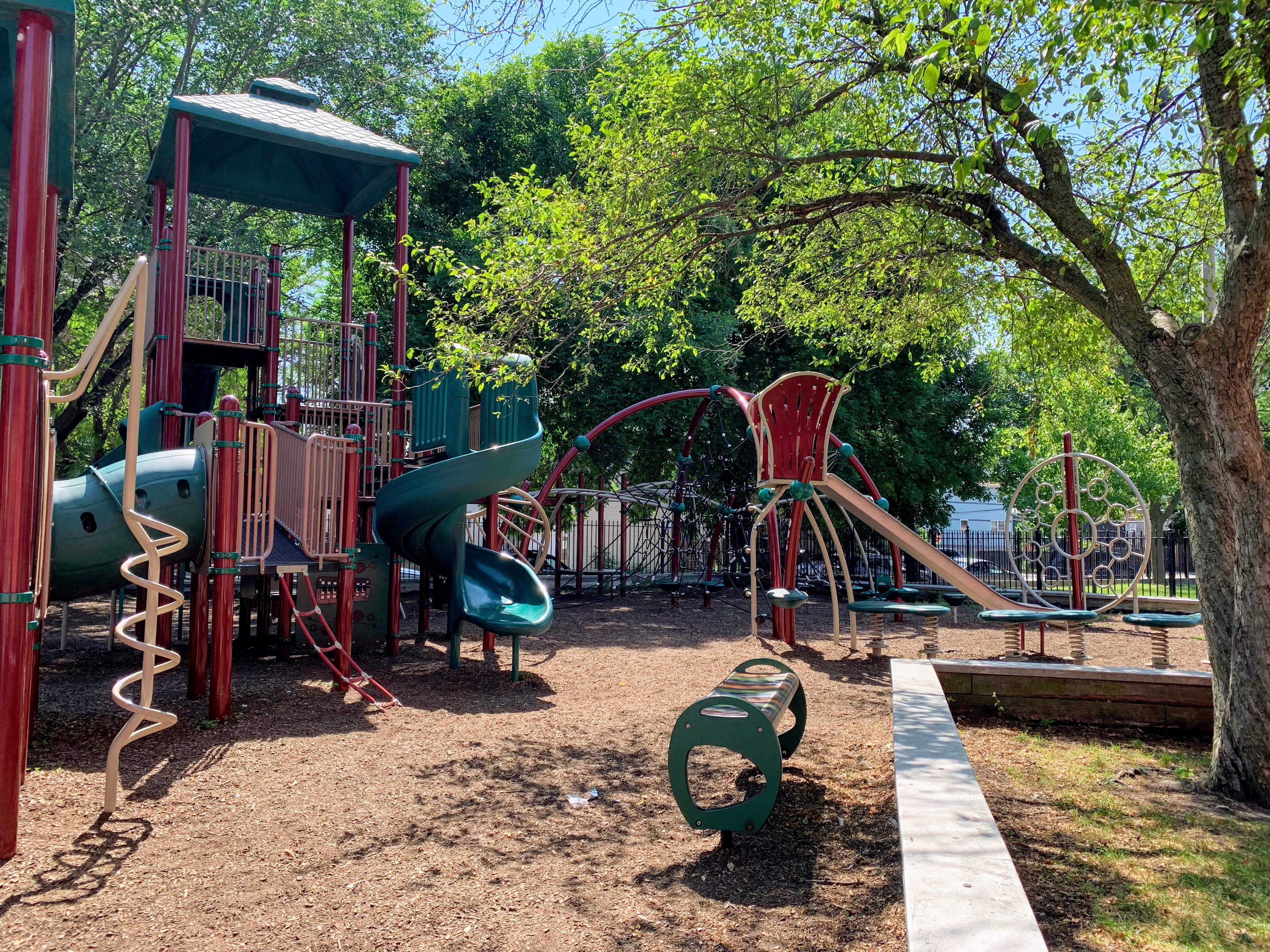 The play area is fenced from the streets but is not fully enclosed and the main play surface is wood chips. This playground has a lot of seating as well as a lot of shade from large, mature trees surrounding the site. There is also bathroom access via the fieldhouse building (when open) and a large water spray feature (again, when open) next to the pool just south of this playground.