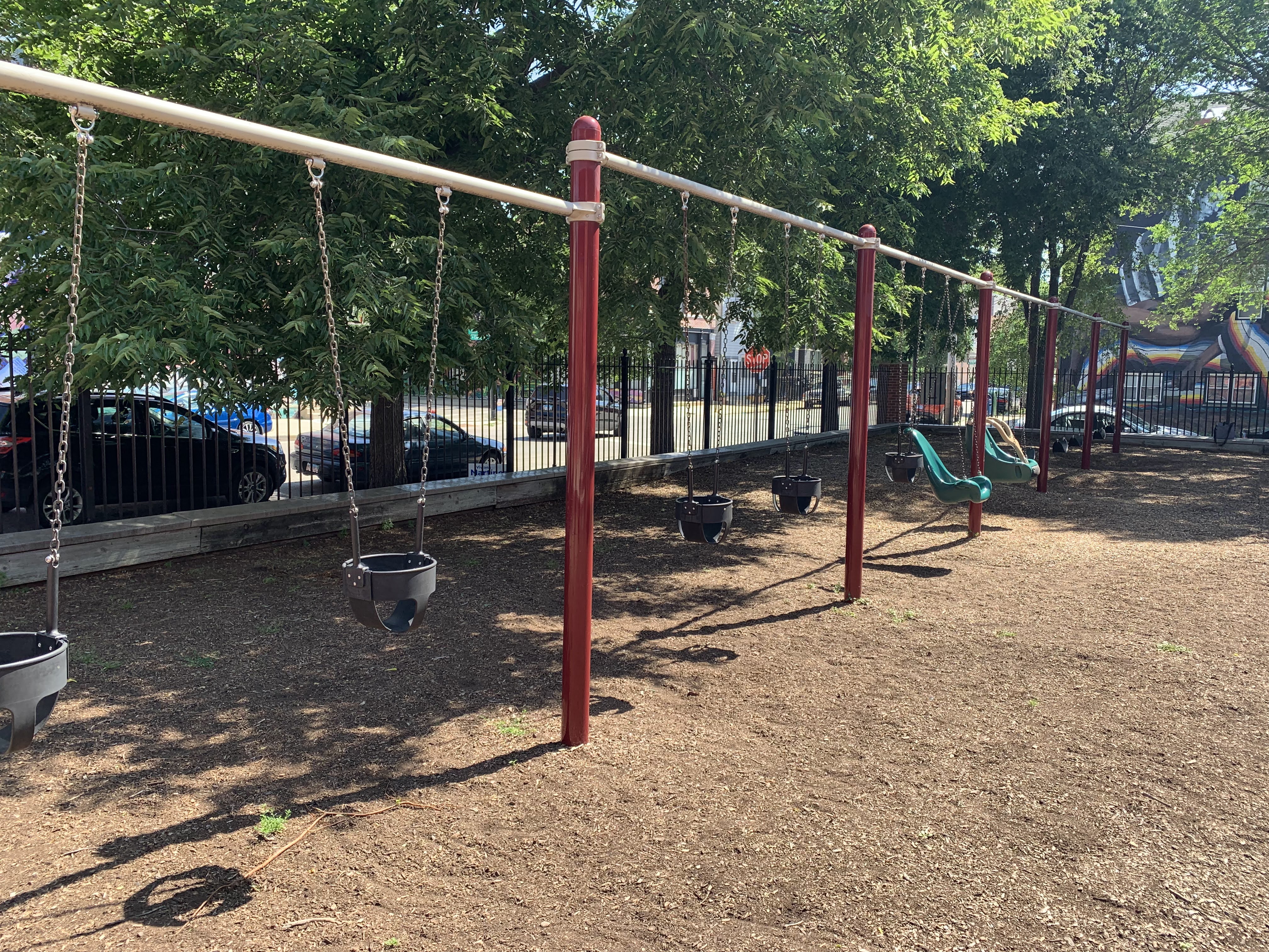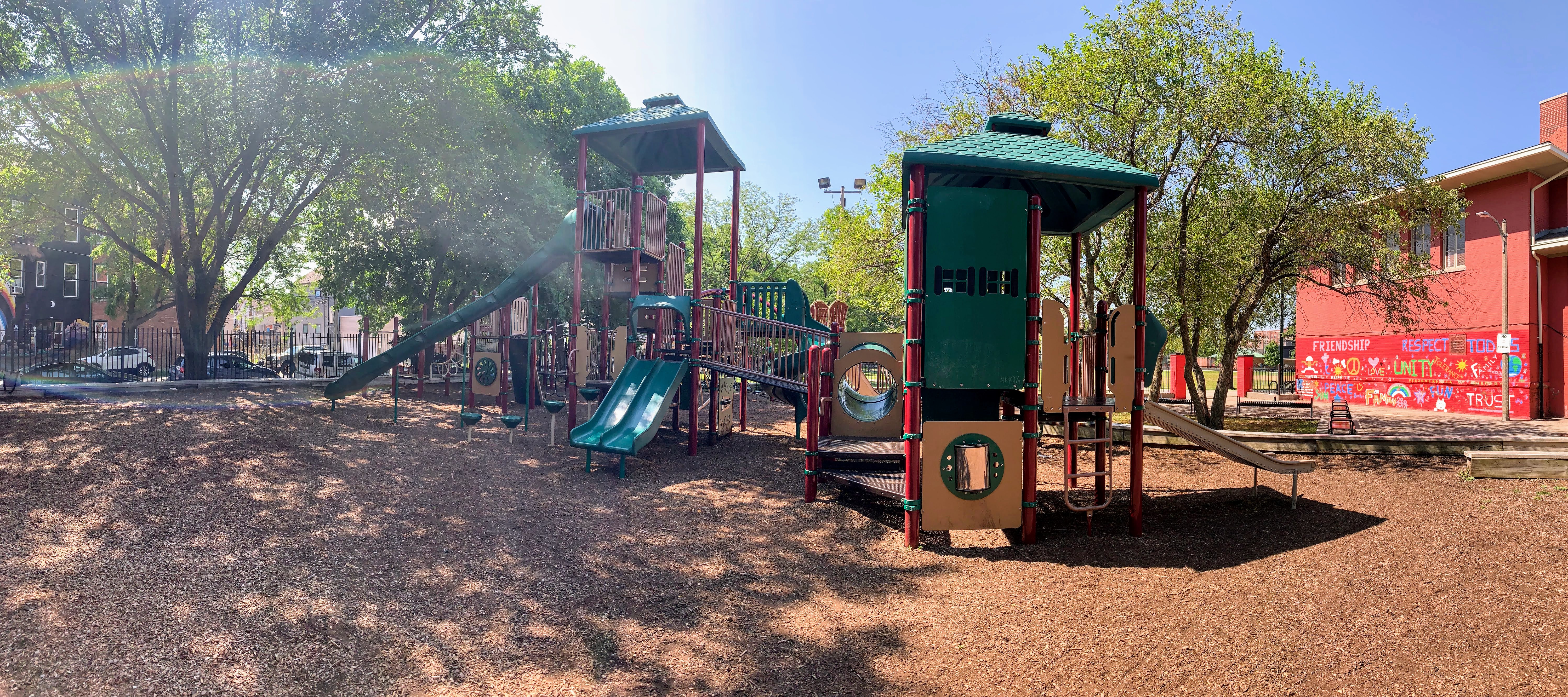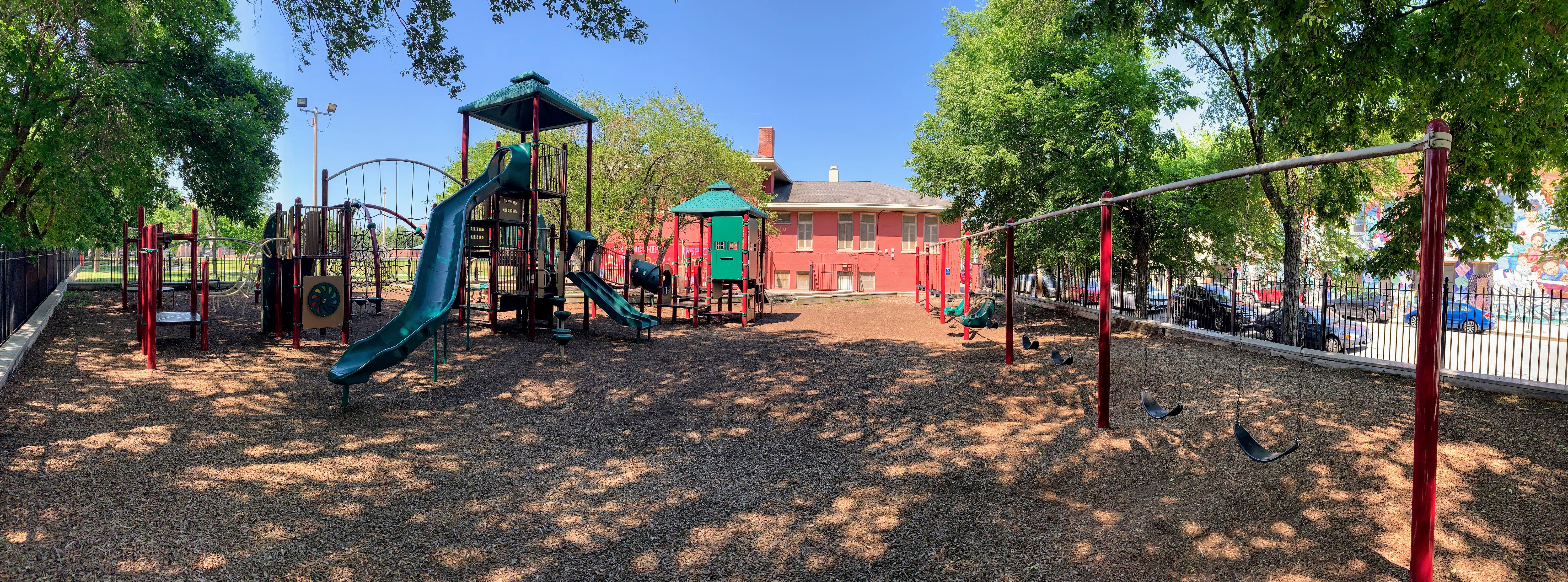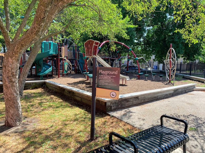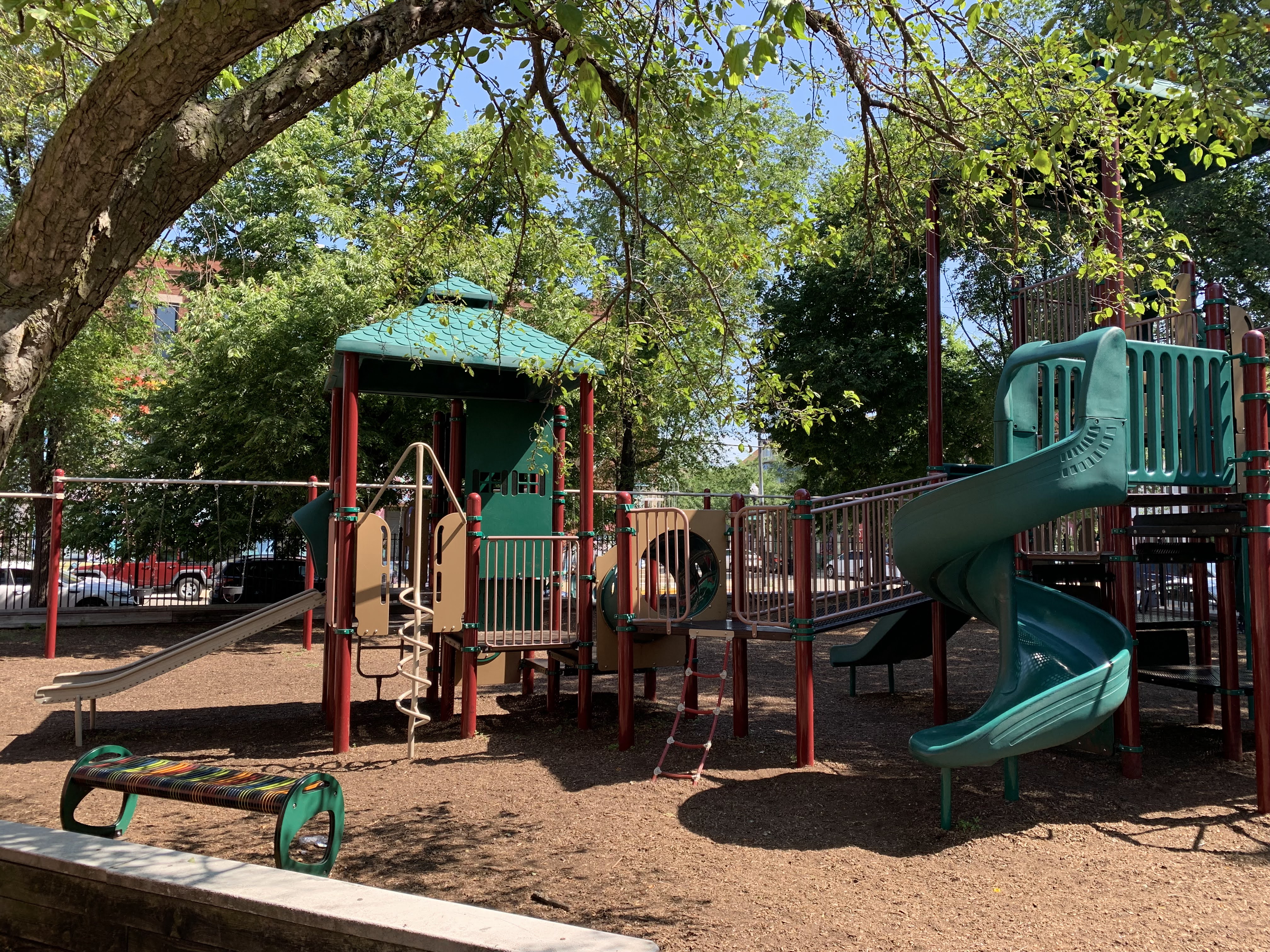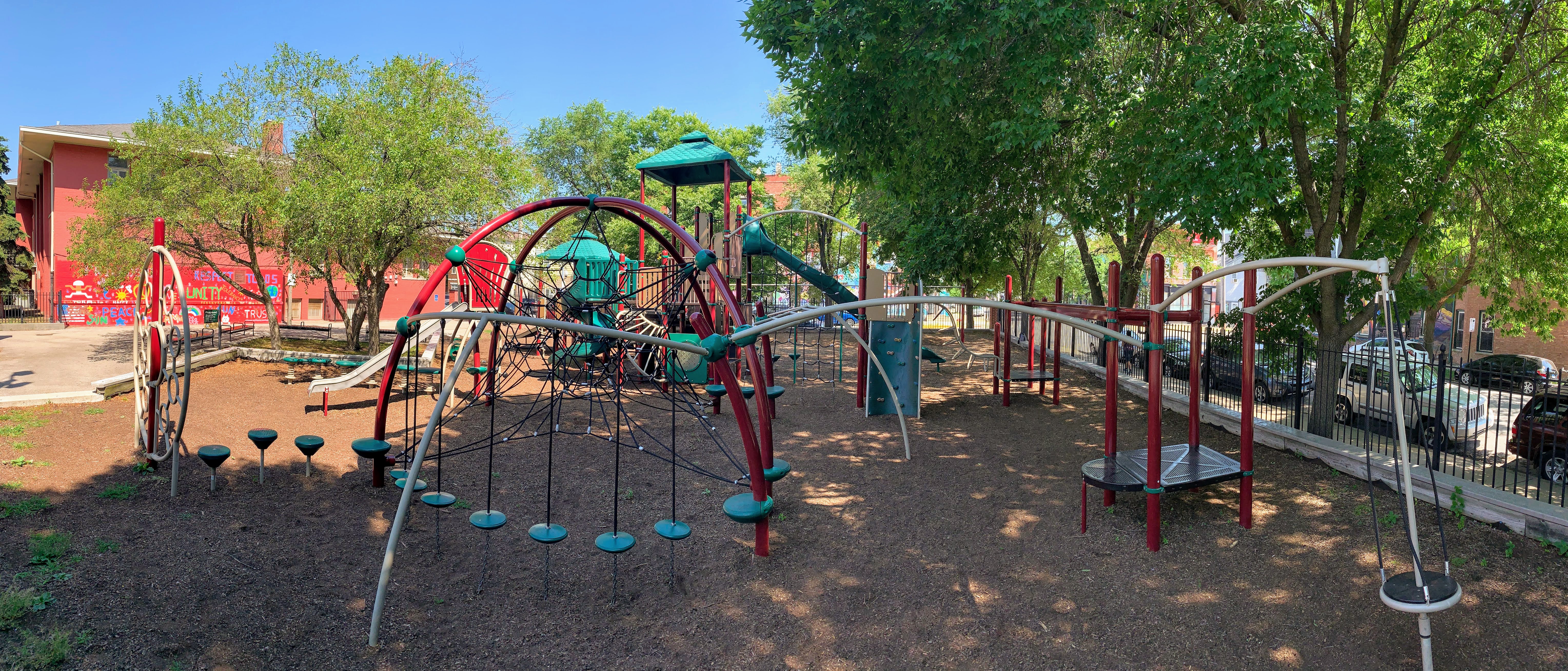 The play area is fenced from the streets but is not fully enclosed and the main play surface is wood chips. This playground has a lot of seating as well as a lot of shade from large, mature trees surrounding the site. There is also bathroom access via the fieldhouse building (when open) and a large water spray feature (again, when open) next to the pool just south of this playground.