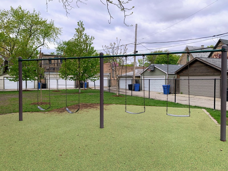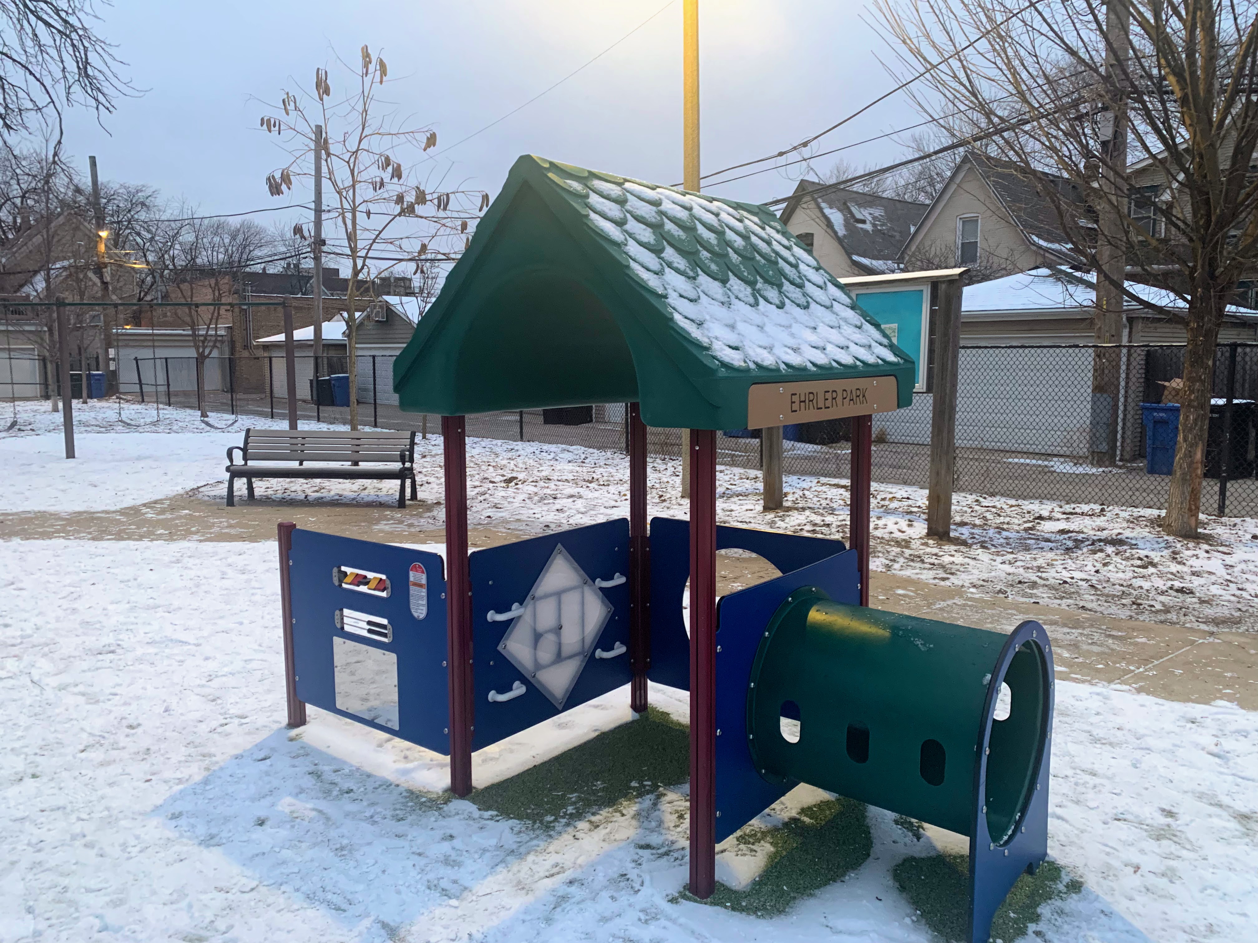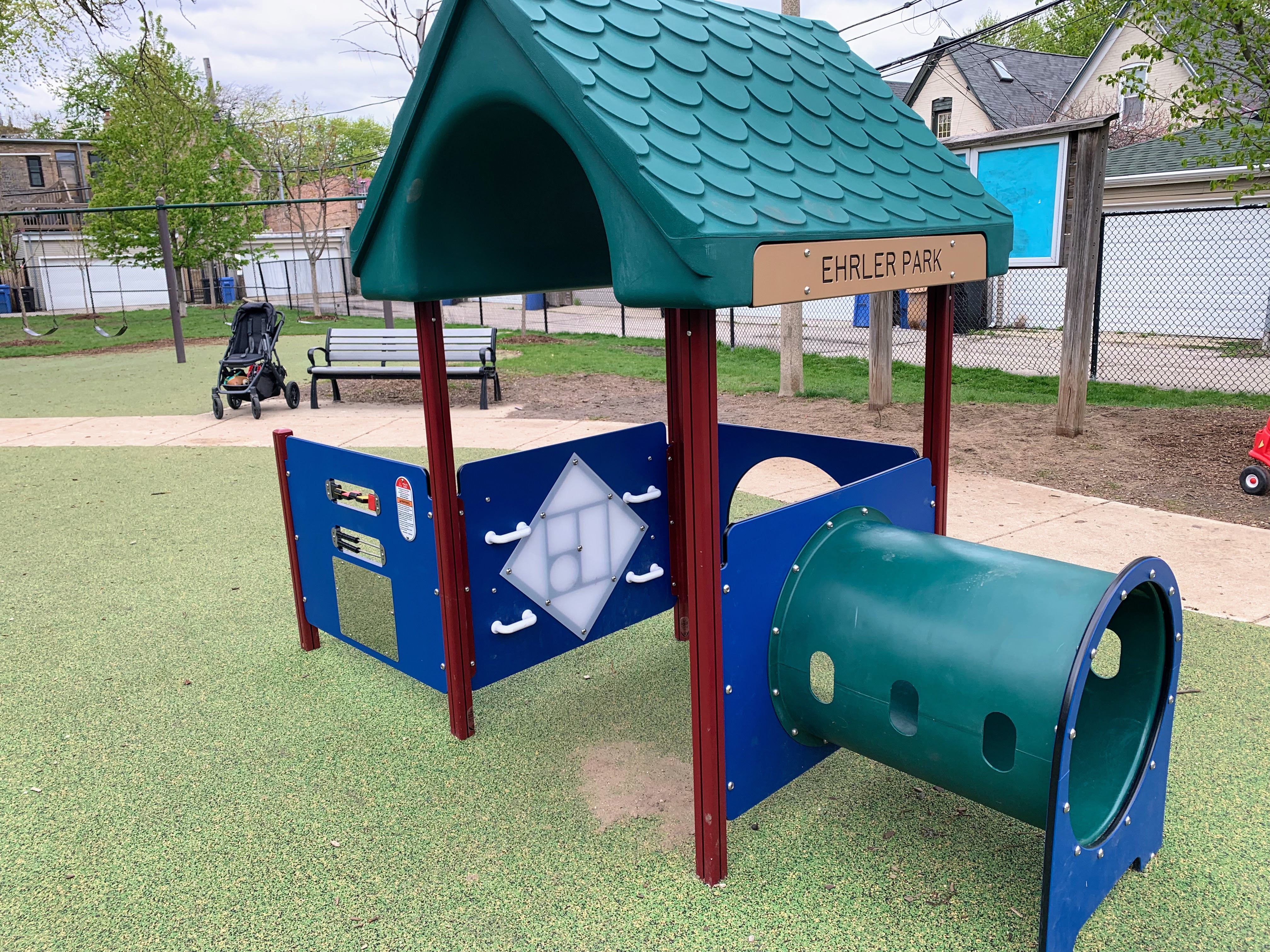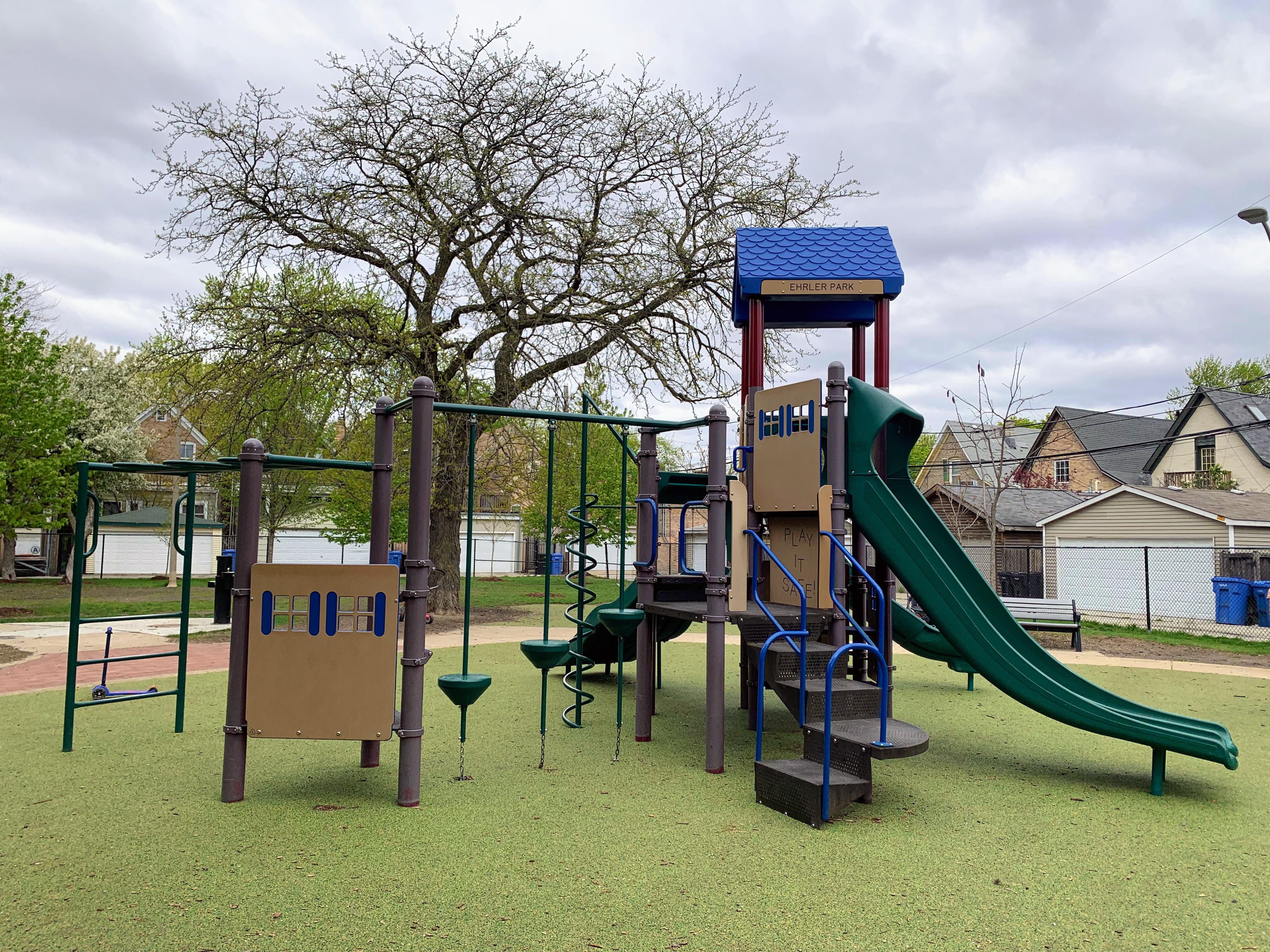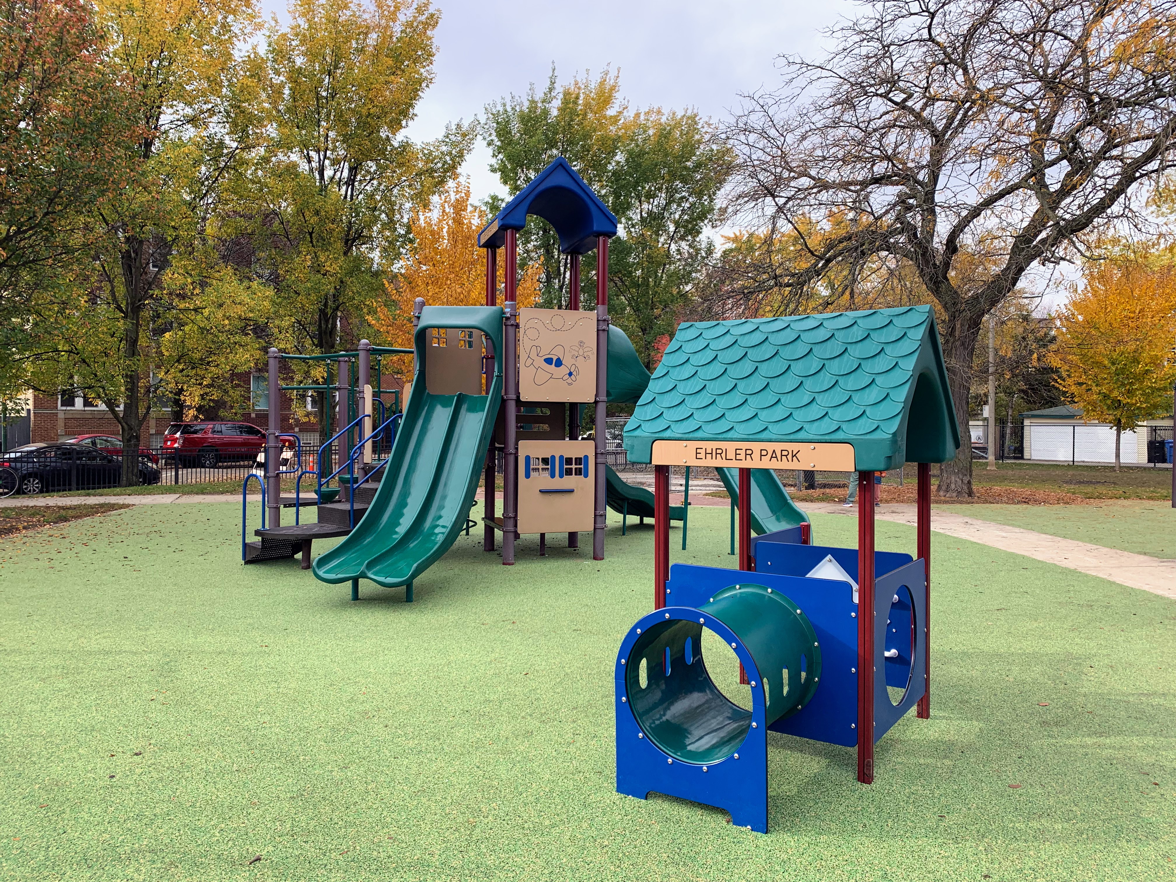 Renovated in 2022, the playground at Erhler Park is a gem. There are two large play structures with modern equipment as well as a small area with interactive panels for very young park goers. The two large play structures have a variety of slides - including a tube slide and a 'big slide!' - climbing elements, and monkey bars while maintaining a traditional playground look/feel. There are also two sets of swings with the standard Chicago Park offerings: toddler, adaptive with a harness, and belt seat.