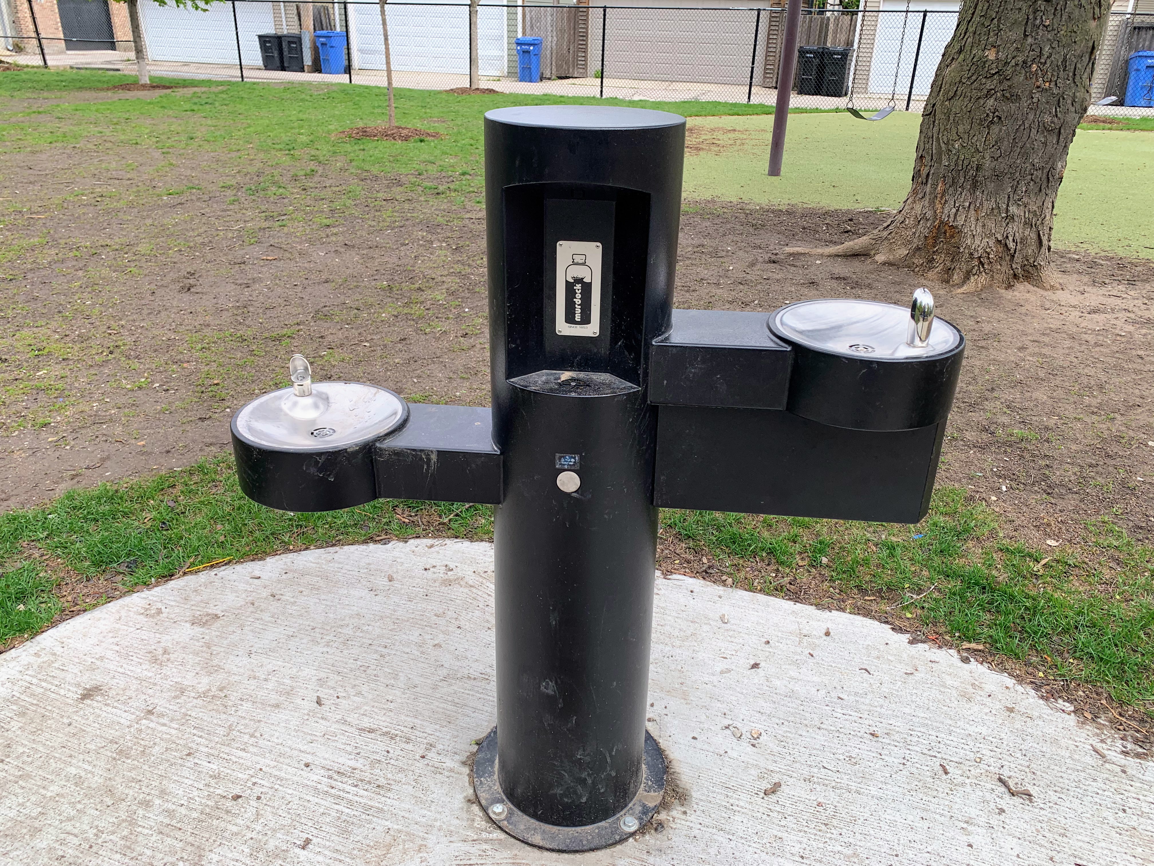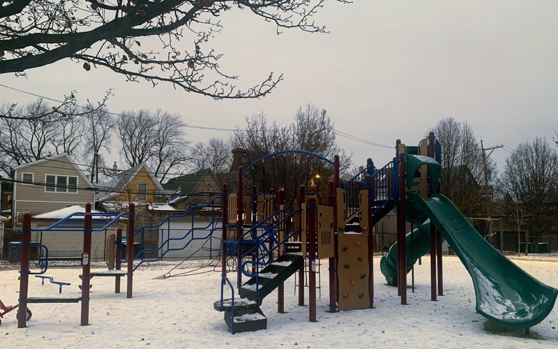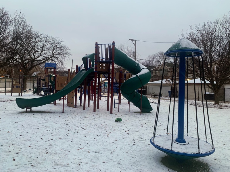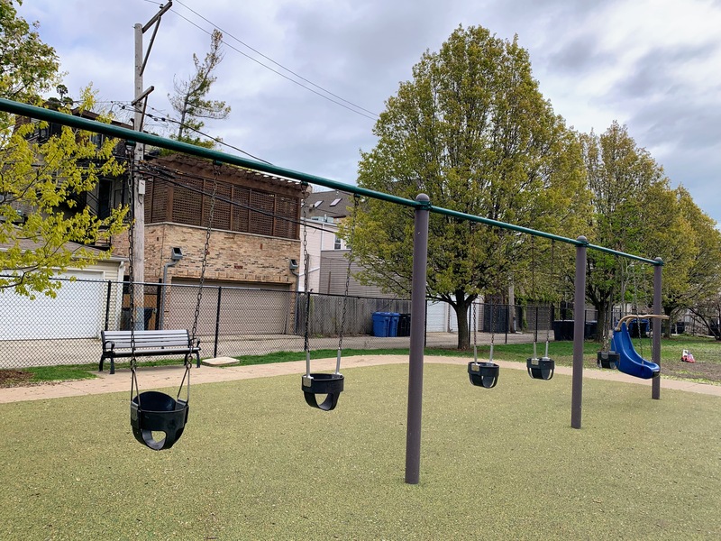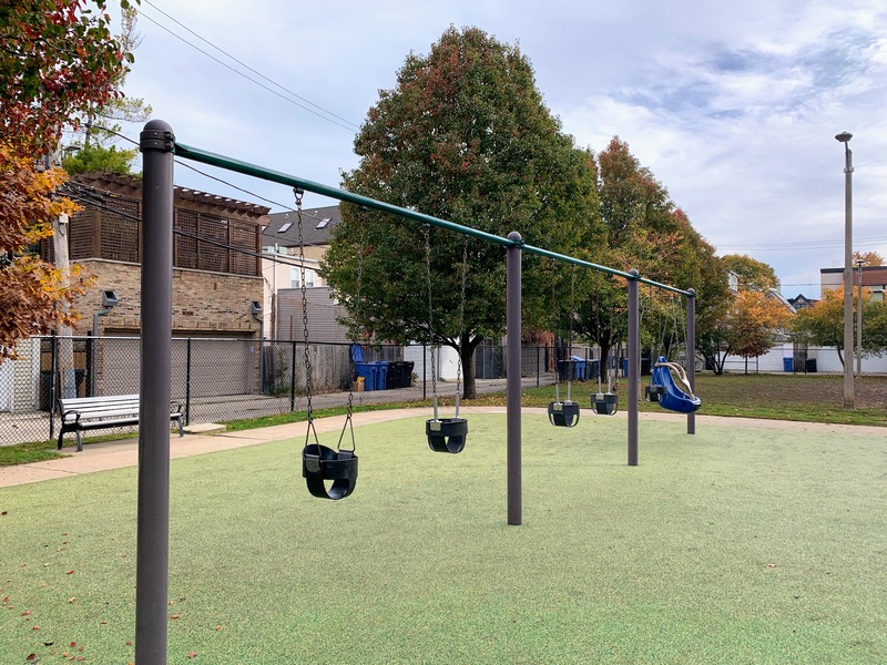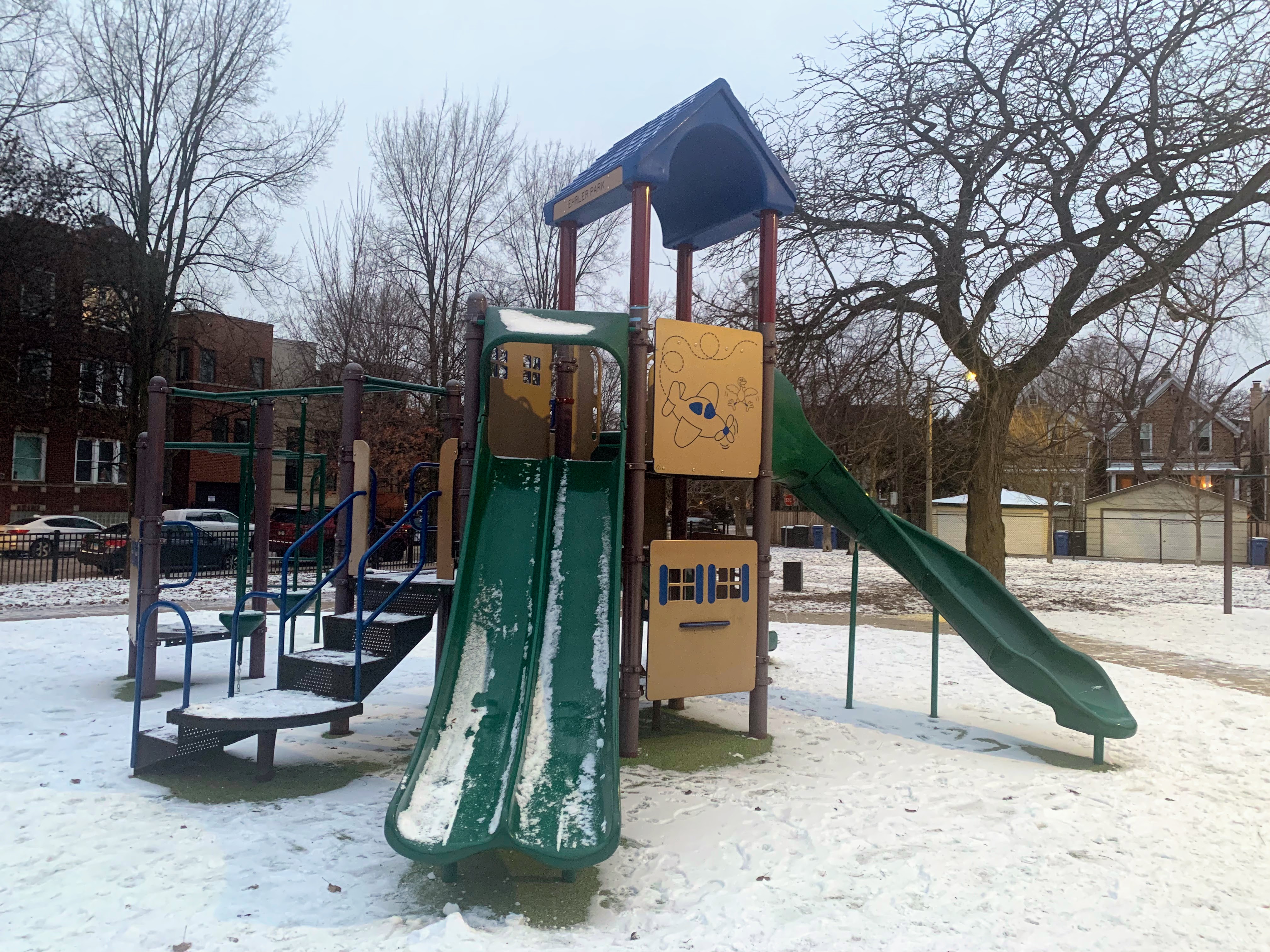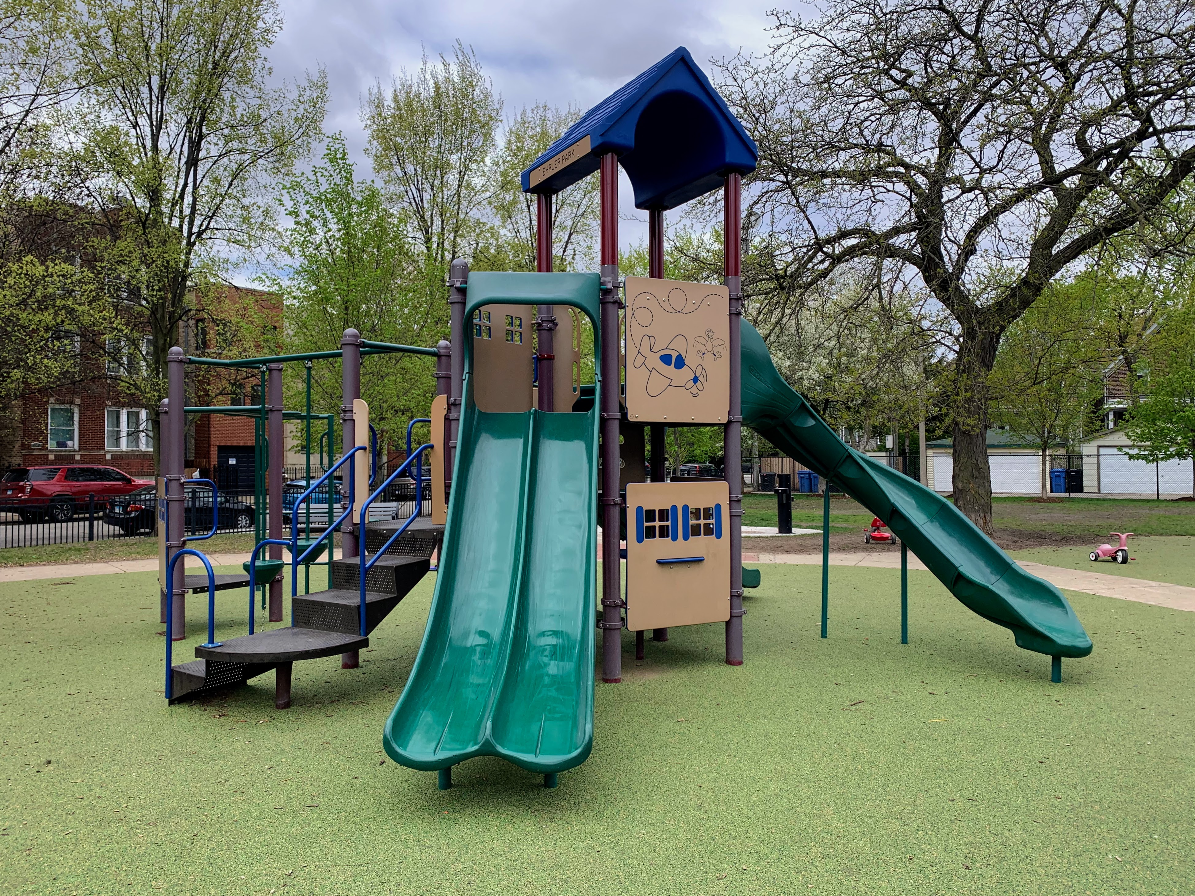 Renovated in 2022, the playground at Erhler Park is a gem. There are two large play structures with modern equipment as well as a small area with interactive panels for very young park goers. The two large play structures have a variety of slides - including a tube slide and a 'big slide!' - climbing elements, and monkey bars while maintaining a traditional playground look/feel. There are also two sets of swings with the standard Chicago Park offerings: toddler, adaptive with a harness, and belt seat.