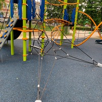 The setting is beautiful: there is a large row of trees on the southern edge of the park and the fully enclosed park opens onto grassy areas on both sides. There are benches and a drinking fountain and the play surface is newly restored soft rubber. It's a great playground; highly recommend. - Playground Features