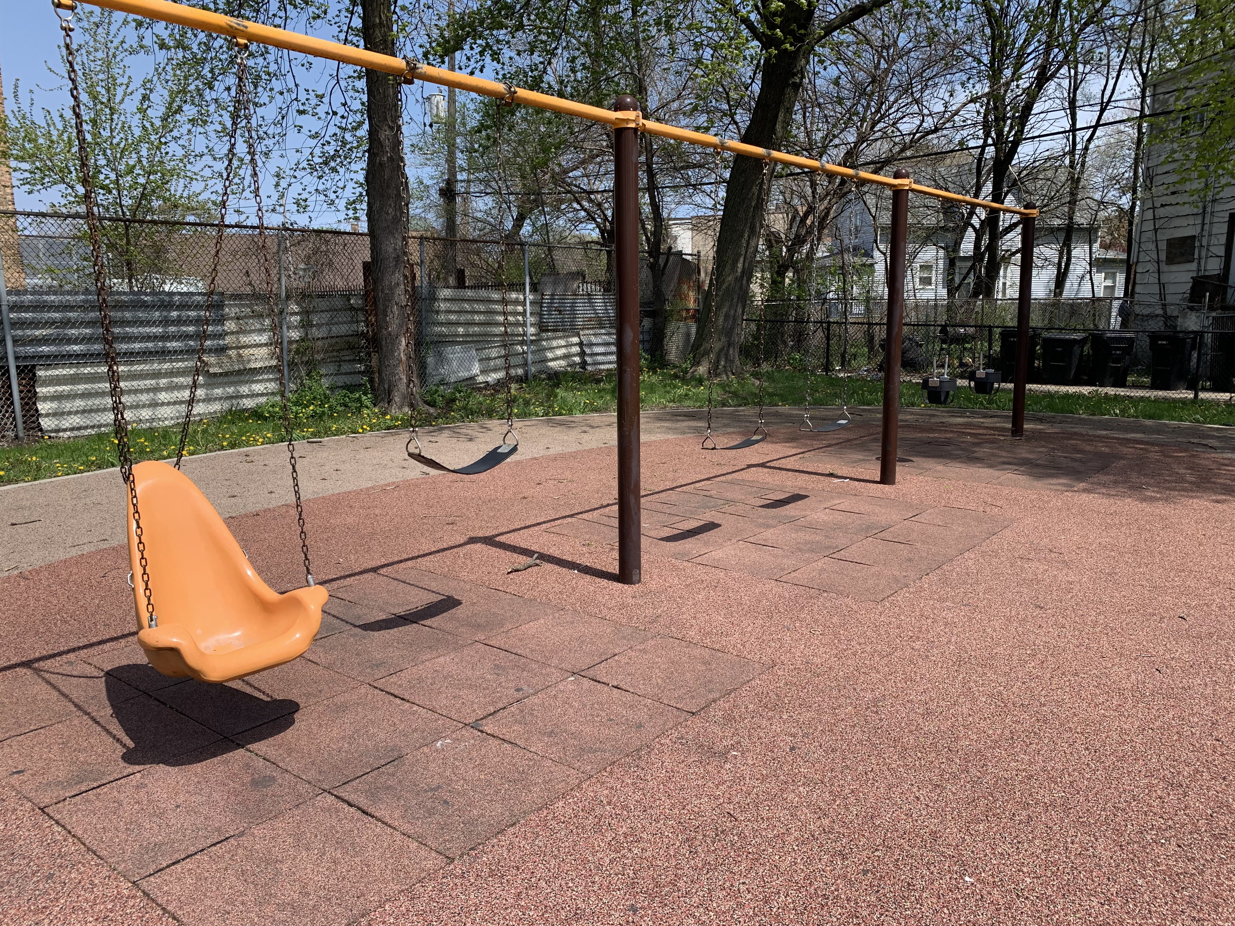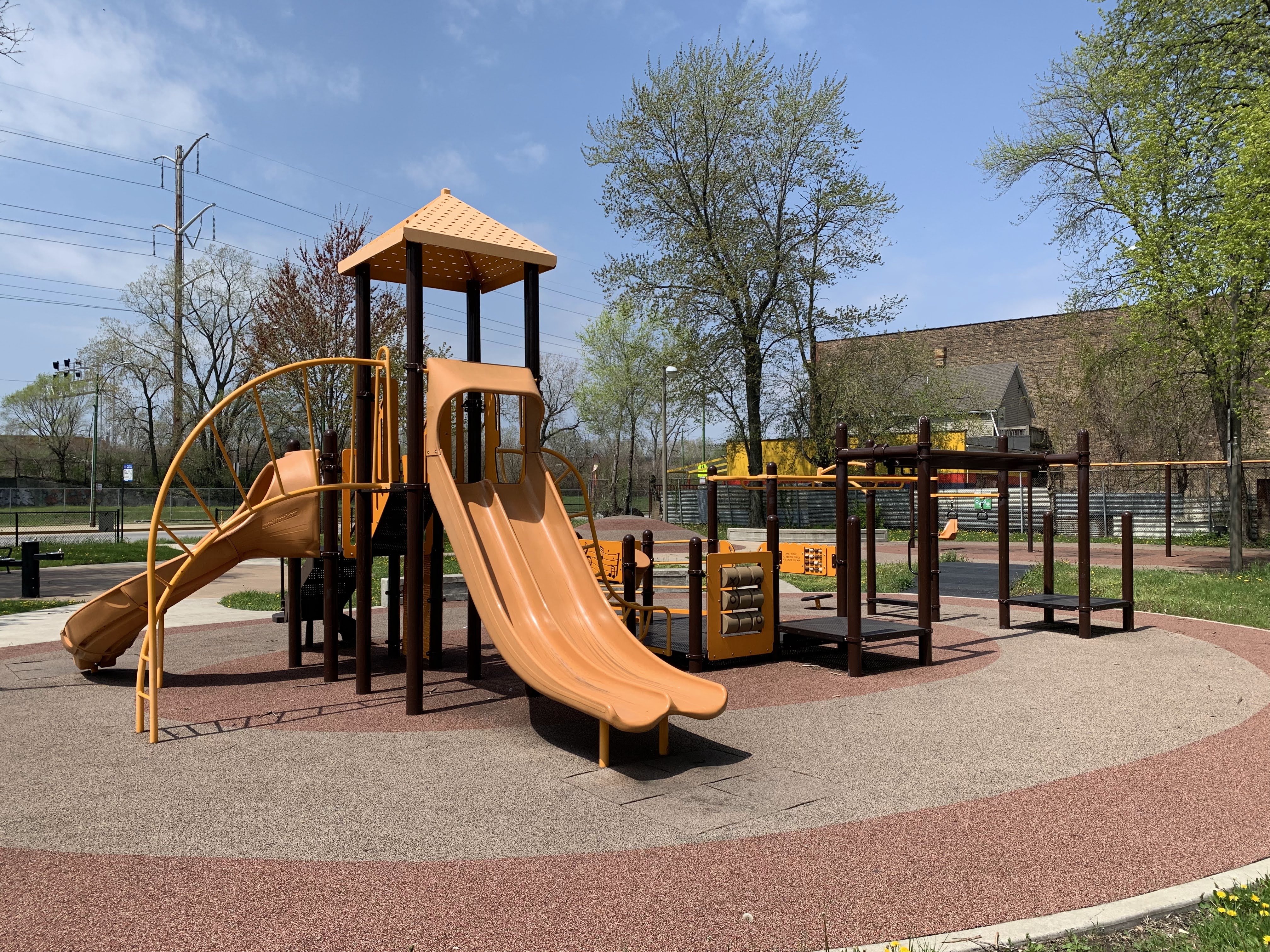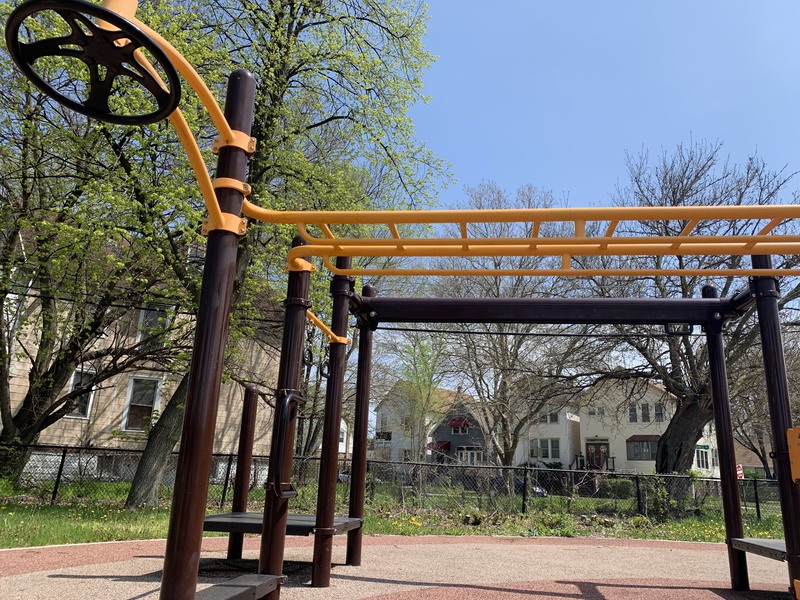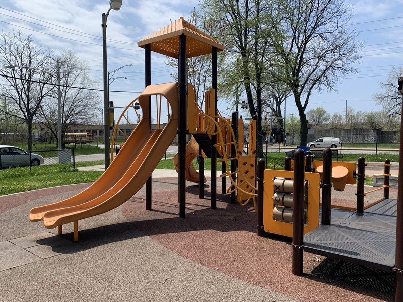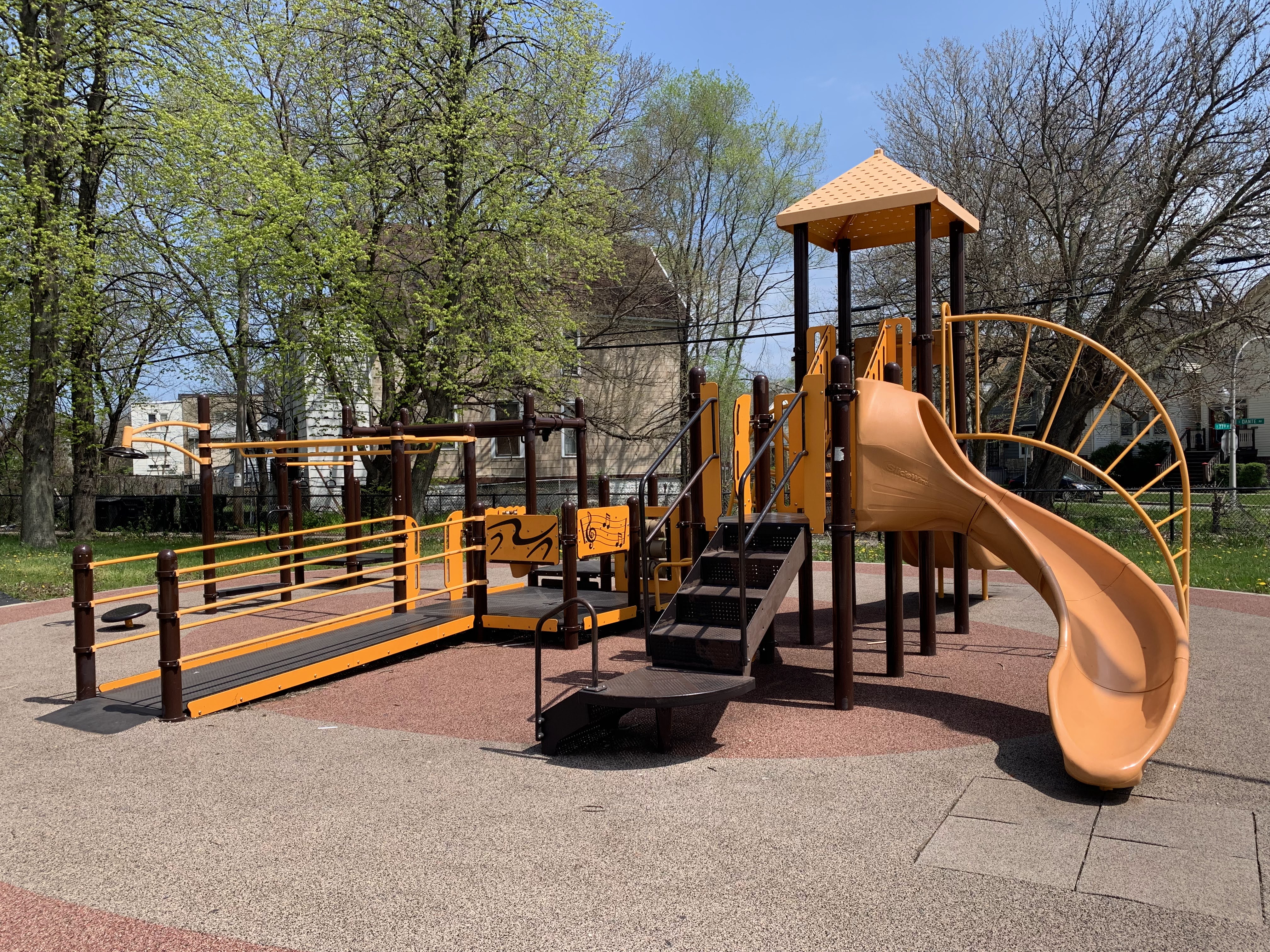 - Renovated in 2015, the playground at the Essex Park contains a modern play structure some some standard equipment (slides, climbing structures, monkey bars) as well as some more interesting equipment (an overhead slider and a 'top and bottom' spinner). There is also a standard set of swings nearby. The play area is fenced but not fully enclosed and the play surface is soft rubber. There are benches and a drinking fountain but not much shade.
