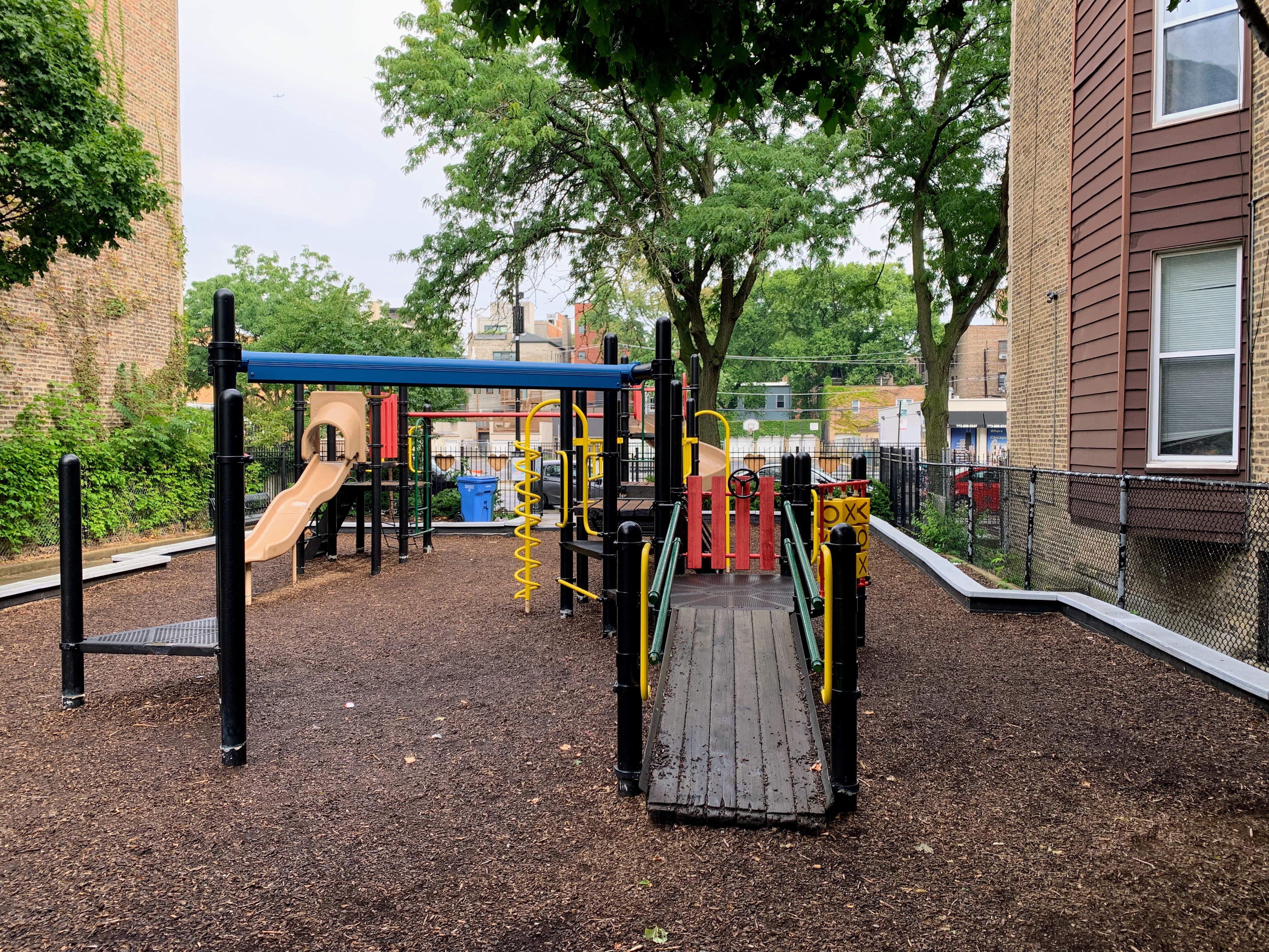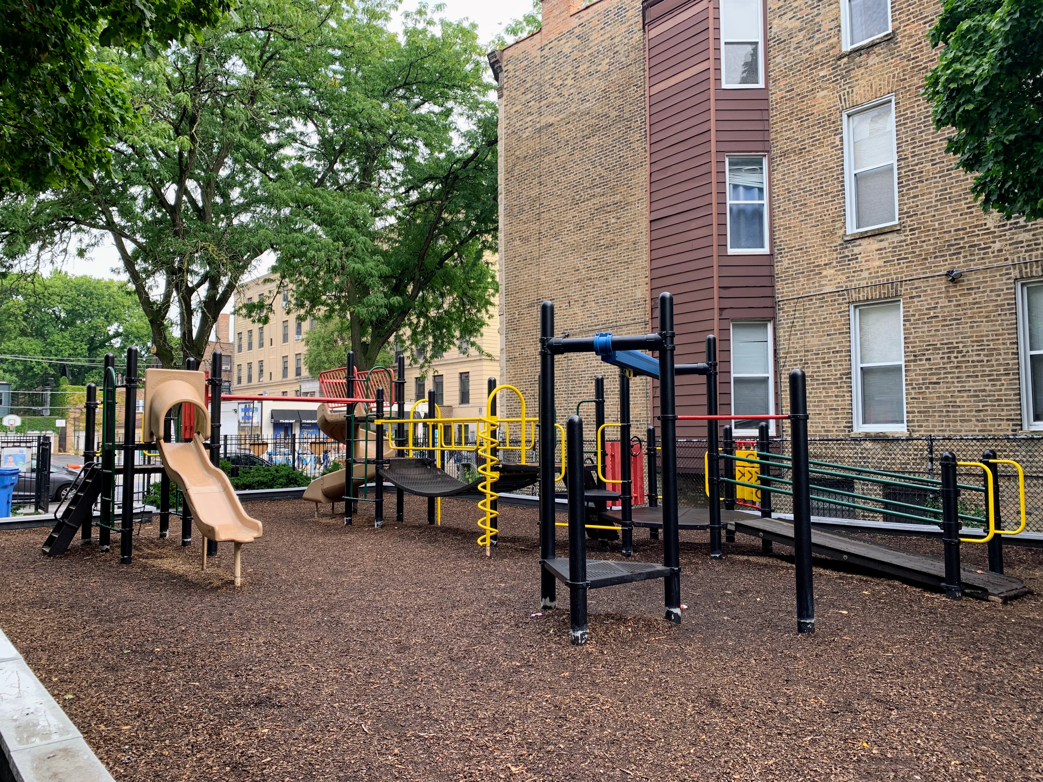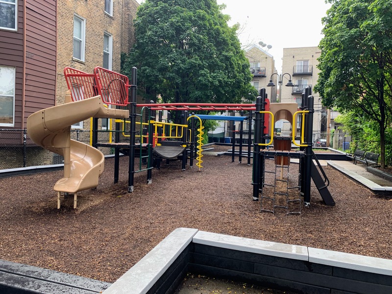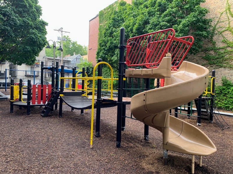 - Evergreen Park is a small neighborhood 'pocket park' that has a small playground that is also a time capsule to another era of playground design. Despite the age (the current structures date to at least 2007 and likely earlier), this playground is well maintained and very functional. There are slides, swings, and climbing elements. The amenities are basic - wood chip surface, a few benches for seating, some shade provided by buildings and trees - but together make for a good, classic playground experience.