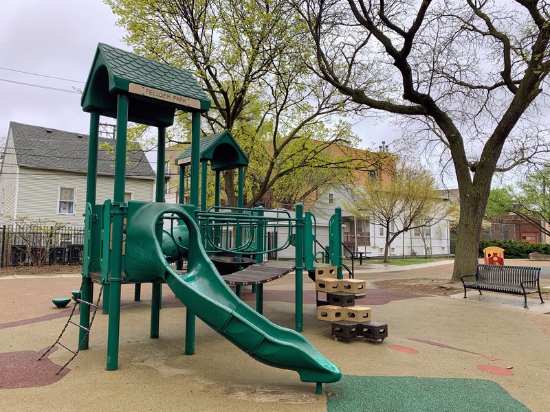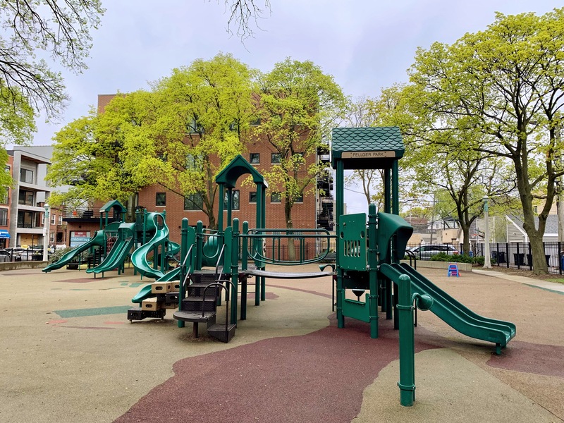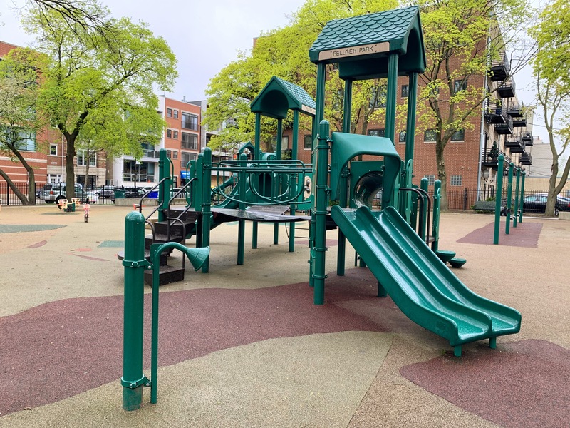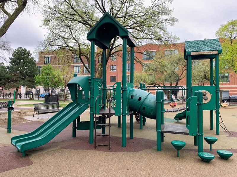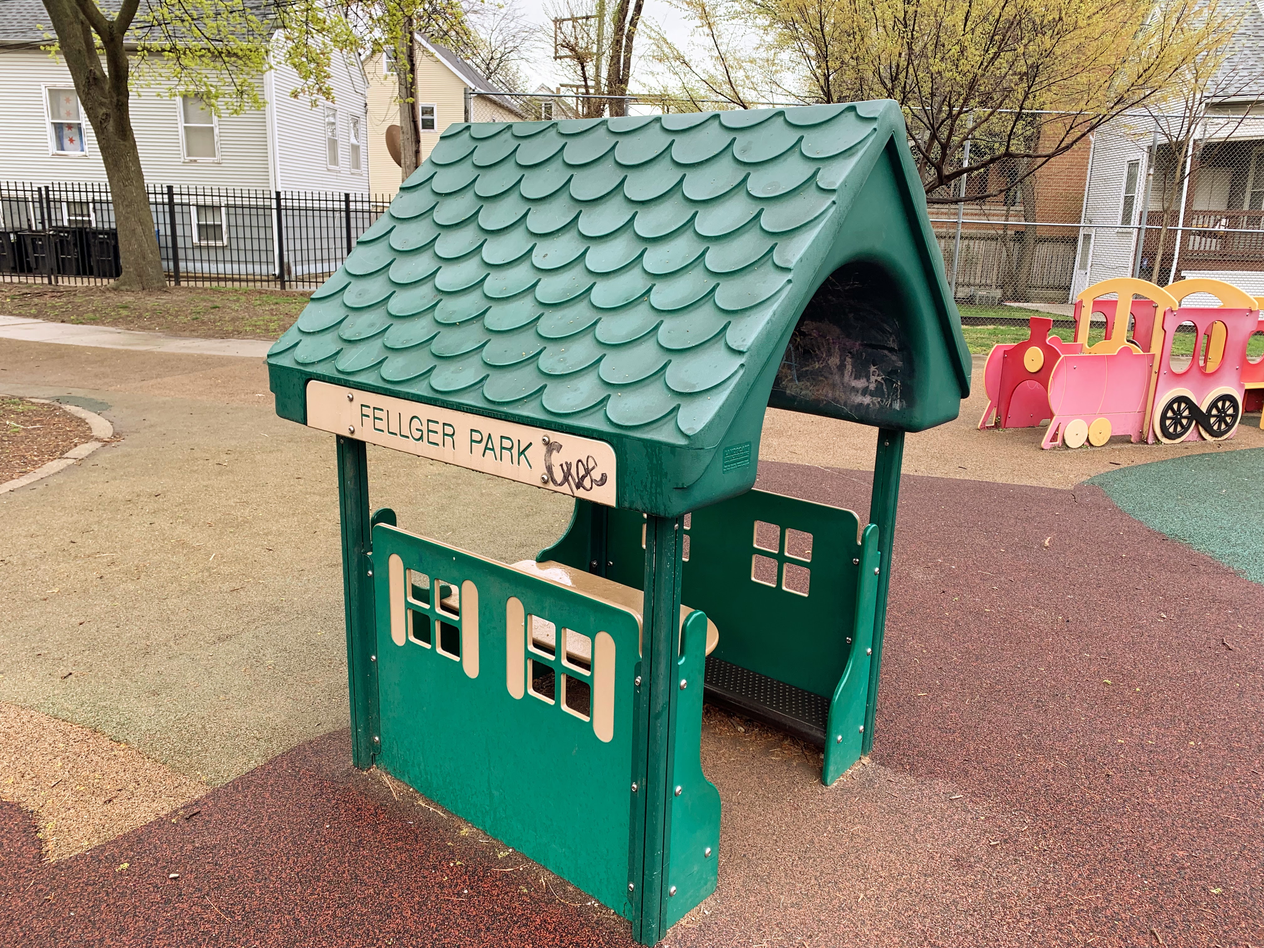 - Fellger Park is a small neighborhood park with a great playground and water spray feature. This gem of a playground has two main play structures - a larger structure for older children and a smaller structure for younger children - as well as many standalone elements: a see-saw, vehicles-on-a-spring, a clubhouse, and a play train. Rounding out the play elements are two sets of swings and a single pole water spray feature. The non-play amenities are stellar: the play area is fully enclosed and the main play surface is soft rubber. Large trees provide ample shade and there are benches and picnic tables for seating. This is a great playground - especially for younger children - and definitely a worthy destination.