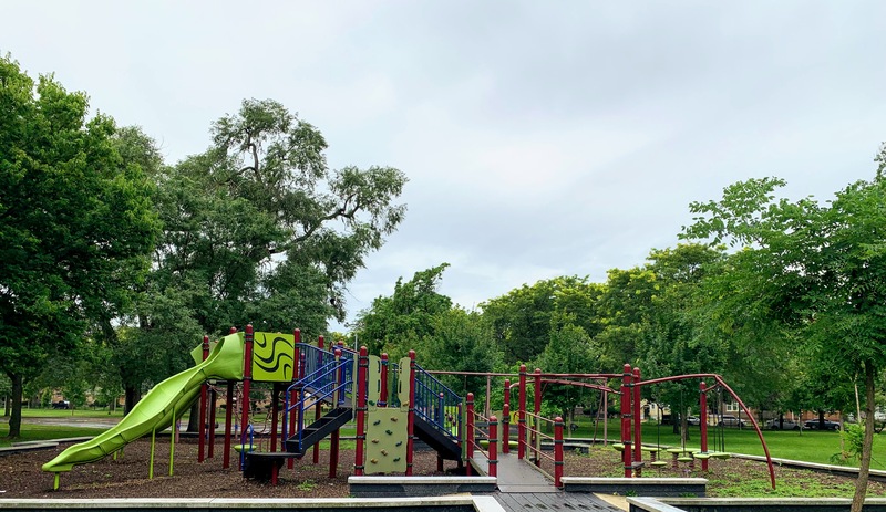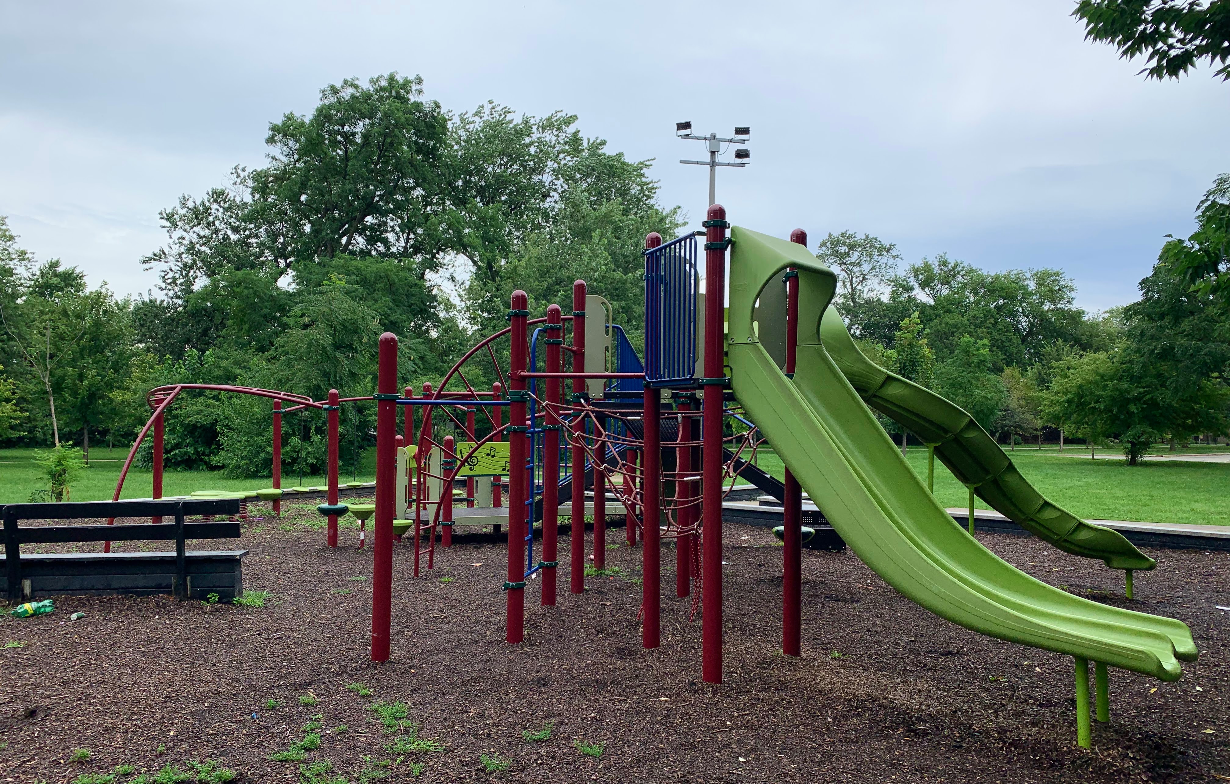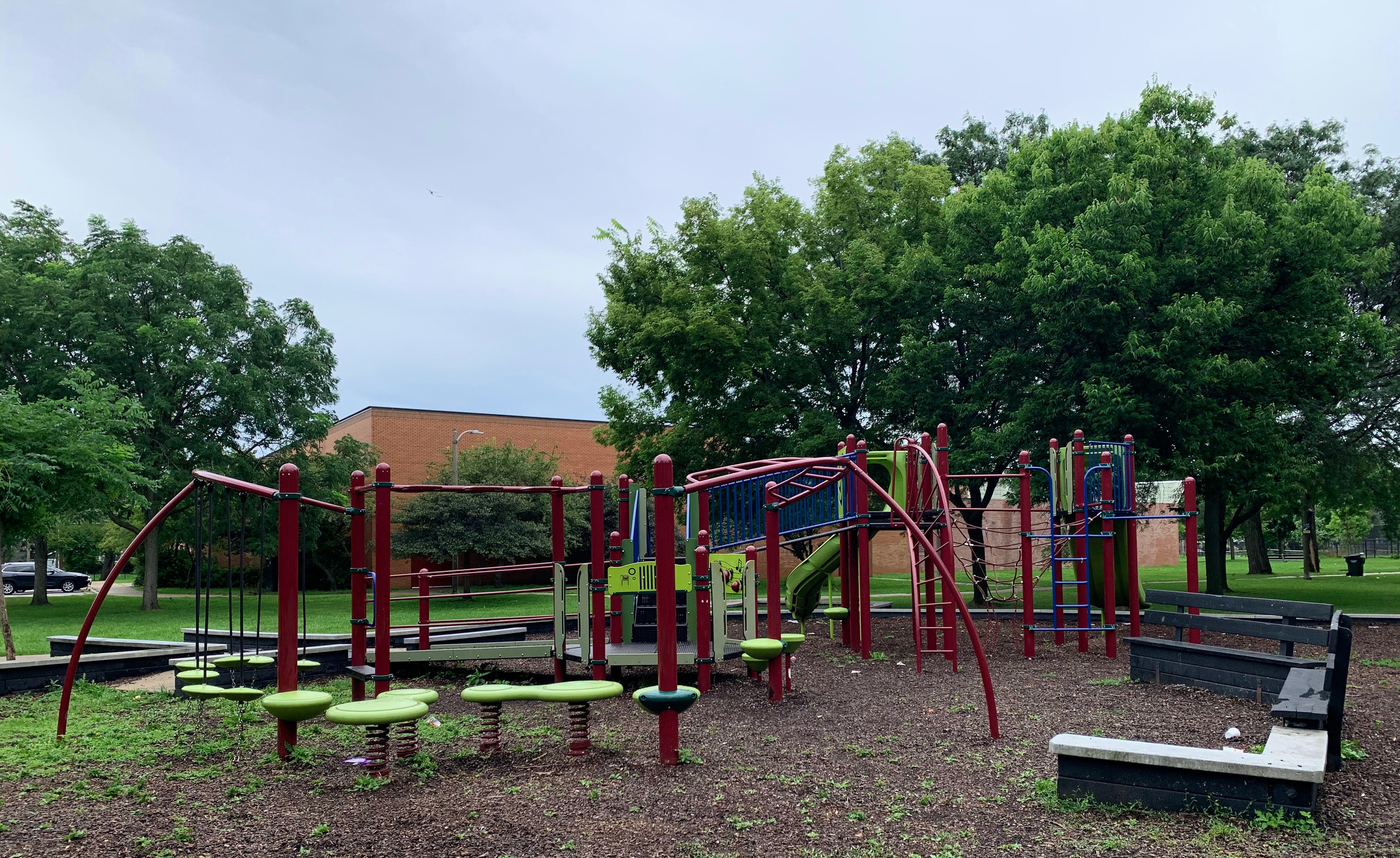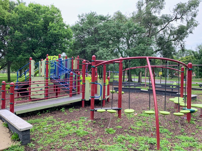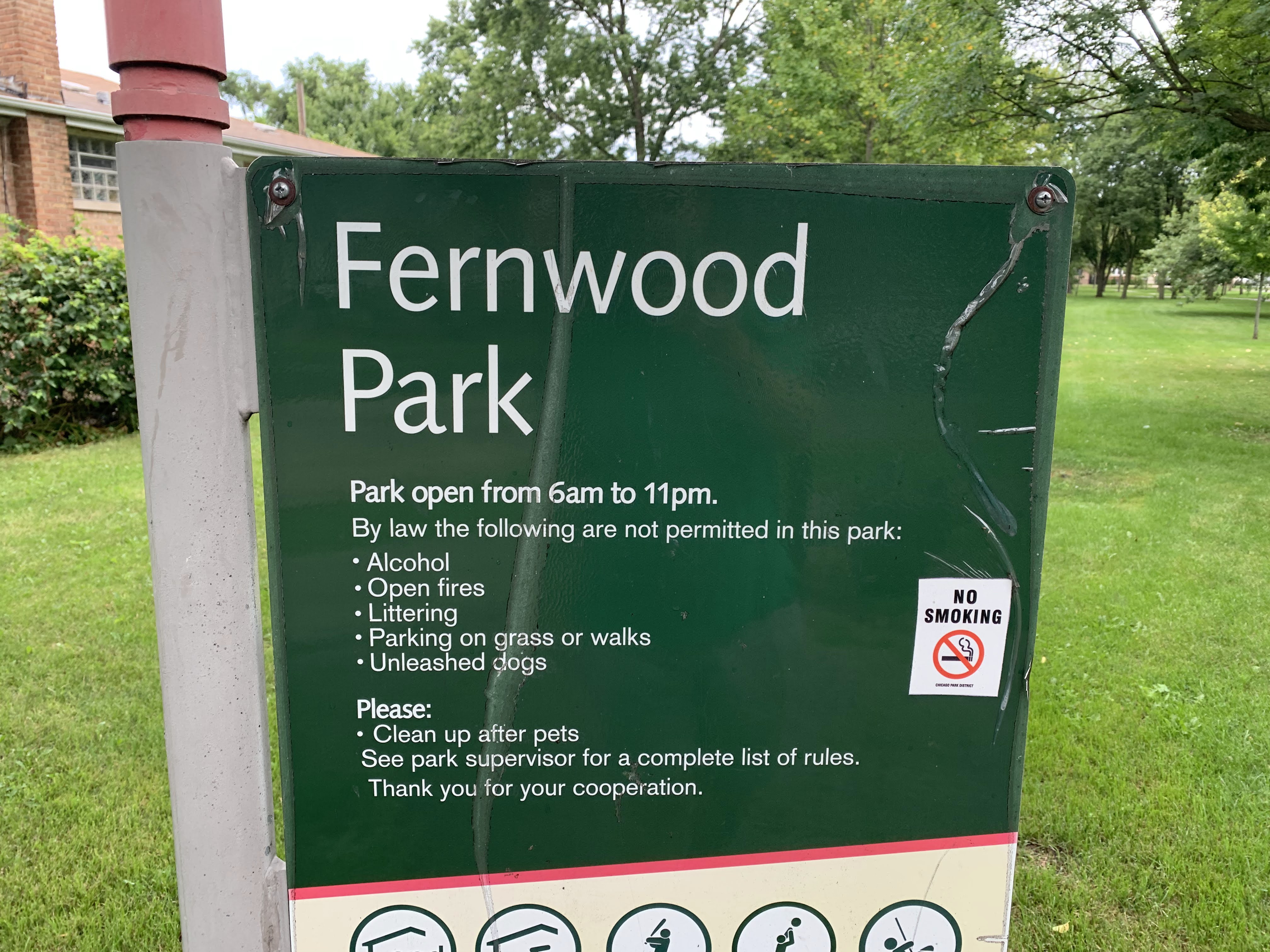 - The playground in Fernwood Park is near the middle of the park and features a moderate size play structure with a variety of slides and a 'rope net funnel.' There are also a variety of traversing elements connected to the structure and a variety of swings (toddler, adaptive, belt seat, and a tire swing). There is also a simple 'four sprayer' water spray feature. The play area opens to the rest of the park and boasts a few benches for seating. The play surface is wood chips and the nearby fieldhouse should provide access to a drinking fountain and bathrooms (when open).