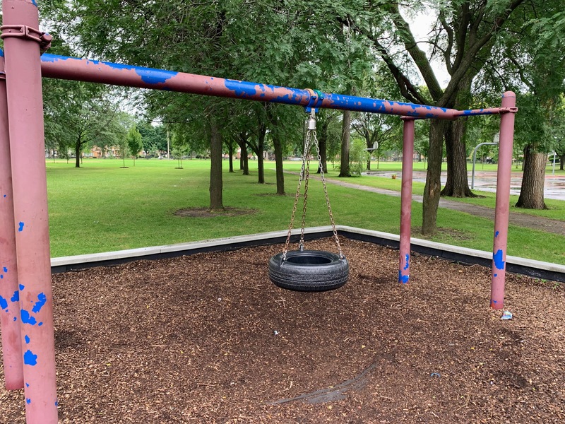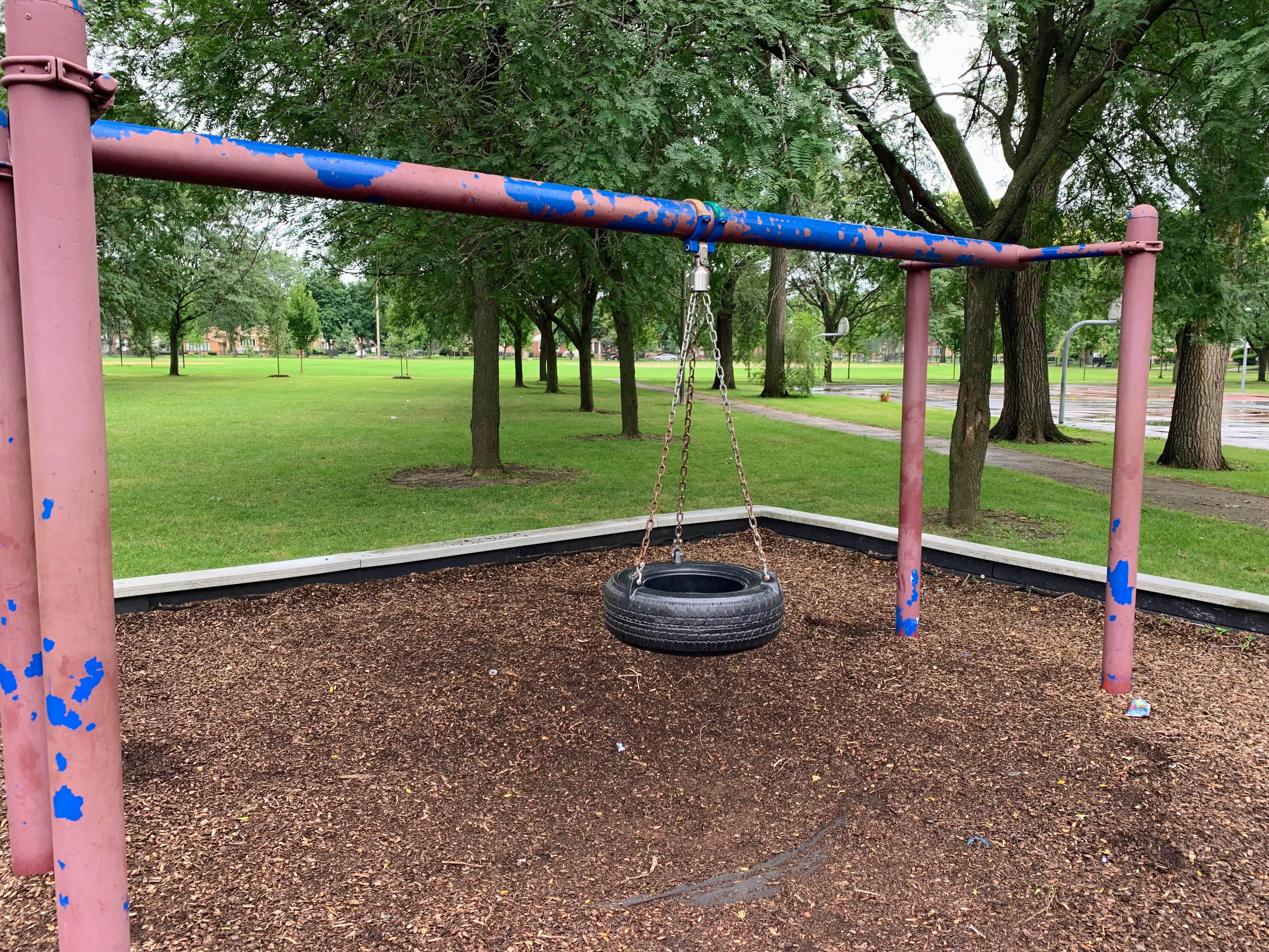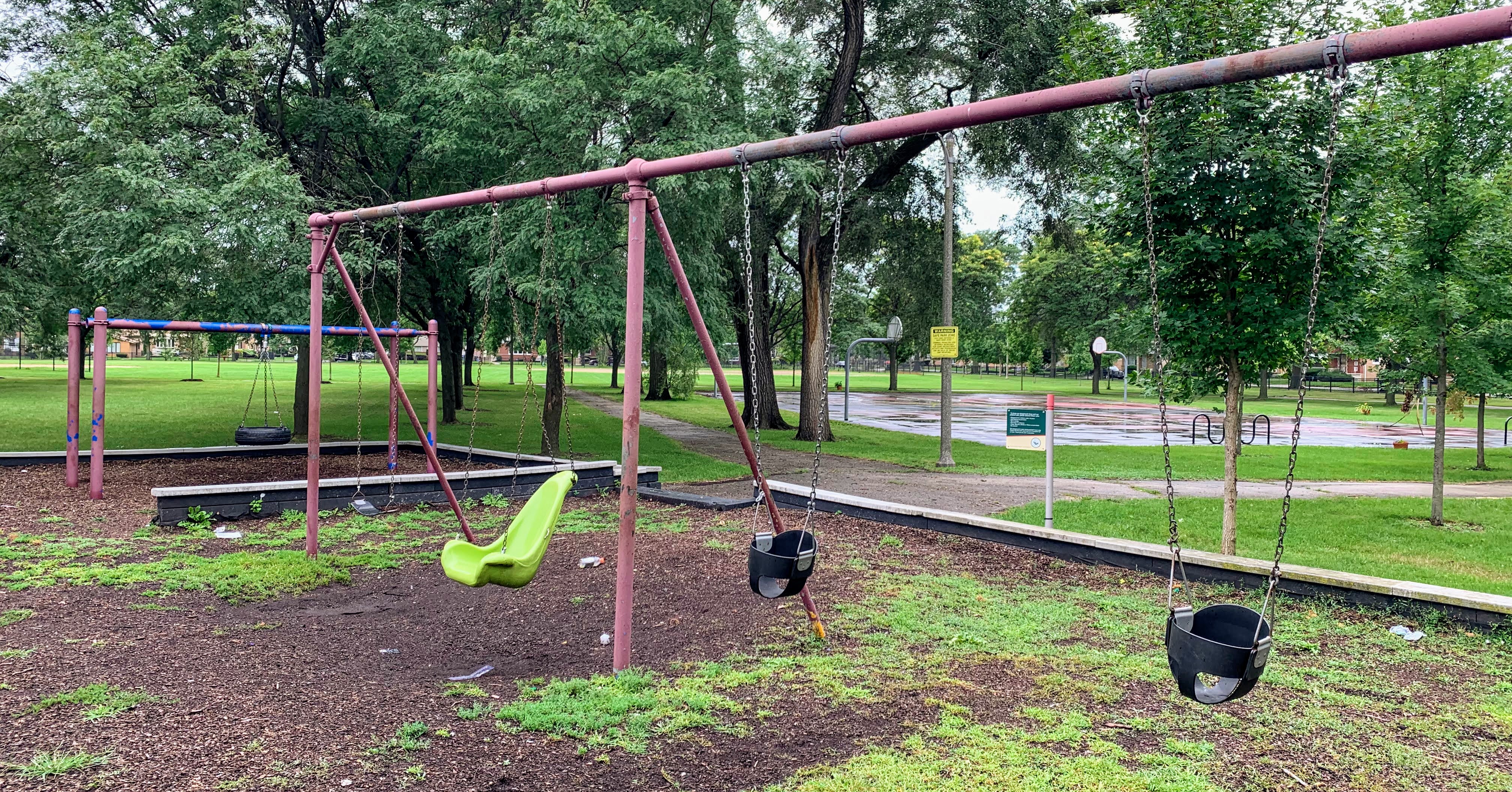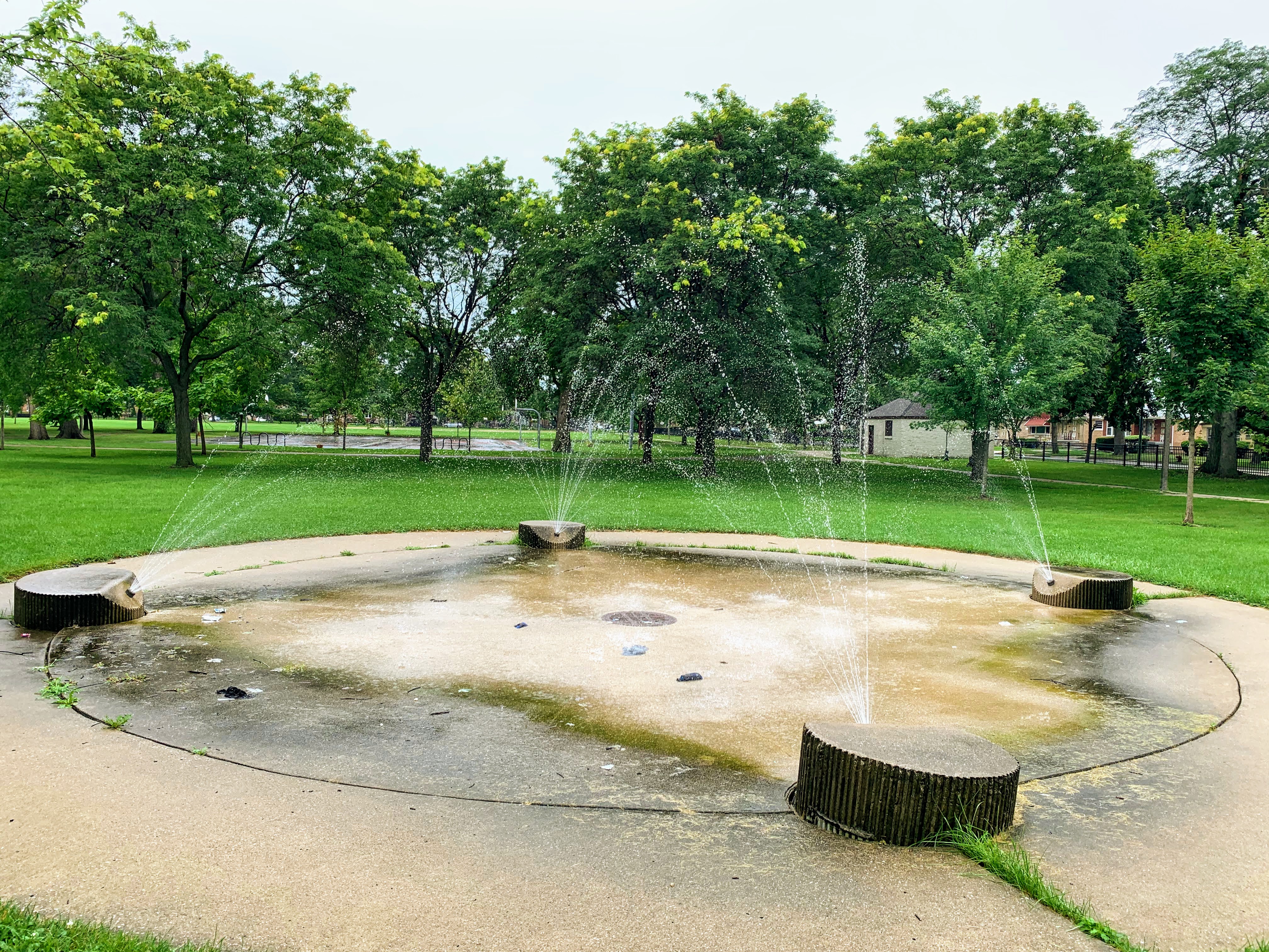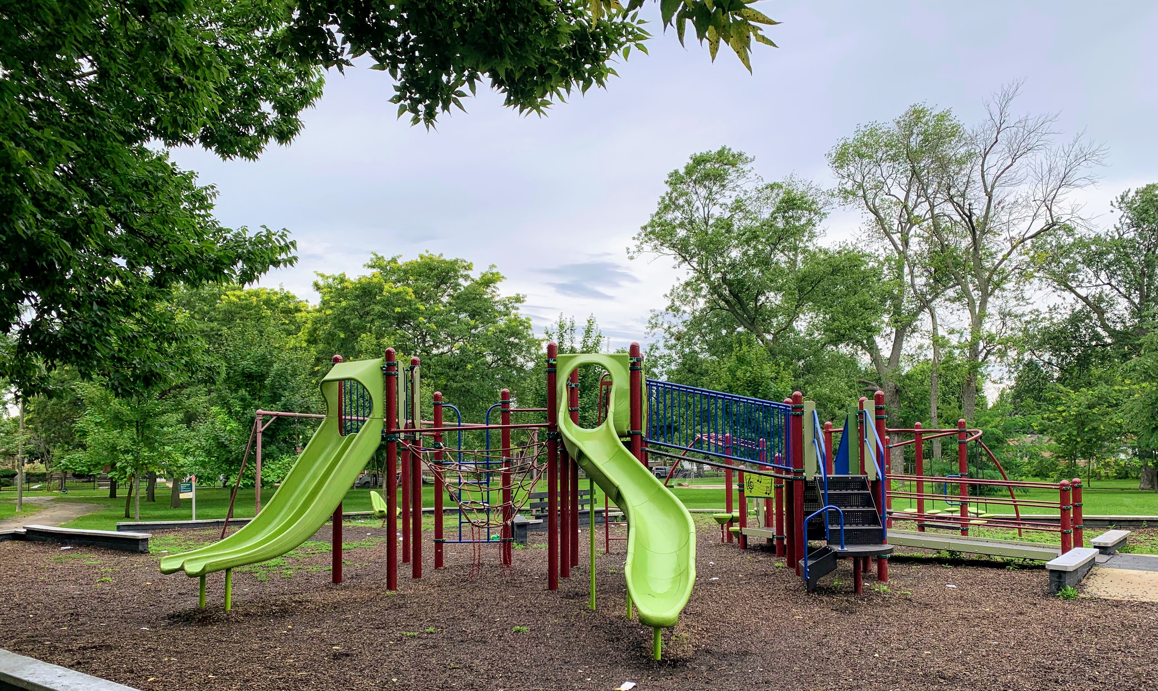 - The playground in Fernwood Park is near the middle of the park and features a moderate size play structure with a variety of slides and a 'rope net funnel.' There are also a variety of traversing elements connected to the structure and a variety of swings (toddler, adaptive, belt seat, and a tire swing). There is also a simple 'four sprayer' water spray feature. The play area opens to the rest of the park and boasts a few benches for seating. The play surface is wood chips and the nearby fieldhouse should provide access to a drinking fountain and bathrooms (when open).