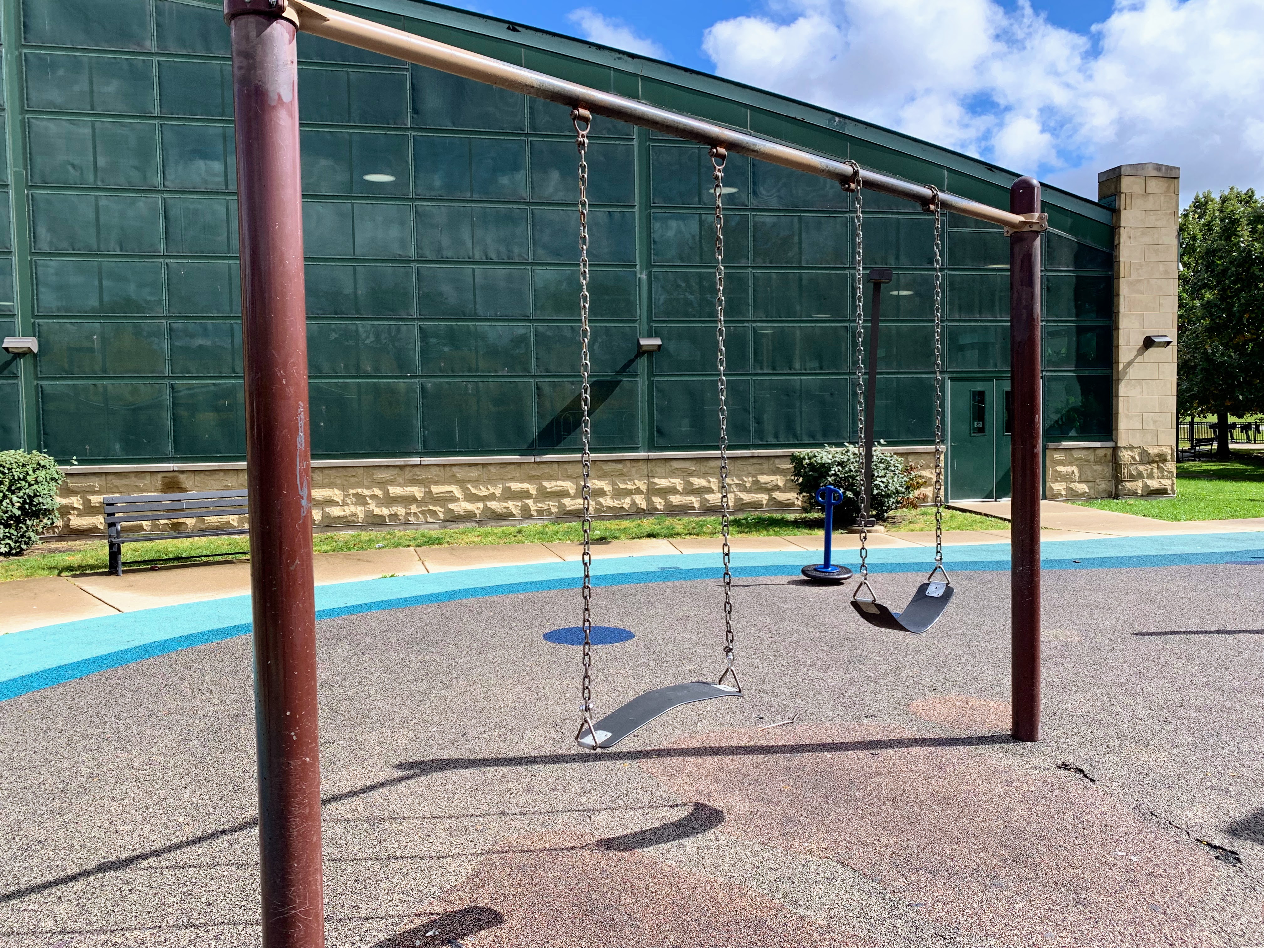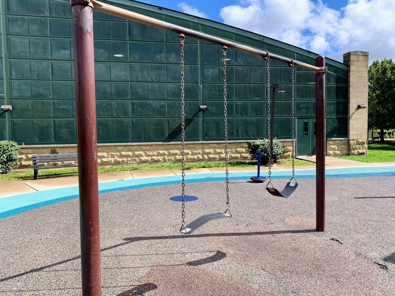 The non-play amenities are solid. There is a drinking fountain and benches for seating and the fieldhouse provides access to bathrooms (when open). The play area is fenced from the street and includes a soft rubber surface. Although there are some trees, the play area itself is bring and sunny. All in all, this is a great playground; highly recommend. - Playground Features