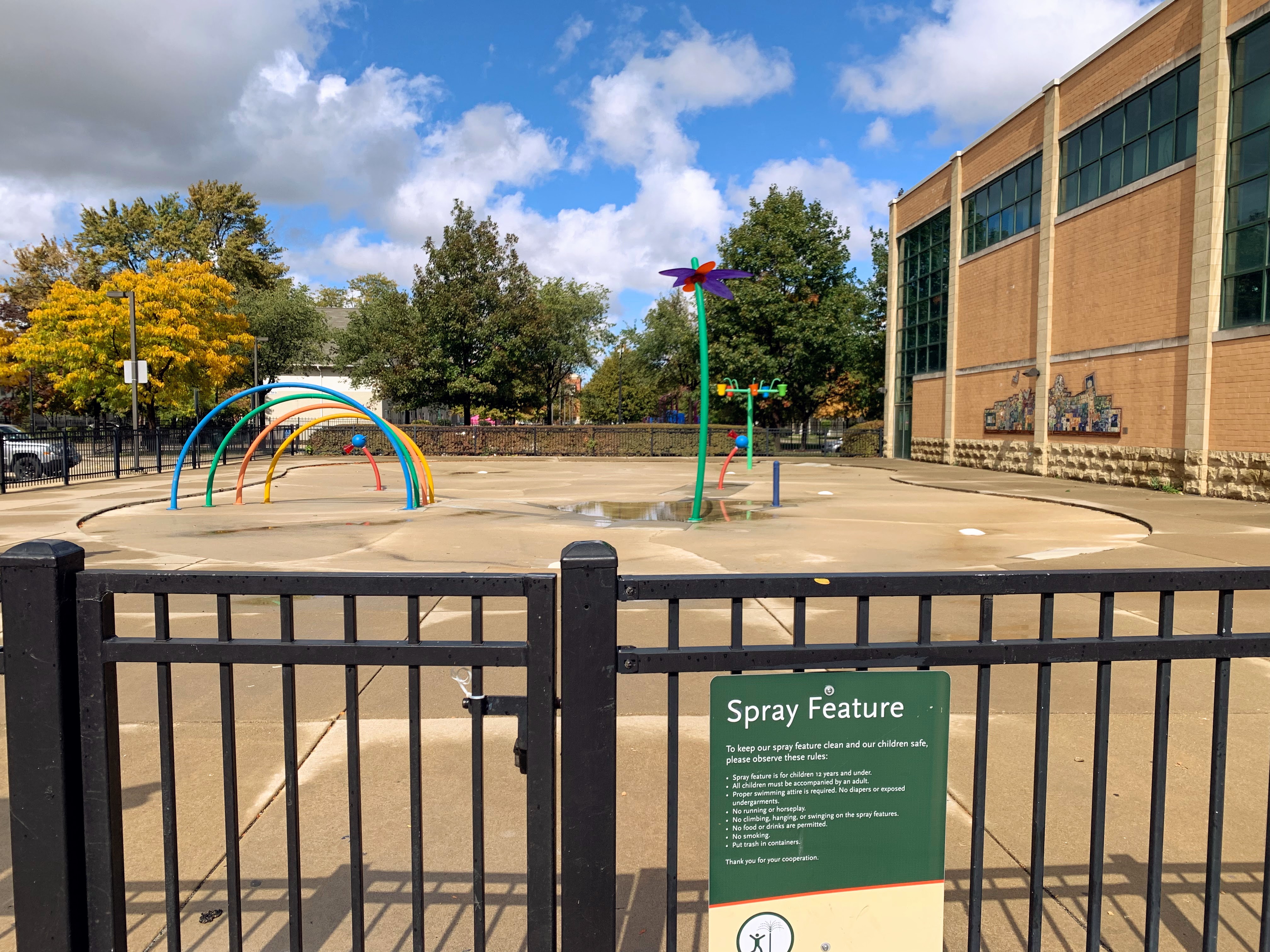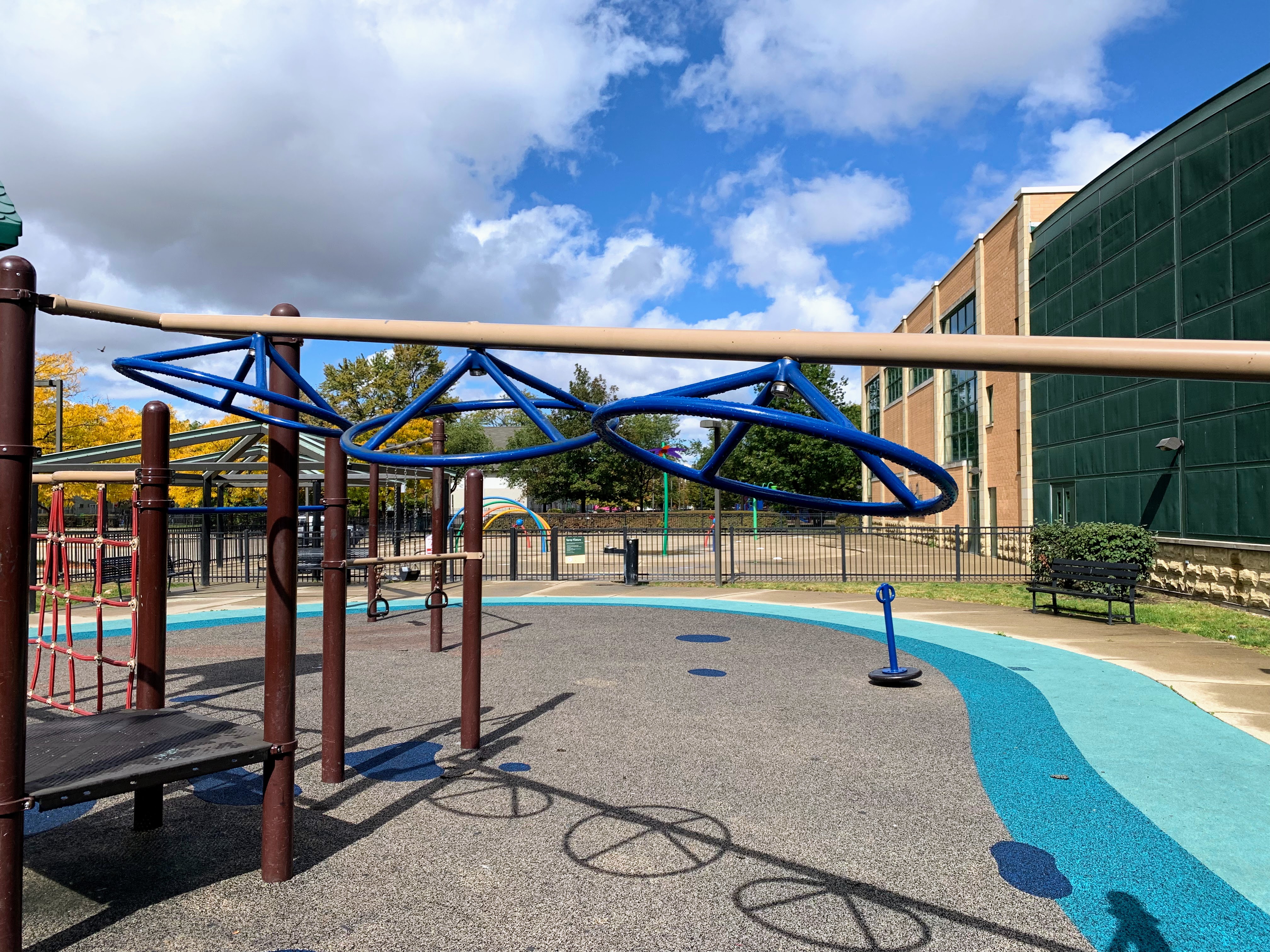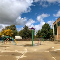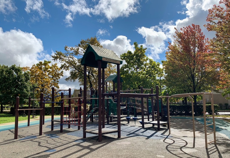 This playground - one of two in Fosco Park - appears to be the main playground and features a large play structure and is next to a large water spray area. The playground itself includes a large and sprawling play structure with a variety of slides and climbing elements - nothing too out of the ordinary but a really solid playground. The water spray area is fenced from the playground and features a few different spray elements.