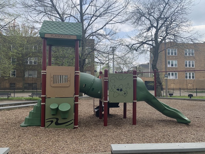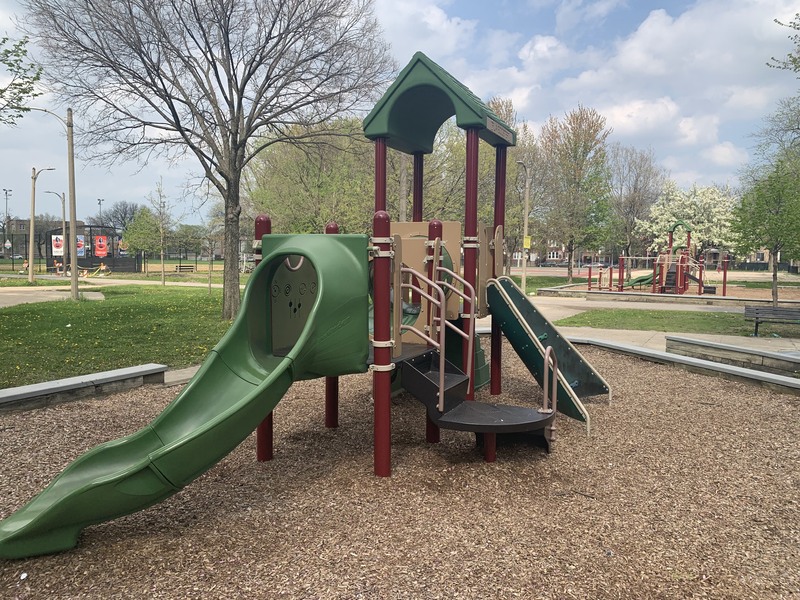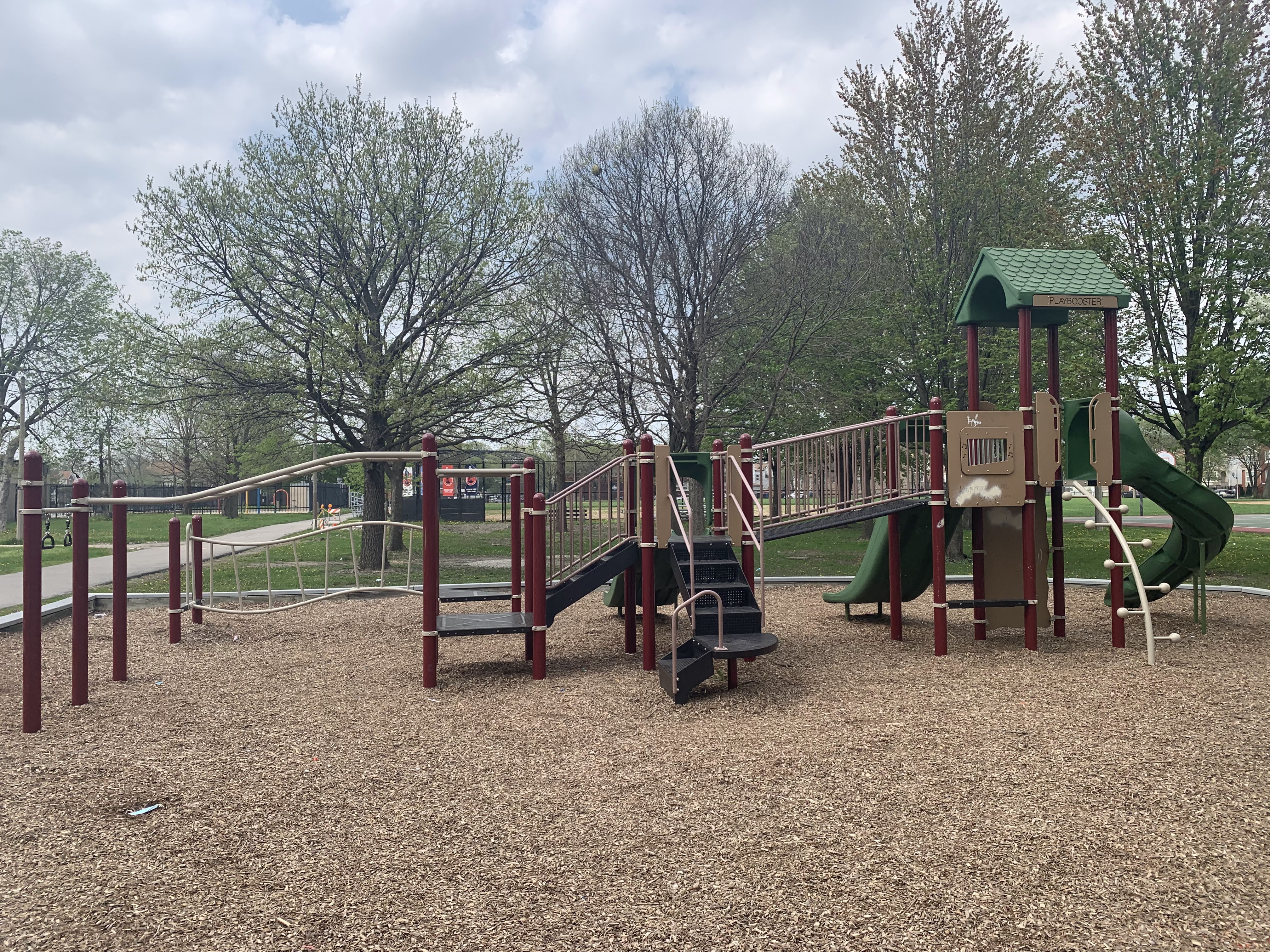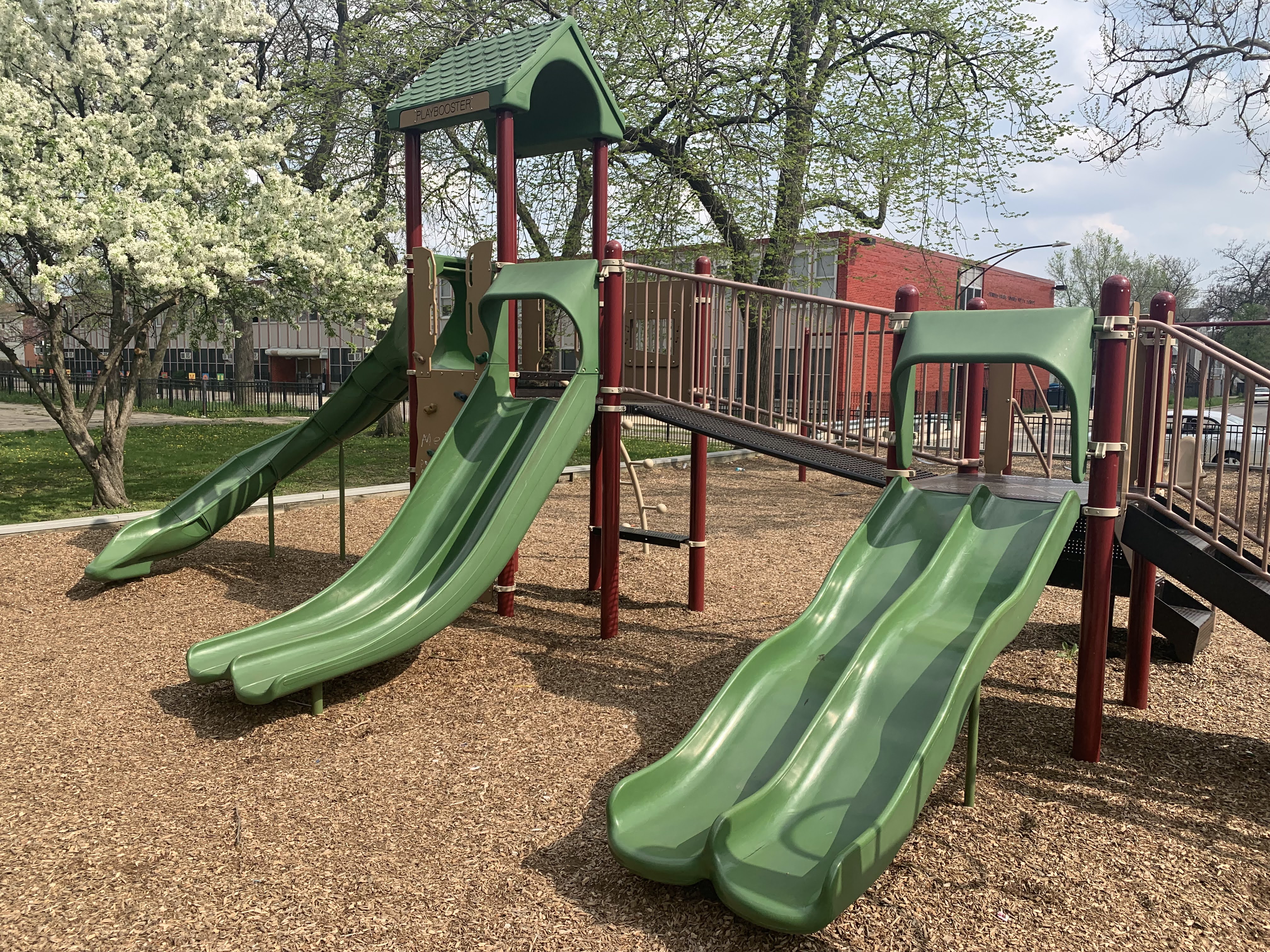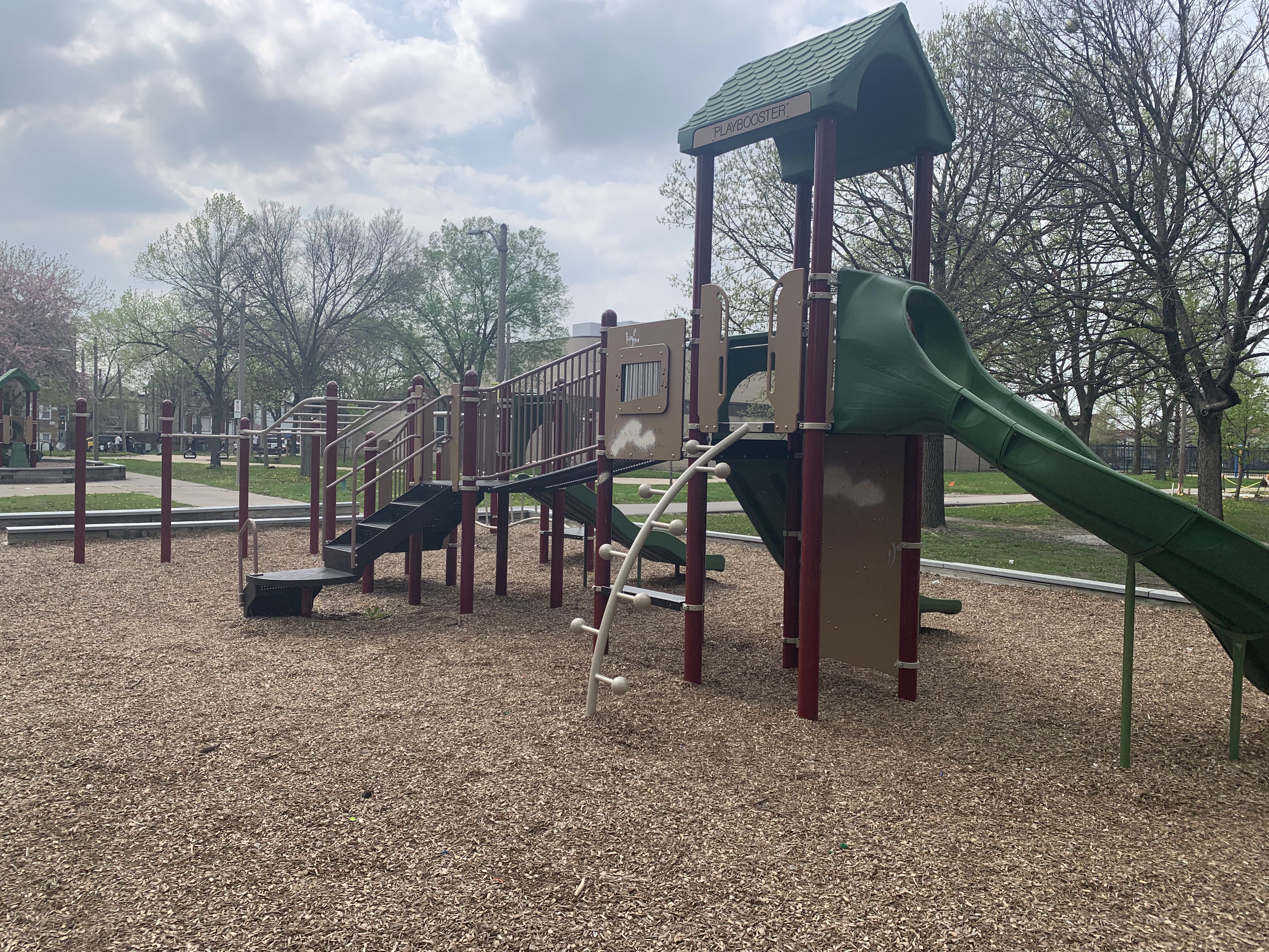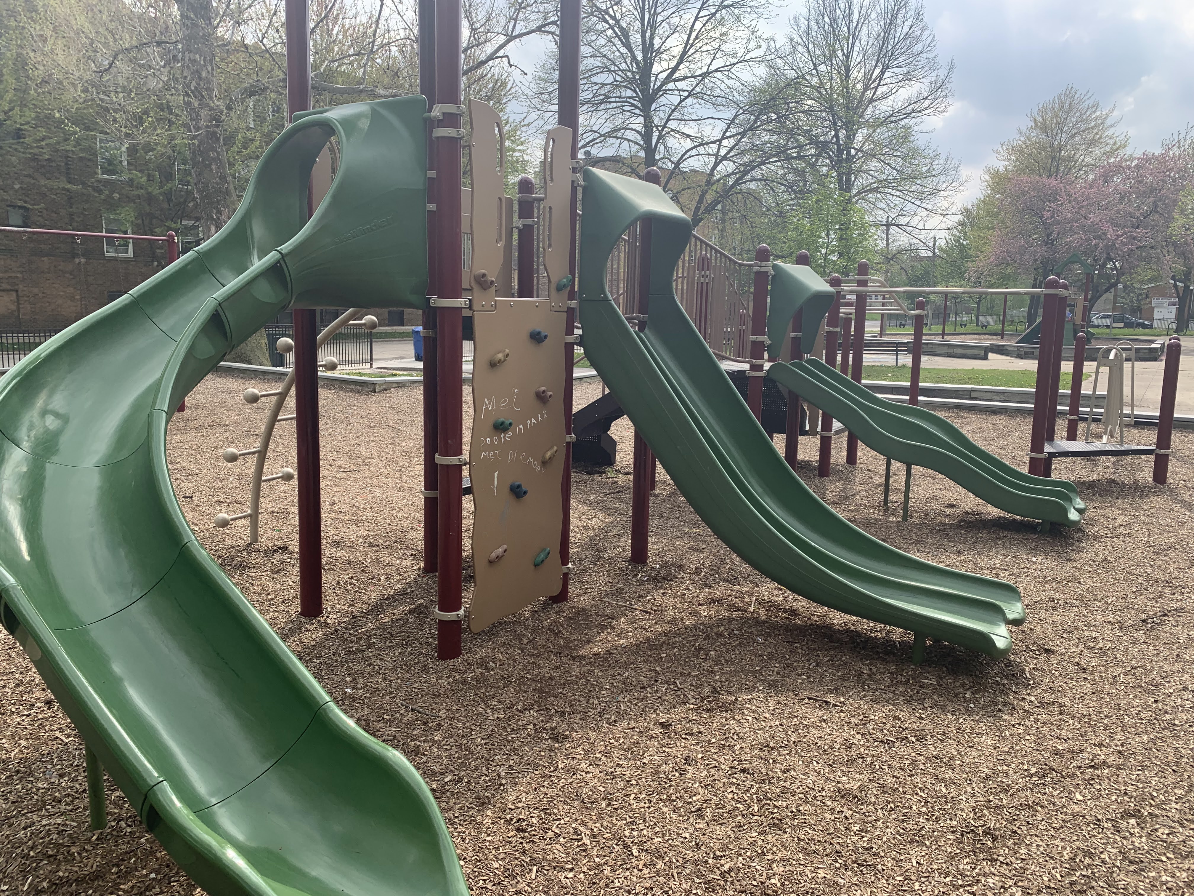 - The playground at Franklin Park is divided into two distinct areas - one for younger children and the other for older children. The structure for younger children features a small play structure with a small summit climber, conical climbing wall and small slide. There are also four toddler swings. The larger structure features two variations of monkey bars, three slides, and a few climbing and traversing elements along with standard swings (belt seat and adaptive). Both areas are fenced from the street but not fully enclosed and both have a play surface of wood chips. A water spray feature is situated just north of the playground and next to the Franklin Park outdoor pool and the park district building provides bathroom access during open hours.