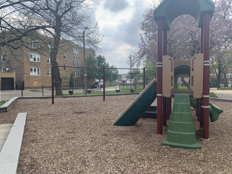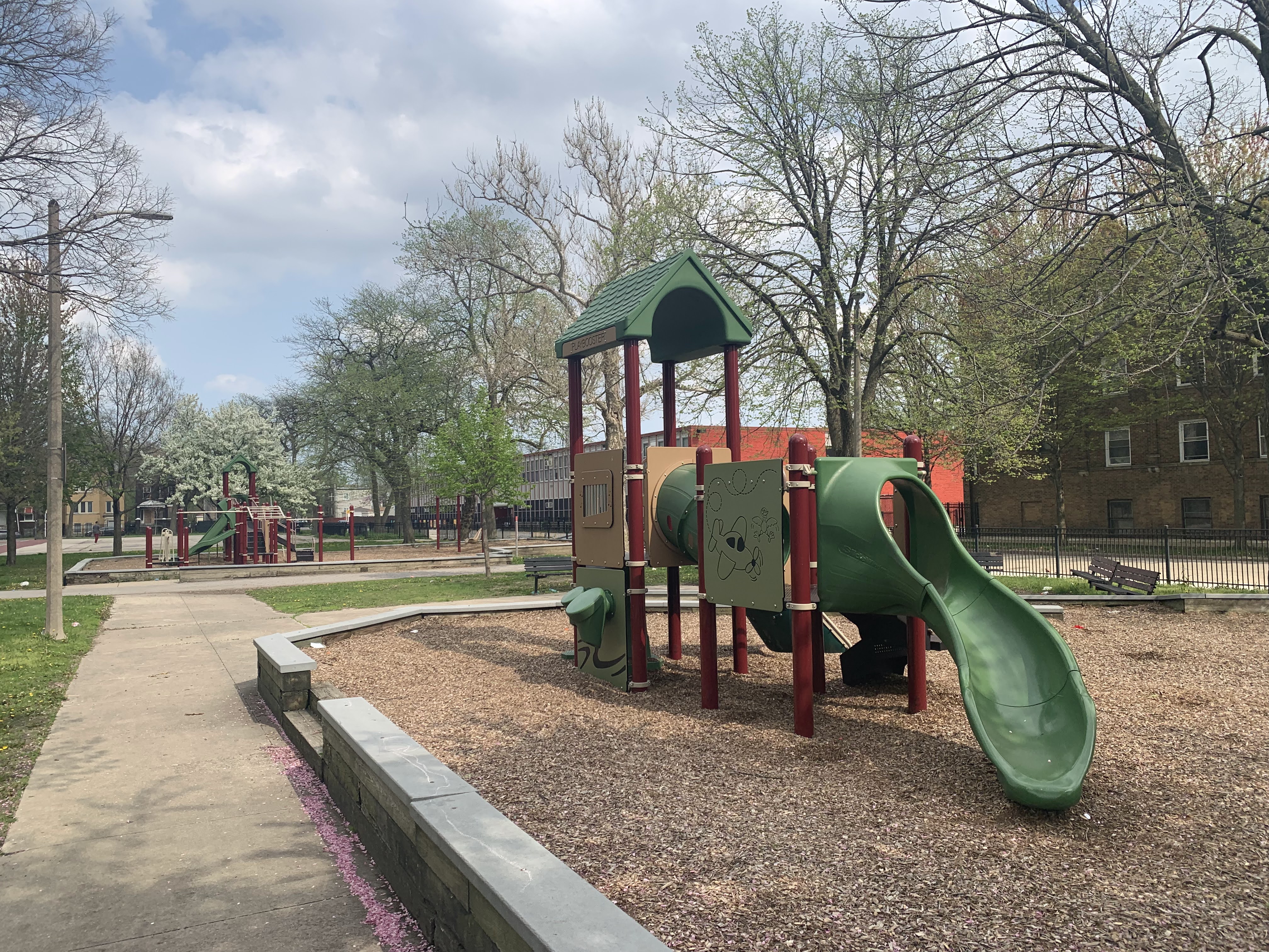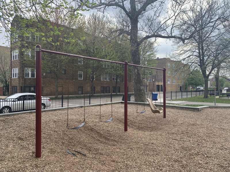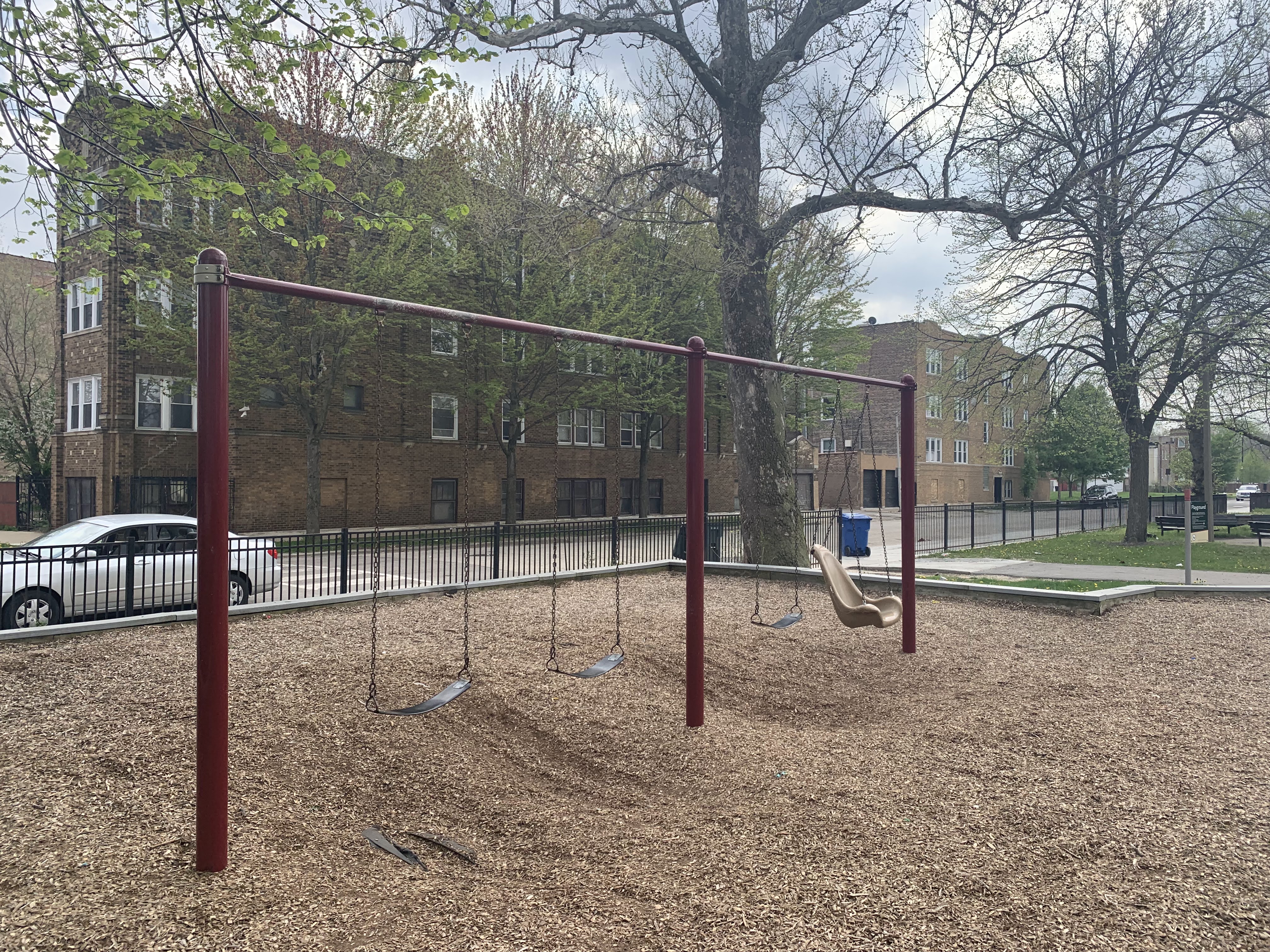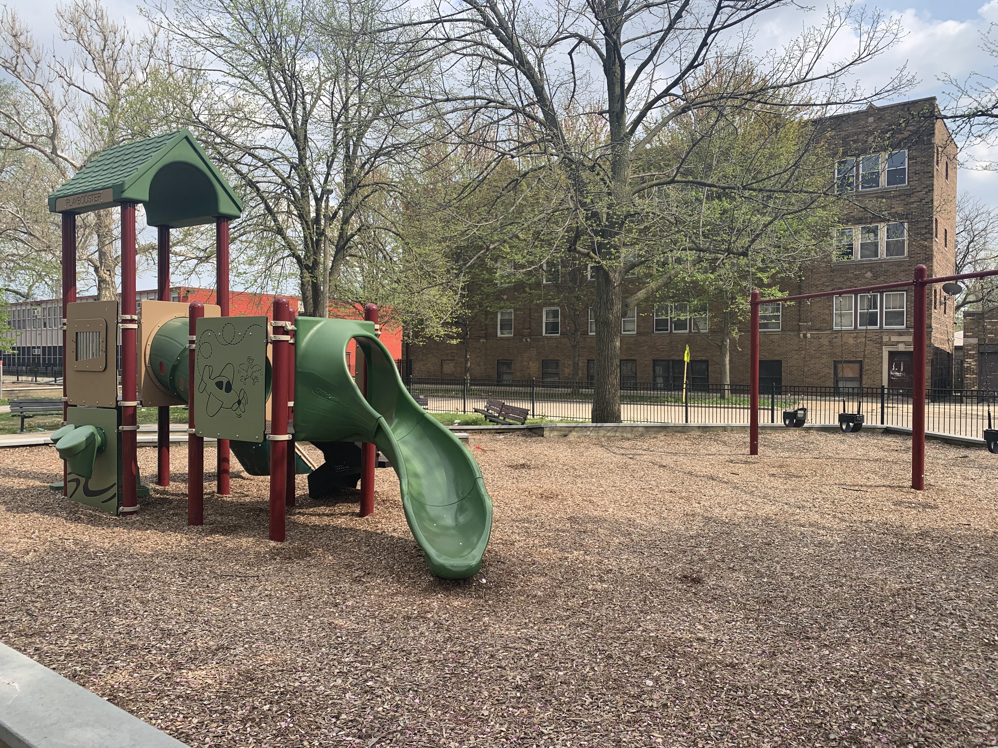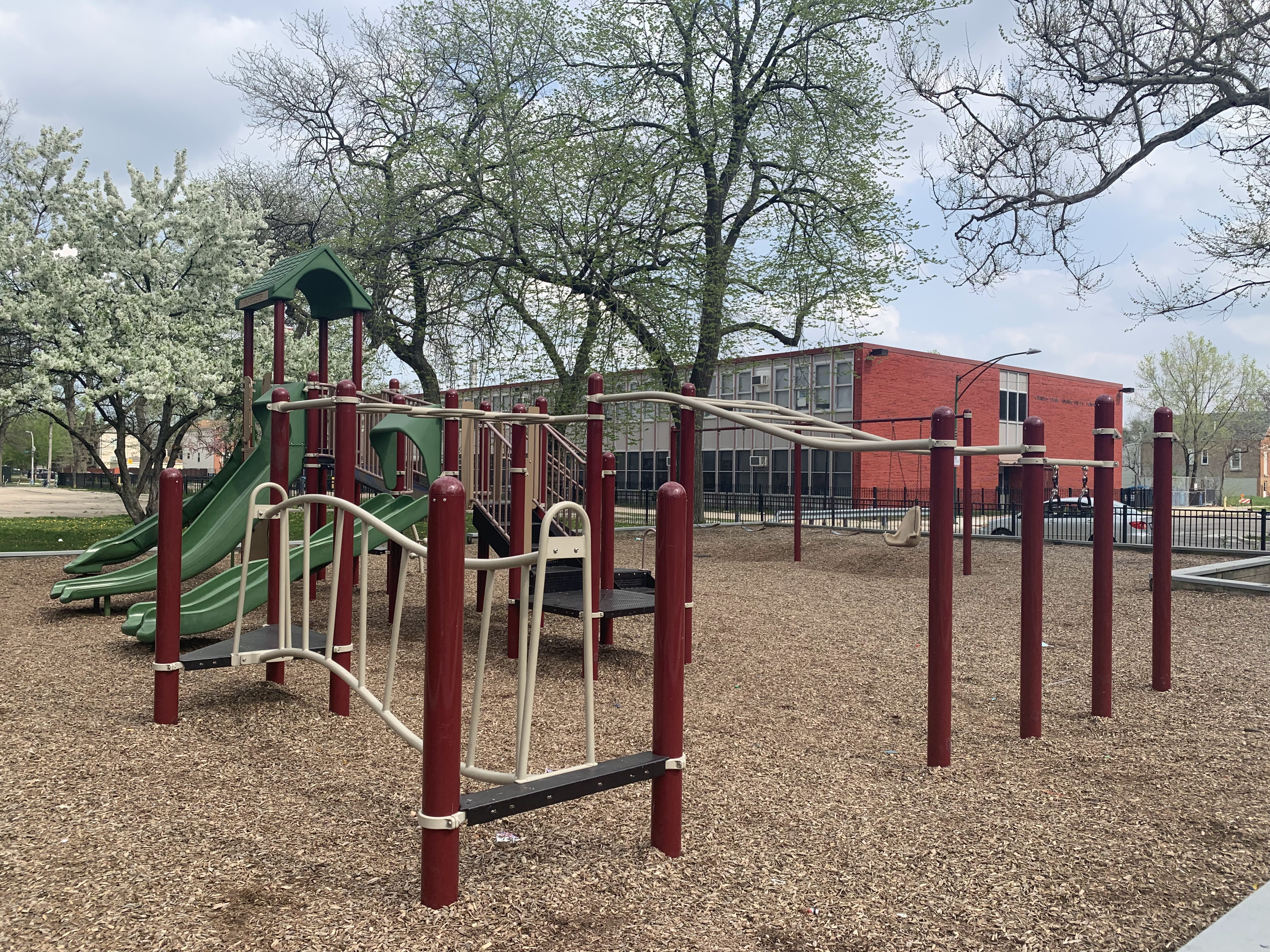 - The playground at Franklin Park is divided into two distinct areas - one for younger children and the other for older children. The structure for younger children features a small play structure with a small summit climber, conical climbing wall and small slide. There are also four toddler swings. The larger structure features two variations of monkey bars, three slides, and a few climbing and traversing elements along with standard swings (belt seat and adaptive). Both areas are fenced from the street but not fully enclosed and both have a play surface of wood chips. A water spray feature is situated just north of the playground and next to the Franklin Park outdoor pool and the park district building provides bathroom access during open hours.