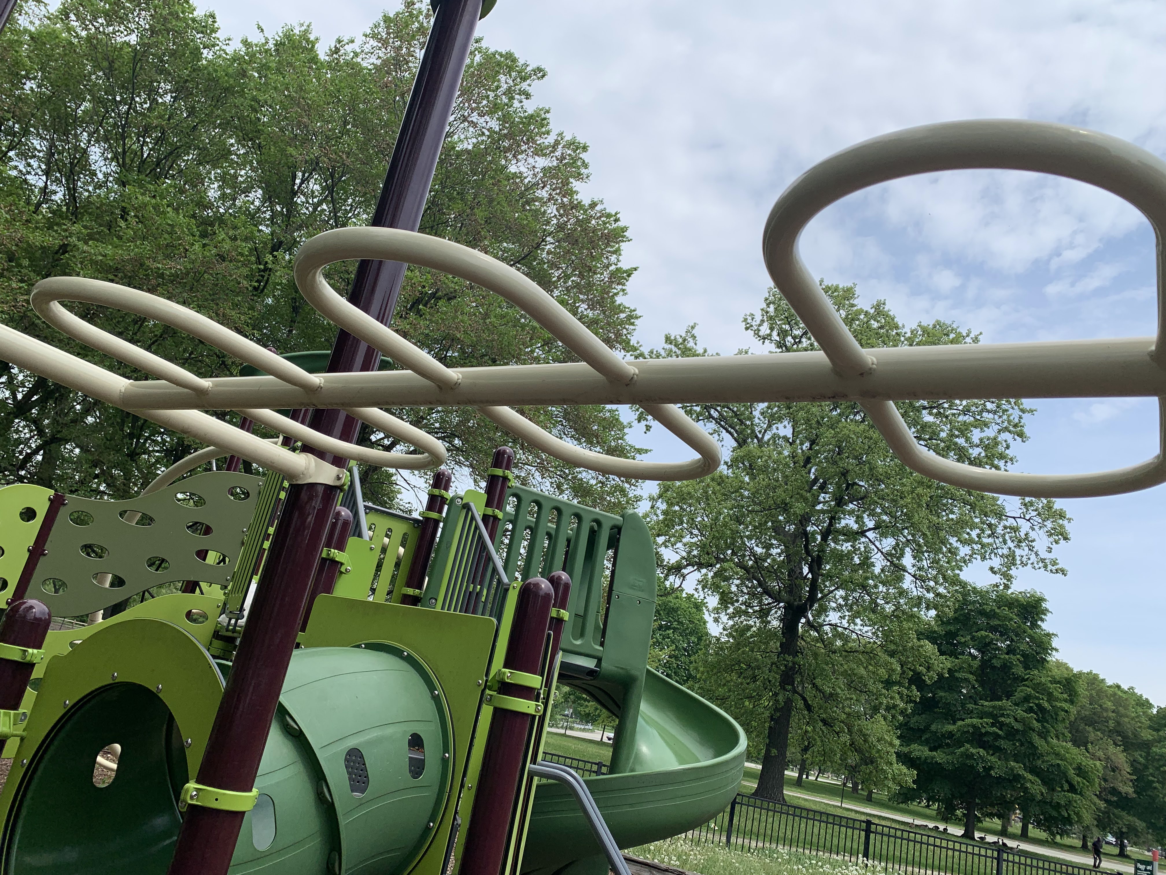 - This playground - one of two in Garfield Park - is located on the east side of the park near the intersection of Madison and Homan and contains two play structure. The smaller play structure is a single modular structure designed for young children; a few other standalone elements and toddler swings are situated nearby. The larger play structure is for older children and features a large twisted net climbing structure, monkey bars, and a few slides. There are fences around parts of the playground but it is not fully enclosed. The play surface is wood chips and a few large trees provide some shade throughout the day.