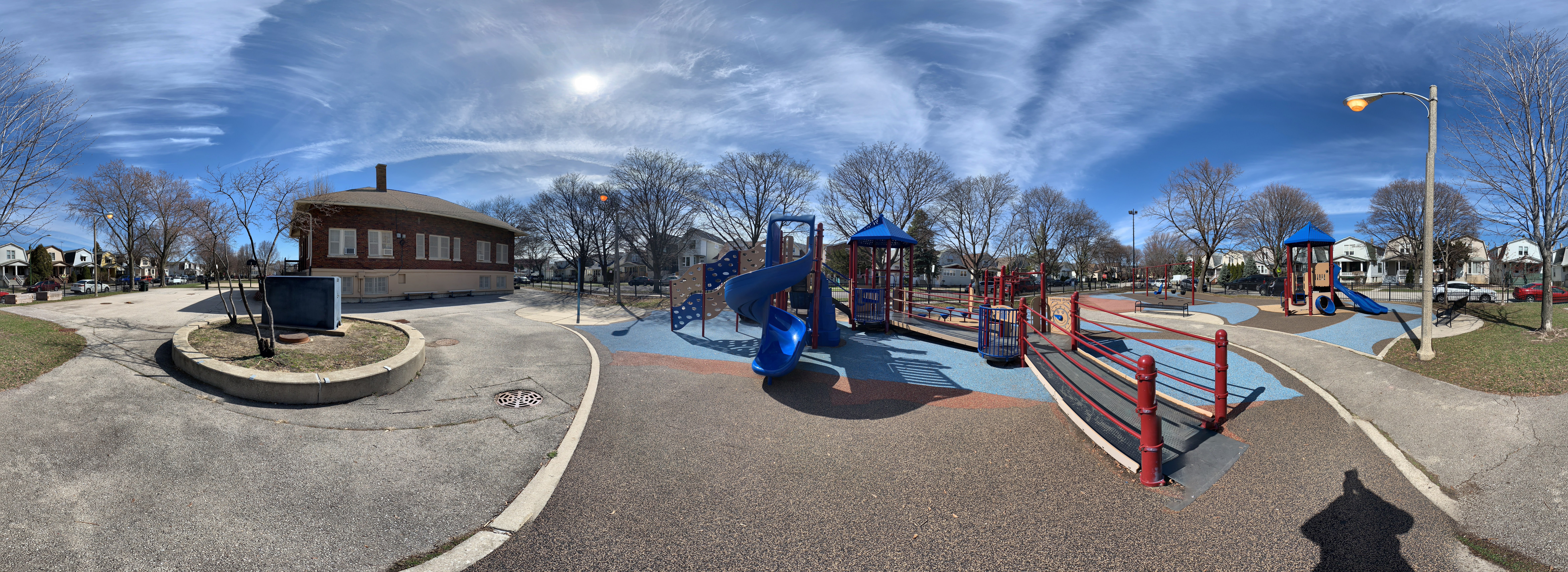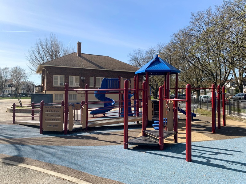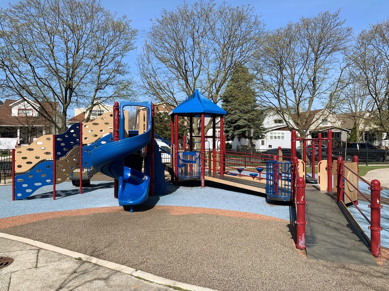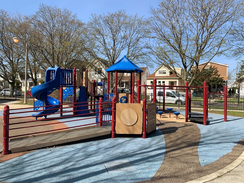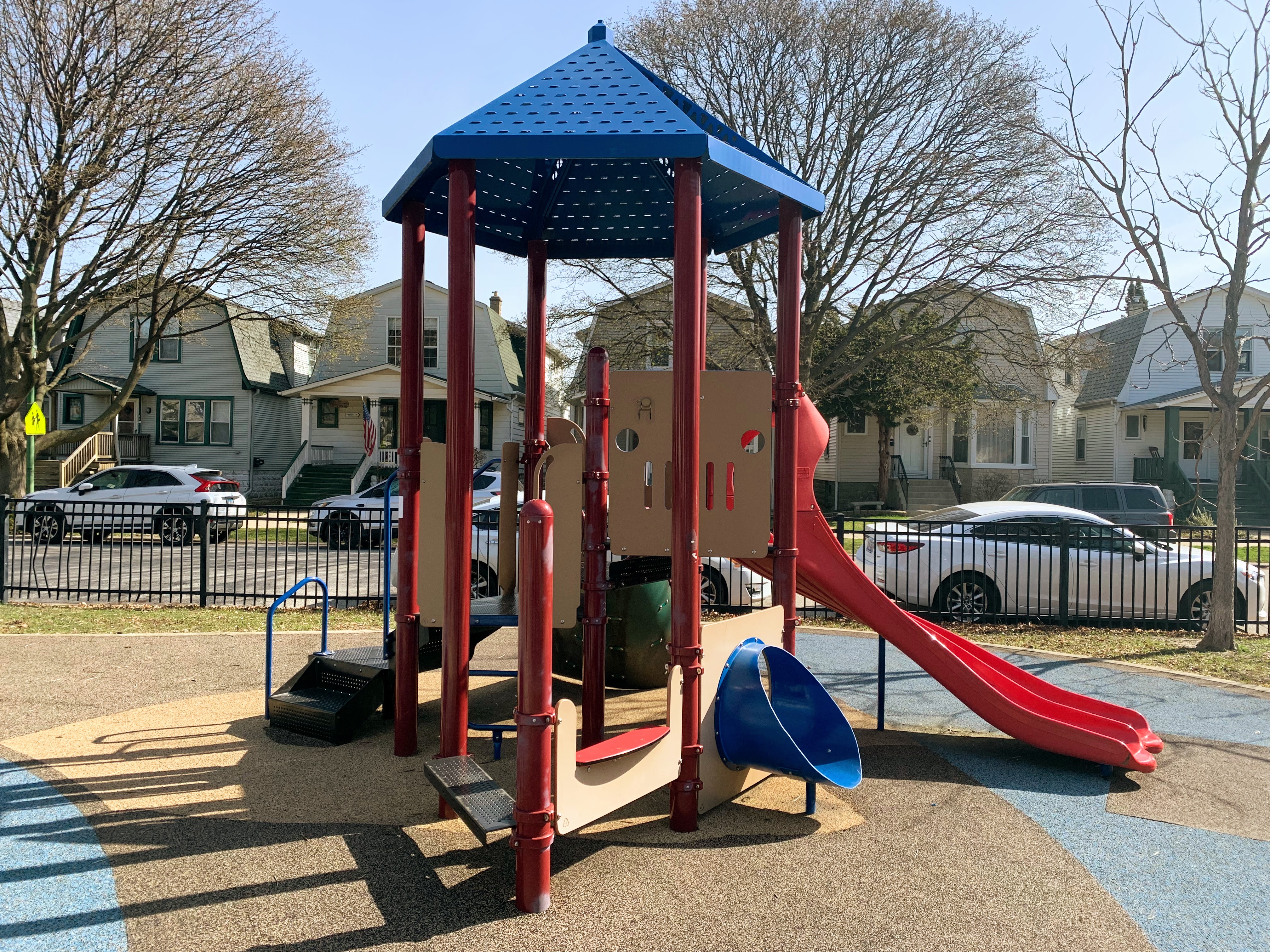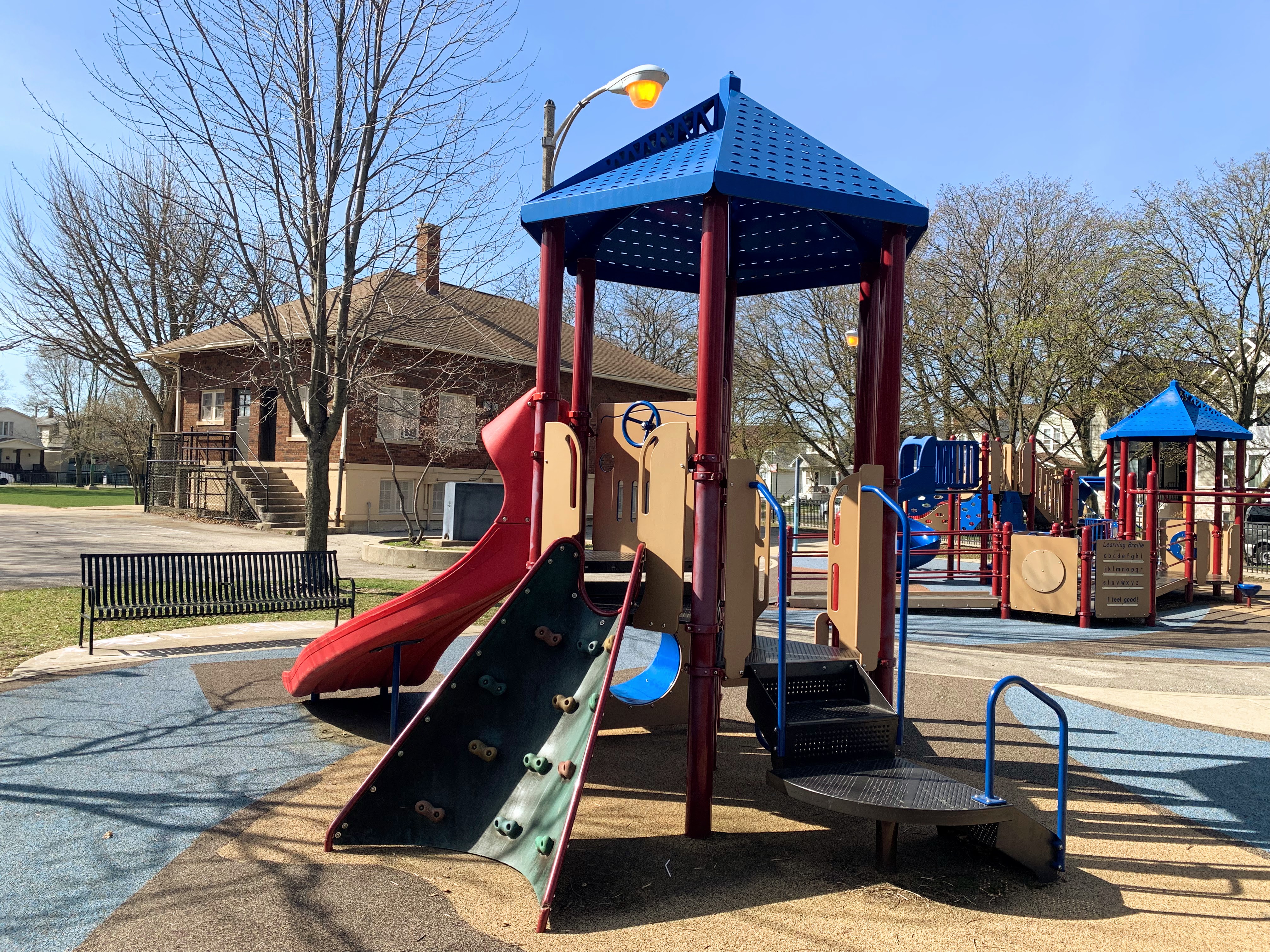- Gladstone Park is a small neighborhood park with standard and well-maintained playground equipment and plenty of benches. There are separate areas for younger children and older children as well as a water spray feature. The play area is fenced from the street and the play surface is soft rubber.