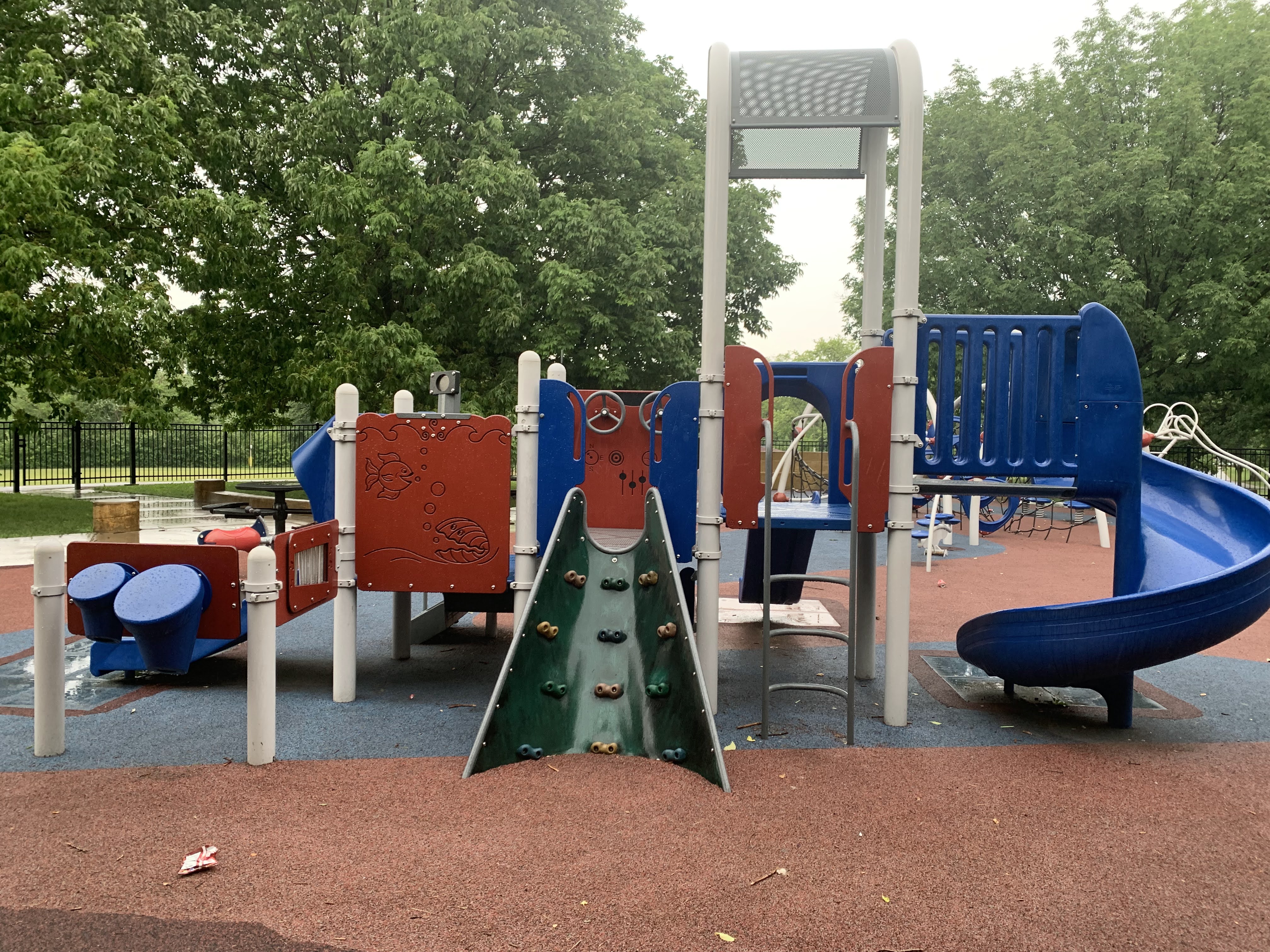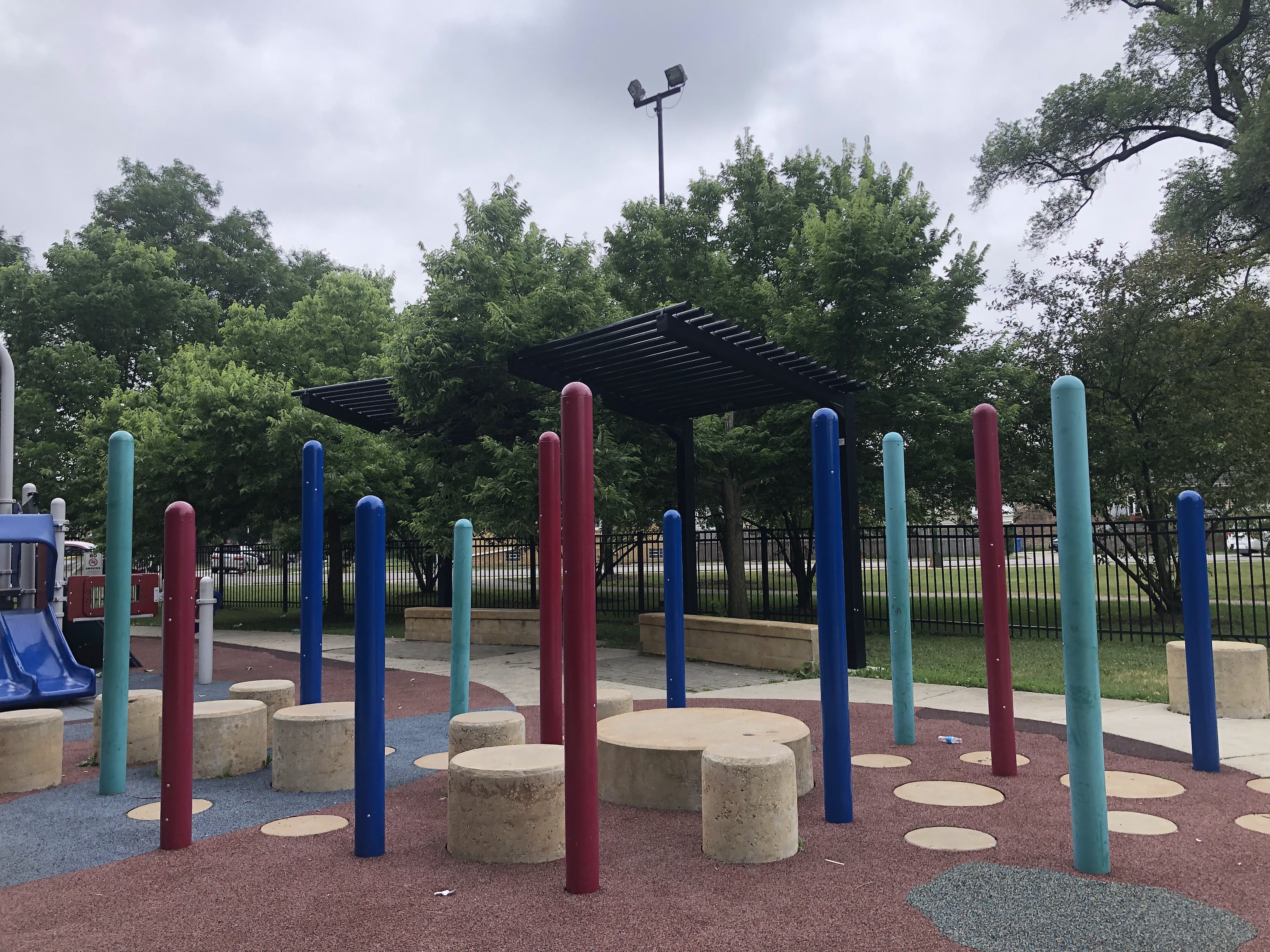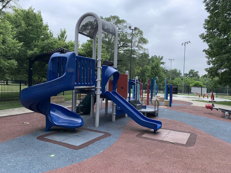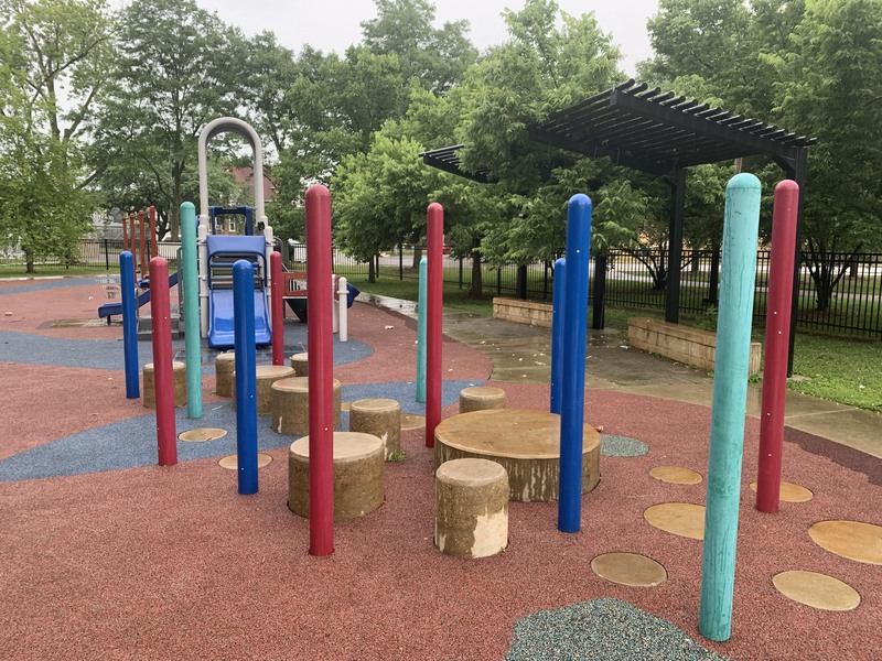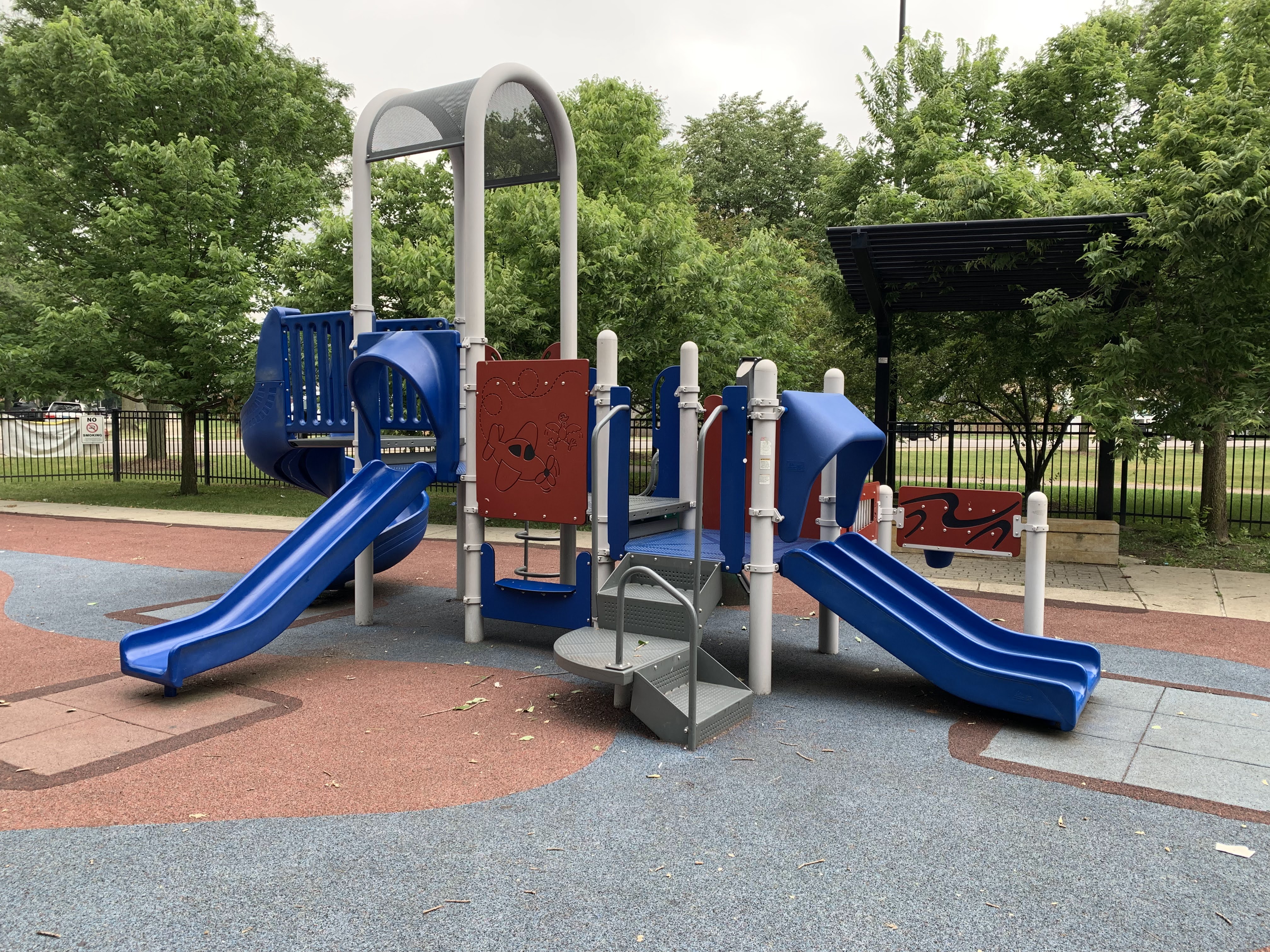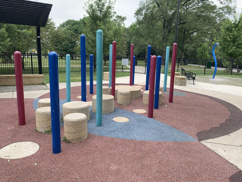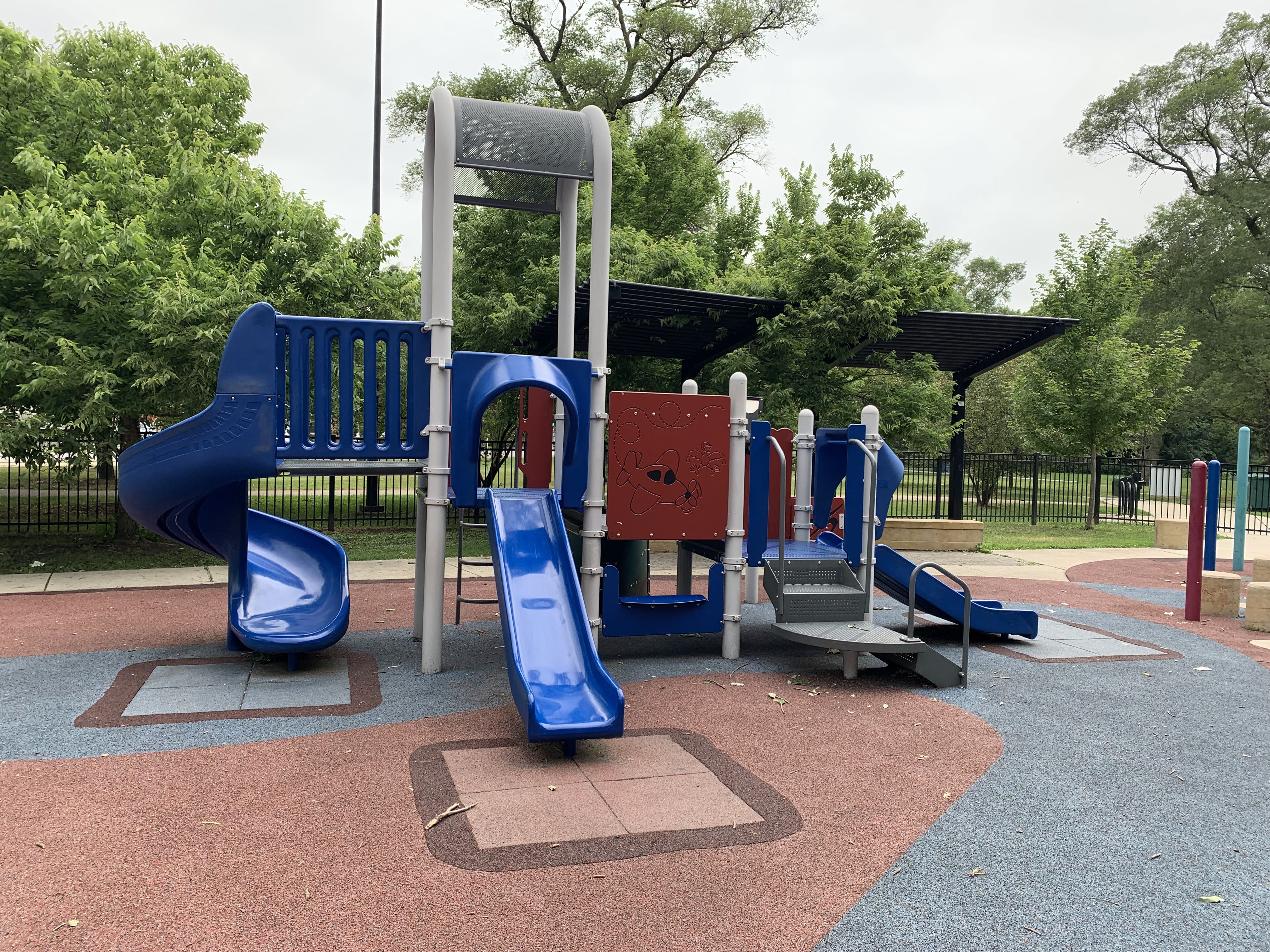 The play surface is soft rubber; this surface is mounded in a place that makes the surface a play element. Additionally, there are a few concrete structures - a bench near the mound covered in soft rubber and a collection of concrete cylinders and metal poles that are unique features of this playground. The play area is fully enclosed (a must considering it's close proximity to Foster Ave) and there are benches, picnic tables, and a drinking fountain in the shaded play area. All in all, this is a great playground; highly recommend. - Playground Features