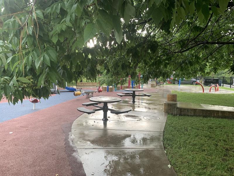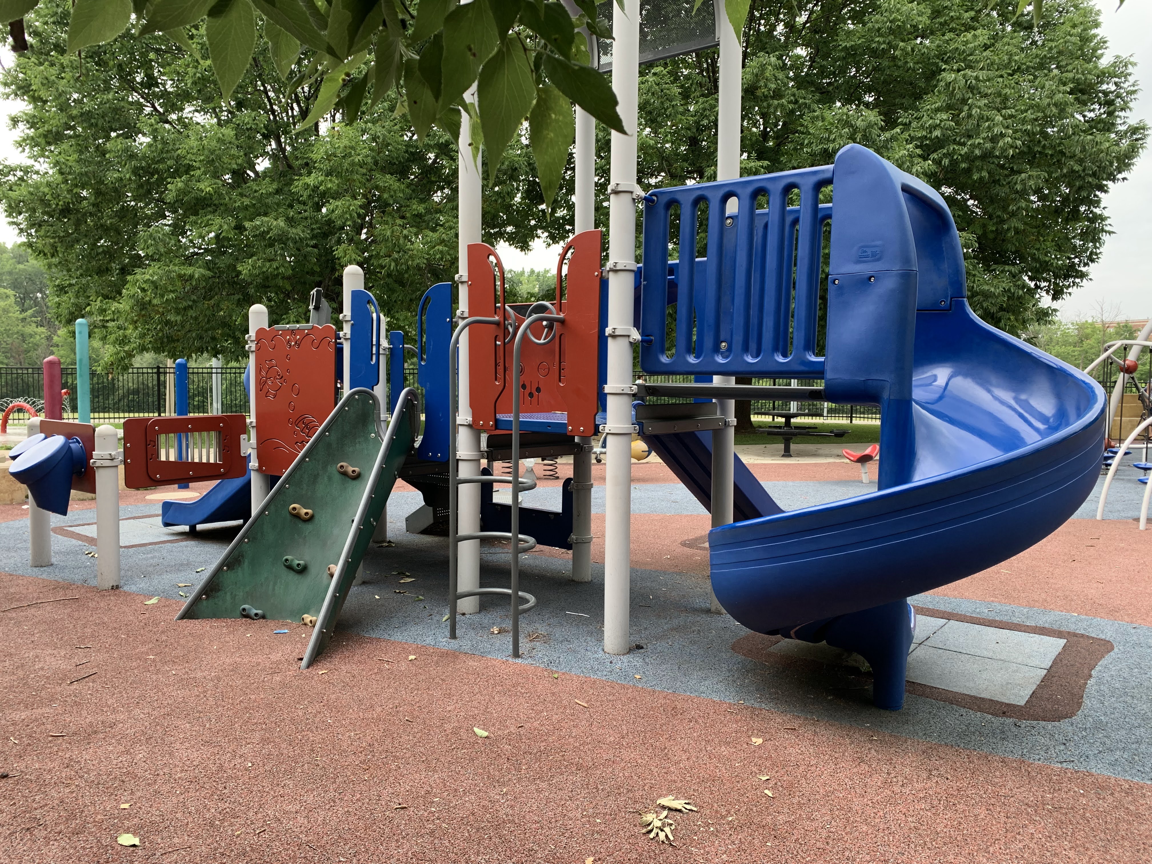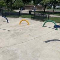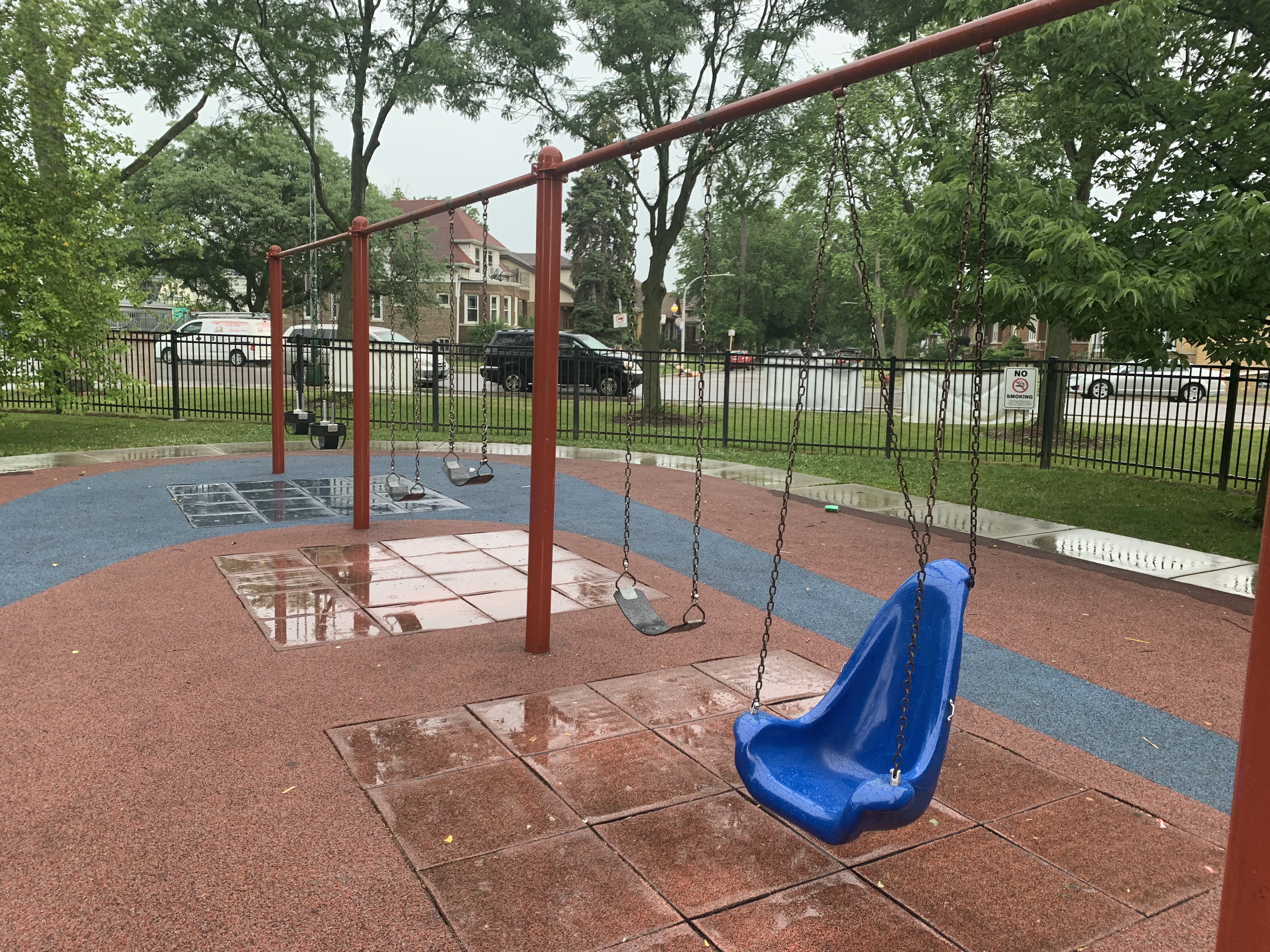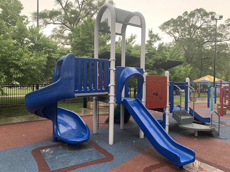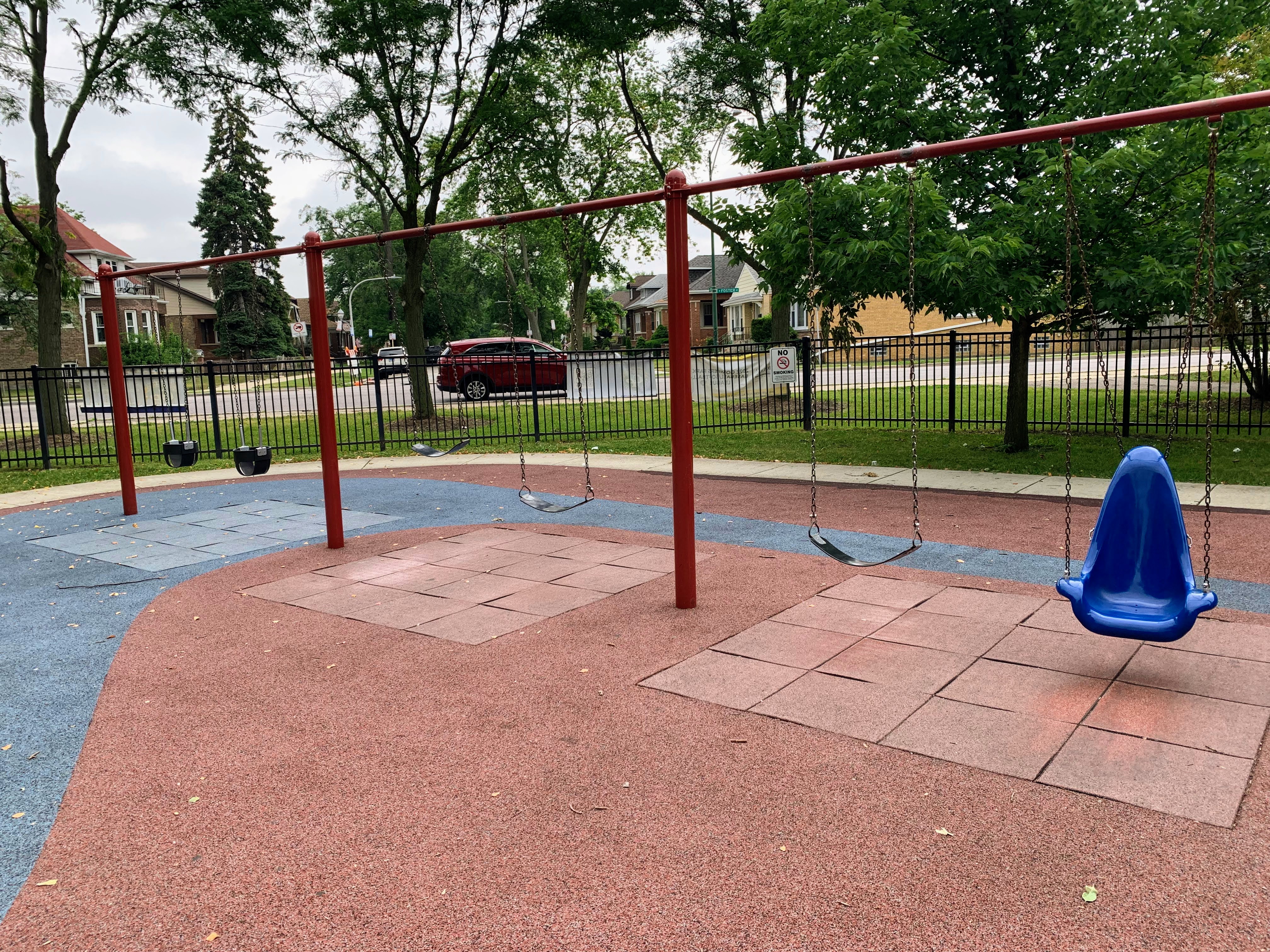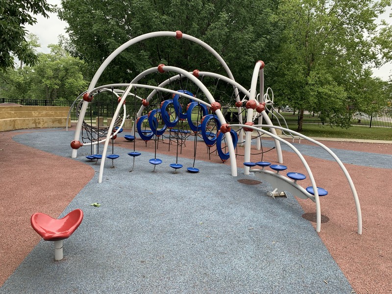 The play surface is soft rubber; this surface is mounded in a place that makes the surface a play element. Additionally, there are a few concrete structures - a bench near the mound covered in soft rubber and a collection of concrete cylinders and metal poles that are unique features of this playground. The play area is fully enclosed (a must considering it's close proximity to Foster Ave) and there are benches, picnic tables, and a drinking fountain in the shaded play area. All in all, this is a great playground; highly recommend. - Playground Features