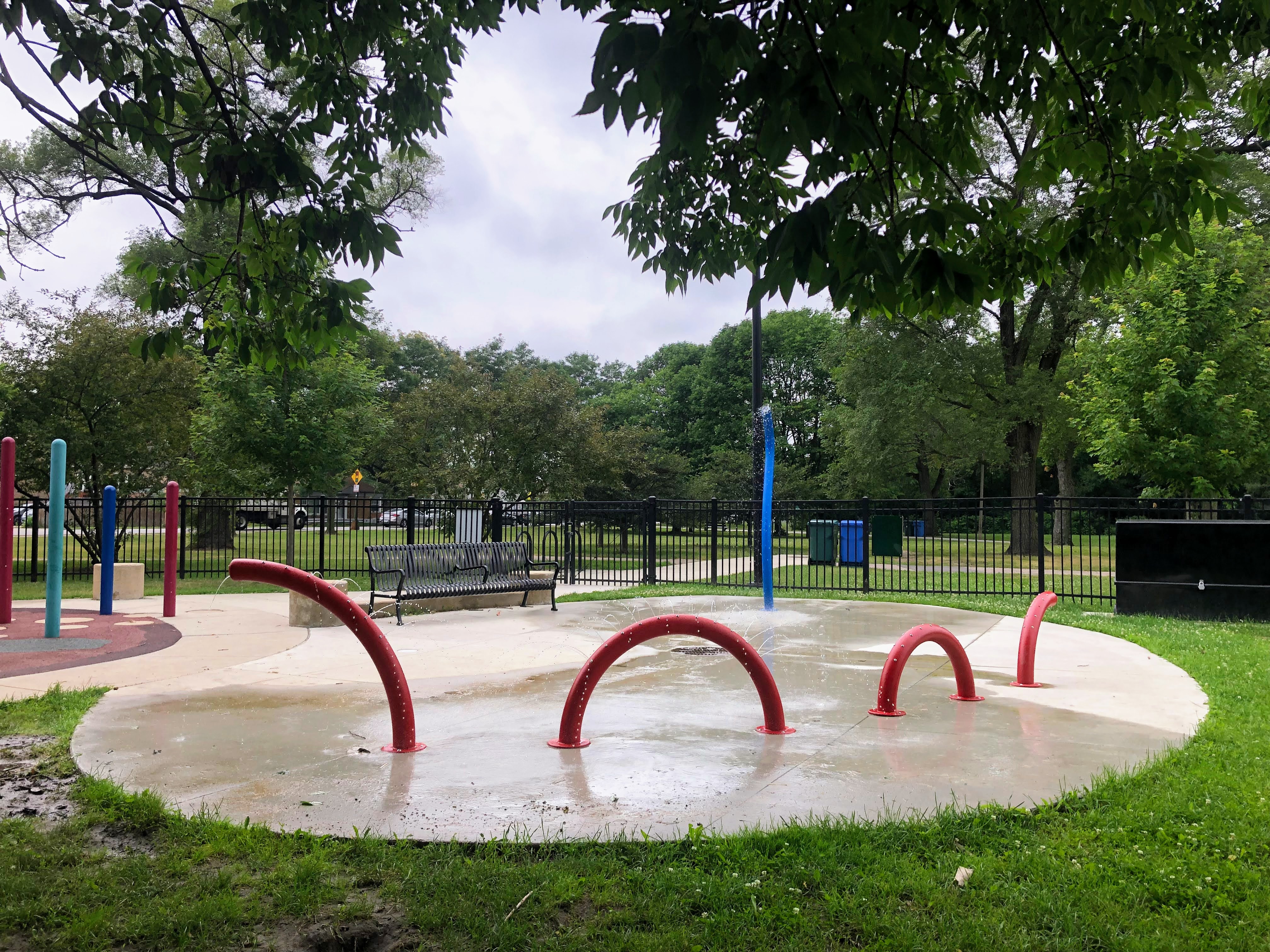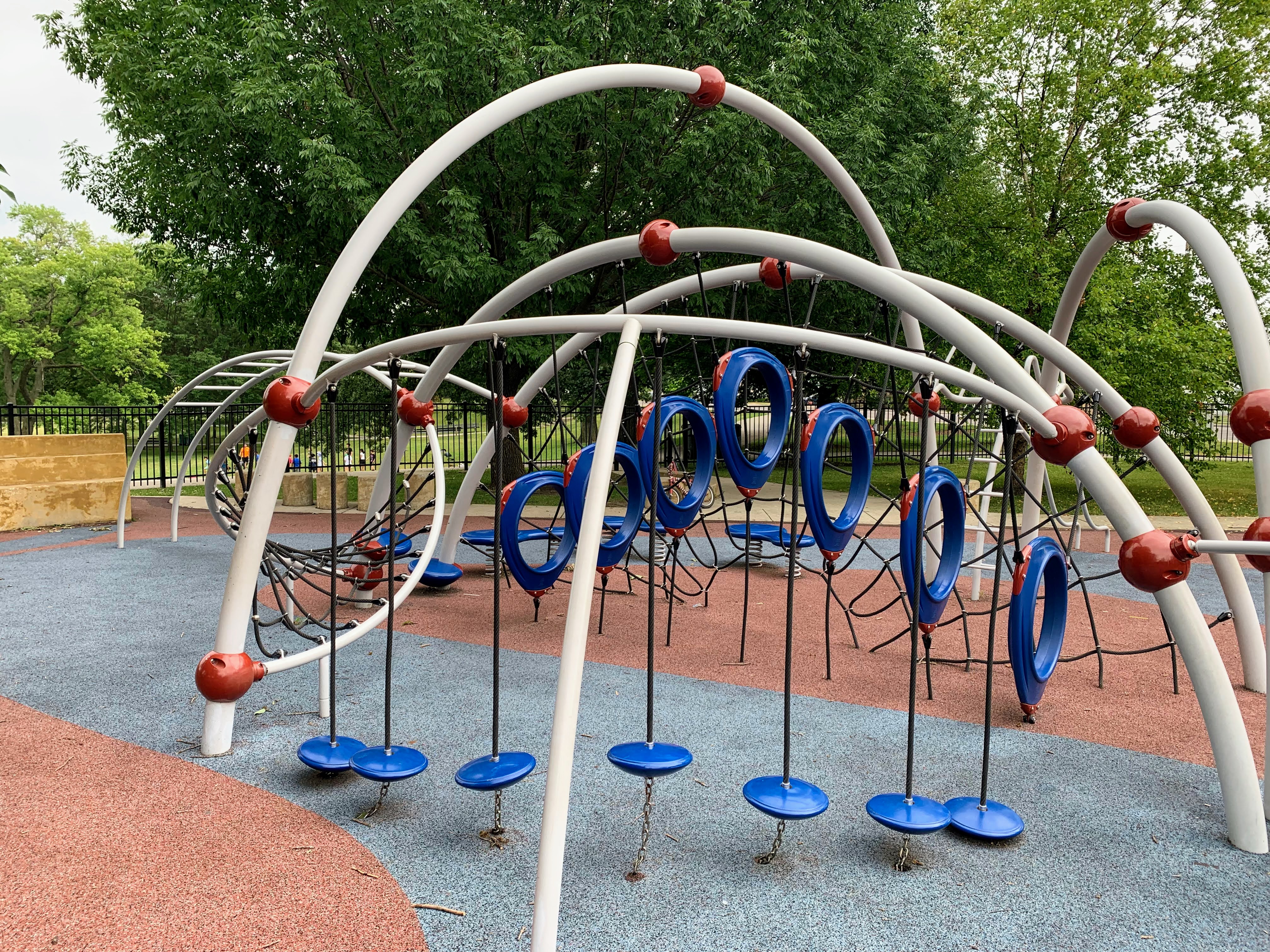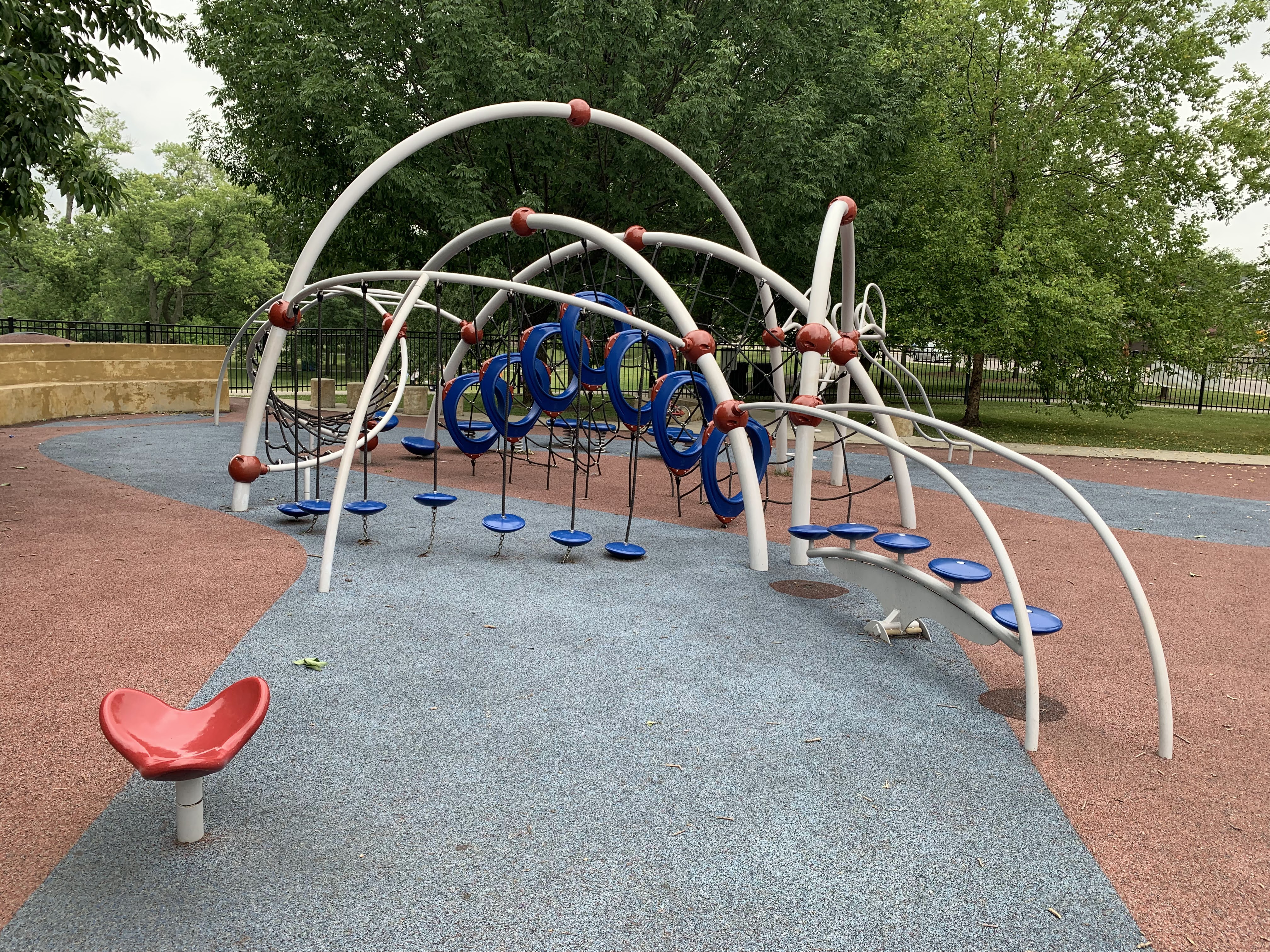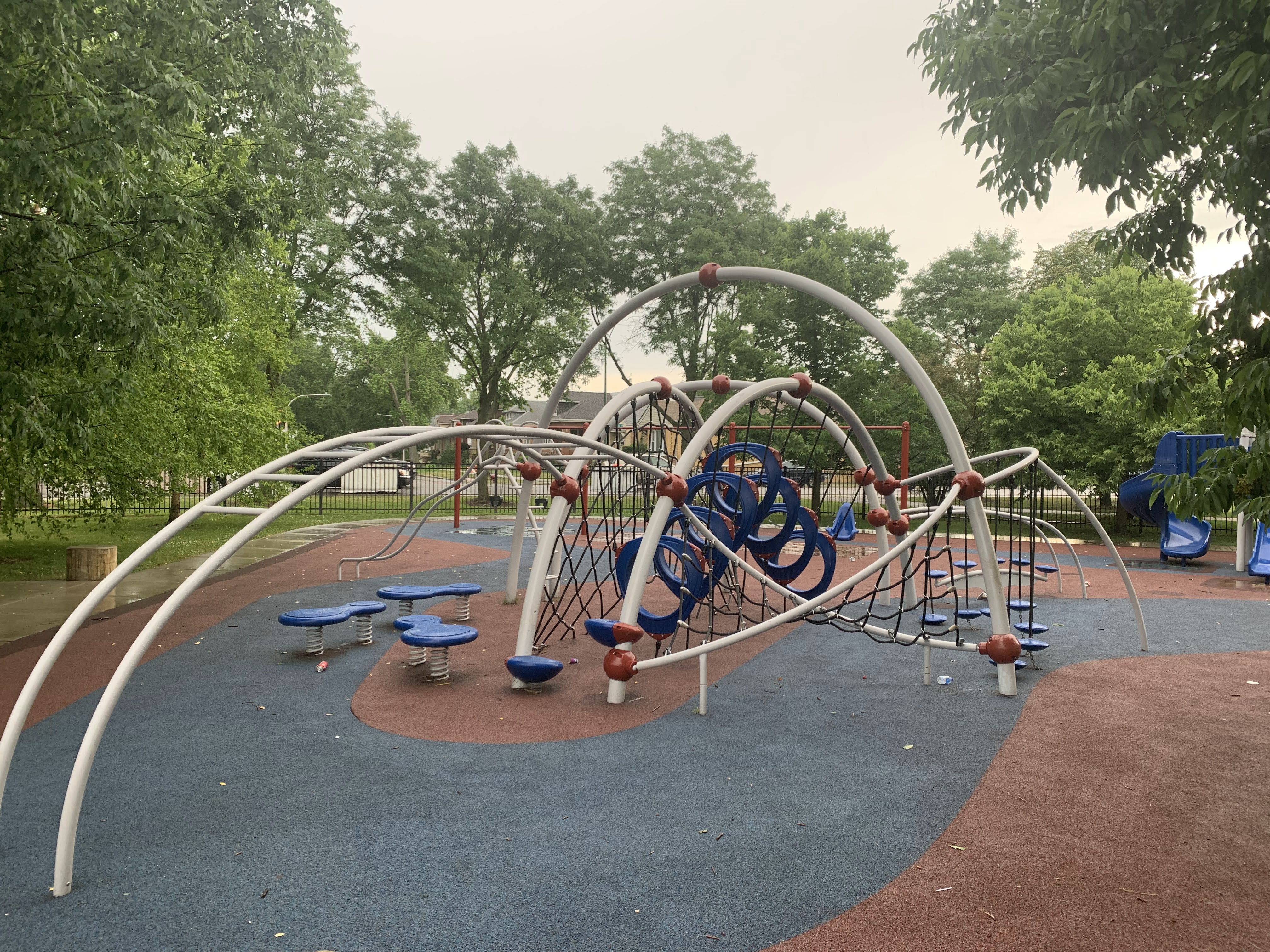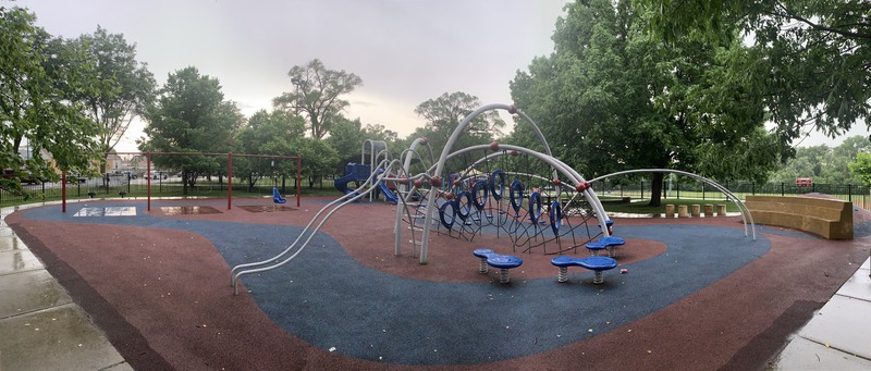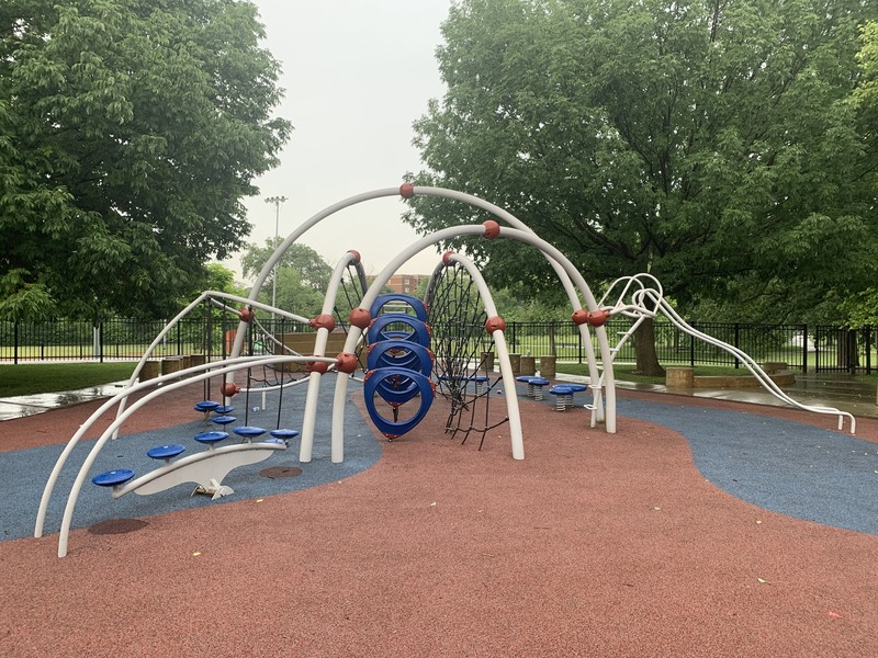 The playground at Gompers Park is located near Foster and Lowell and features some interesting play elements and a small and gentle water spray feature. There is a somewhat large play structure designed for younger children on one side of the play area and a collection of climbing/traversing elements on the other side for older children. There is a standard set of swings (toddler, adaptive, and belt seat) as well as a few standalone elements. The water spray feature features a large pole with a gentle shower spray and smaller misting loops somewhat reminiscent of the Loch Ness Monster.