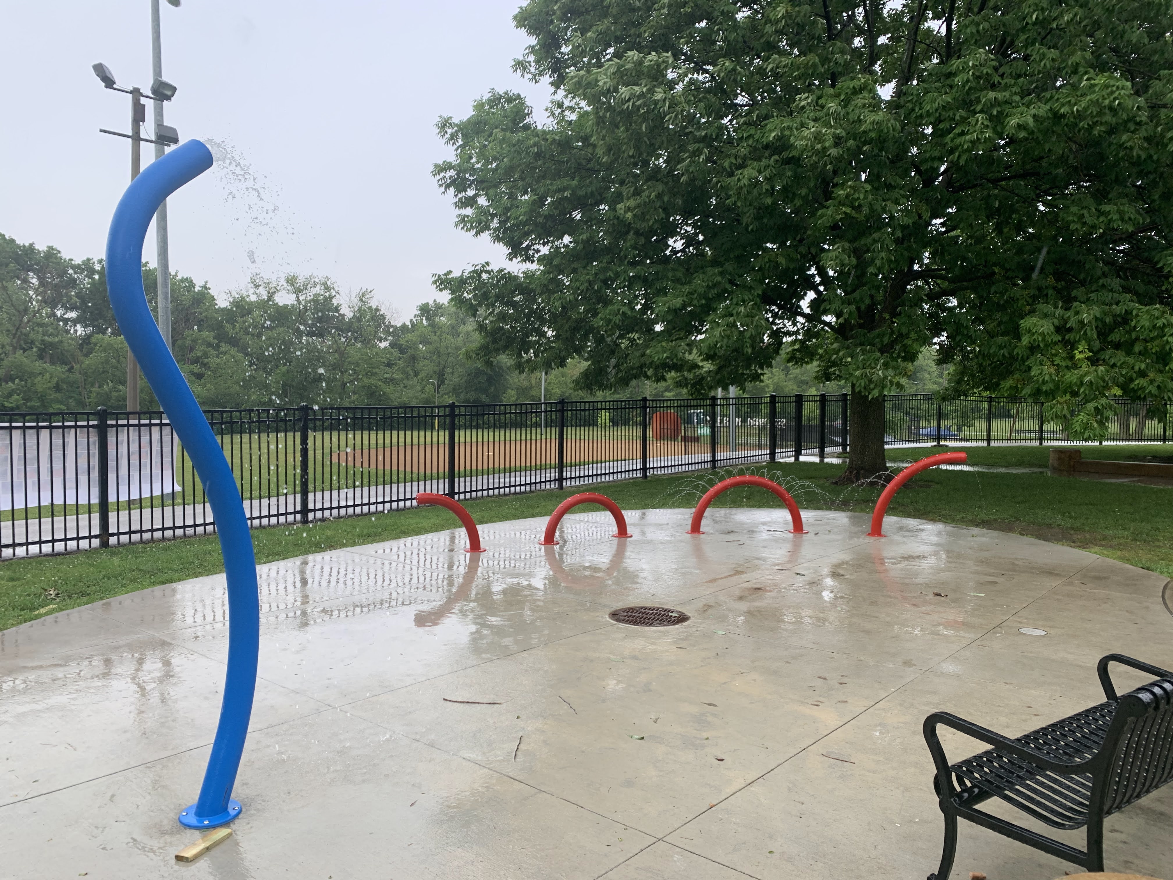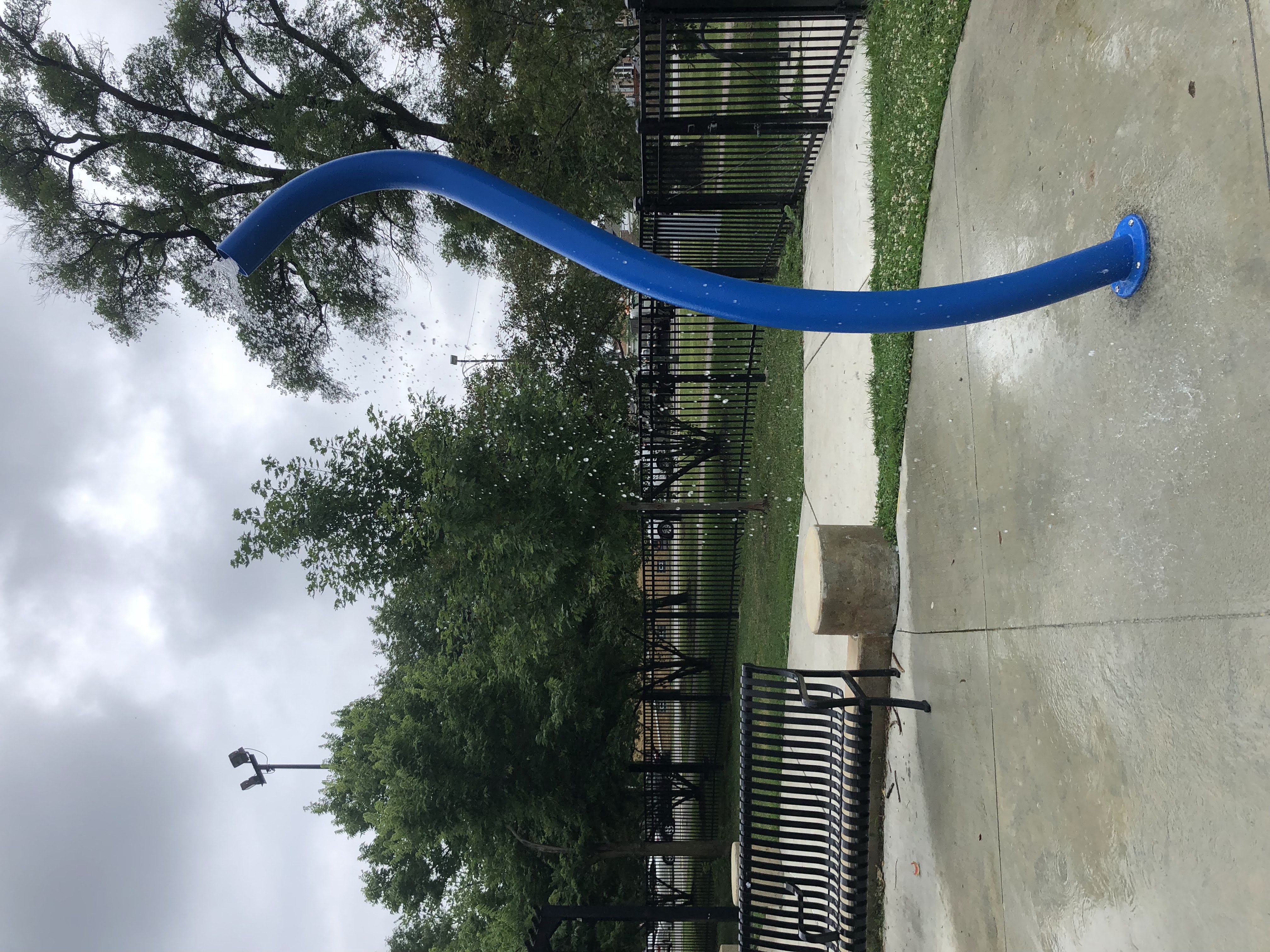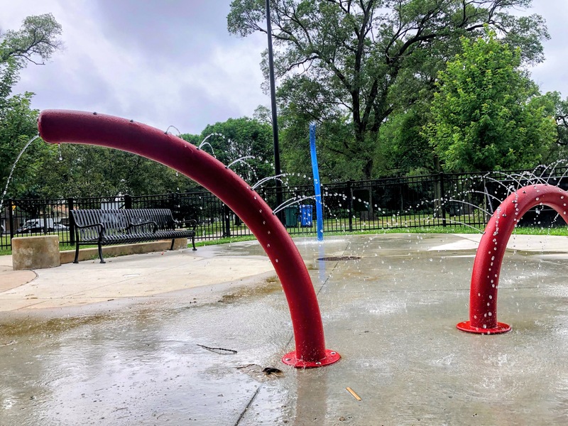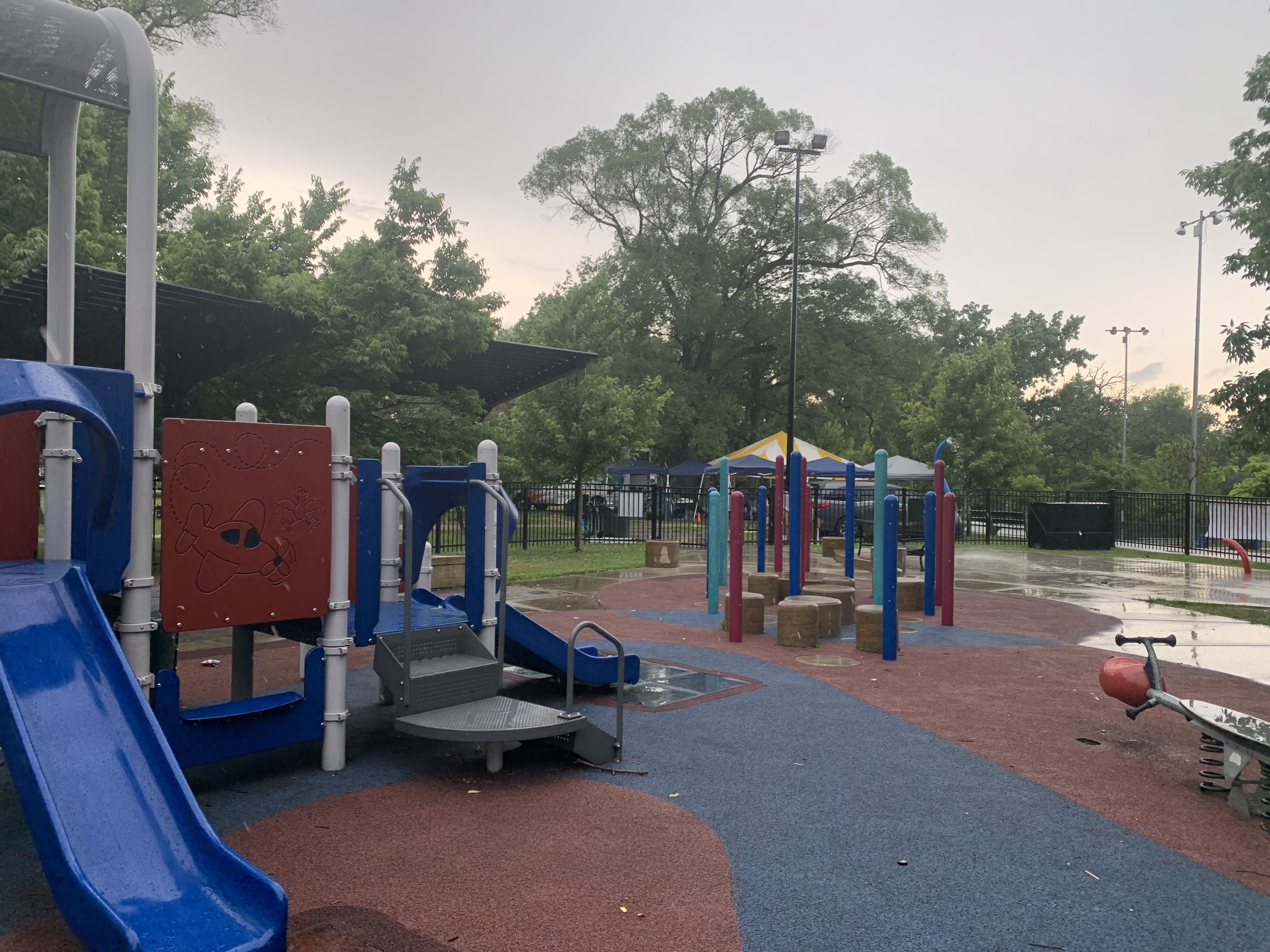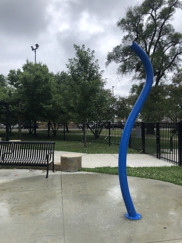 The playground at Gompers Park is located near Foster and Lowell and features some interesting play elements and a small and gentle water spray feature. There is a somewhat large play structure designed for younger children on one side of the play area and a collection of climbing/traversing elements on the other side for older children. There is a standard set of swings (toddler, adaptive, and belt seat) as well as a few standalone elements. The water spray feature features a large pole with a gentle shower spray and smaller misting loops somewhat reminiscent of the Loch Ness Monster.