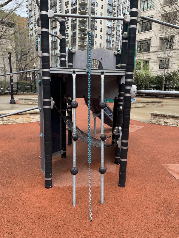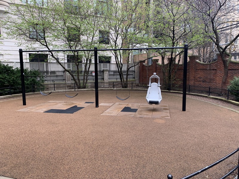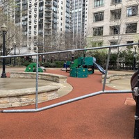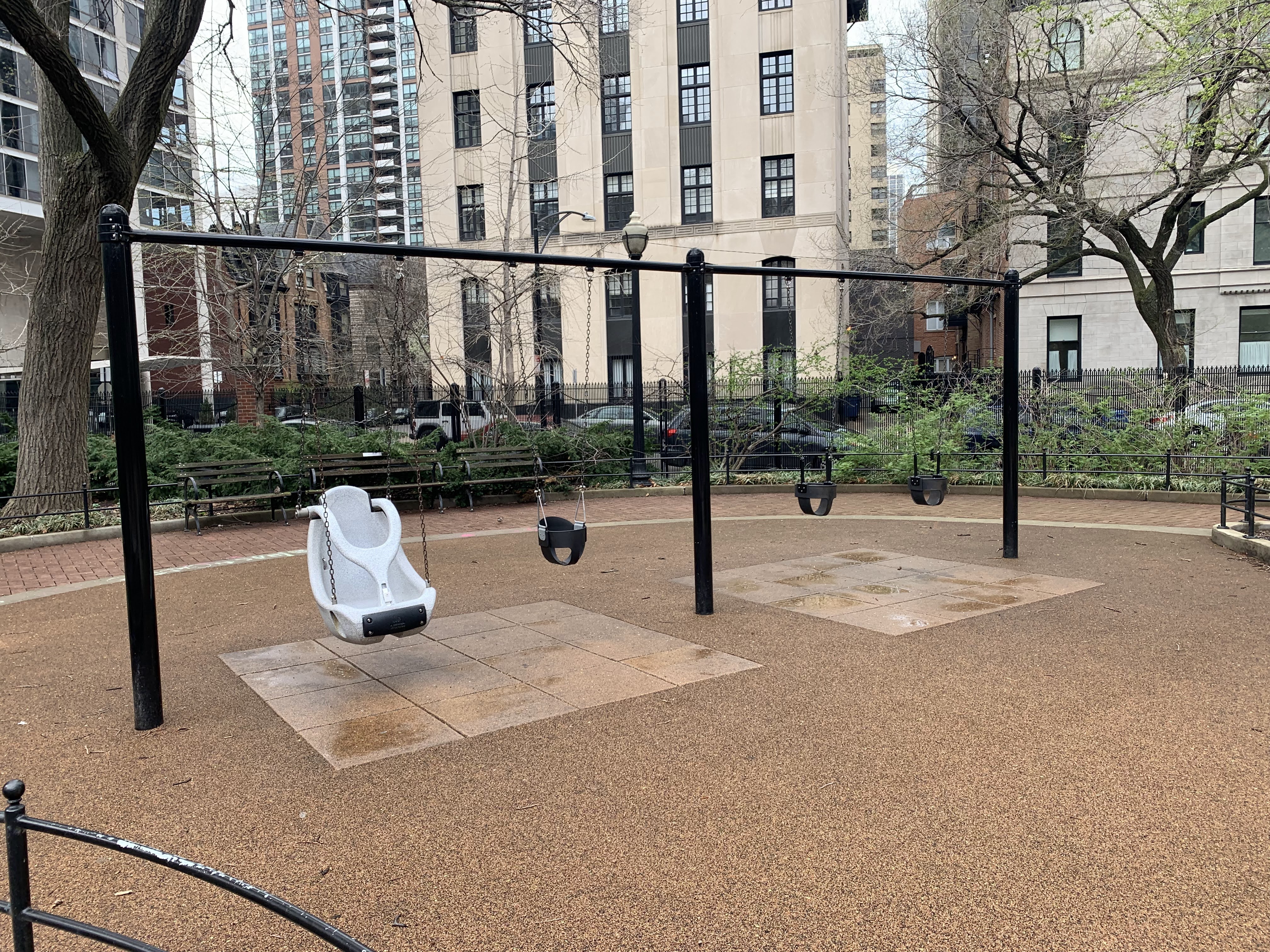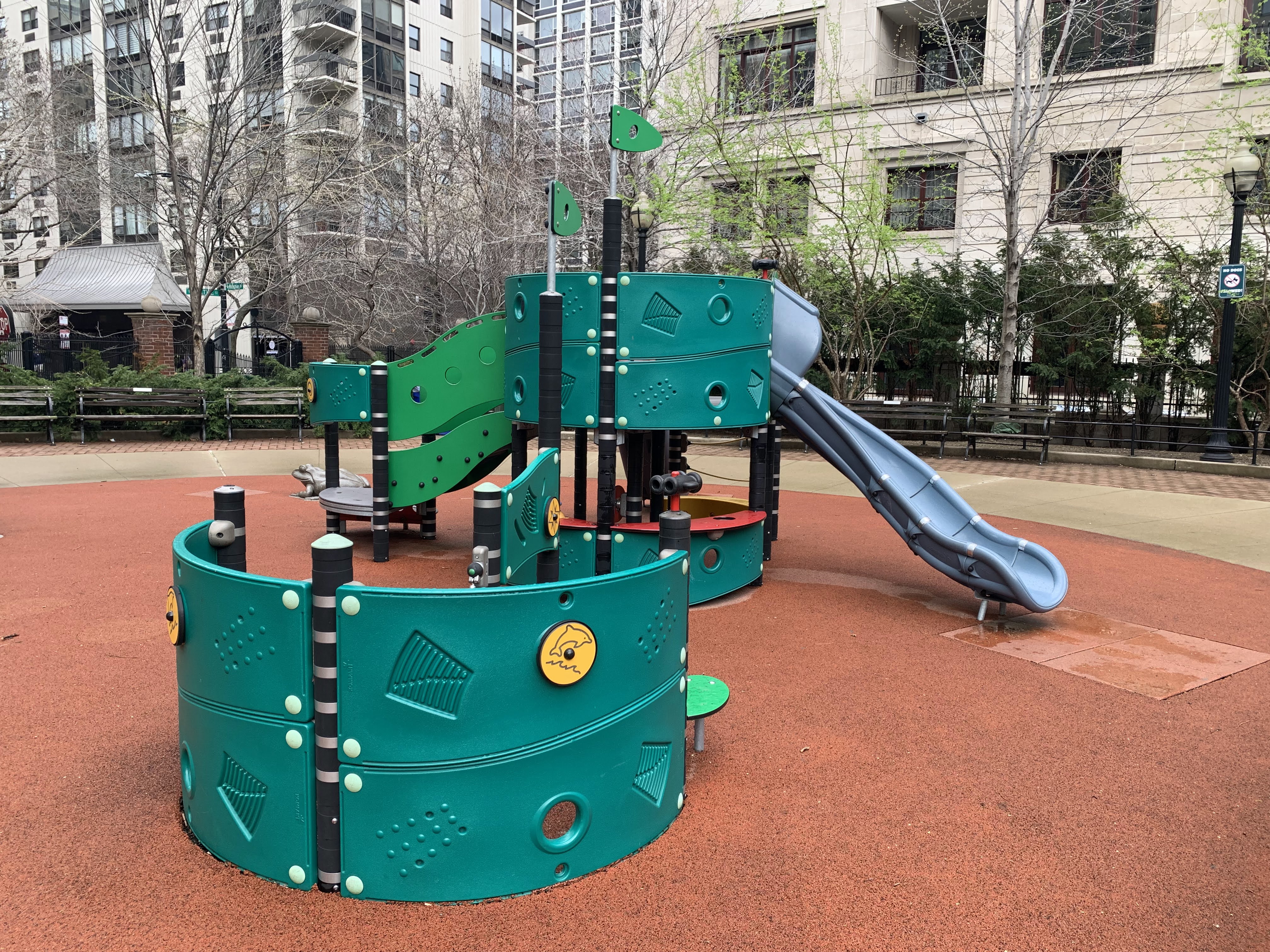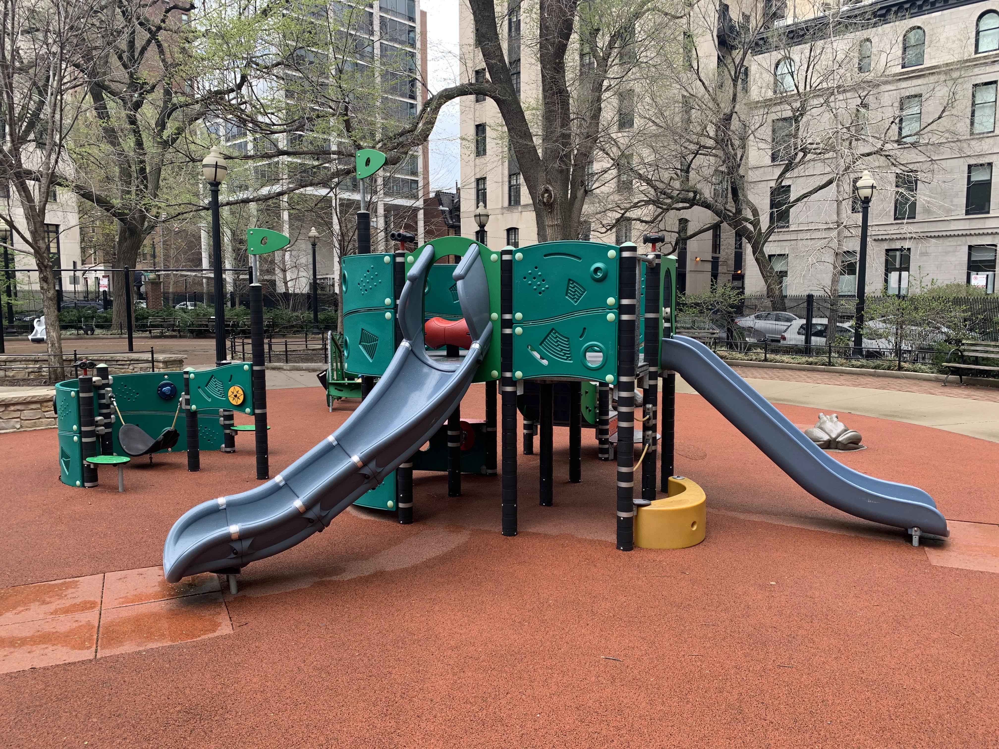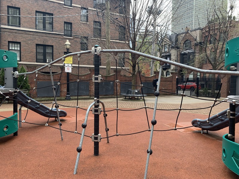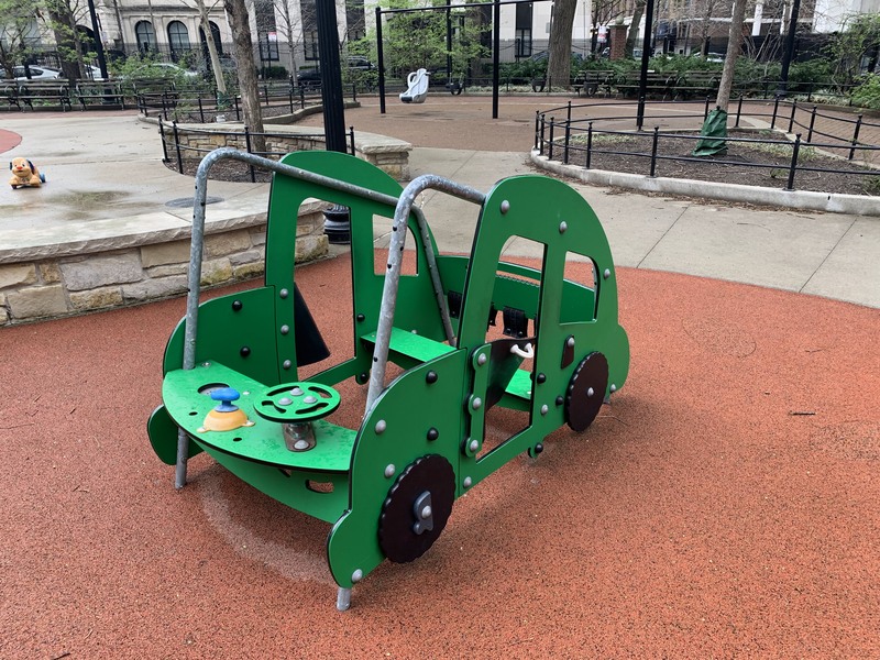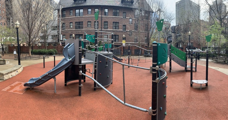 The playground at Goudy Square Park reflects it's location in Chicago's Gold Coast: luxurious. The current playground equipment was installed in 2014 and was made by the company KOMPAN; it has distinctive bold geometric patterns and large elements meant for traversing and climbing. There is a large and sprawling play structure intended for older children including a few slides, a large twisted climbing net, some monkey bars, and other elements. There is also an area dedicated to younger children with a smaller play structure and a play car. Lastly, there is the standard set of swings and a few sculpted animals scattered through the play area.