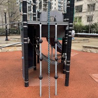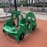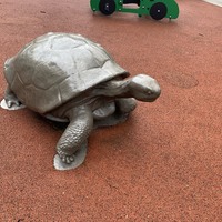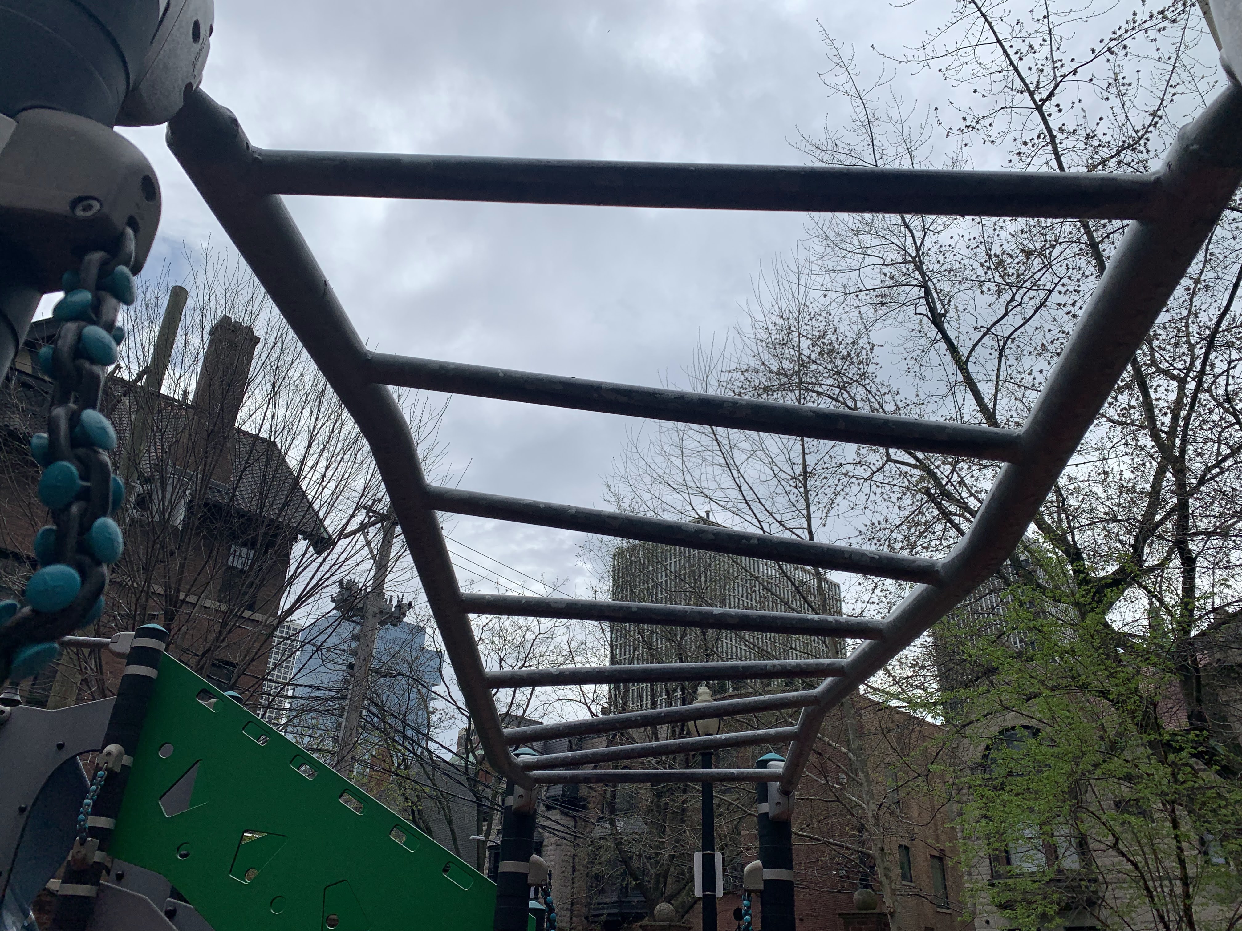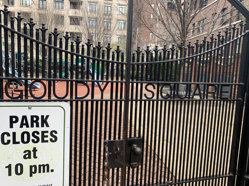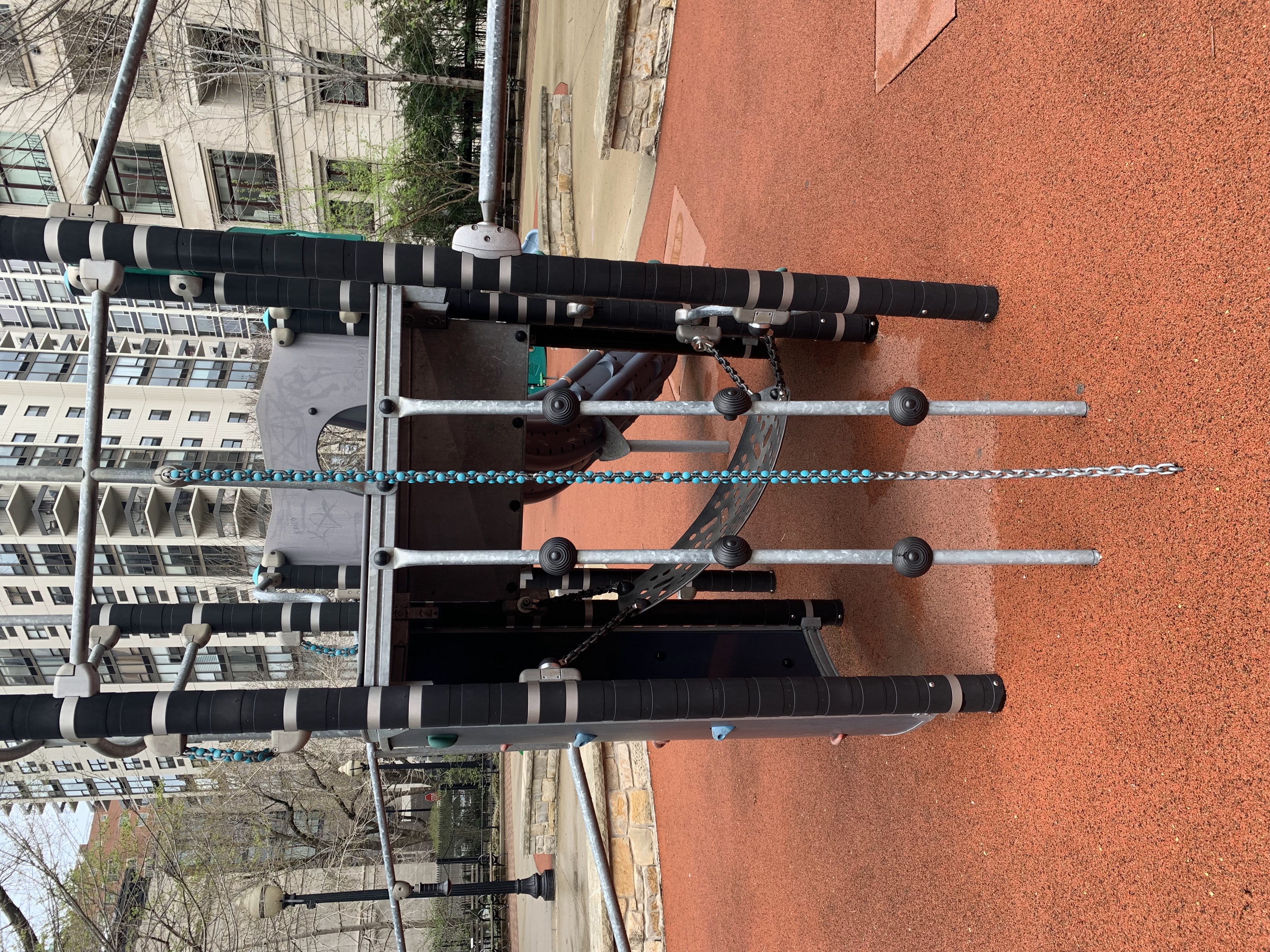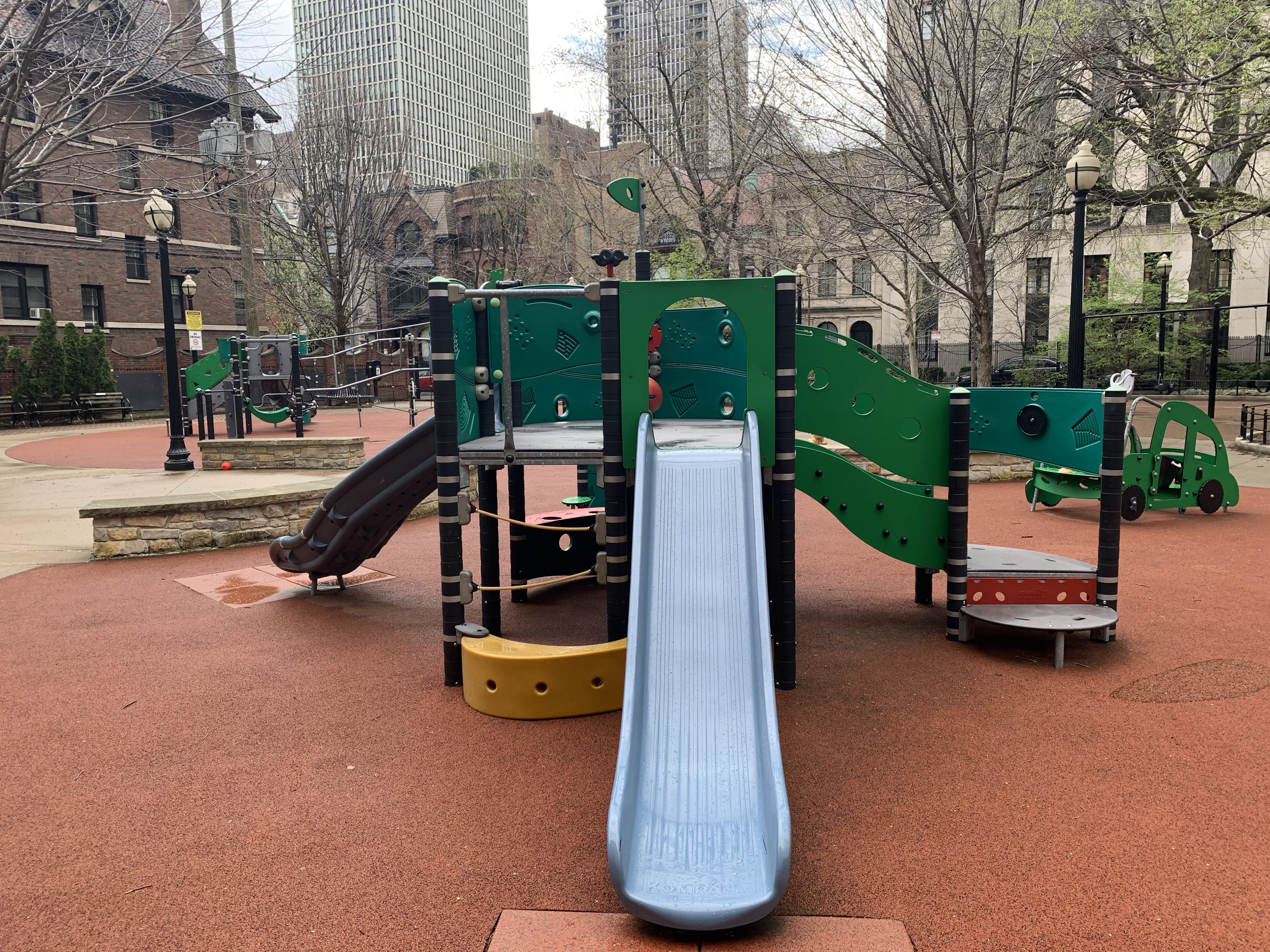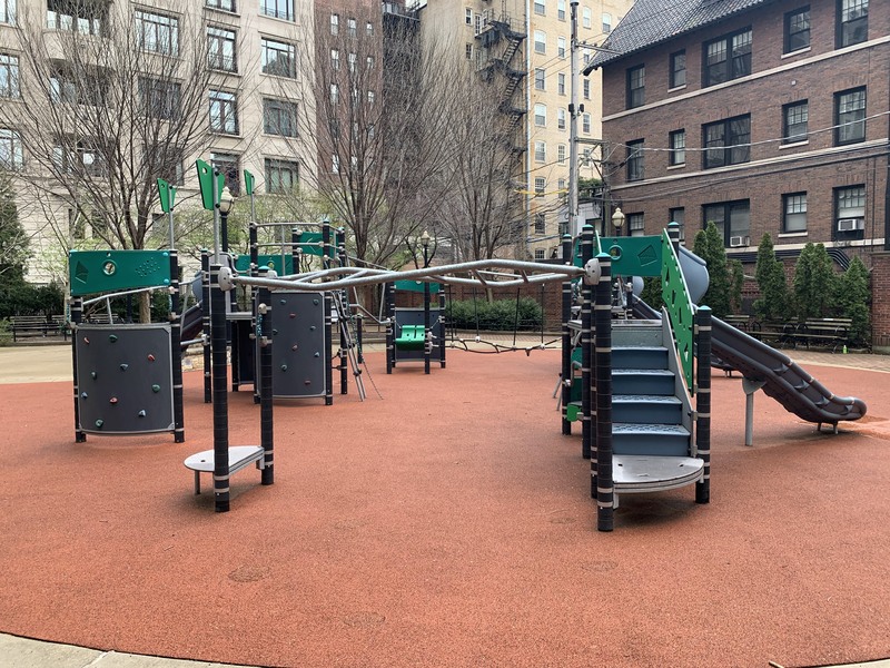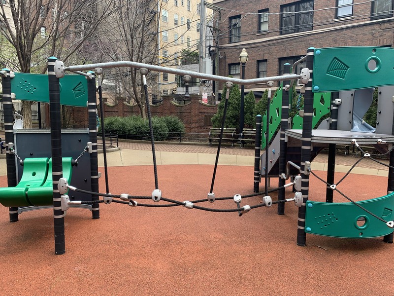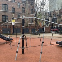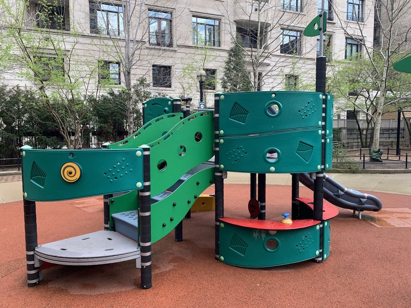 The playground at Goudy Square Park reflects it's location in Chicago's Gold Coast: luxurious. The current playground equipment was installed in 2014 and was made by the company KOMPAN; it has distinctive bold geometric patterns and large elements meant for traversing and climbing. There is a large and sprawling play structure intended for older children including a few slides, a large twisted climbing net, some monkey bars, and other elements. There is also an area dedicated to younger children with a smaller play structure and a play car. Lastly, there is the standard set of swings and a few sculpted animals scattered through the play area.