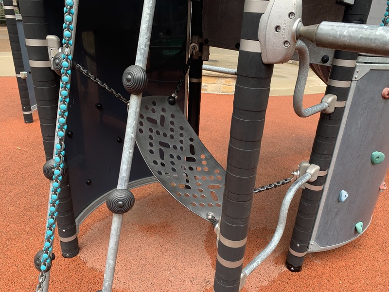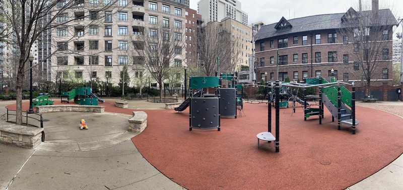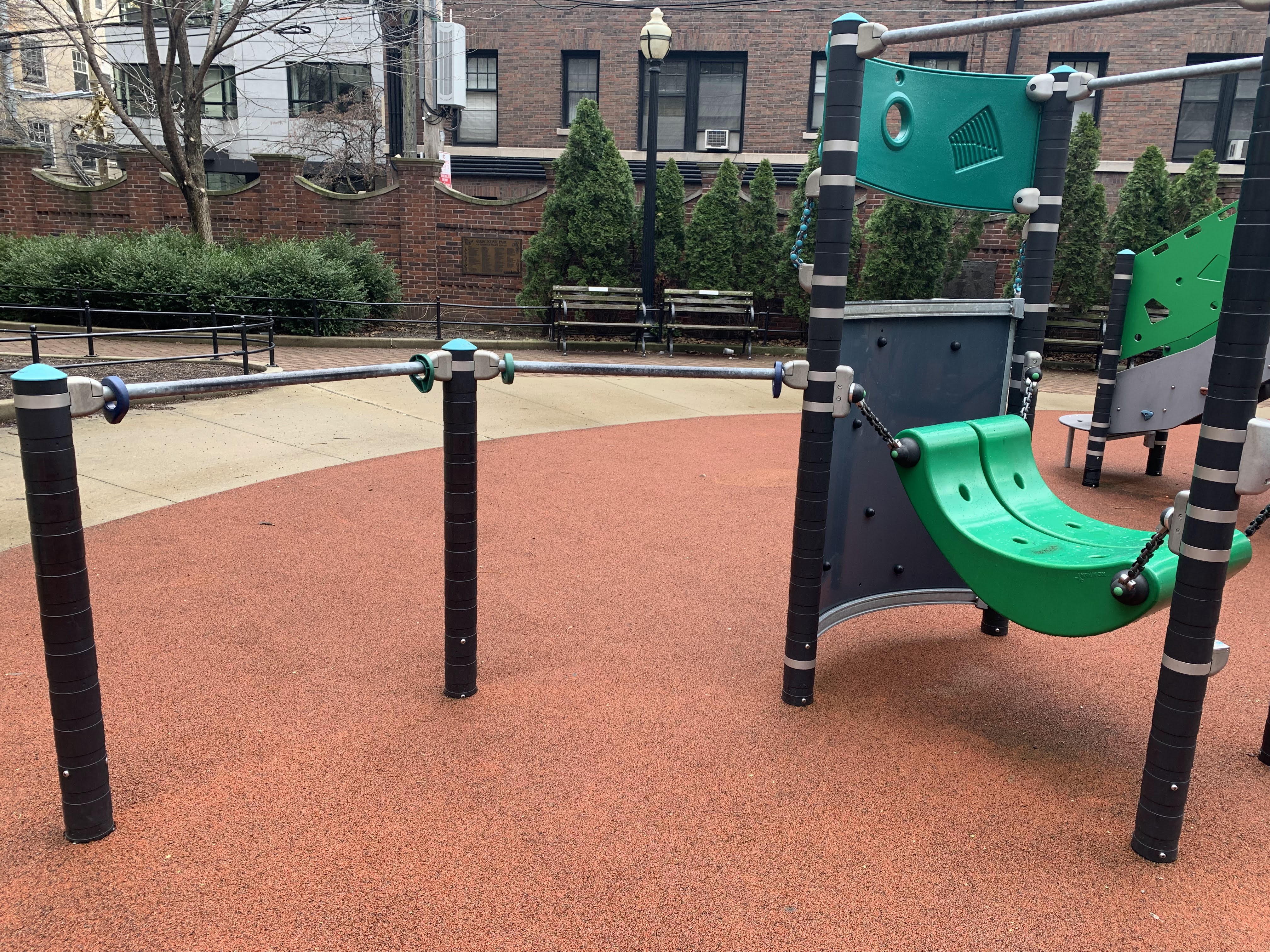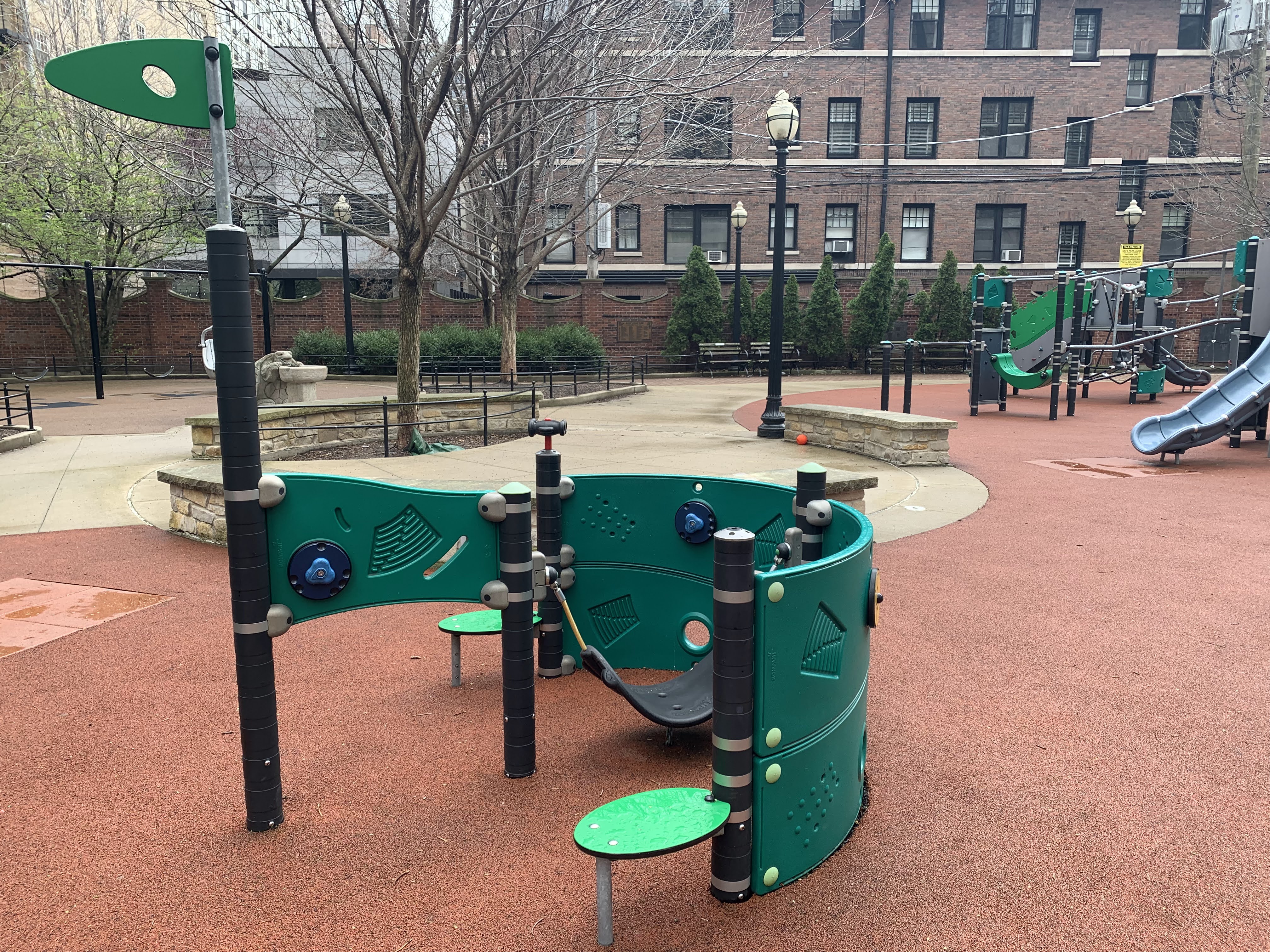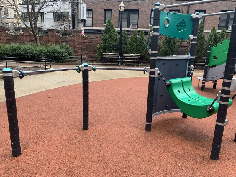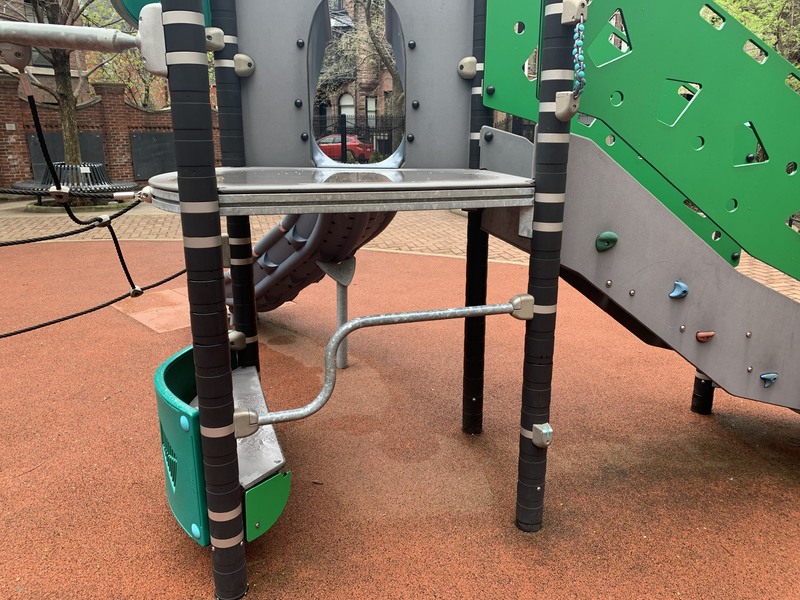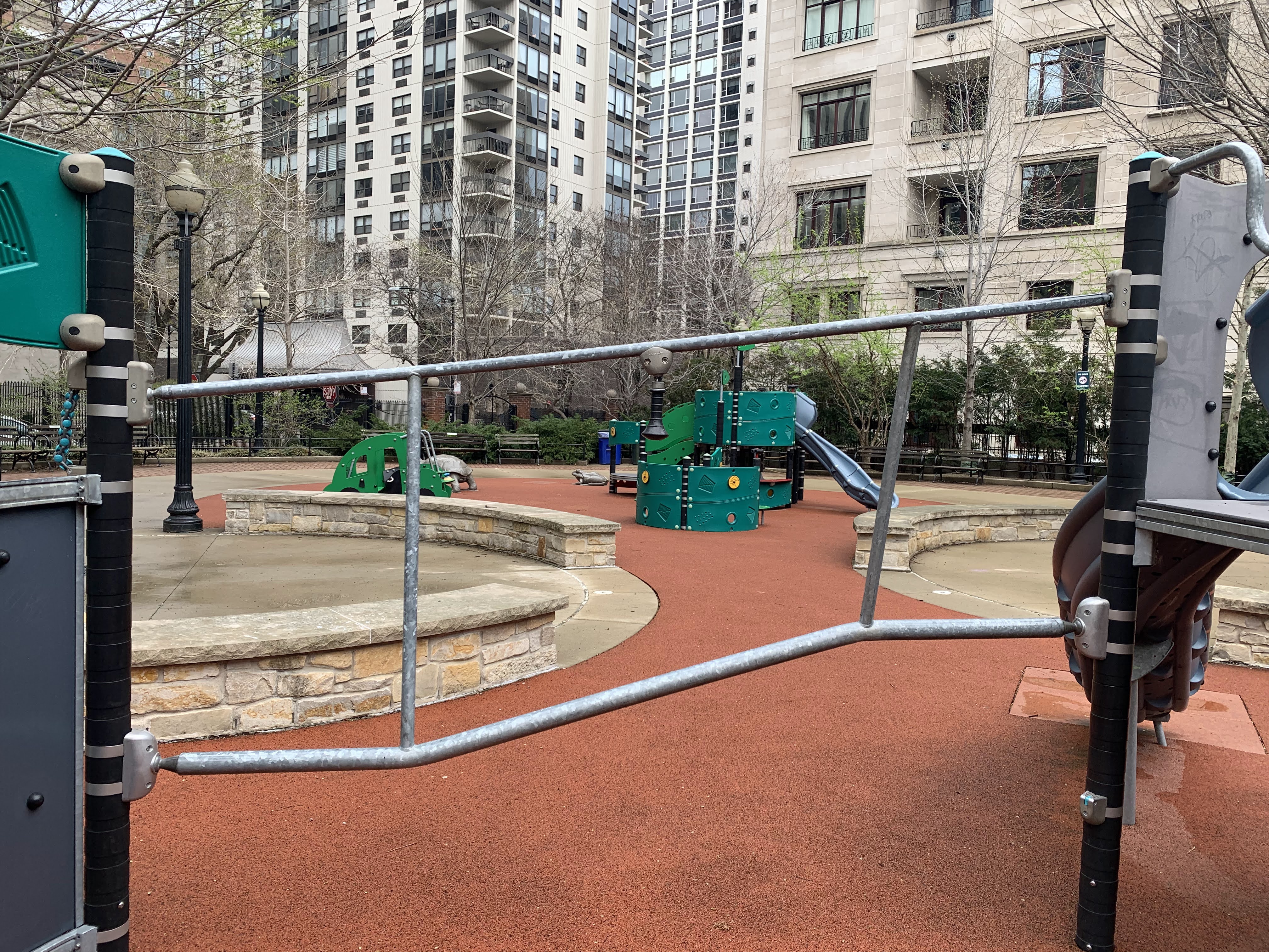 The other features of this park include, according to the Park District website, "ornamental metal fencing, period light fixtures, brick paths, and a limestone and bronze drinking fountain with a turtle, frog and fish produced by Walter Arnold" - luxurious indeed. The play surface is mostly soft rubber with some low walls and plantings around the perimeter. The play area is fully enclosed and somewhat shaded by large trees and there are lots of benches throughout the playground. - Playground Features