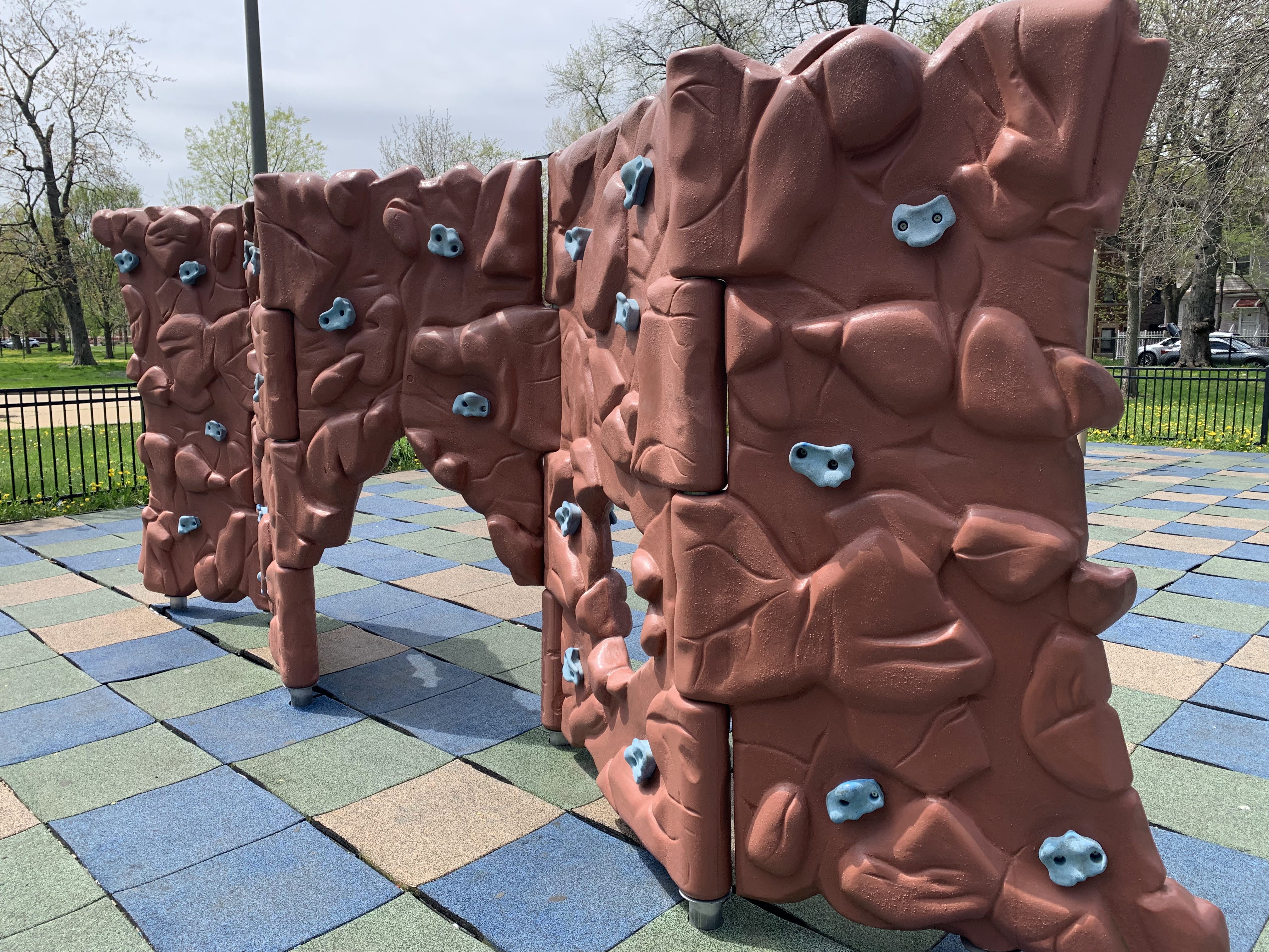 - Located on the west side of Grand Crossing Park (just west of the fieldhouse) is the playground. Fully enclosed and with a surface of soft rubber, this playground features two play structures and the standard varieties of swings. The play structures aren't remarkable but are solid structures with slides and climbing elements. The larger structure is somewhat accessible by a ramp and the entrance to the playground is barrier-free for those in strollers or using wheelchairs. There is also a small freestanding climbing wall in the play area. There are a few benches and trees in the area providing seating and shade and there is a drinking fountain and access to the field house for other amenities. There is also a simple single pole water sprayer just to the south of the playground.