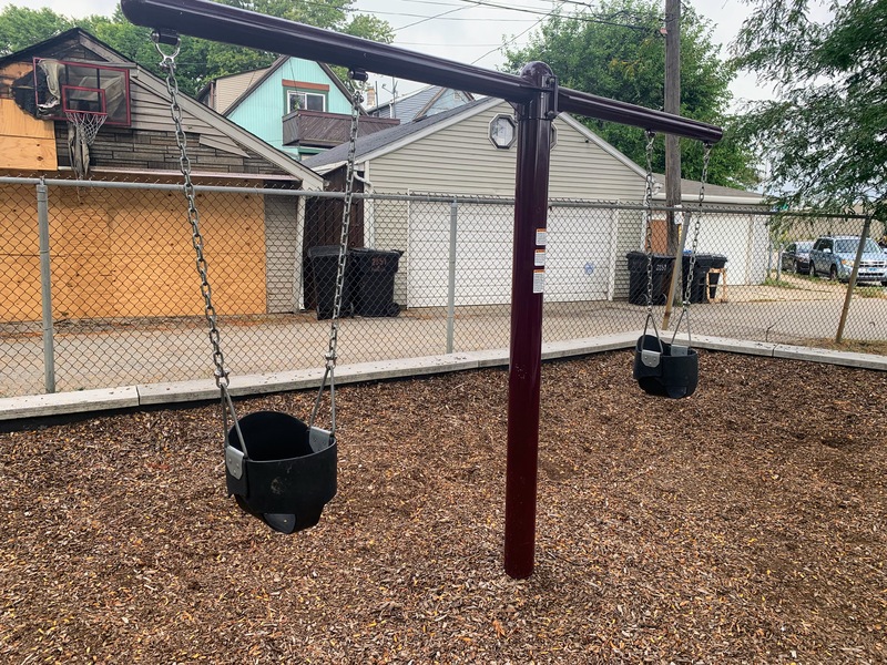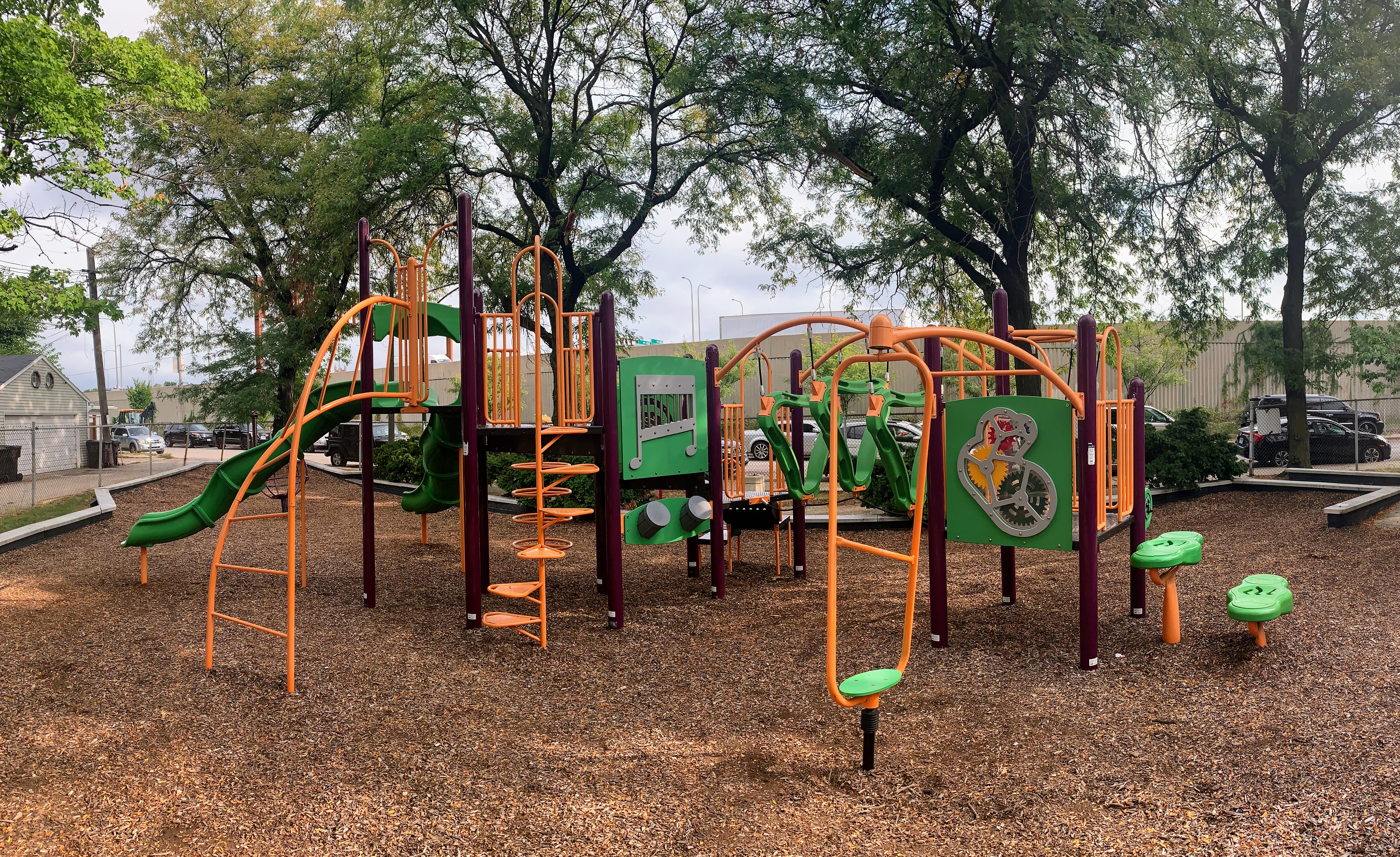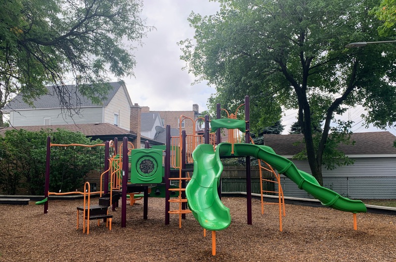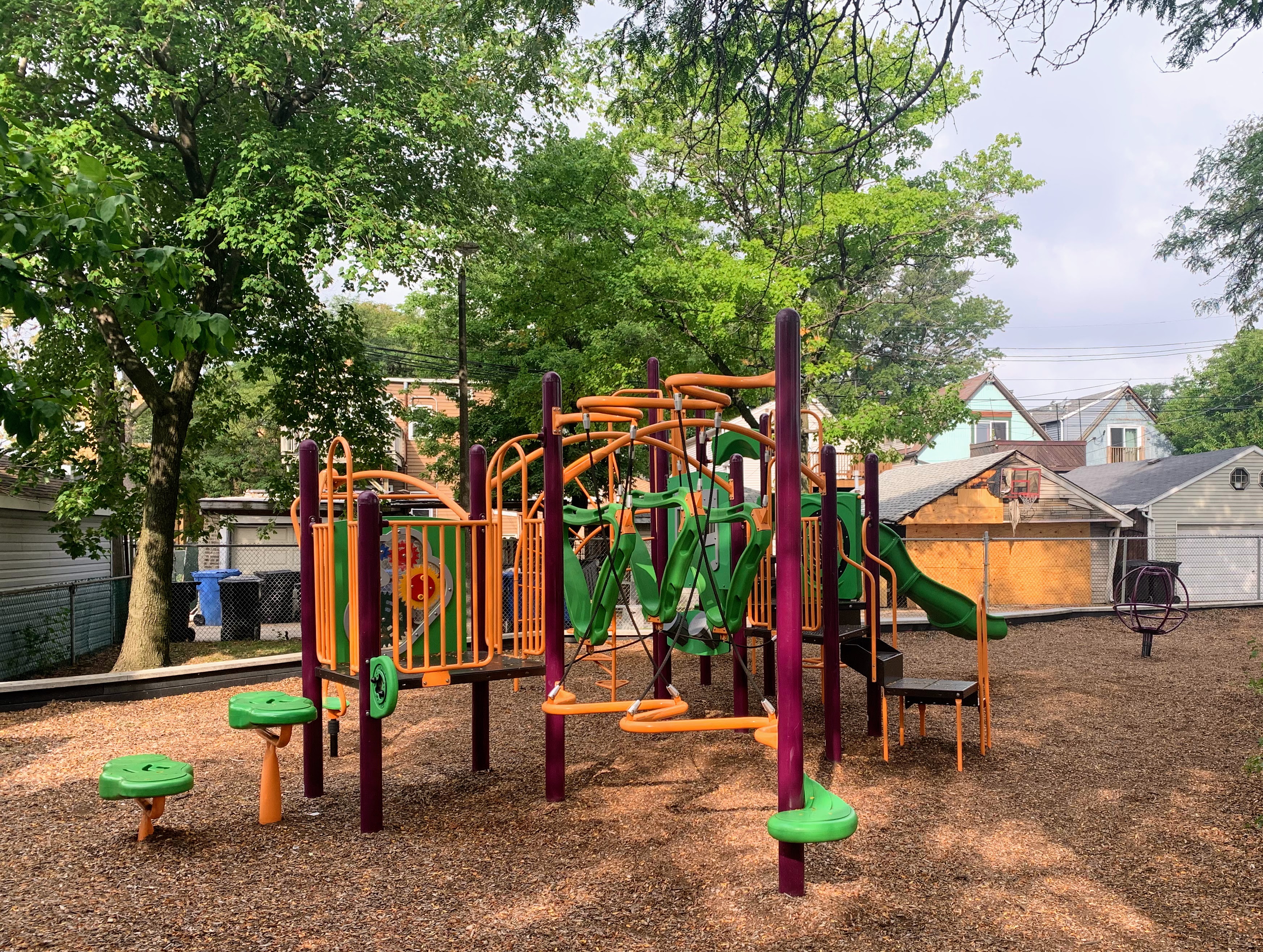 - Grape Park was created in the 1970s on land leftover from the nearby Kennedy Expressway and features a small playground last rebuilt in 2015. The small, triangular site features a moderately sized play structure with a variety of climbing elements and slides as well as a set of toddler swings. This playground has a classic vibe - wood chip surface with a few benches - with an abundance of shade from the trees doting the site. The play area is fenced from the street but not fully enclosed.