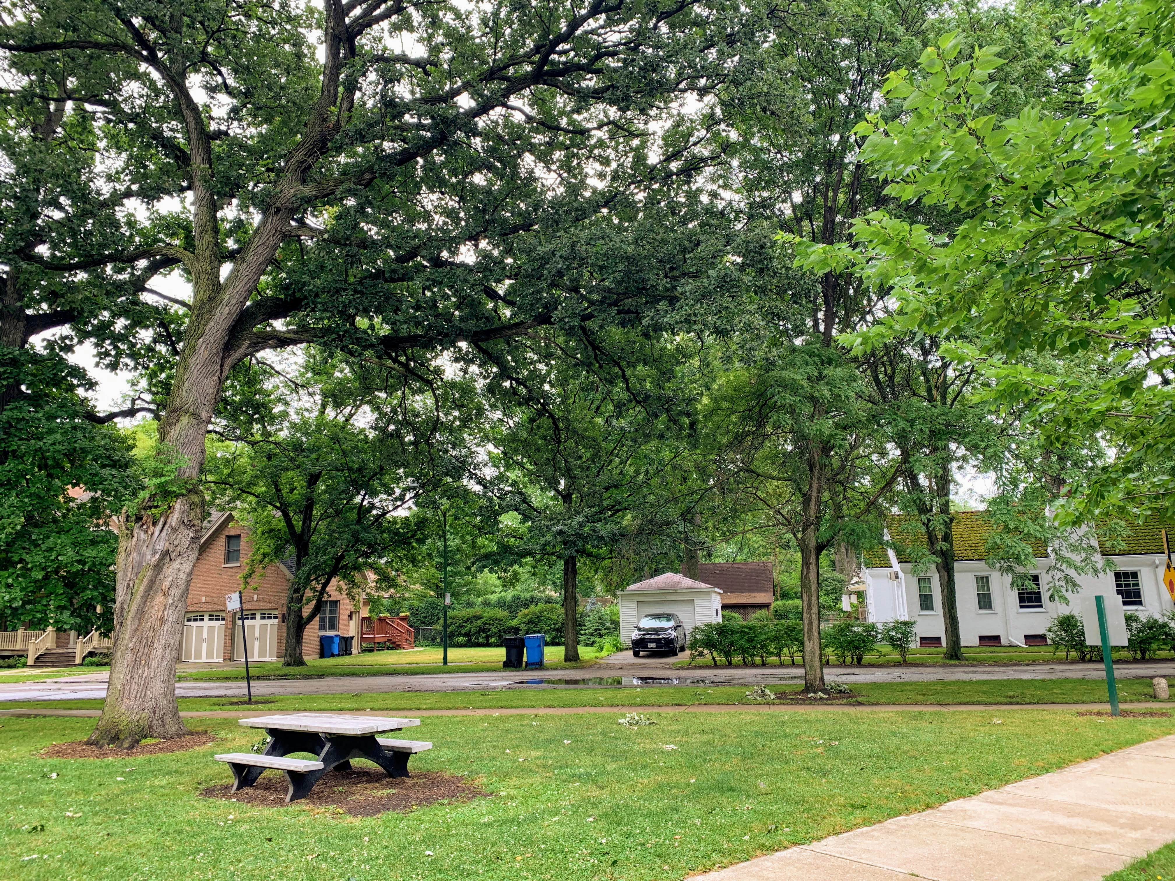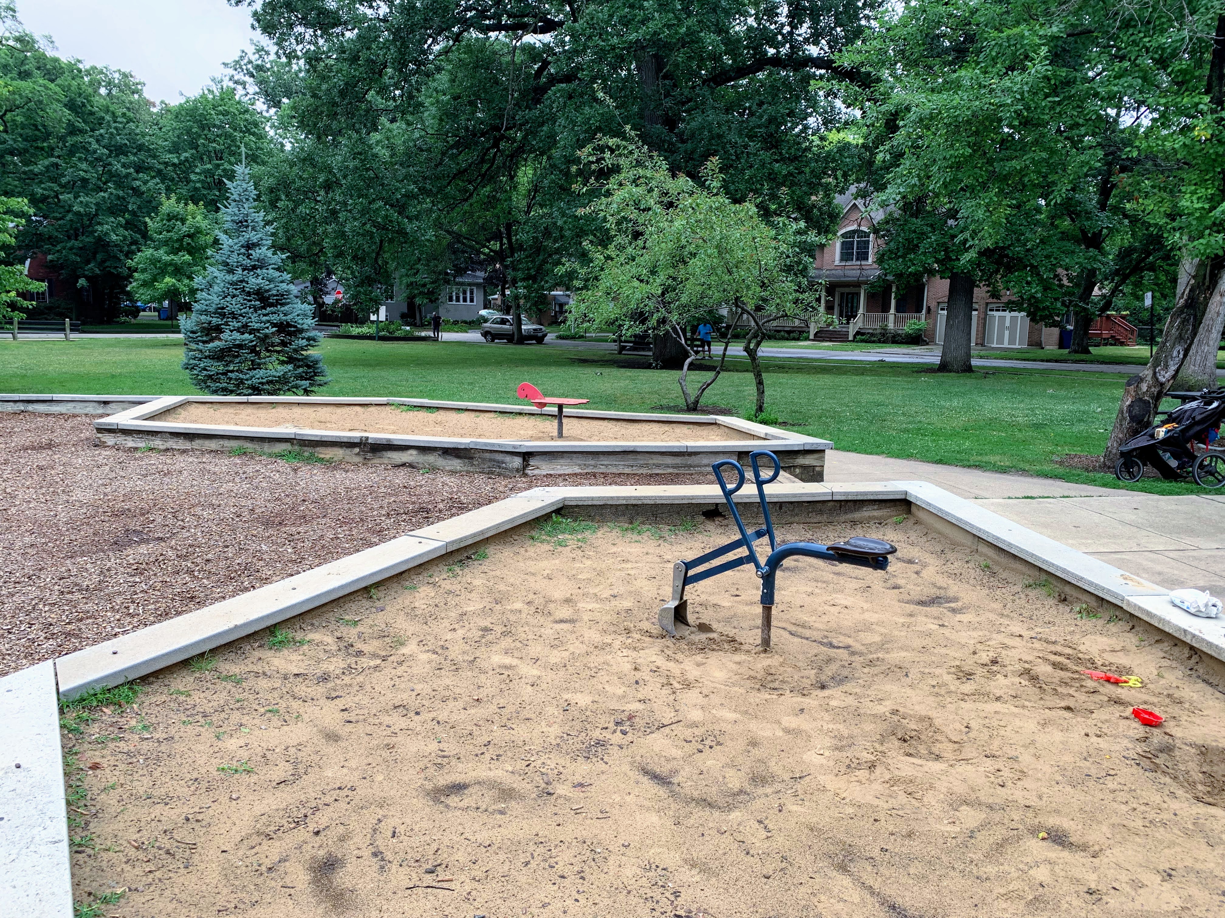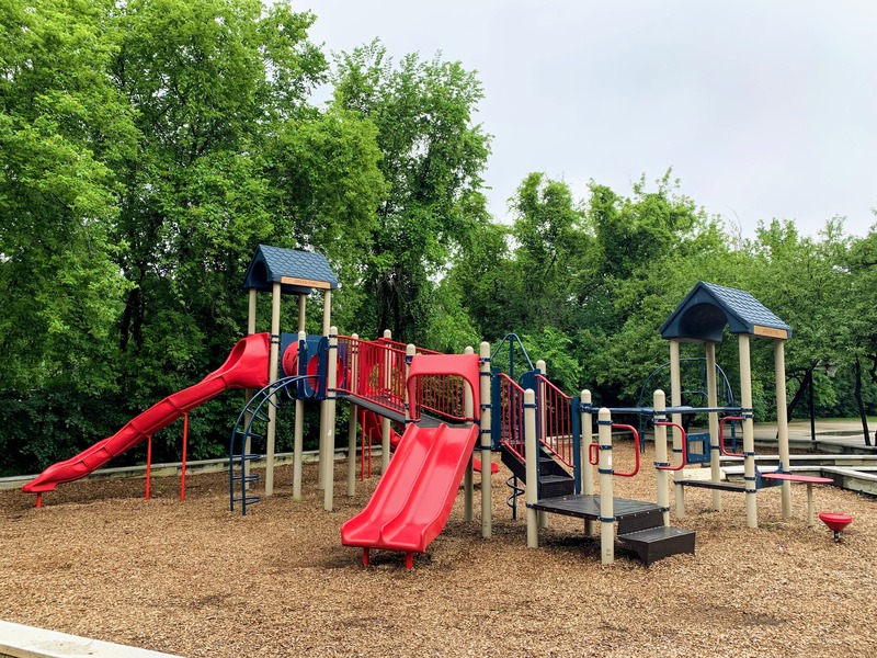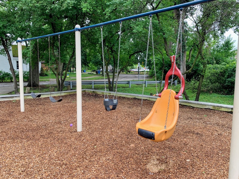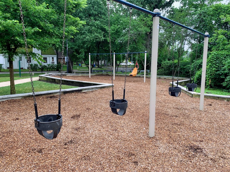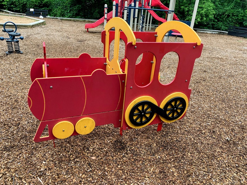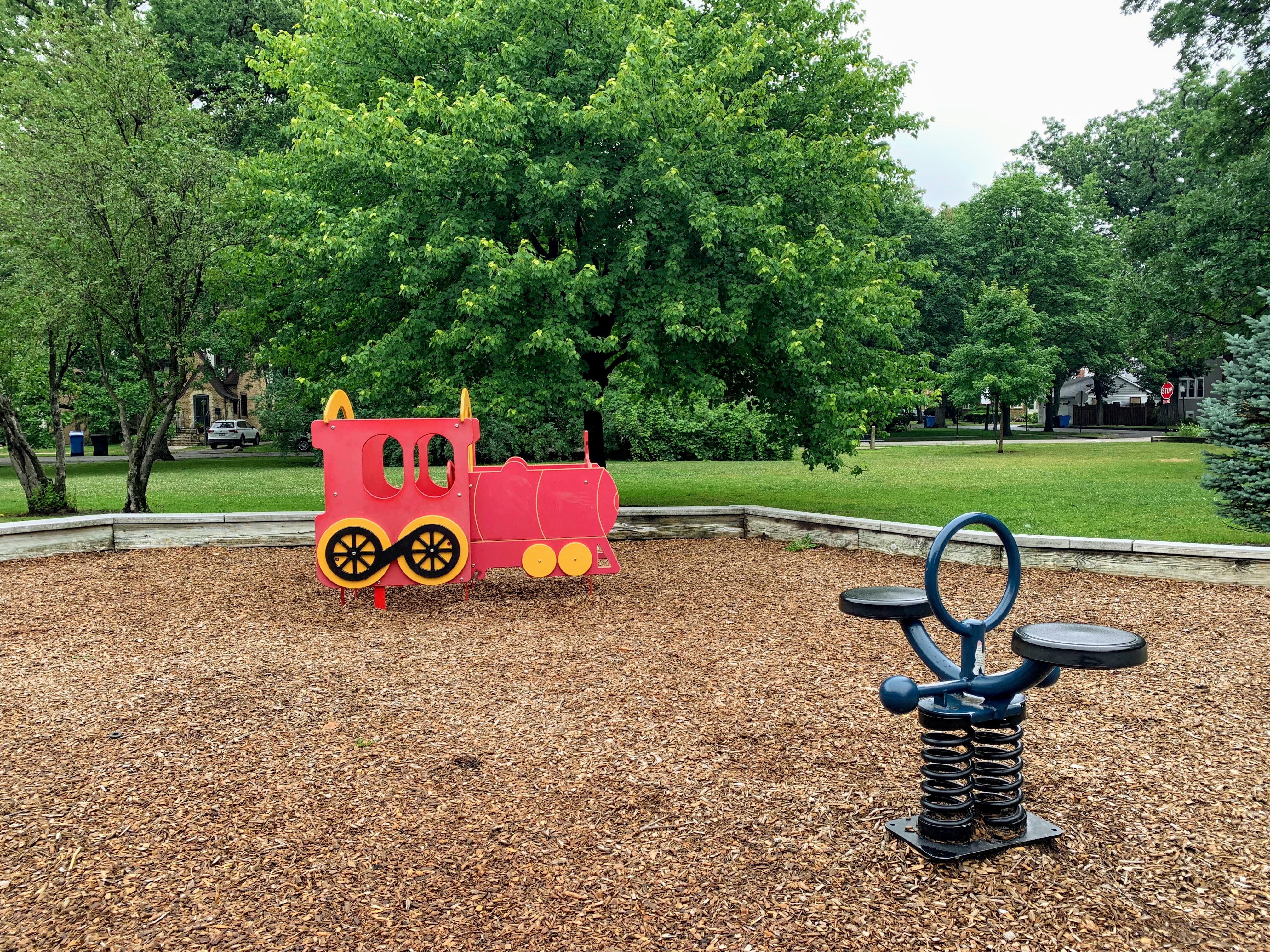 Situated on quiet residential streets, this playground is not enclosed or fenced from the street (though it is fenced from the nearby train tracks) and opens directly into a small grassy area with large mature trees. The play surface is wood chips (except in the sand boxes, obviously!). There are a few benches and a picnic tables for seating in this shady park. It is also next to a set of train tracks which makes it great for kids who like trains.