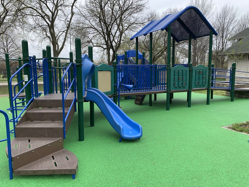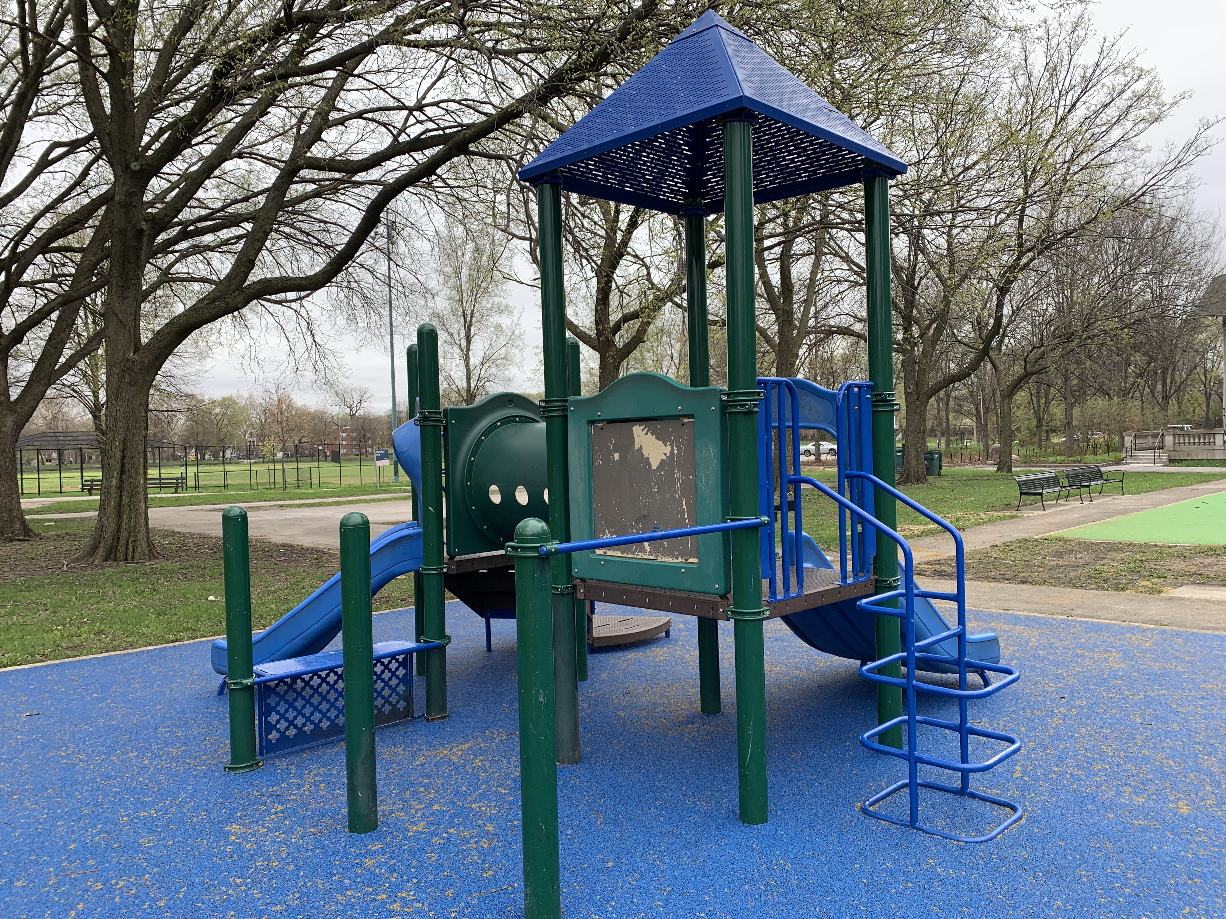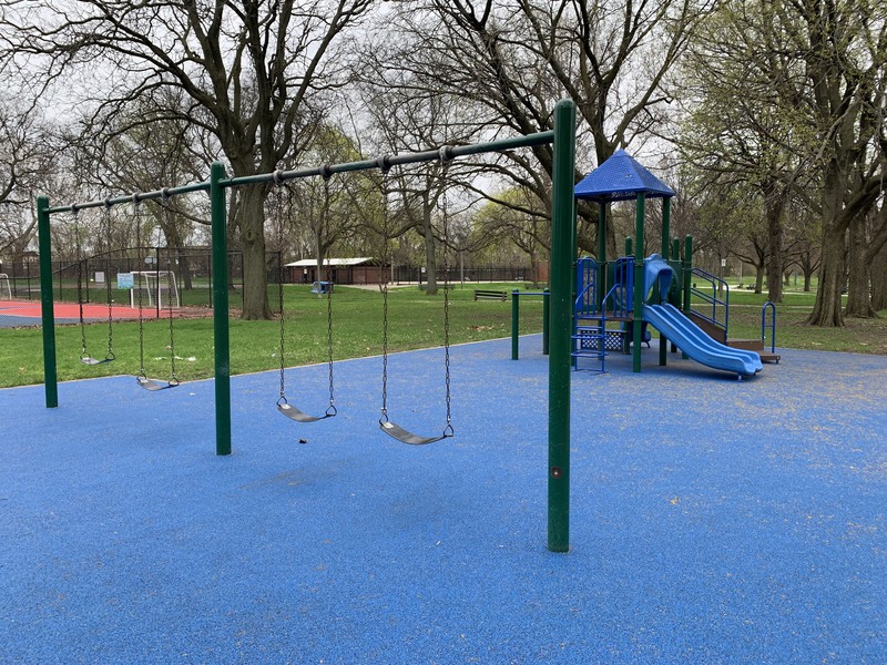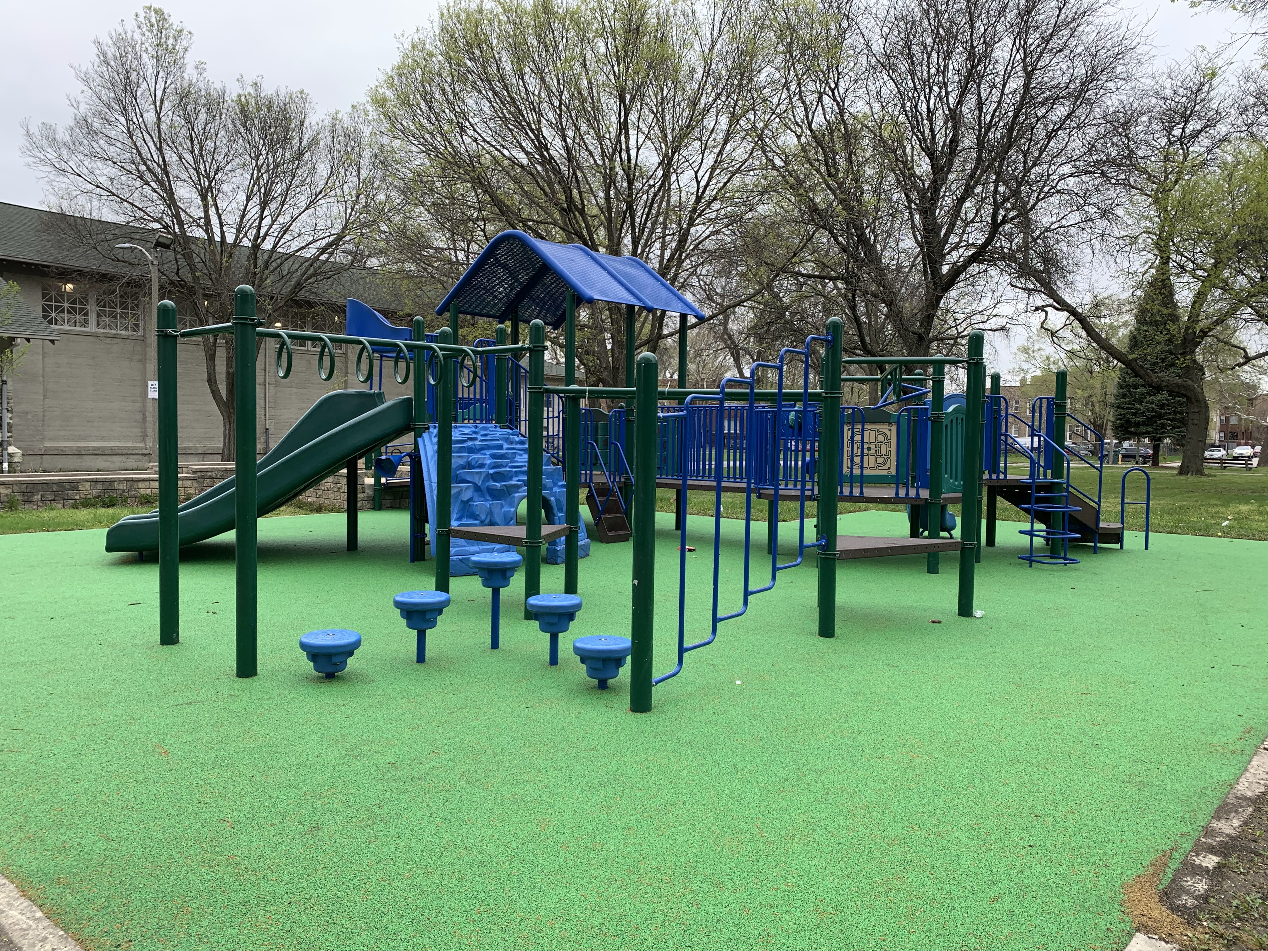 - The playground at Hamilton Park is located on the northside of the park and features two play structures. The larger structure is designed for older children and features a series of ramps, slides, and other climbing elements. The smaller structure is nearby and is designed for younger children. There is also the standard set of swings and a water spray feature. The play surface is soft rubber and there are a few benches and a drinking fountain in the area. Large trees just to the south provide some shade throughout the day.