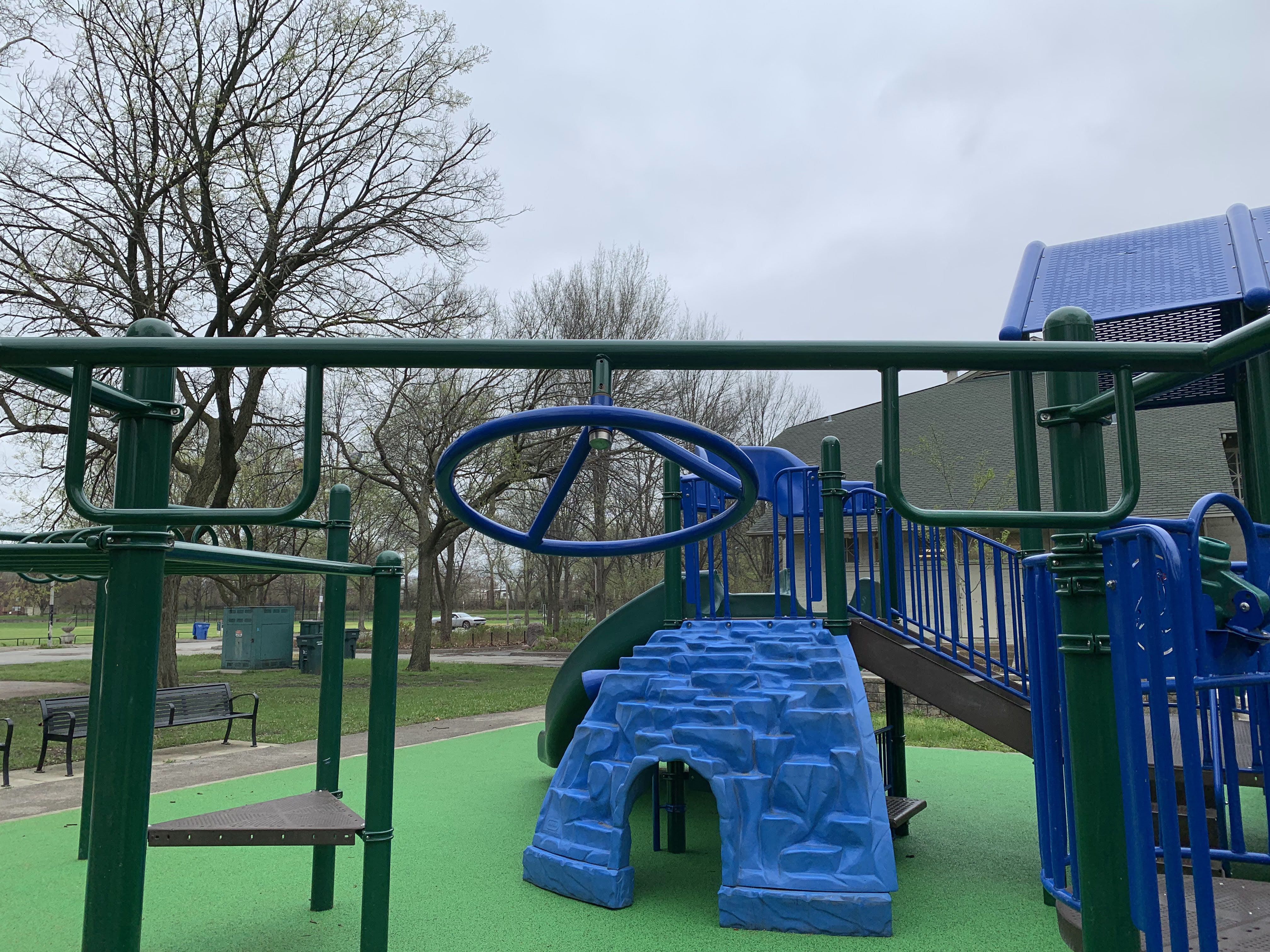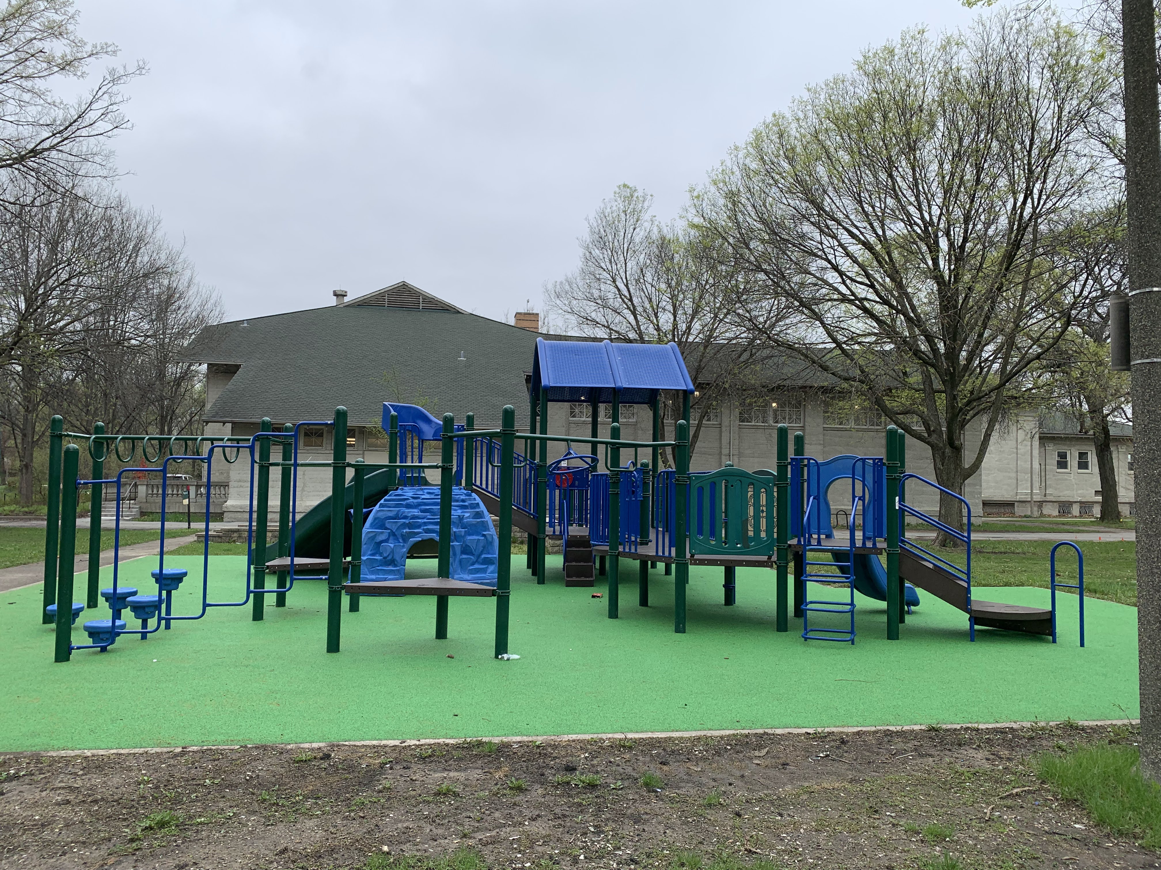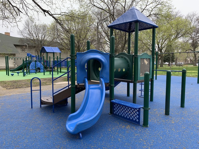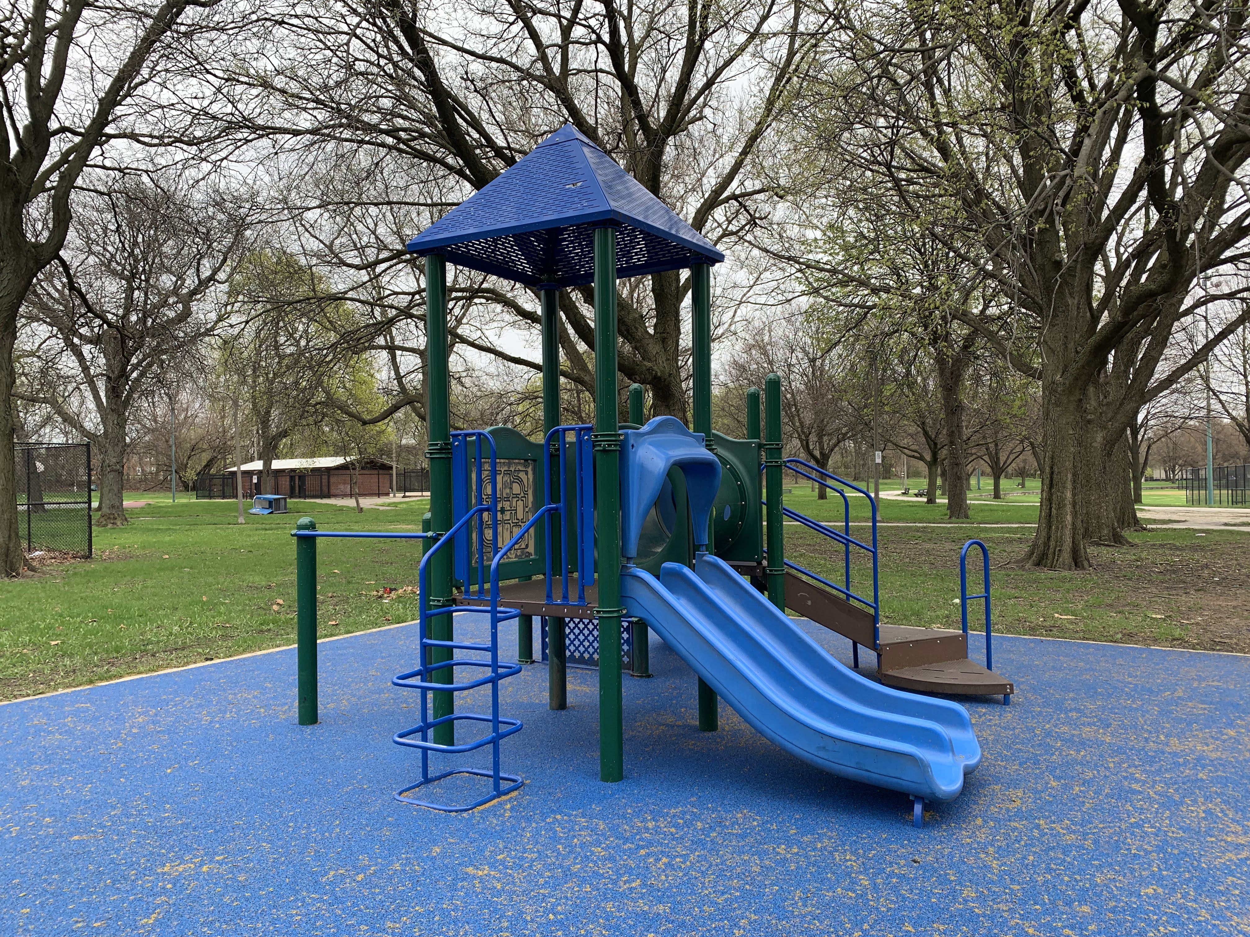 - The playground at Hamilton Park is located on the northside of the park and features two play structures. The larger structure is designed for older children and features a series of ramps, slides, and other climbing elements. The smaller structure is nearby and is designed for younger children. There is also the standard set of swings and a water spray feature. The play surface is soft rubber and there are a few benches and a drinking fountain in the area. Large trees just to the south provide some shade throughout the day.