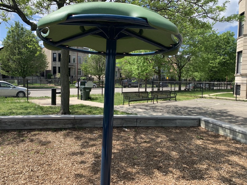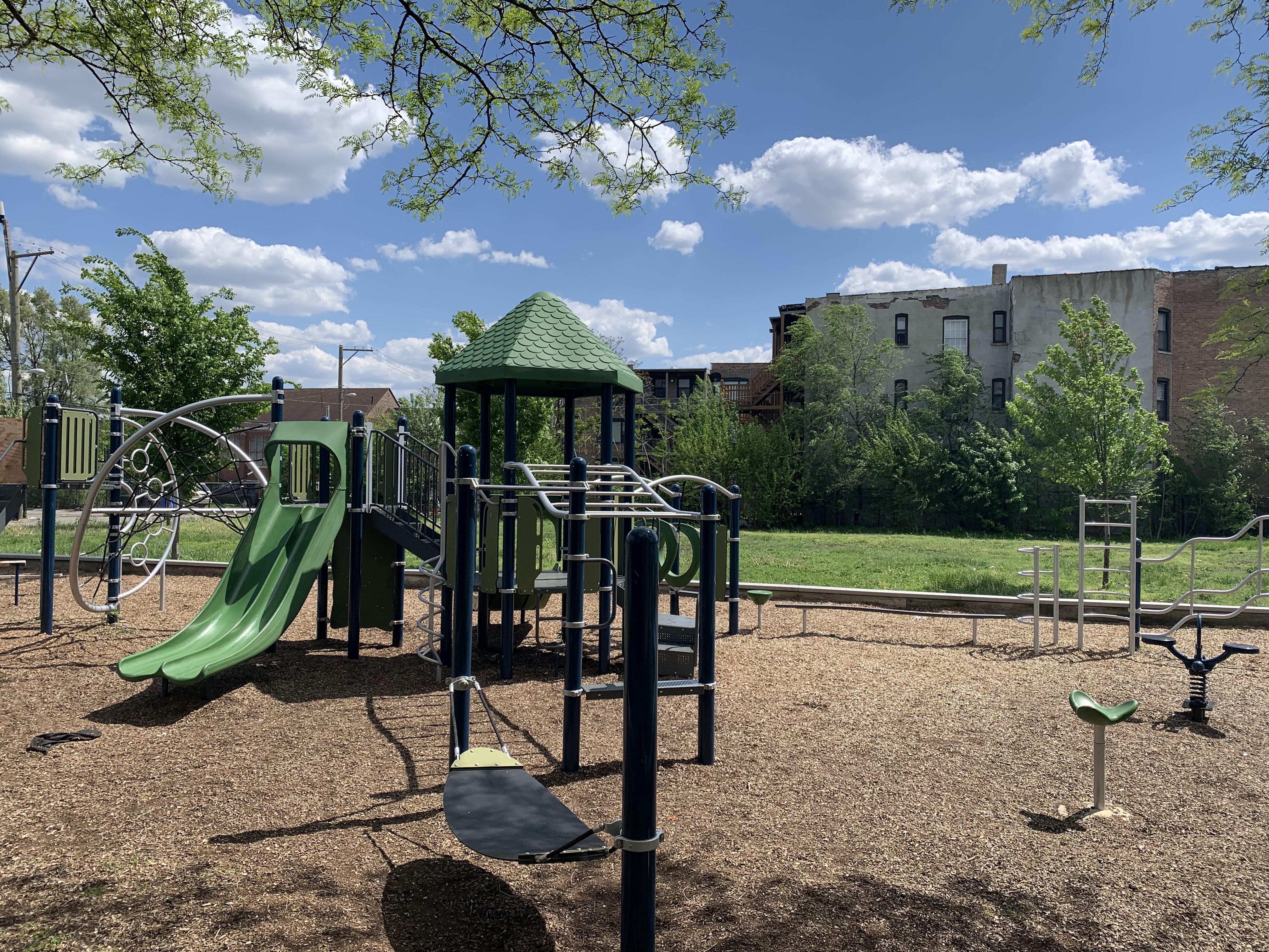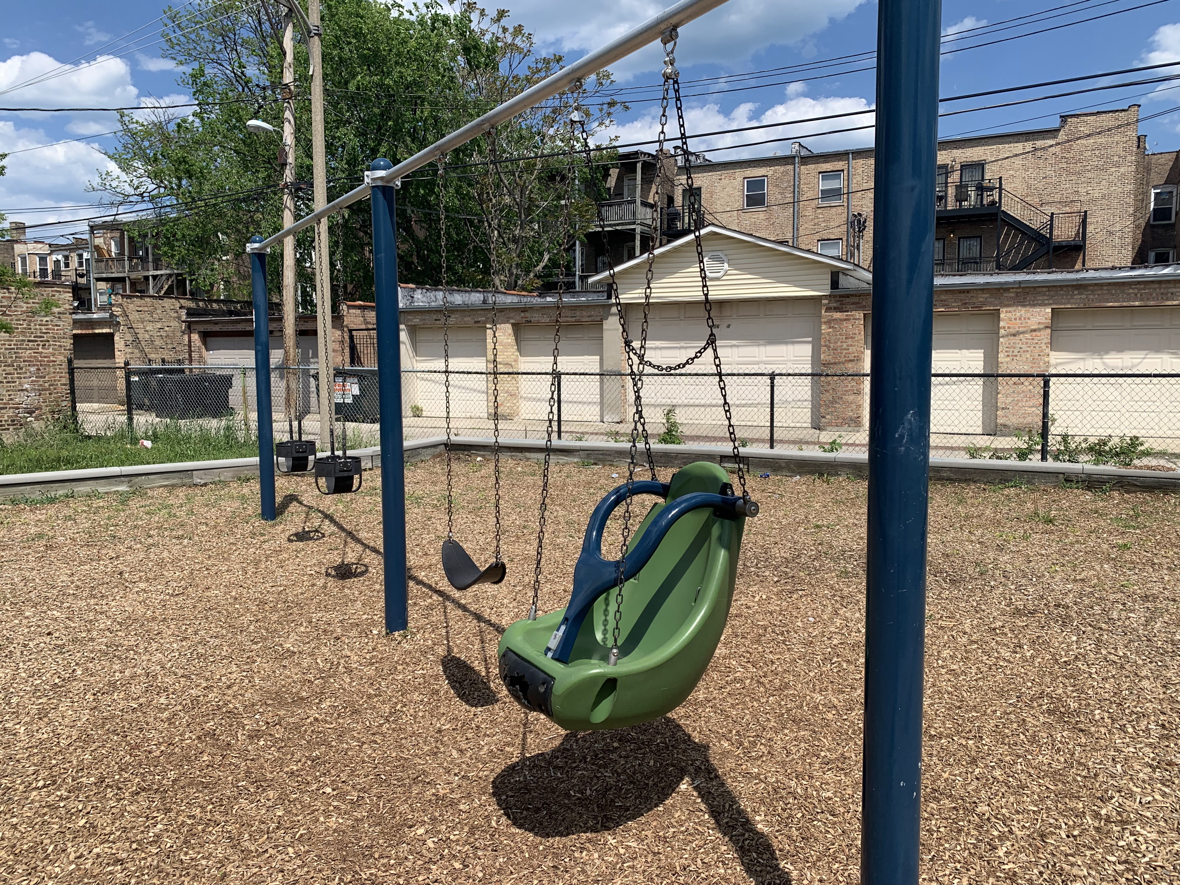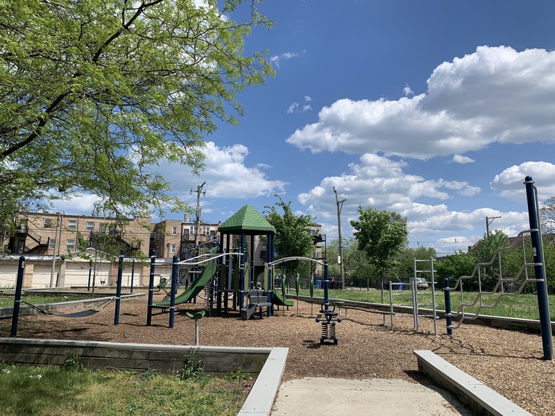 - Hansberry Park is a small neighborhood park with a solid playground. Rather than a single large structure, this playground offers many standalone elements for climbing and traversing with two small platforms that have slides. There is also a standard set of park district swings in the back of the park. The play surface is wood chips and there are benches and a drinking fountain by the entrance. The playground get some shade from trees but is mostly bright and sunny.
