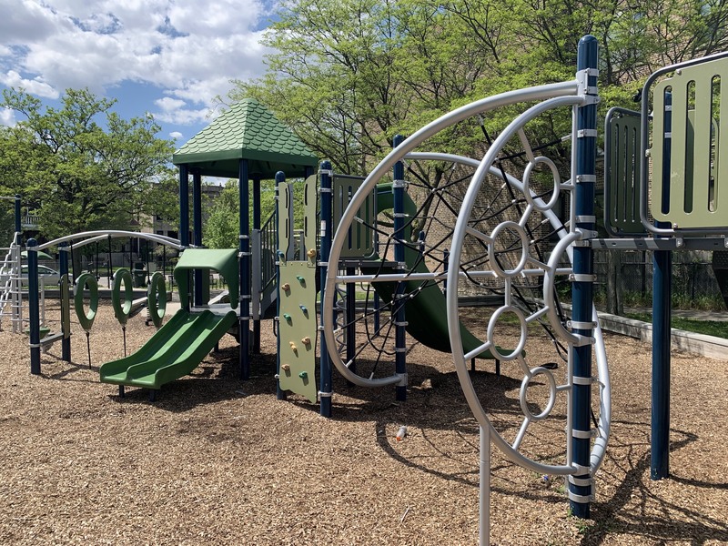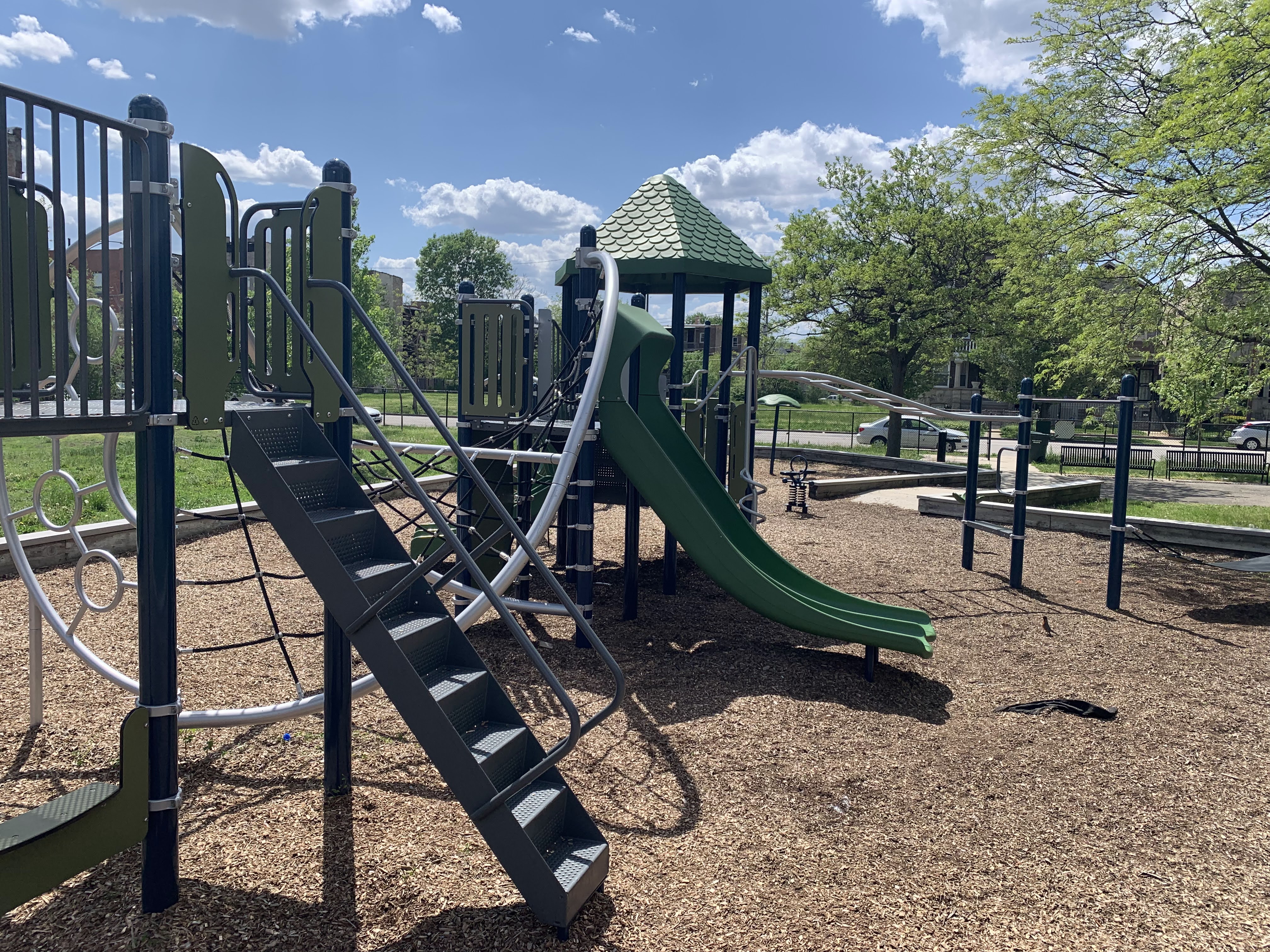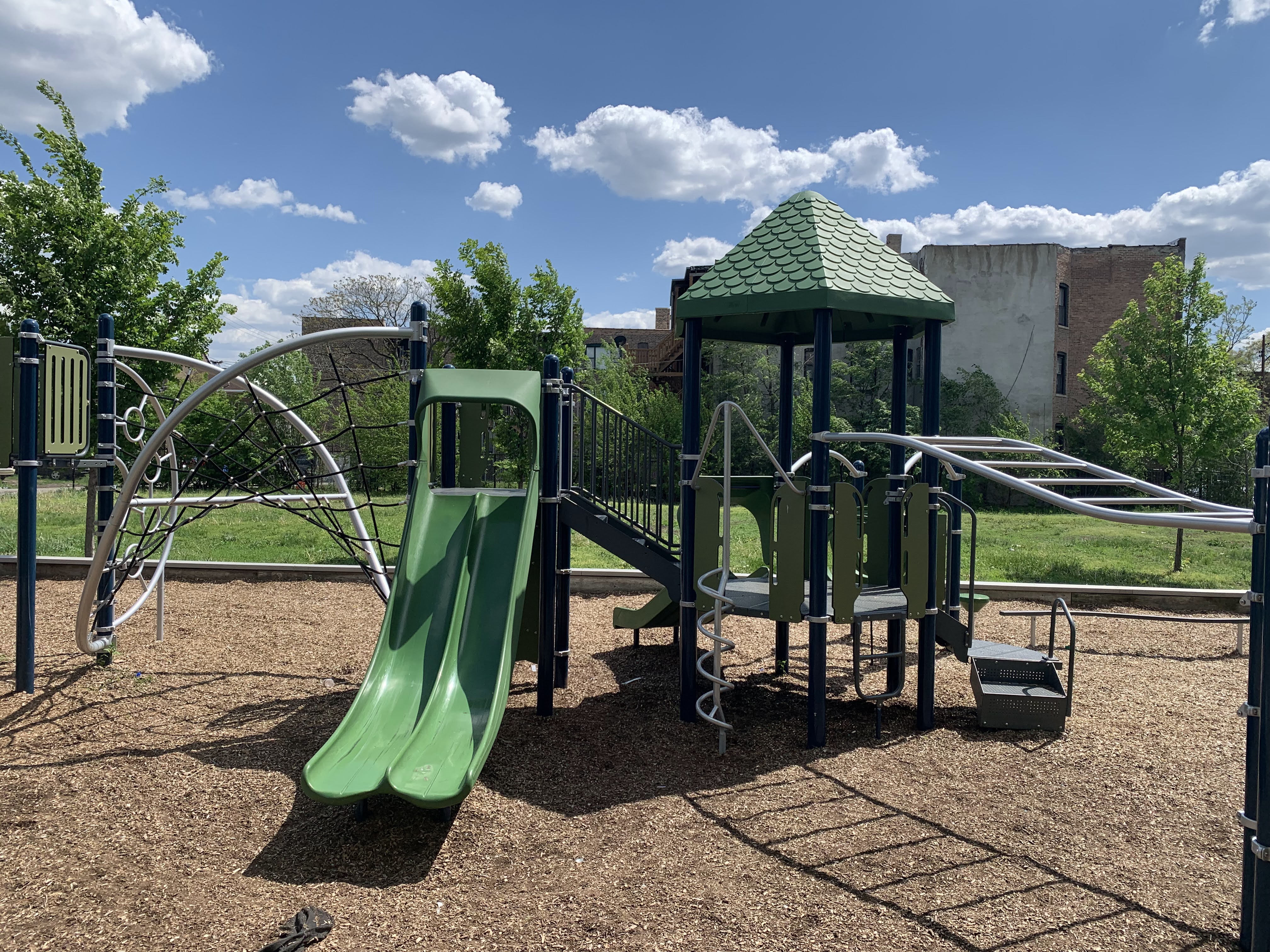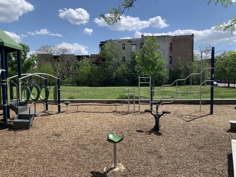 - Hansberry Park is a small neighborhood park with a solid playground. Rather than a single large structure, this playground offers many standalone elements for climbing and traversing with two small platforms that have slides. There is also a standard set of park district swings in the back of the park. The play surface is wood chips and there are benches and a drinking fountain by the entrance. The playground get some shade from trees but is mostly bright and sunny.