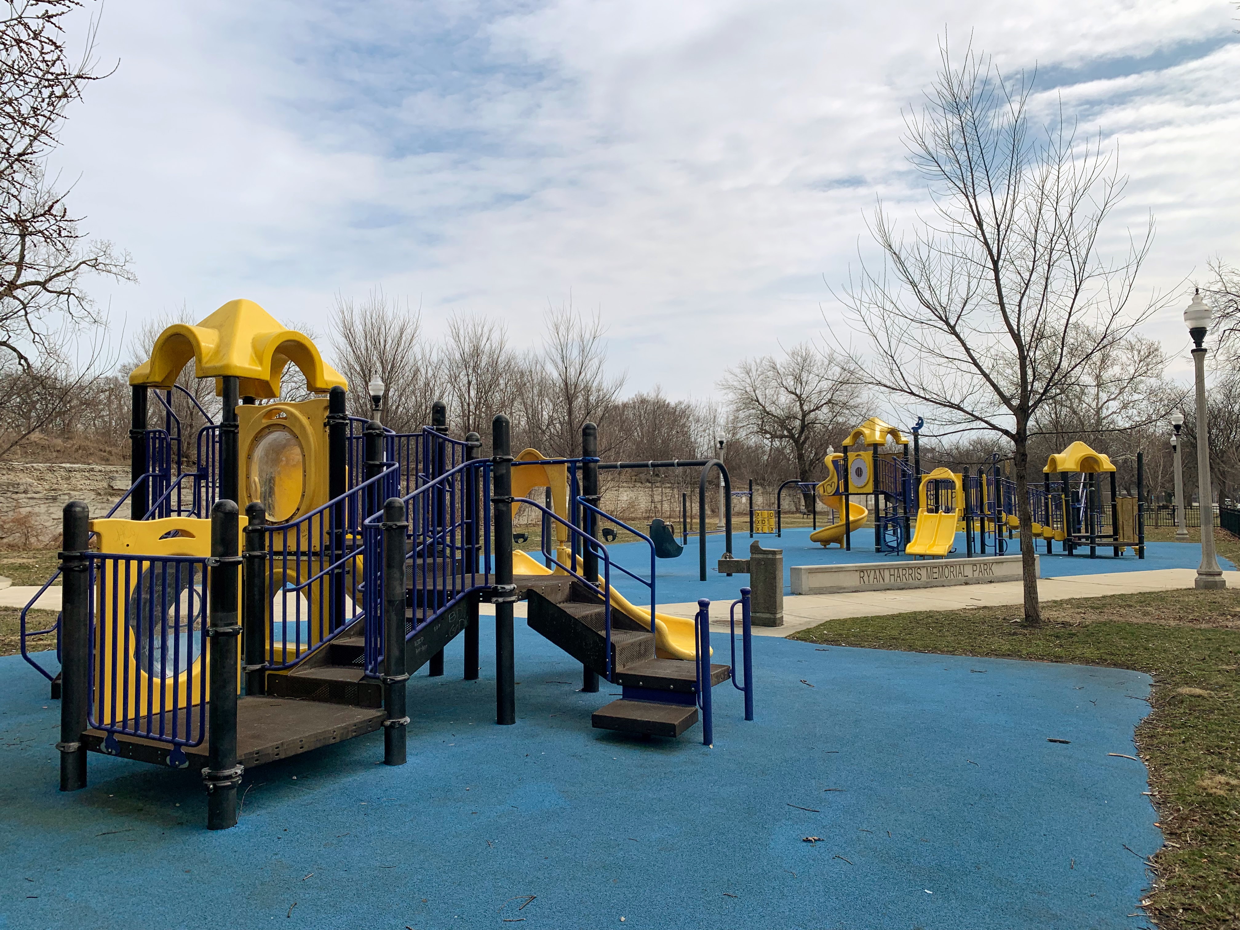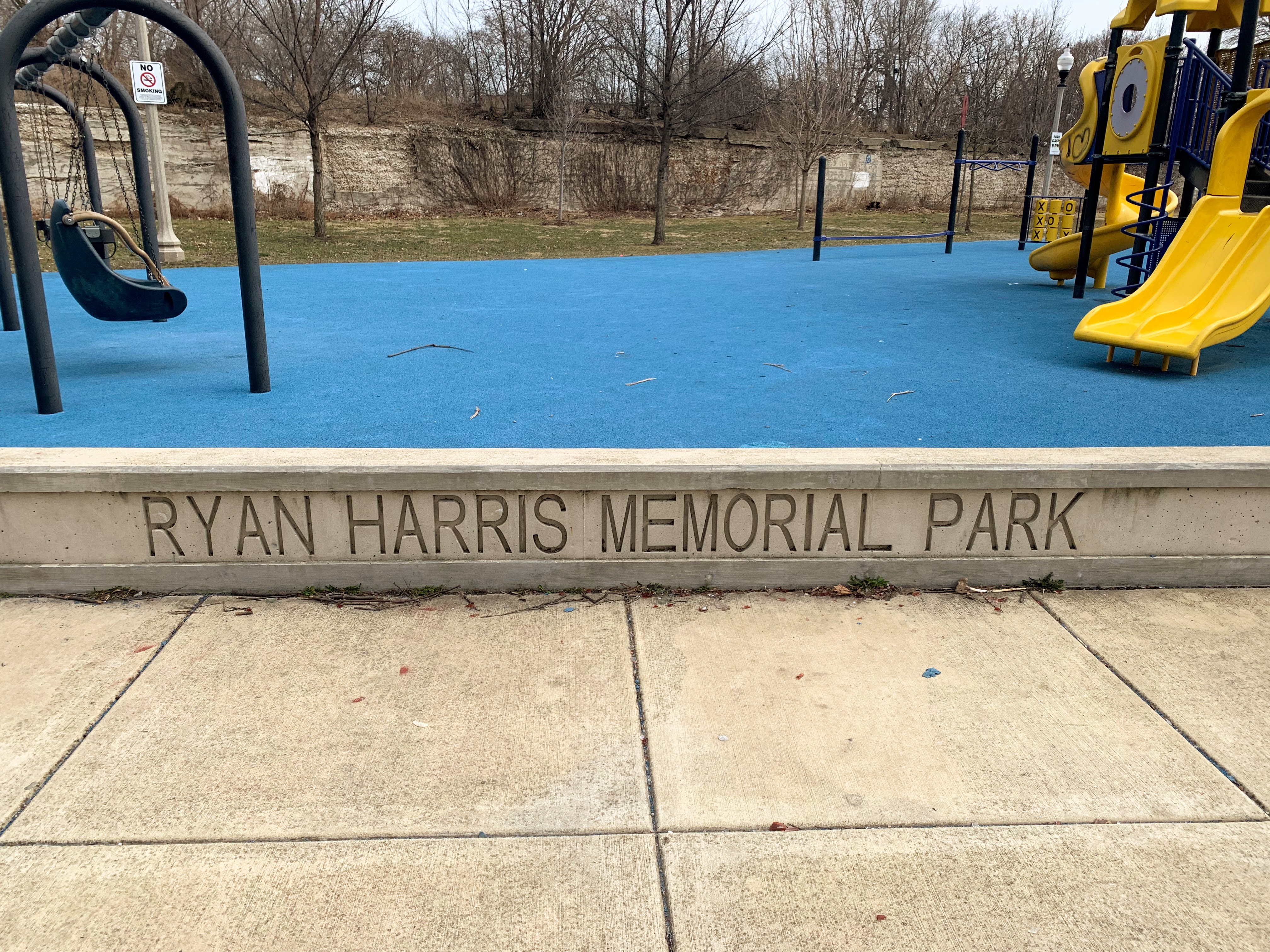 - Ryan Harris Park is named for an 11 year girl who was murdered in 1998 and features a large playground as part of that tribute. There are two large play structures. The larger structure is for older children and features a number of unique overhead elements and traversing elements. The smaller structure is designed for younger children and features two slides. There are also the standard set of swings and a seahorse sprayer water feature at this site. The surface is soft rubber and there are a few benches dotting the area.