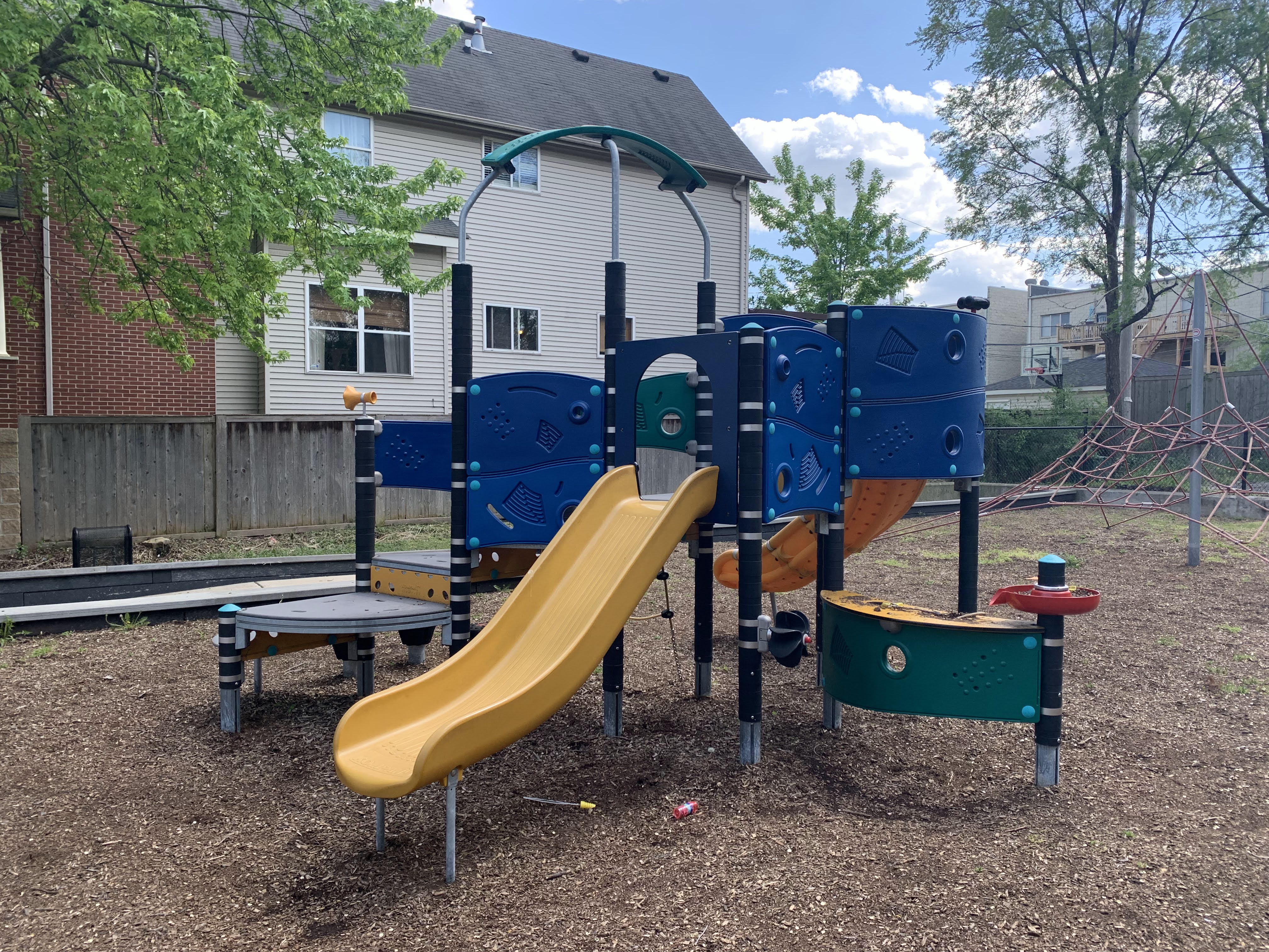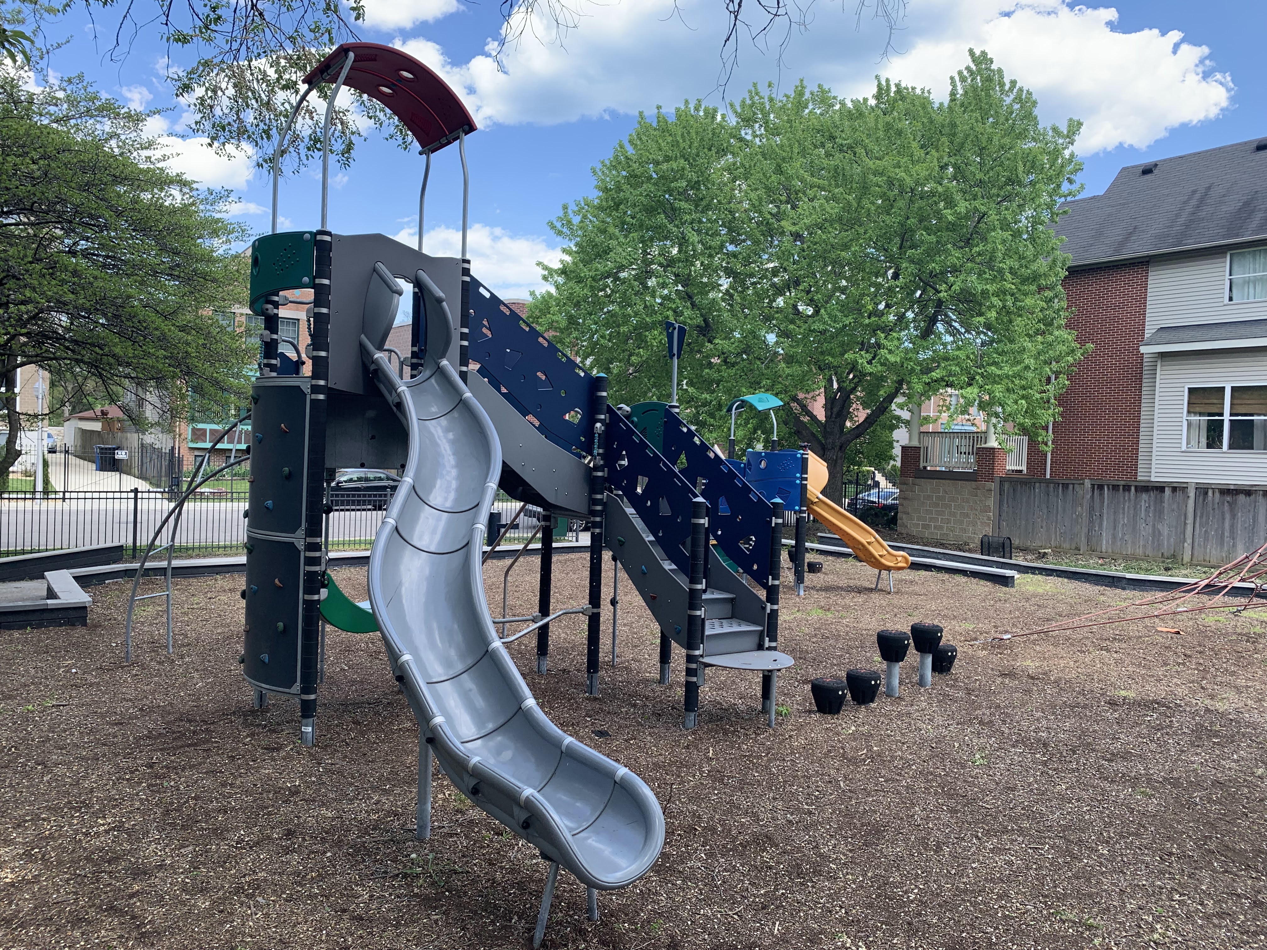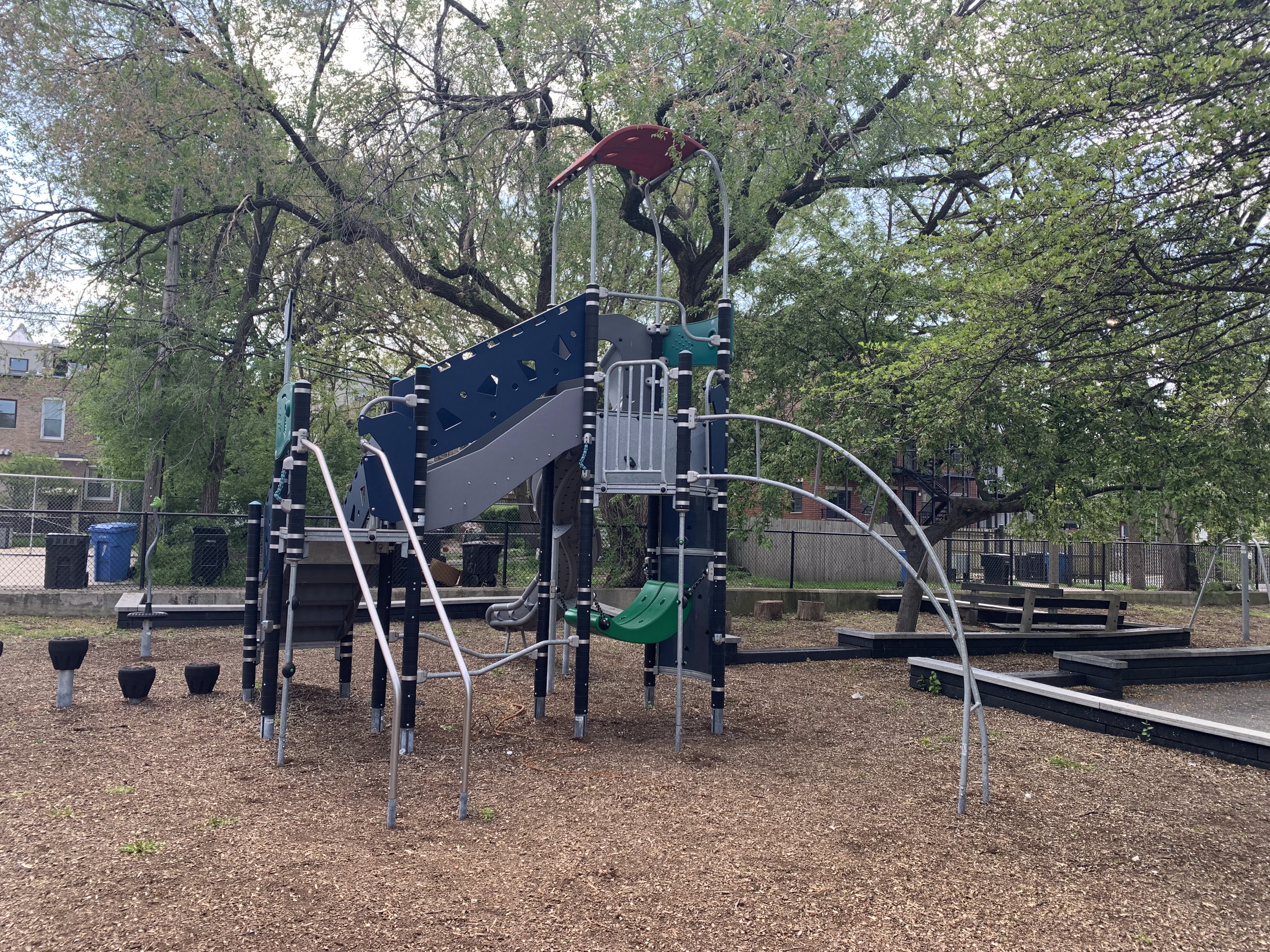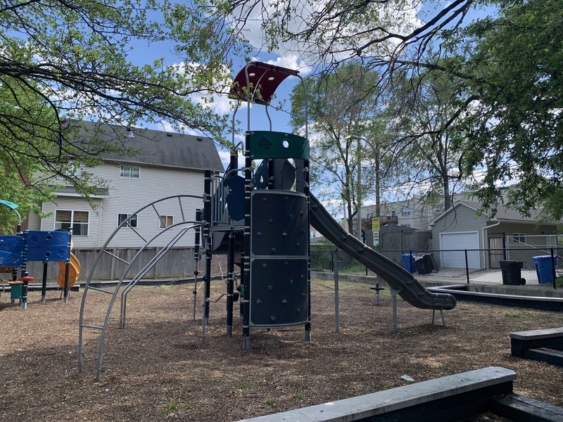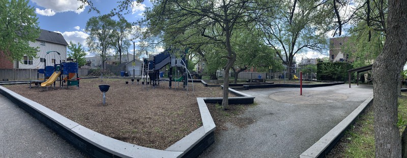 - Harsh Park sits on a quiet stretch of Oakenwald Avenue and features modern Kompan playground structures, a standard set of swings, and a small water spray element. There are two playground structures - a smaller one for younger children and a larger one for older children - that feature distinctive geometric designs and bold colors. The swings are standard (toddler, adaptive, and belt seat) and the water spray feature is a simple single pole sprayer. The park itself is heavily shaded by large trees and there is a small pavilion on the north side of the park for additional shade. The play area is fenced from the street but not fully enclosed and the surface is wood chips. There are a few benches but additional seating or even a picnic table would be welcome additions to this small neighborhood park.