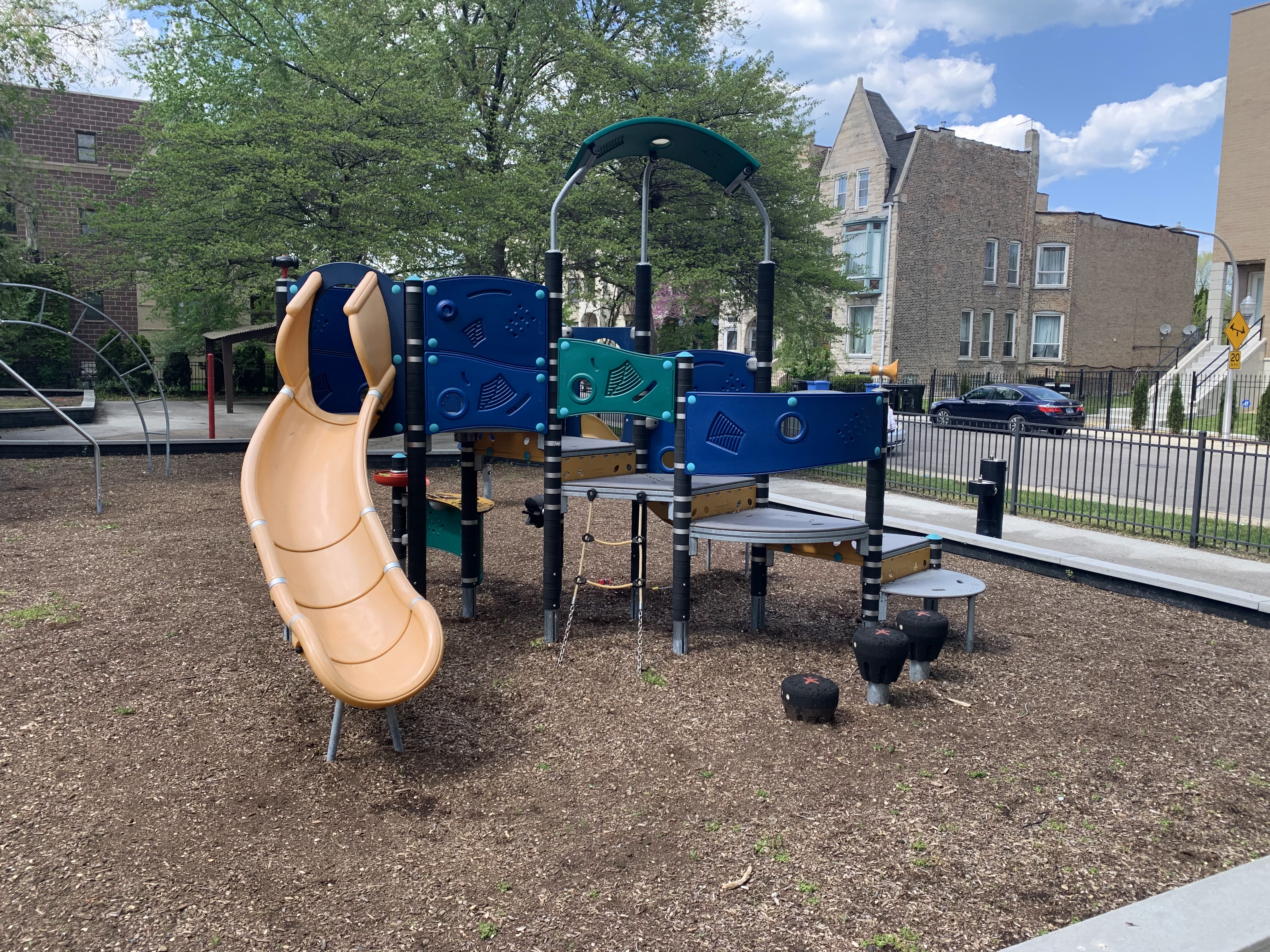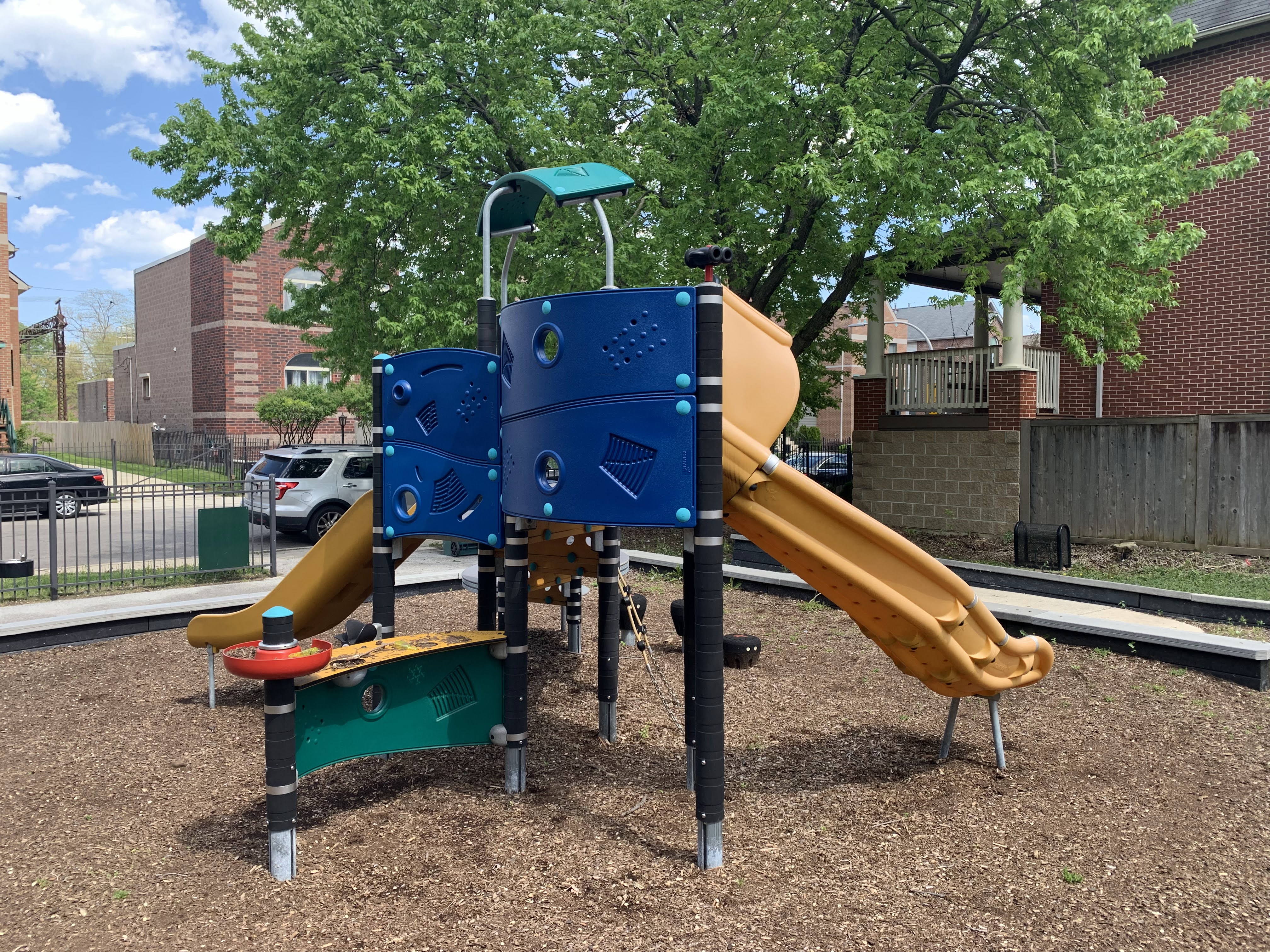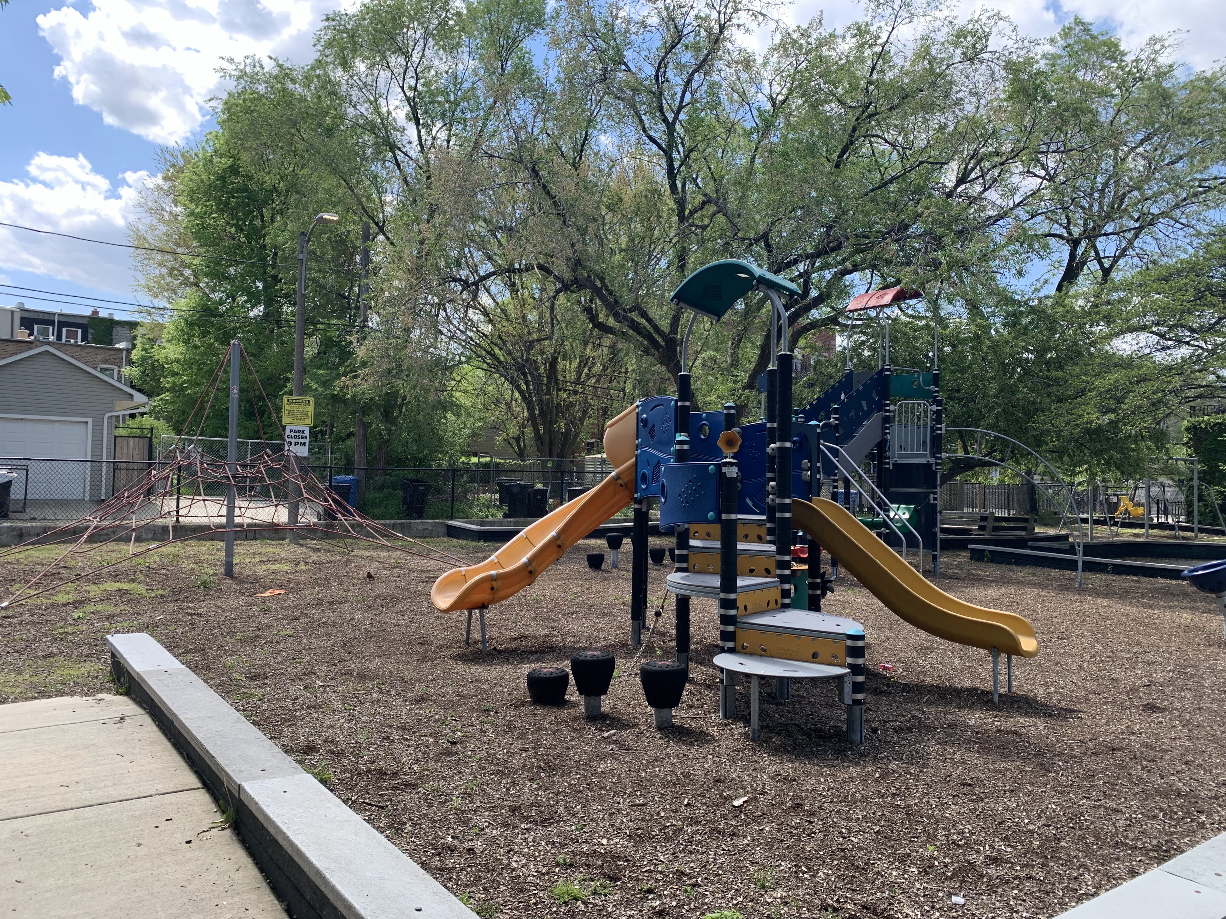 - Harsh Park sits on a quiet stretch of Oakenwald Avenue and features modern Kompan playground structures, a standard set of swings, and a small water spray element. There are two playground structures - a smaller one for younger children and a larger one for older children - that feature distinctive geometric designs and bold colors. The swings are standard (toddler, adaptive, and belt seat) and the water spray feature is a simple single pole sprayer. The park itself is heavily shaded by large trees and there is a small pavilion on the north side of the park for additional shade. The play area is fenced from the street but not fully enclosed and the surface is wood chips. There are a few benches but additional seating or even a picnic table would be welcome additions to this small neighborhood park.